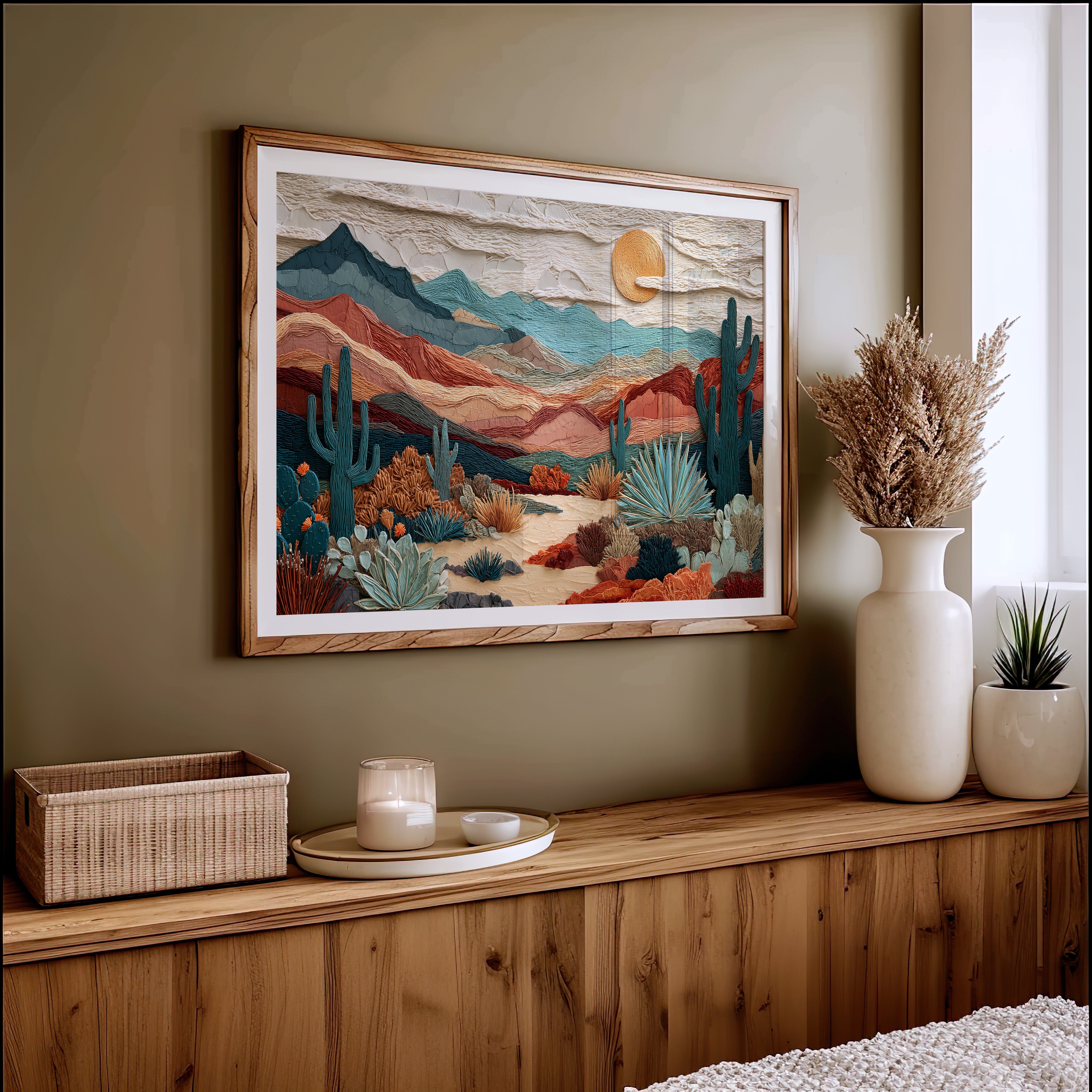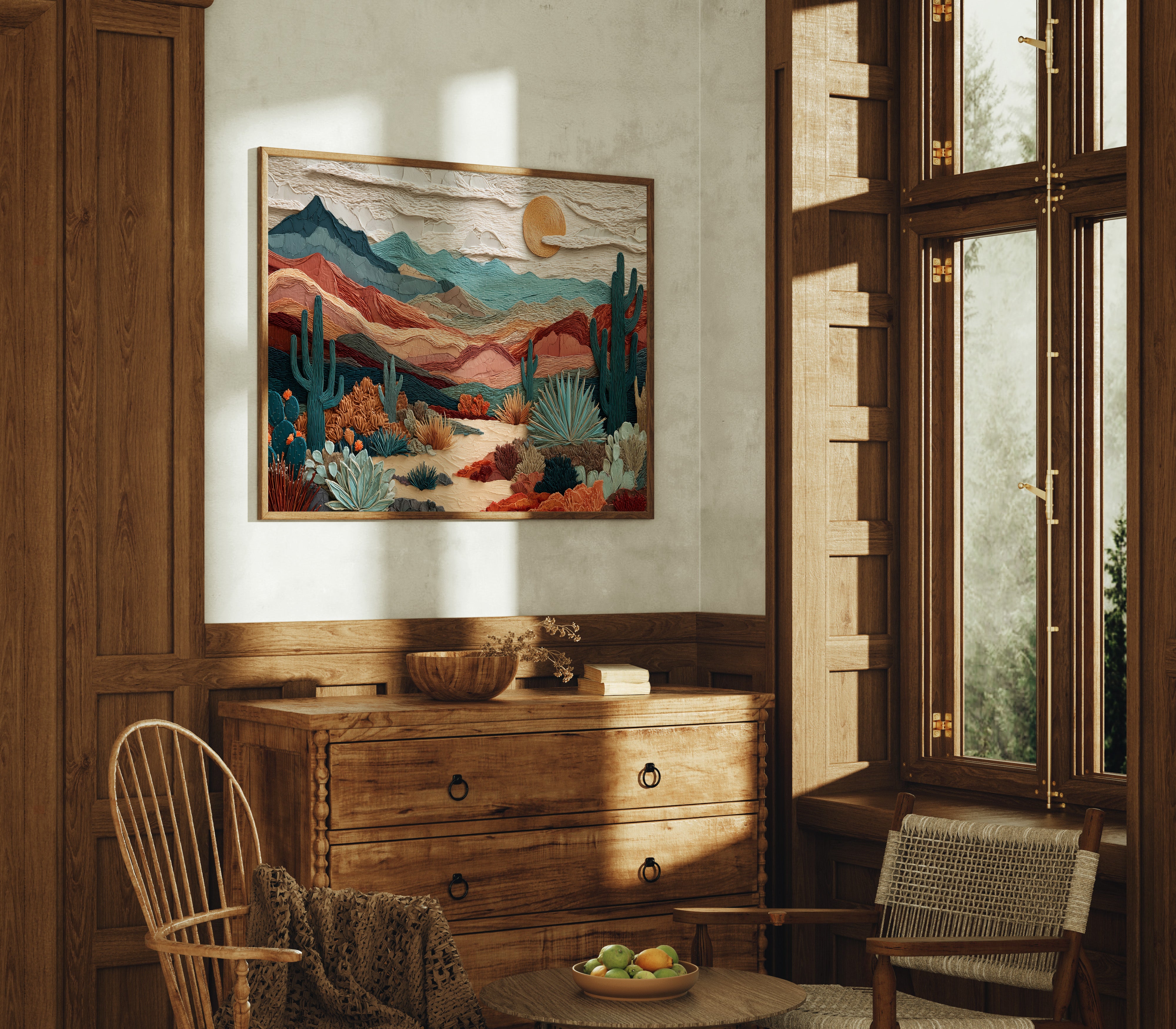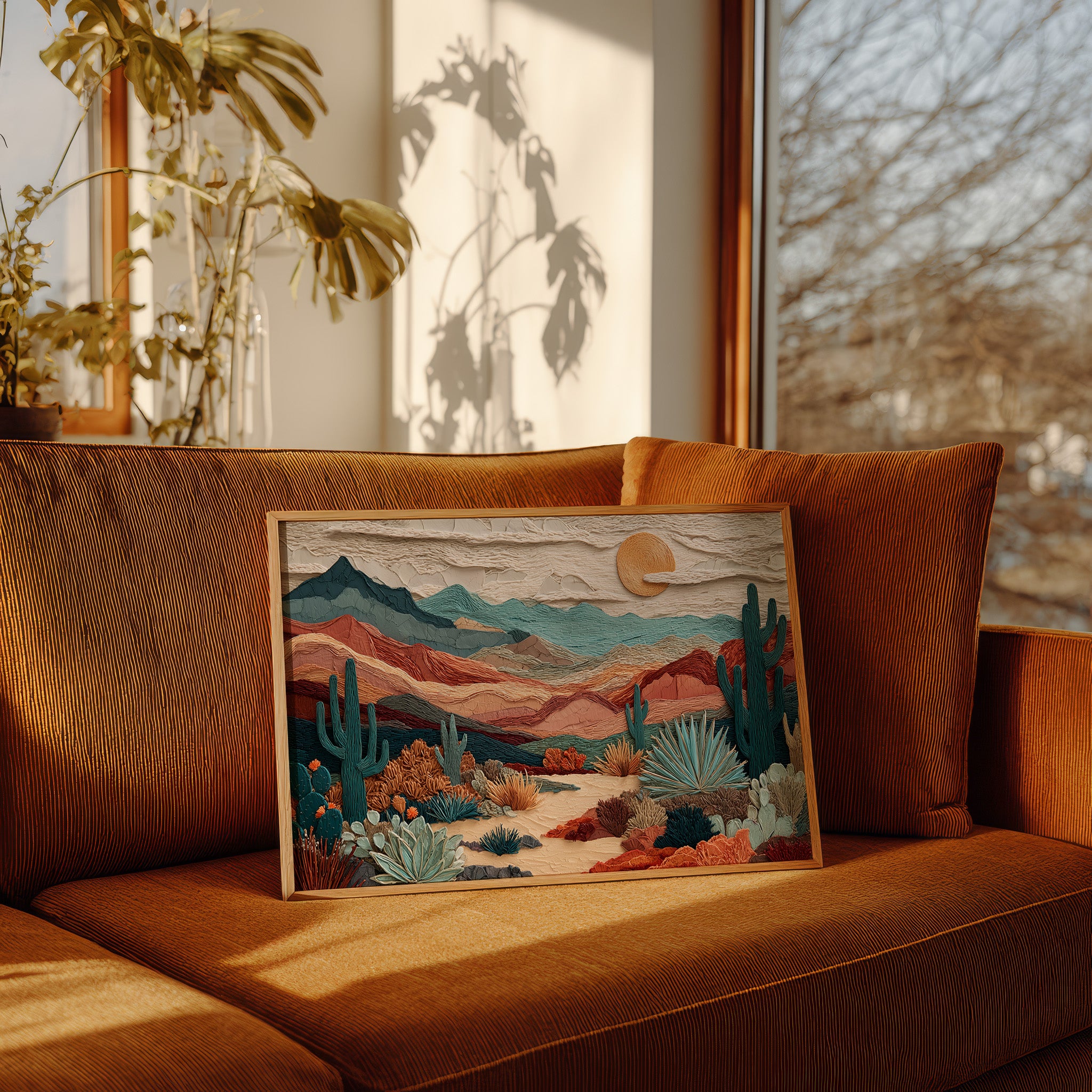 A textured dreamscape unfolds where rugged mountains meet delicate desert flora, rendered in an intricate paper art style. Deep teals and rich terracottas dance across layered peaks, while saguaro sentinels stand tall against a golden sun. The foreground bursts with detailed succulents and agave in muted pastels, creating a harmonious blend of southwestern charm and artistic innovation. This piece would bring serene desert energy to a modern living space or creative studio, perfect for those drawn to both natural beauty and contemporary artistic expression.