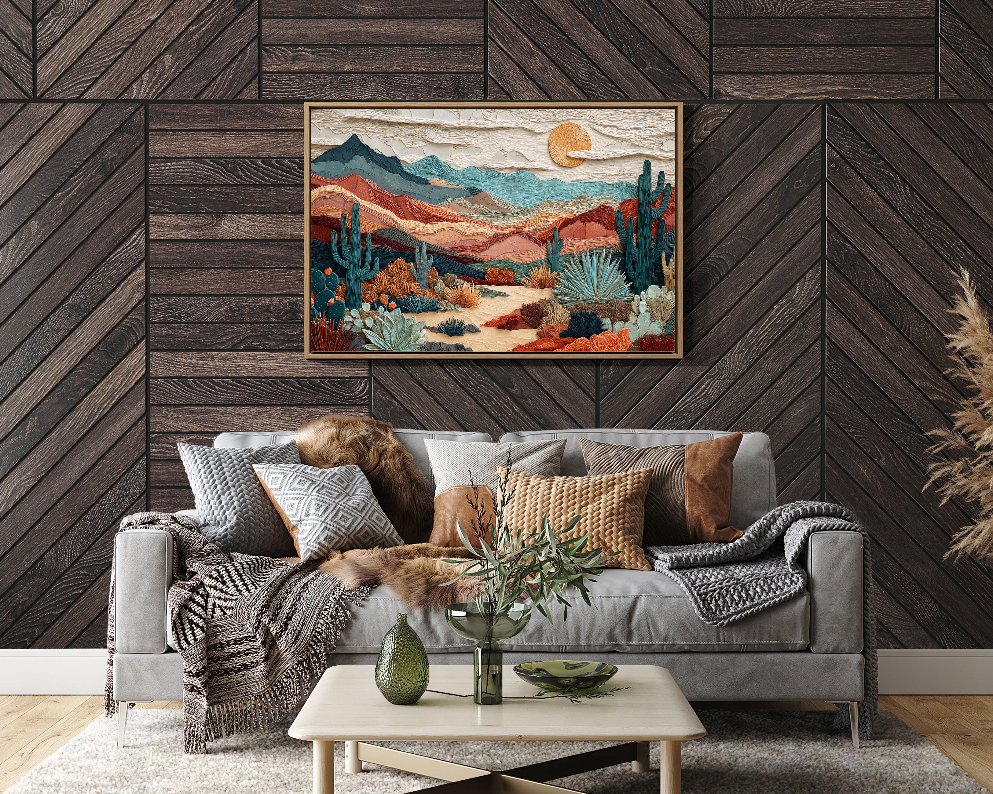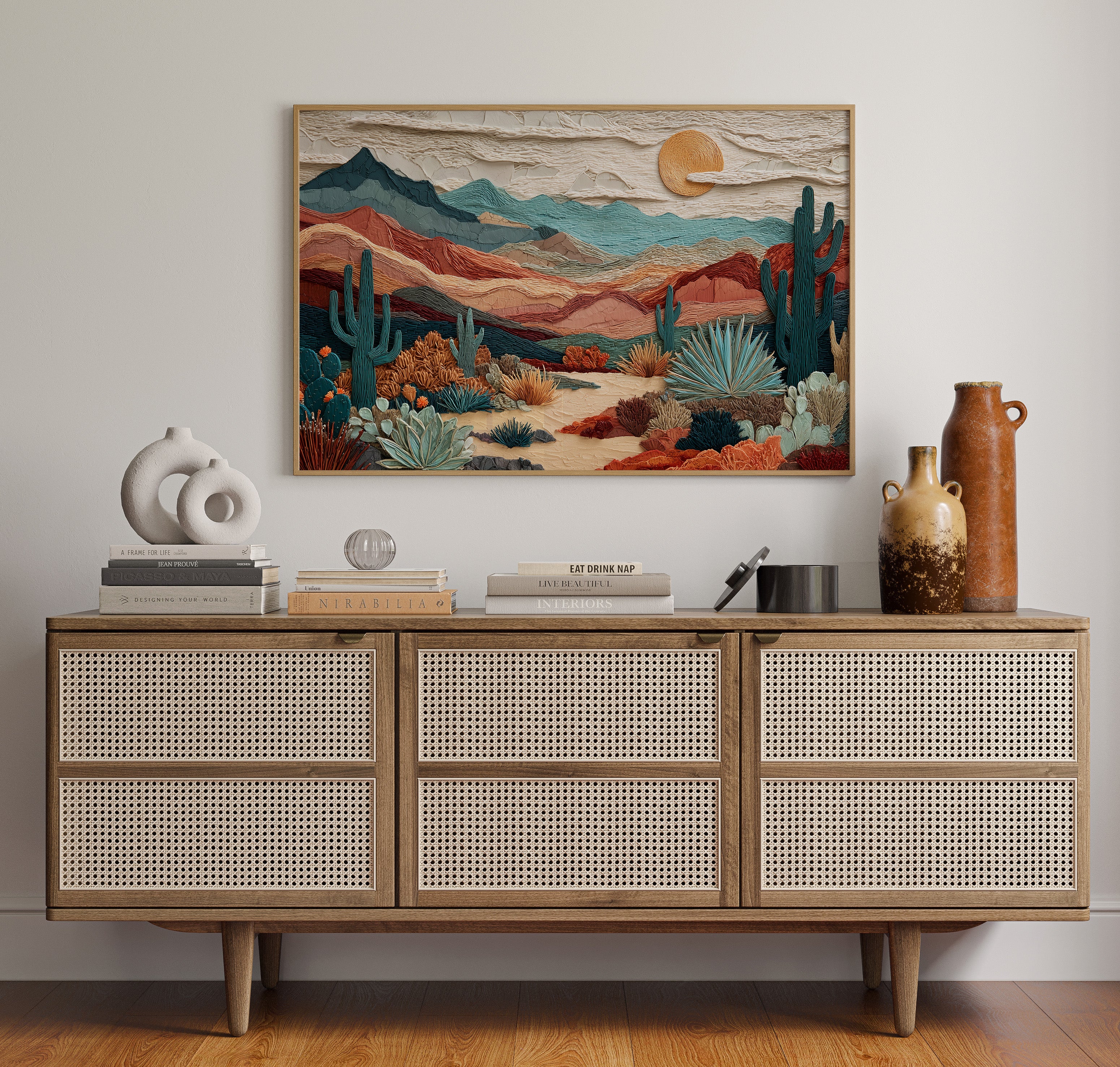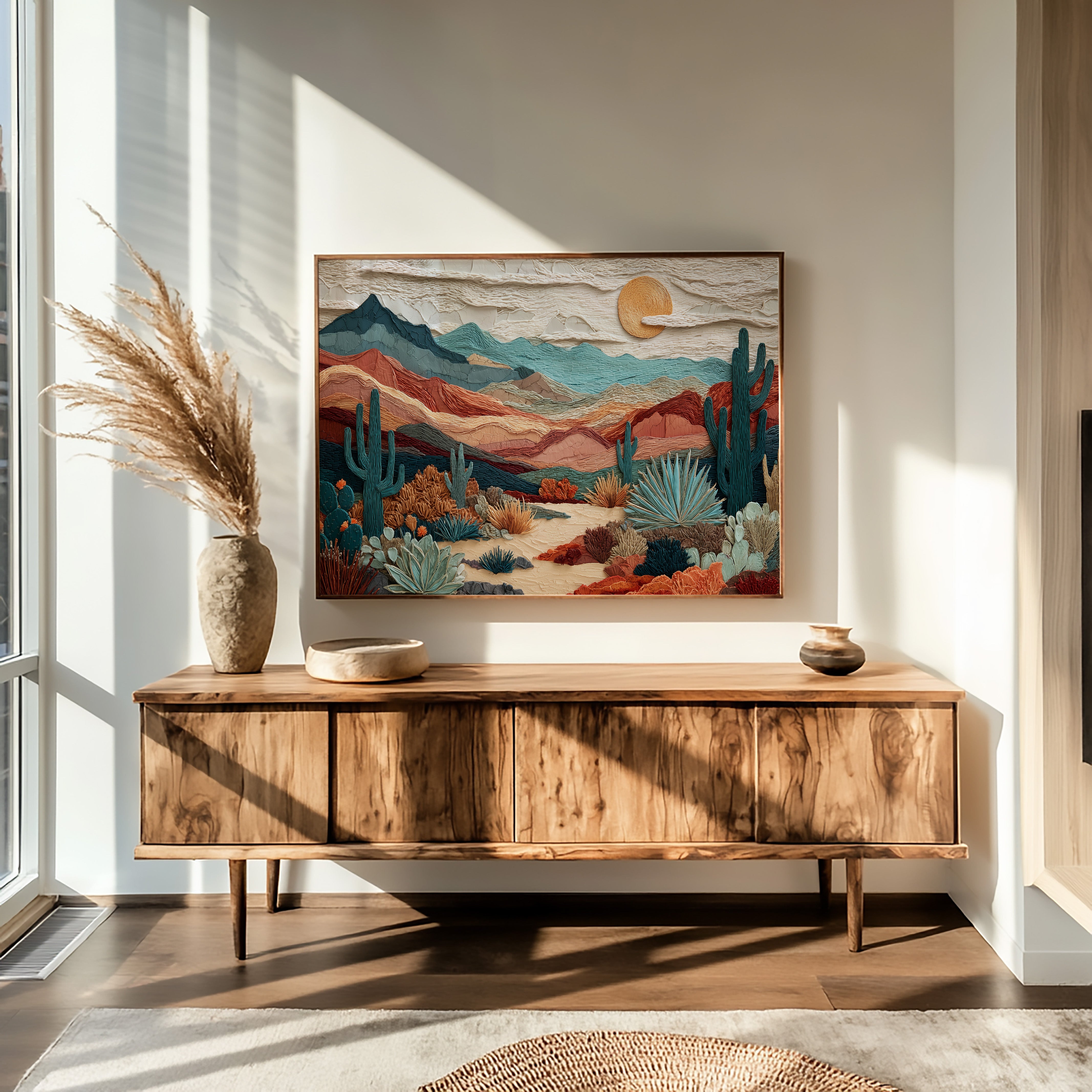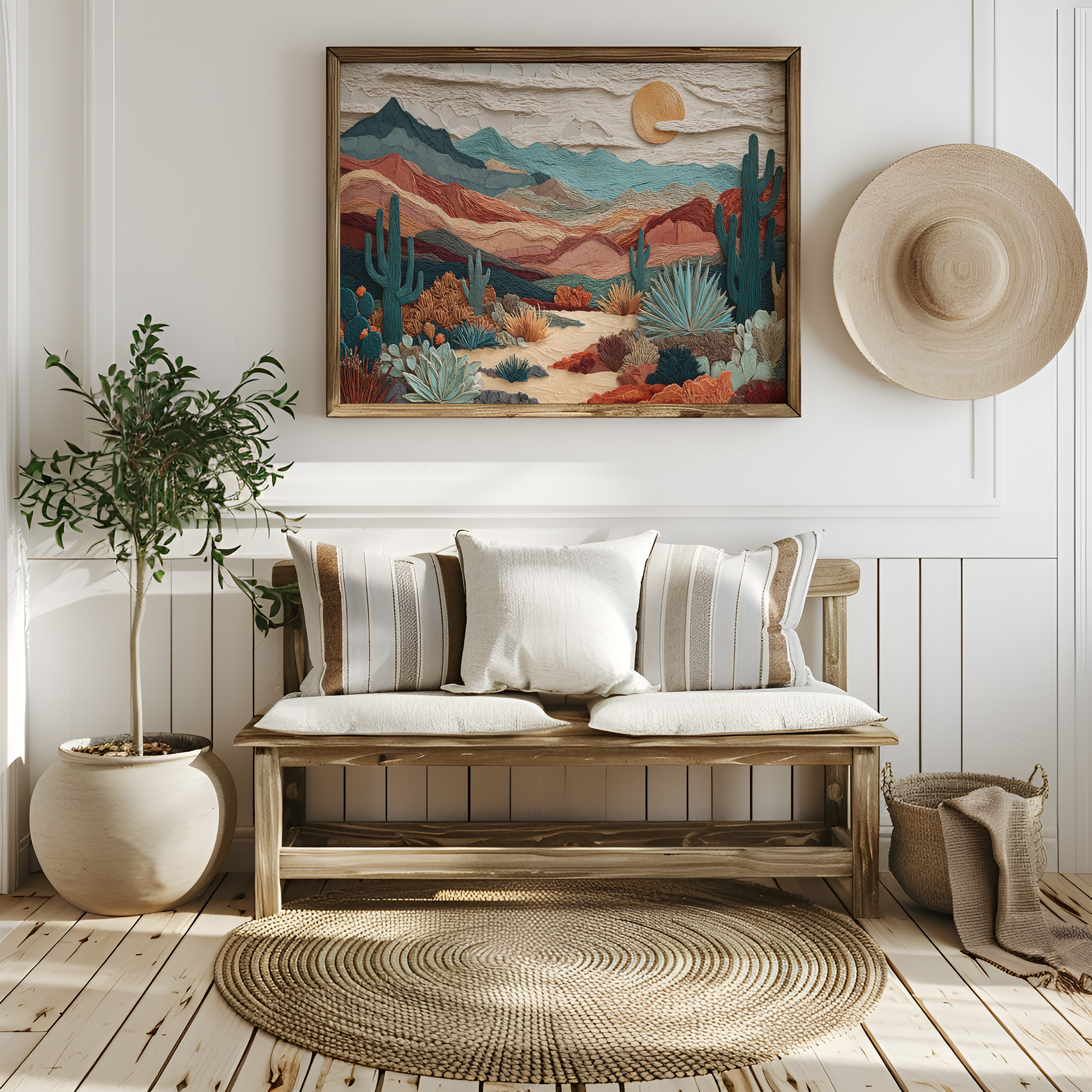 A textured dreamscape unfolds where rugged mountains meet delicate desert flora, rendered in an intricate paper art style. Deep teals and rich terracottas dance across layered peaks, while saguaro sentinels stand tall against a golden sun. The foreground bursts with detailed succulents and agave in muted pastels, creating a harmonious blend of southwestern charm and artistic innovation. This piece would bring serene desert energy to a modern living space or creative studio, perfect for those drawn to both natural beauty and contemporary artistic expression.