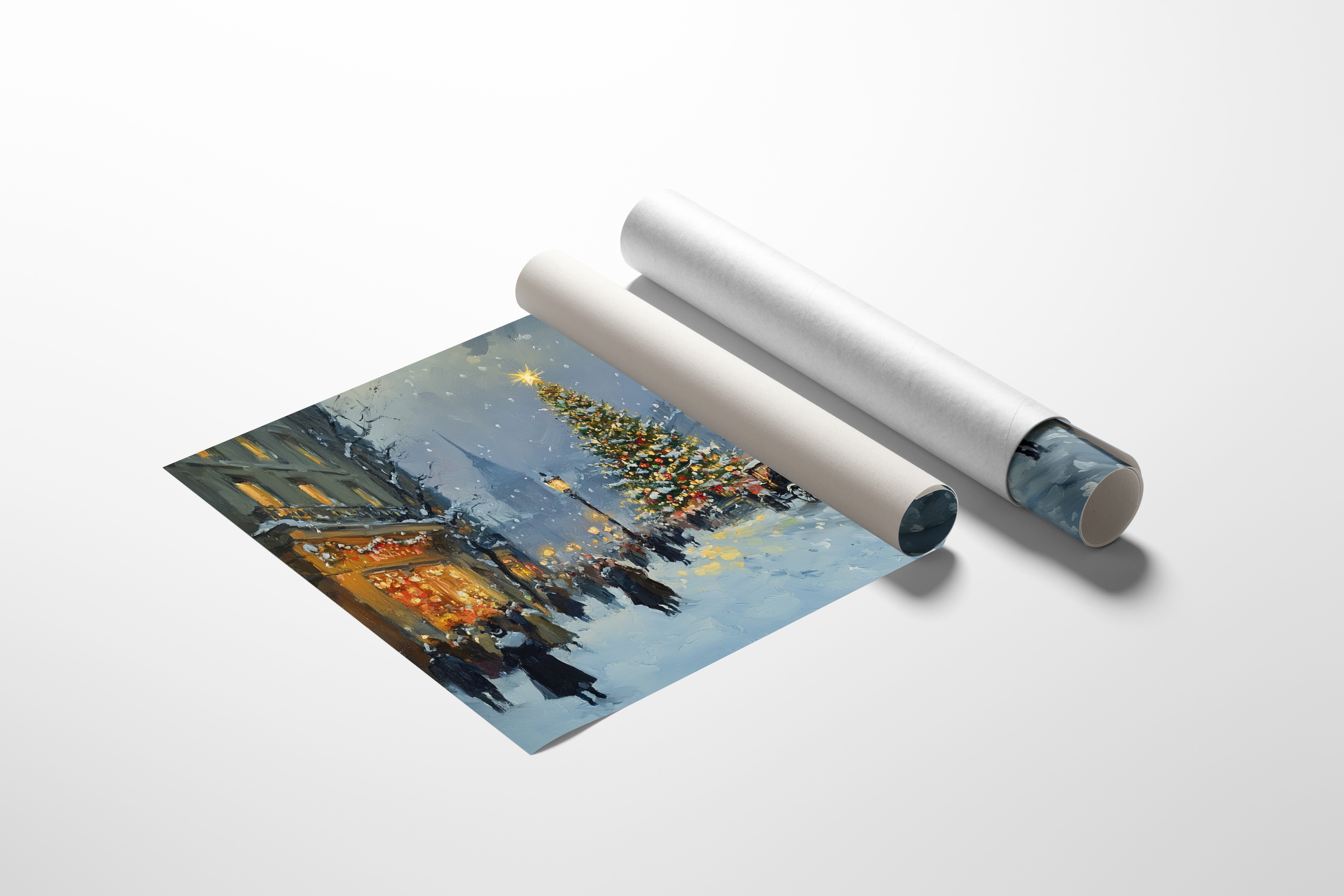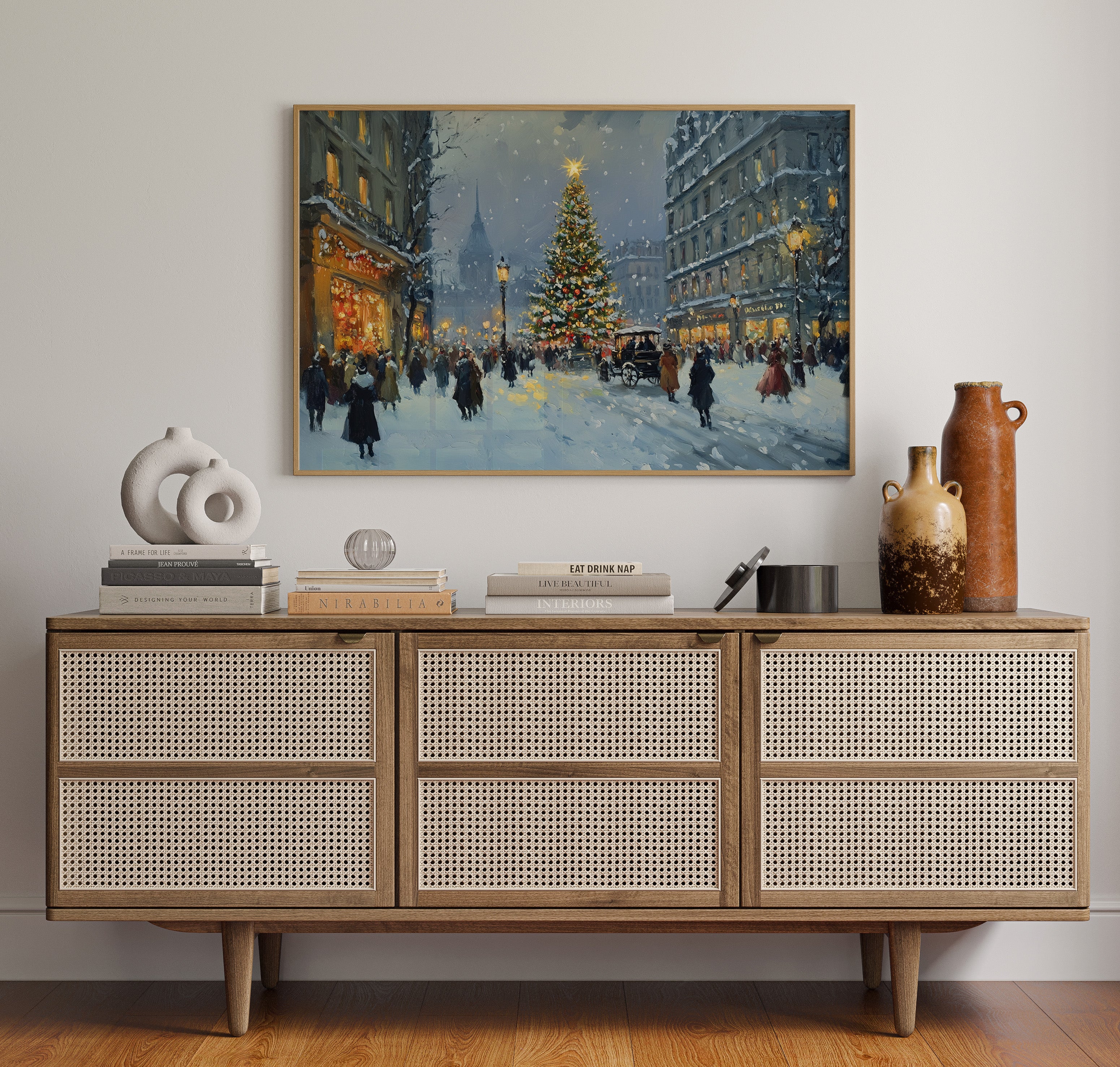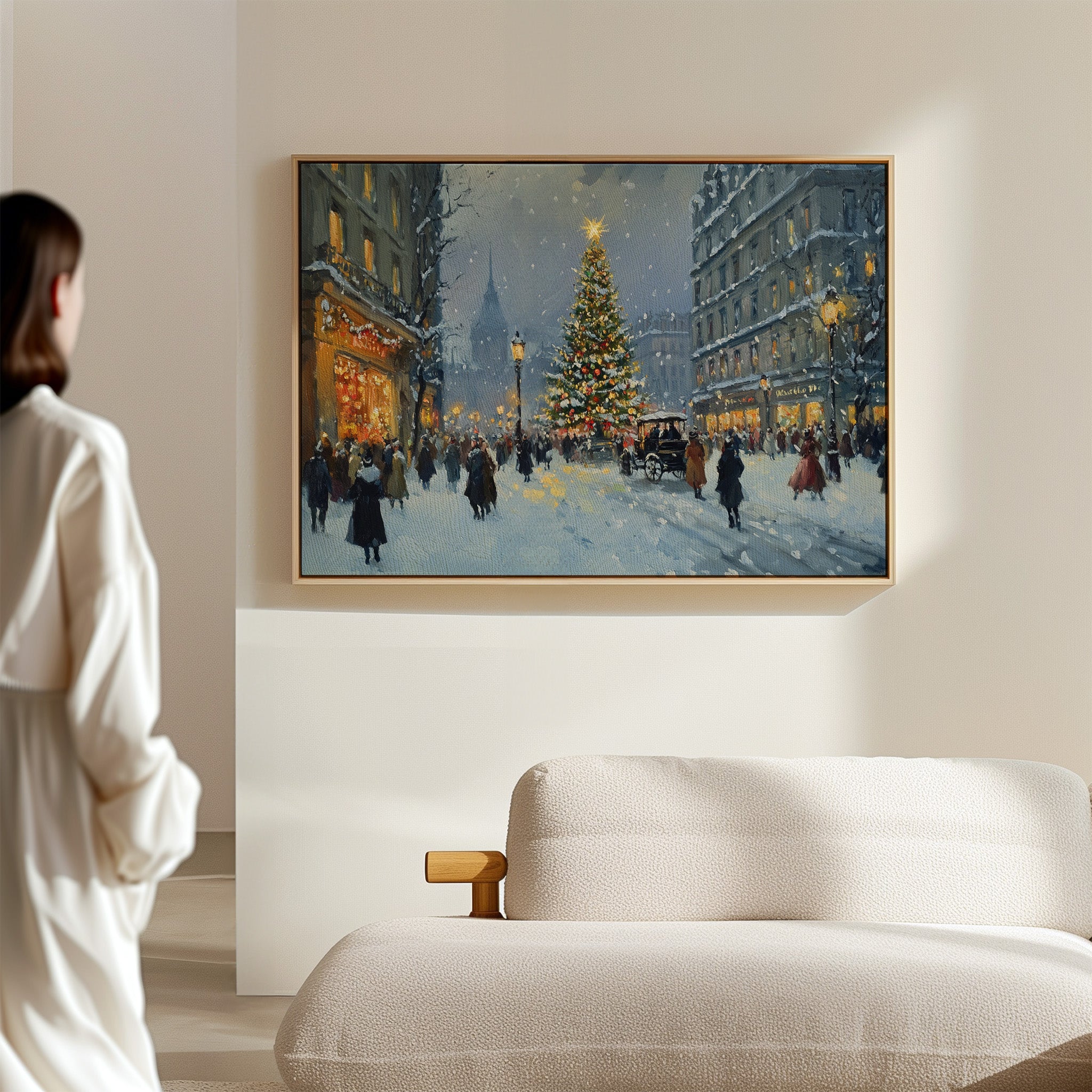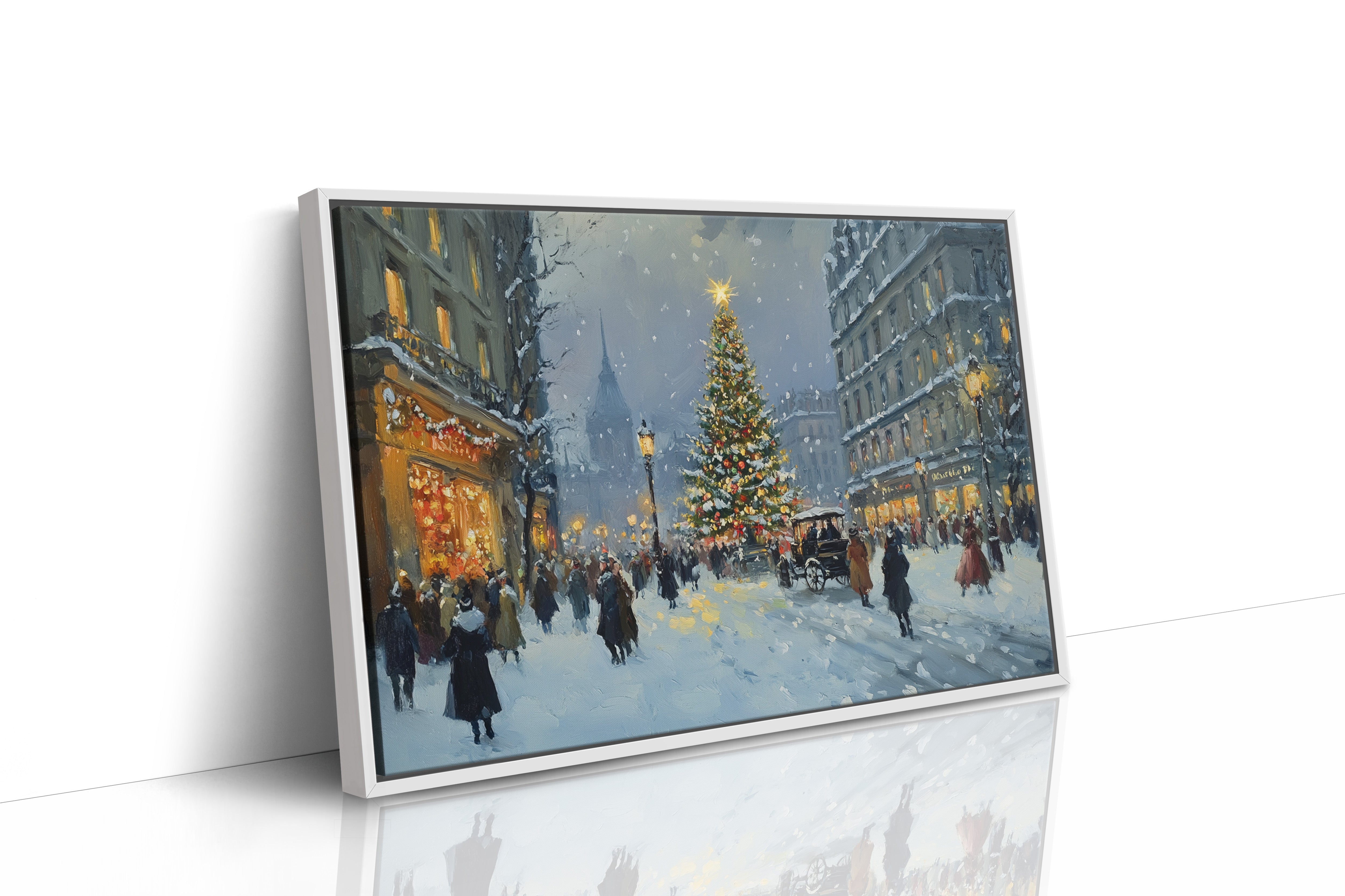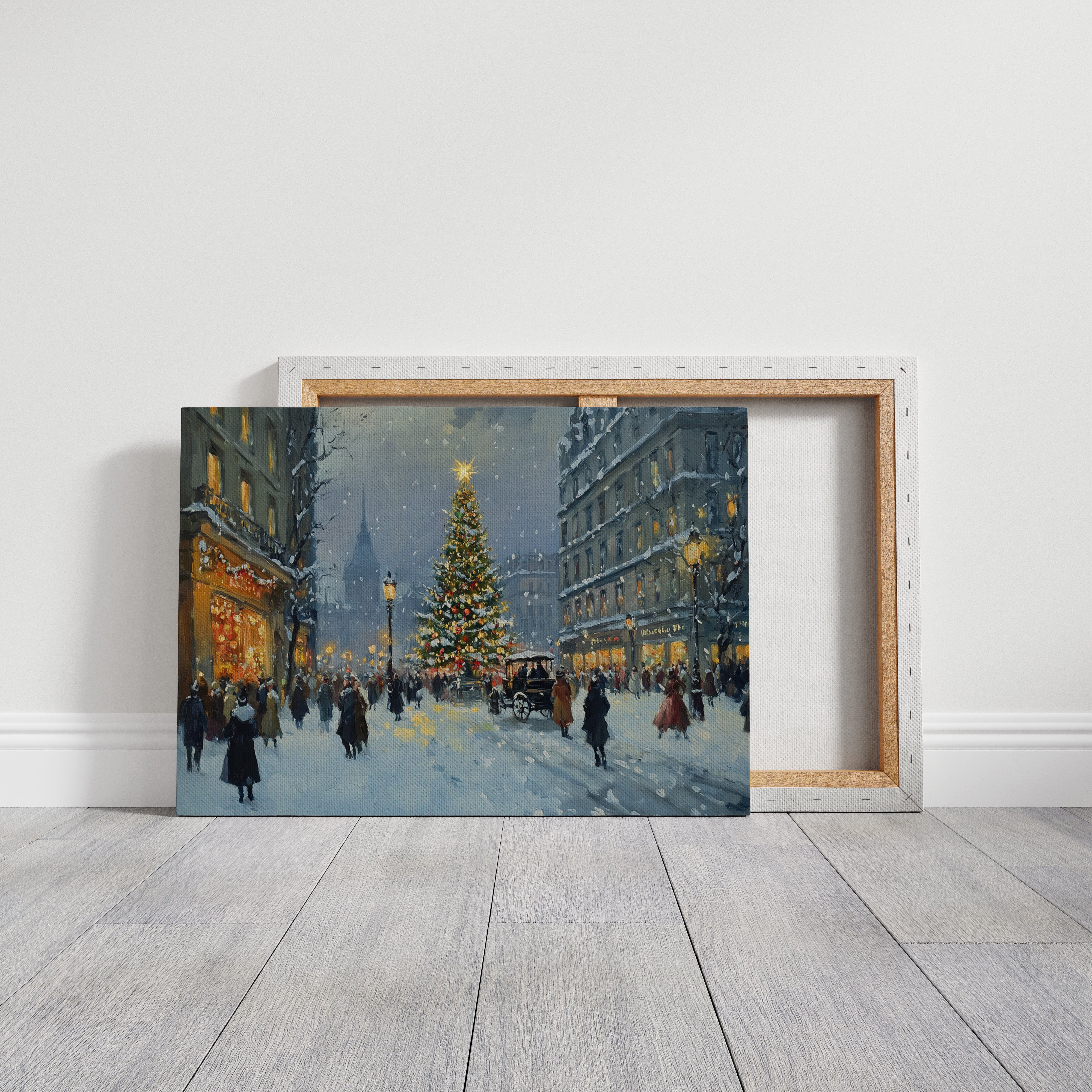 Snowflakes dance through golden lamplight as holiday shoppers gather around a magnificent Christmas tree in the heart of historic Paris. The scene captures a magical winter evening where horse-drawn carriages share cobblestone streets with bundled figures hurrying past warmly lit shop windows. Rich brushstrokes blend the cool blues of twilight with the warm amber glow of street lamps and storefronts, creating an atmosphere of nostalgic celebration beneath the distant silhouette of the Eiffel Tower.