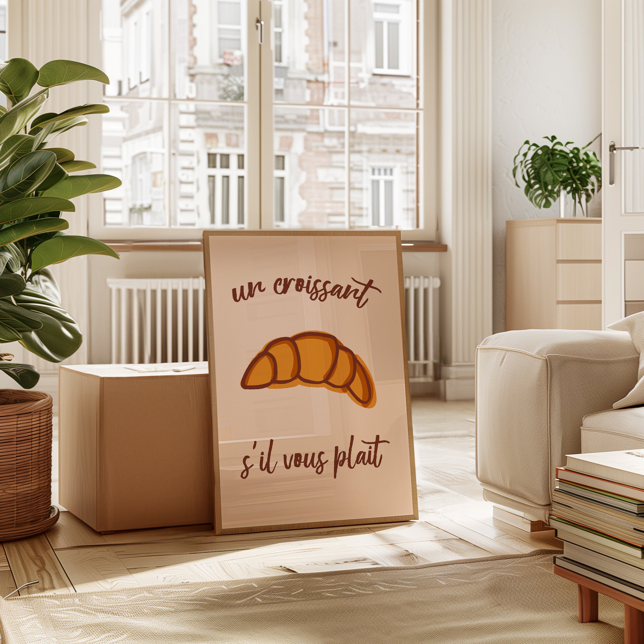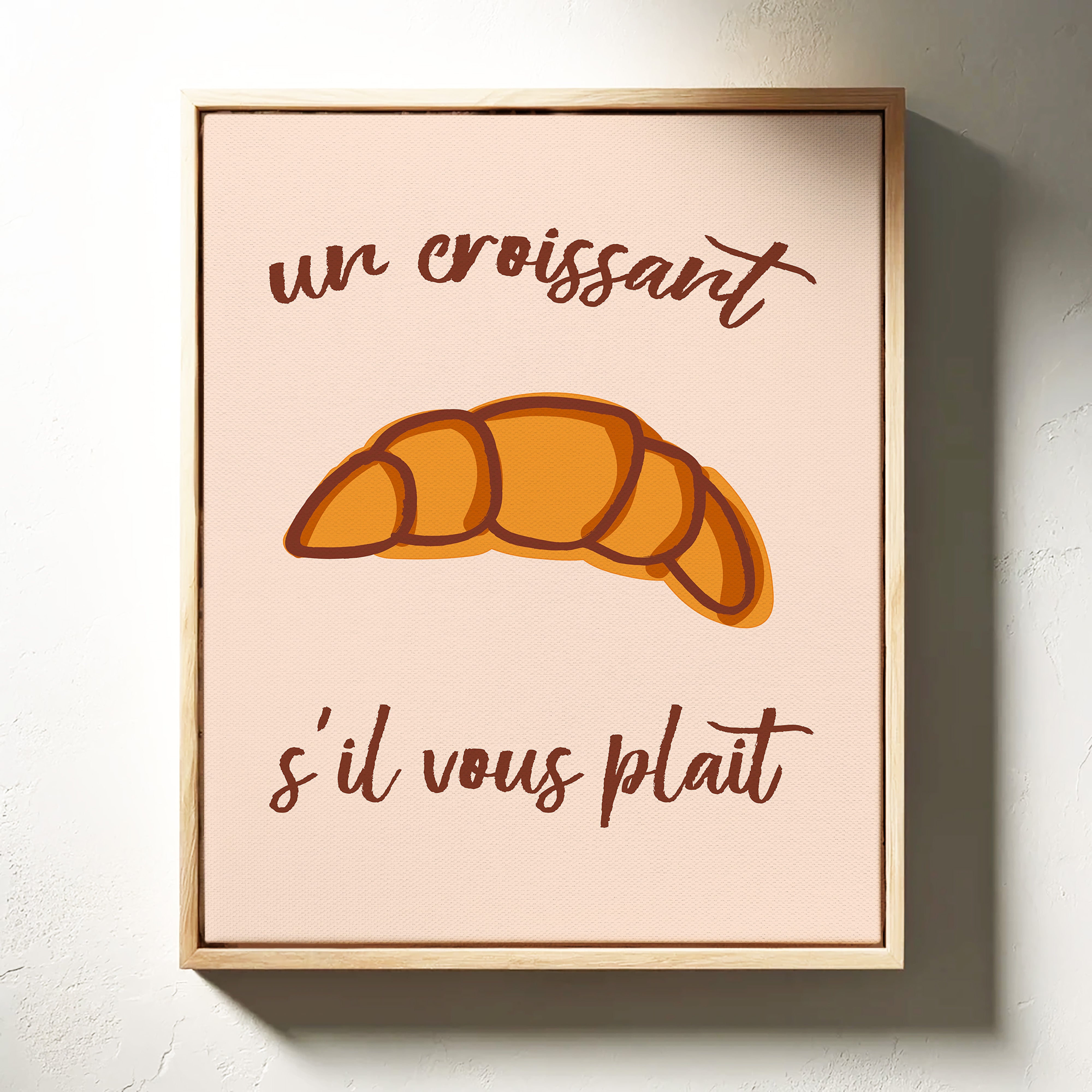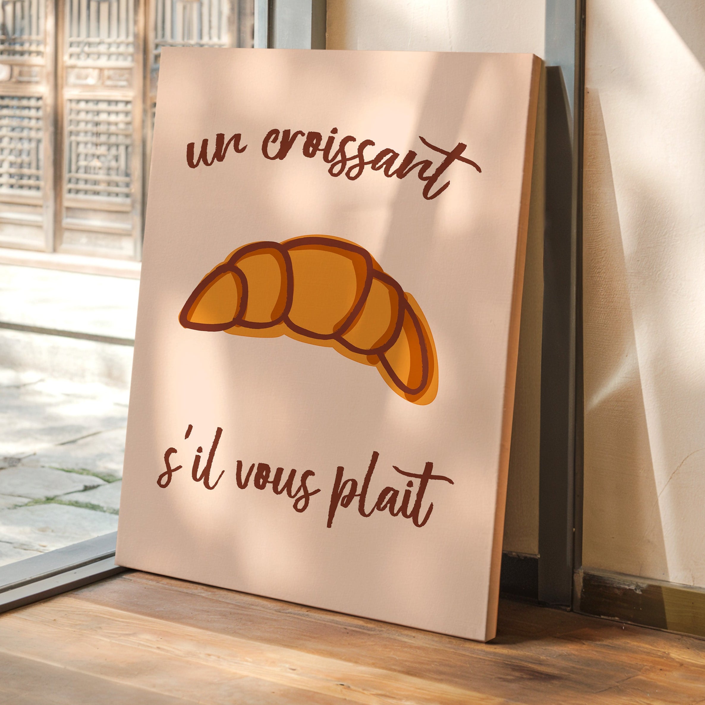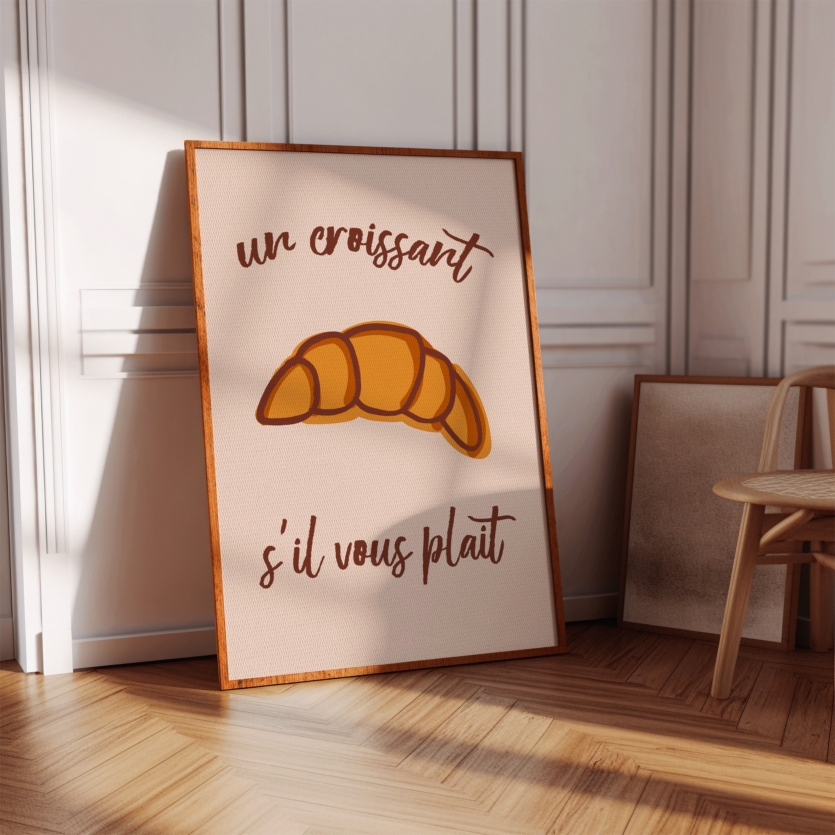 A golden croissant curves with grace against a soft blush backdrop, its buttery layers promising indulgent Parisian moments. This piece from our Contemporary collection brings modern minimalism to classic French charm. The warm brown brushstroke text adds a playful personality, while the simple illustration captures the essence of casual elegance that defines French cafe culture. The soft peach background creates a serene canvas that allows both the typography and pastry to take center stage. Perfect for adding a touch of European sophistication to kitchen spaces or dining areas. This piece invites viewers to slow down and savor life's simple pleasures, one croissant at a time.