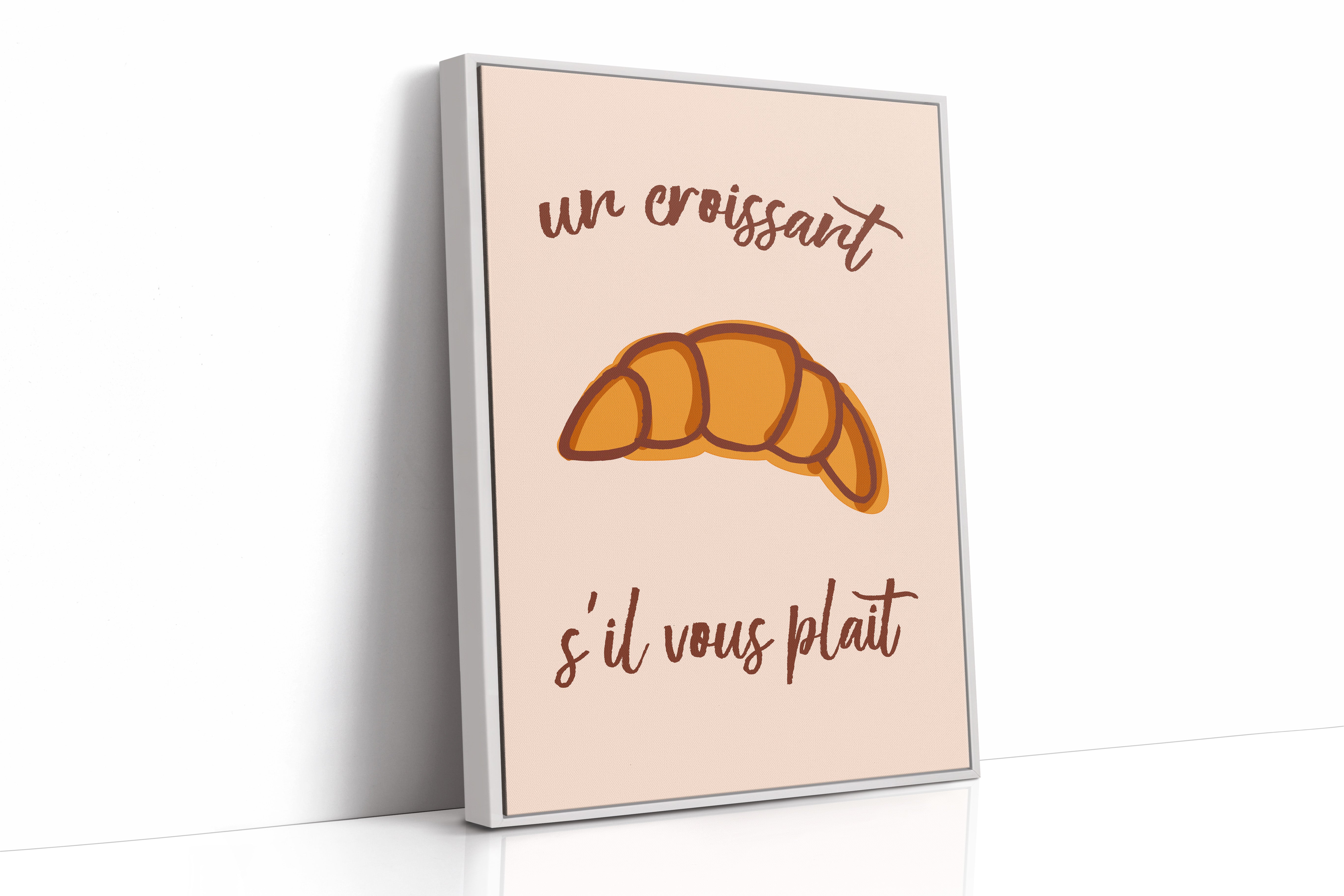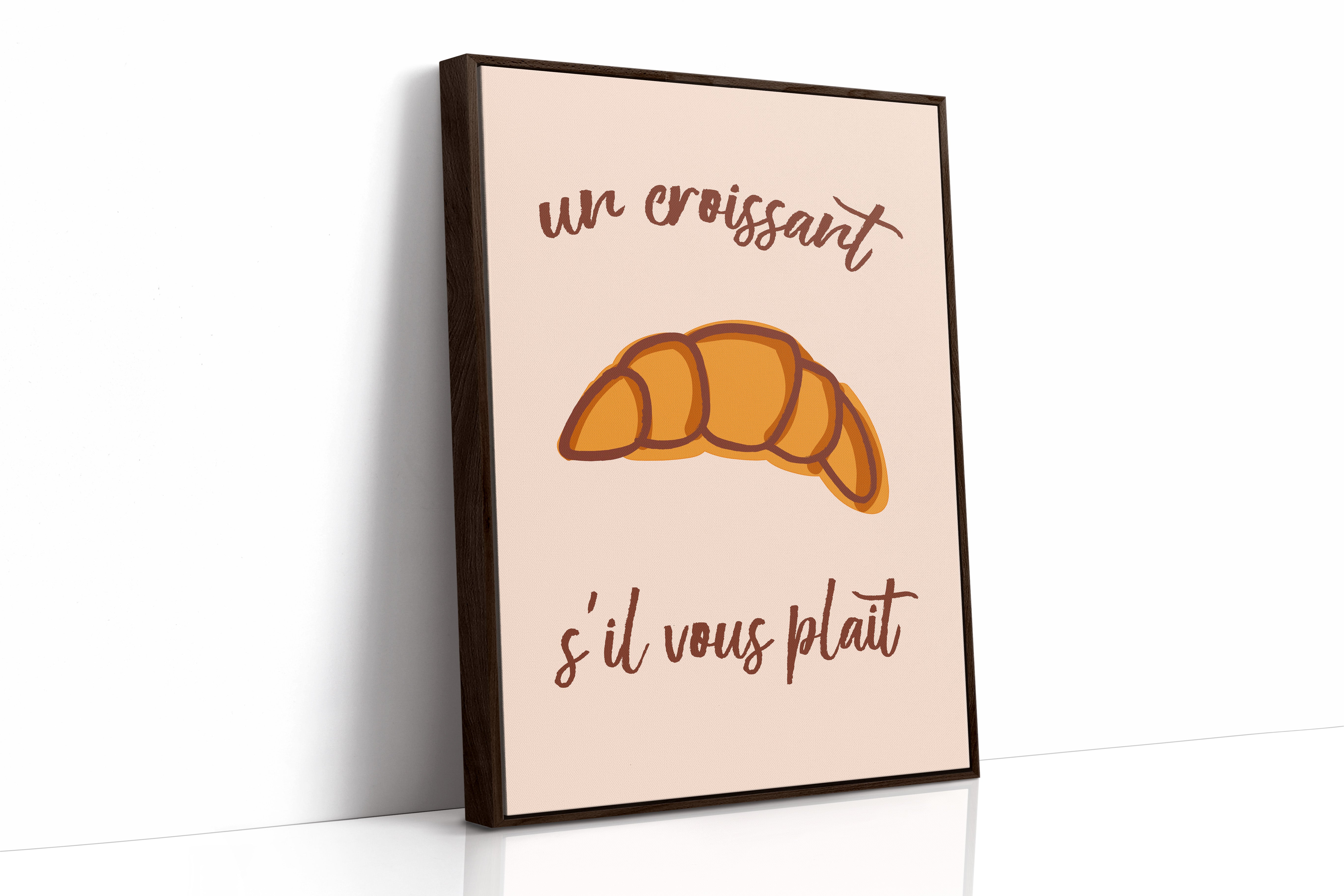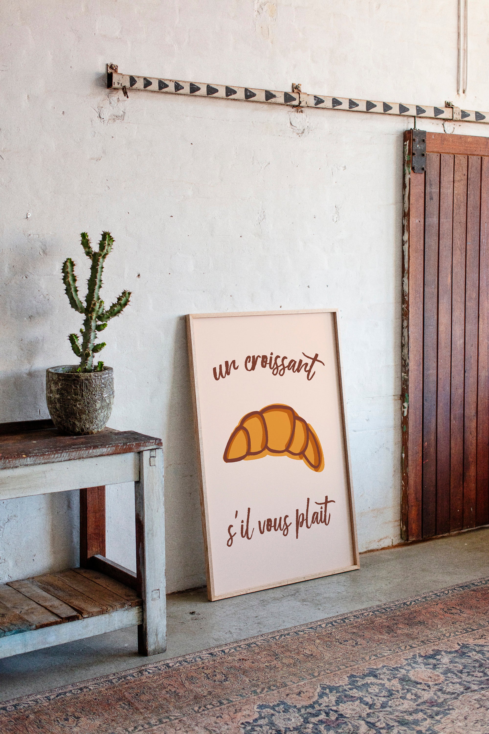 A golden croissant curves with grace against a soft blush backdrop, its buttery layers promising indulgent Parisian moments. This piece from our Contemporary collection brings modern minimalism to classic French charm. The warm brown brushstroke text adds a playful personality, while the simple illustration captures the essence of casual elegance that defines French cafe culture. The soft peach background creates a serene canvas that allows both the typography and pastry to take center stage. Perfect for adding a touch of European sophistication to kitchen spaces or dining areas. This piece invites viewers to slow down and savor life's simple pleasures, one croissant at a time.