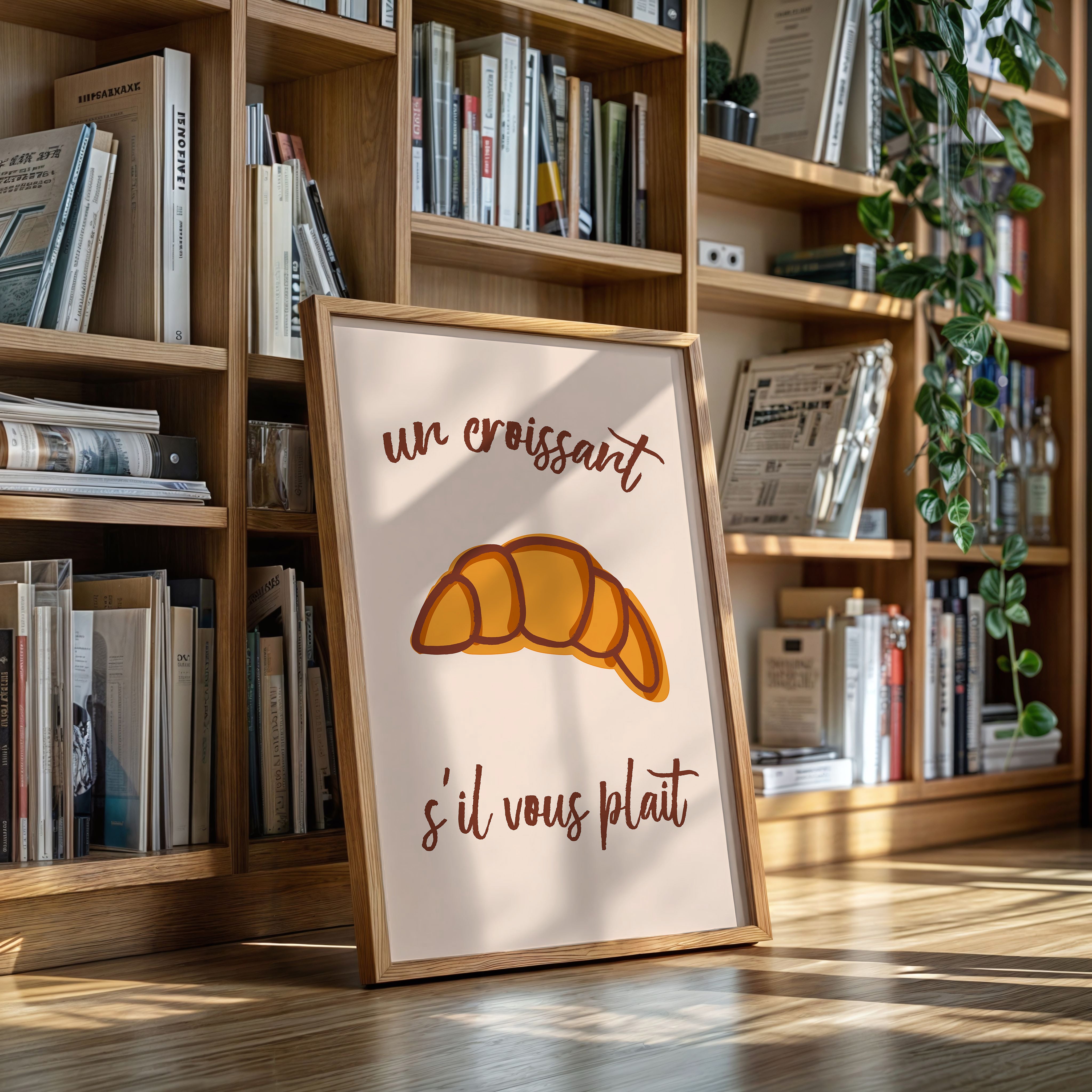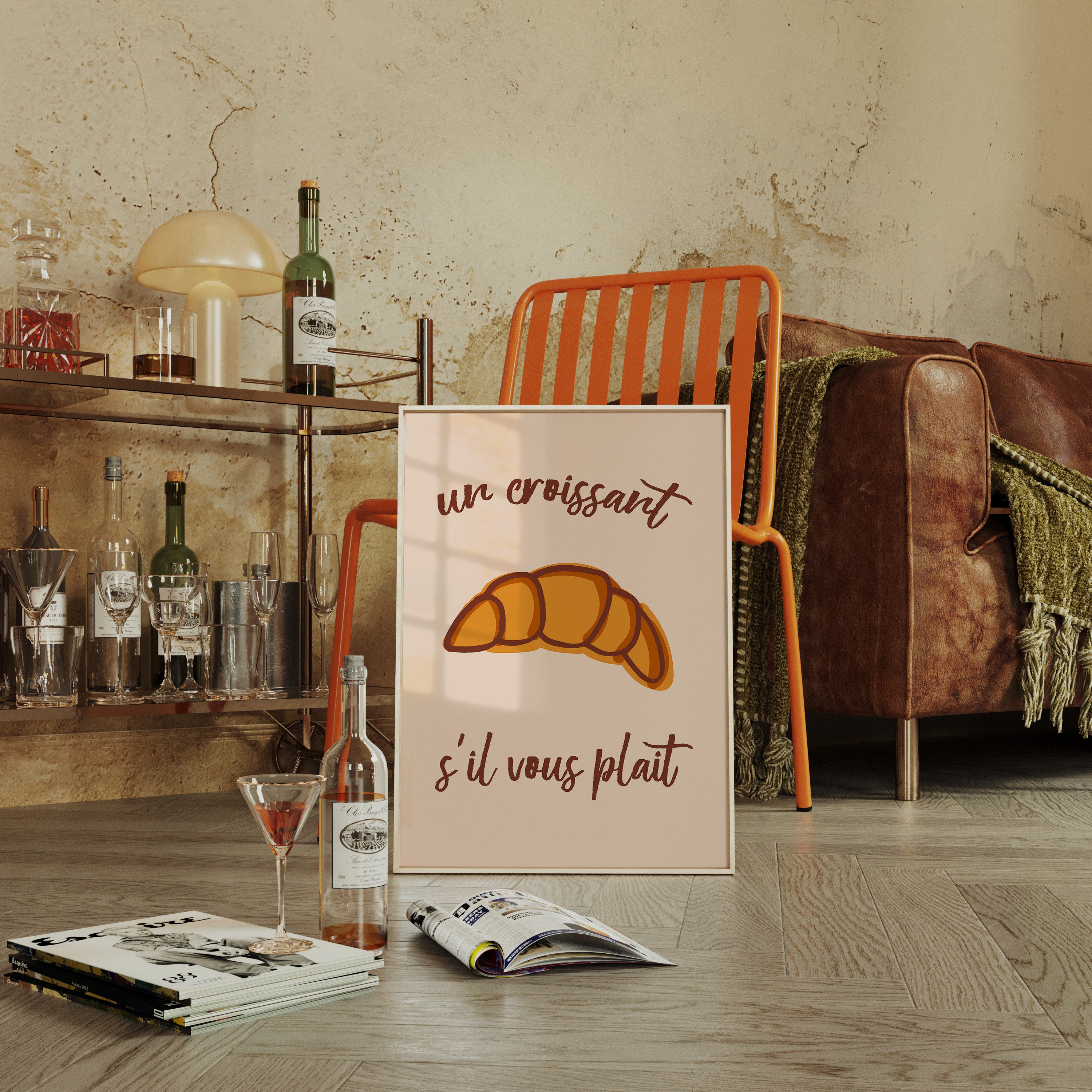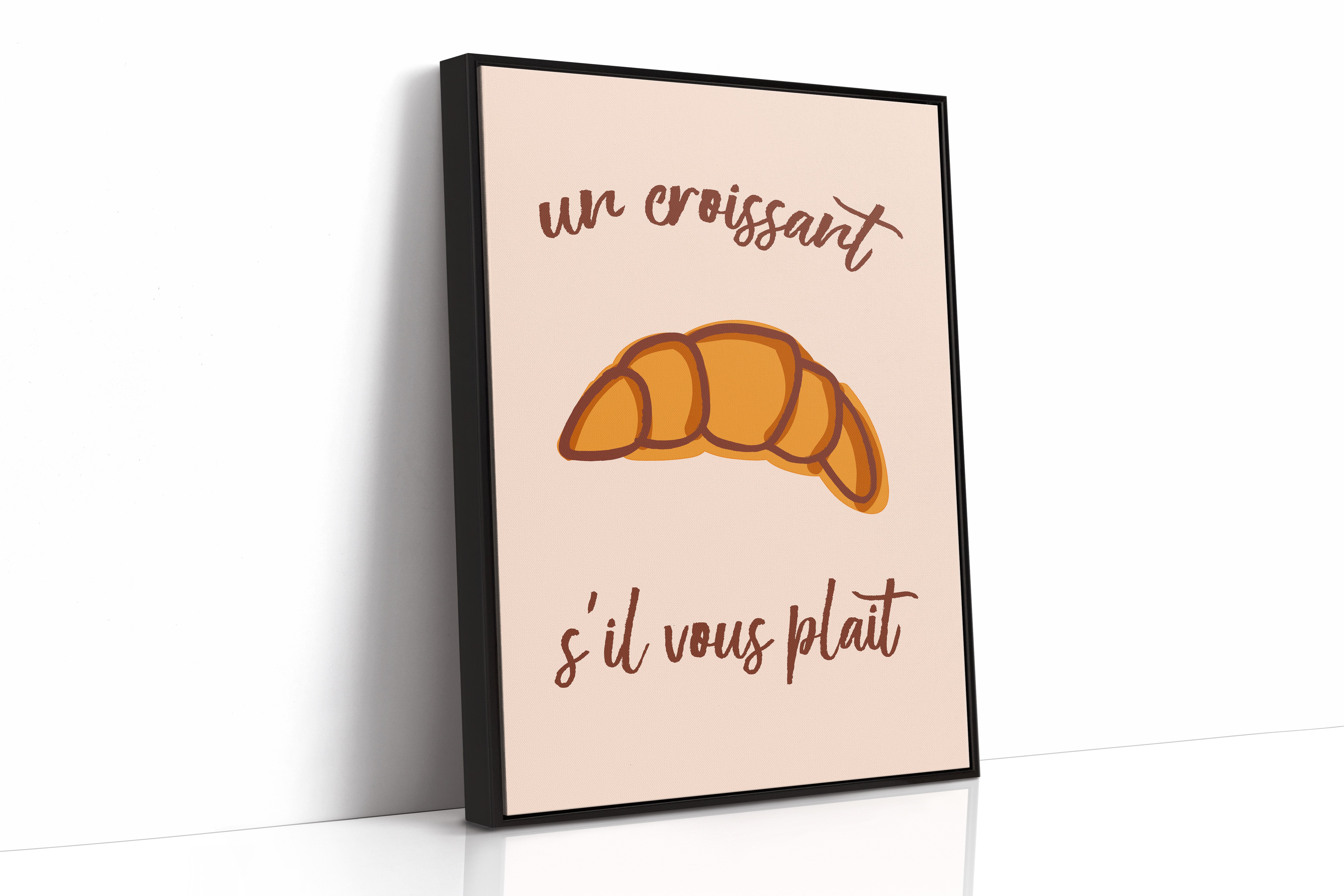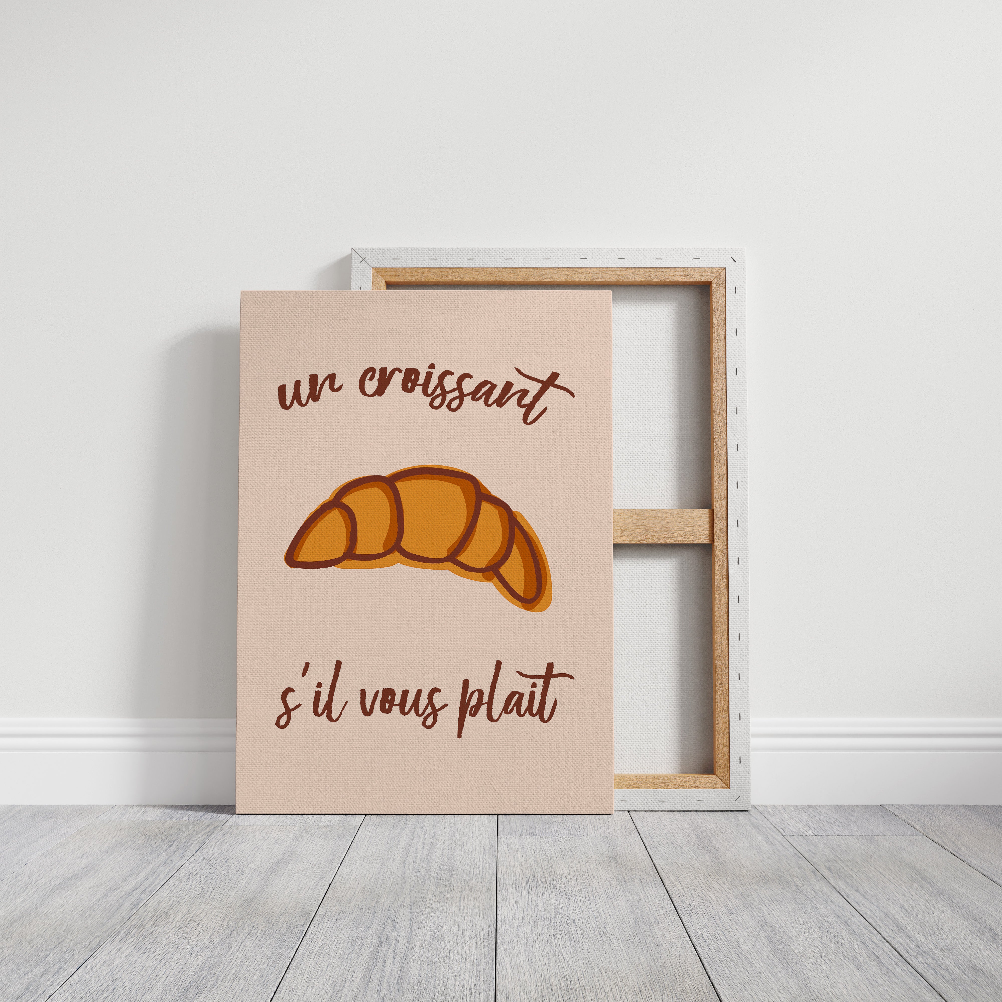 A golden croissant curves with grace against a soft blush backdrop, its buttery layers promising indulgent Parisian moments. This piece from our Contemporary collection brings modern minimalism to classic French charm. The warm brown brushstroke text adds a playful personality, while the simple illustration captures the essence of casual elegance that defines French cafe culture. The soft peach background creates a serene canvas that allows both the typography and pastry to take center stage. Perfect for adding a touch of European sophistication to kitchen spaces or dining areas. This piece invites viewers to slow down and savor life's simple pleasures, one croissant at a time.