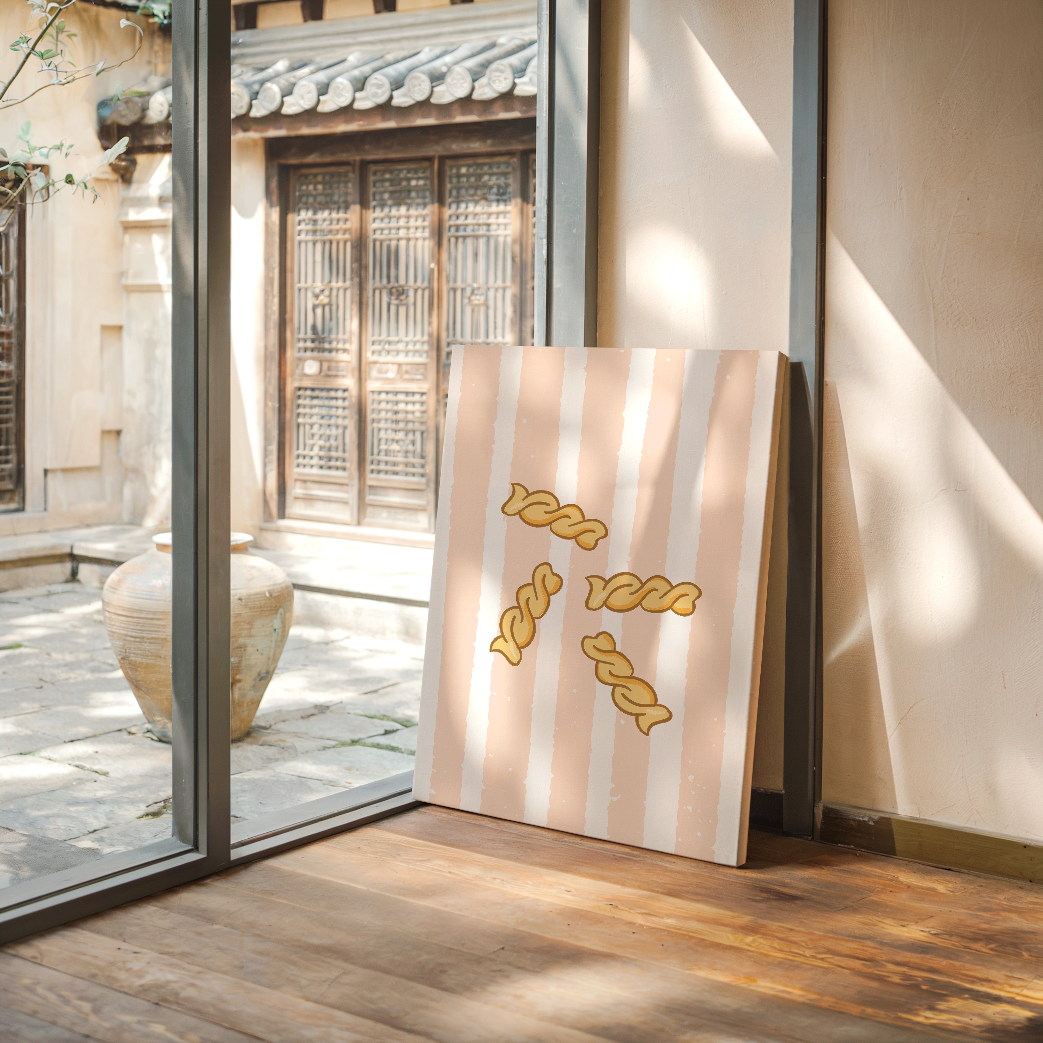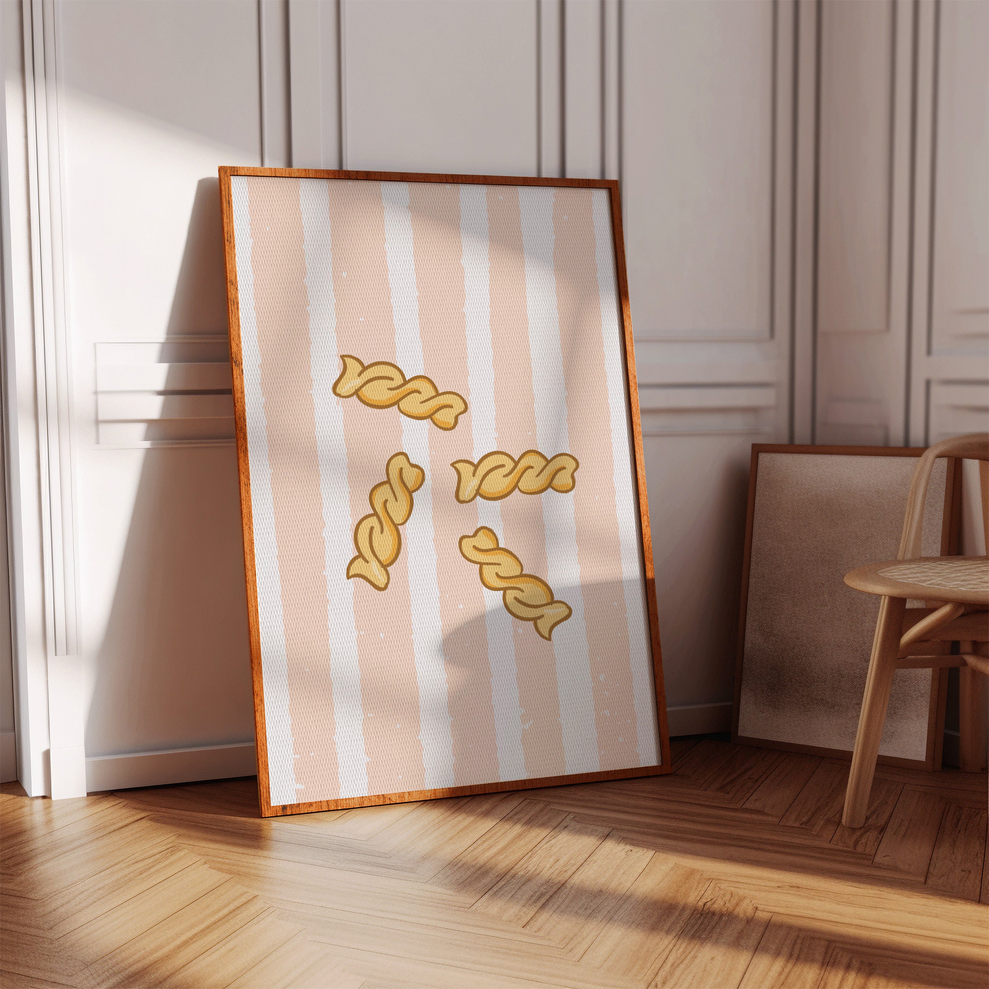 Delicate twists of golden pasta float weightlessly against soft peachy stripes, creating a whimsical moment of culinary ballet. This piece from our Contemporary collection brings playful minimalism to modern food art. The gentle curves of each pasta shape seem to pirouette across the canvas, their buttery yellow tones contrasting beautifully with the vertical blush stripes and tiny white dots that add subtle texture. The composition speaks to the joy of simple ingredients and the beauty found in everyday kitchen moments. Perfect for adding a touch of culinary charm to a dining room or bringing personality to a modern kitchen space. This piece celebrates the artistry of food with a light, contemporary touch.