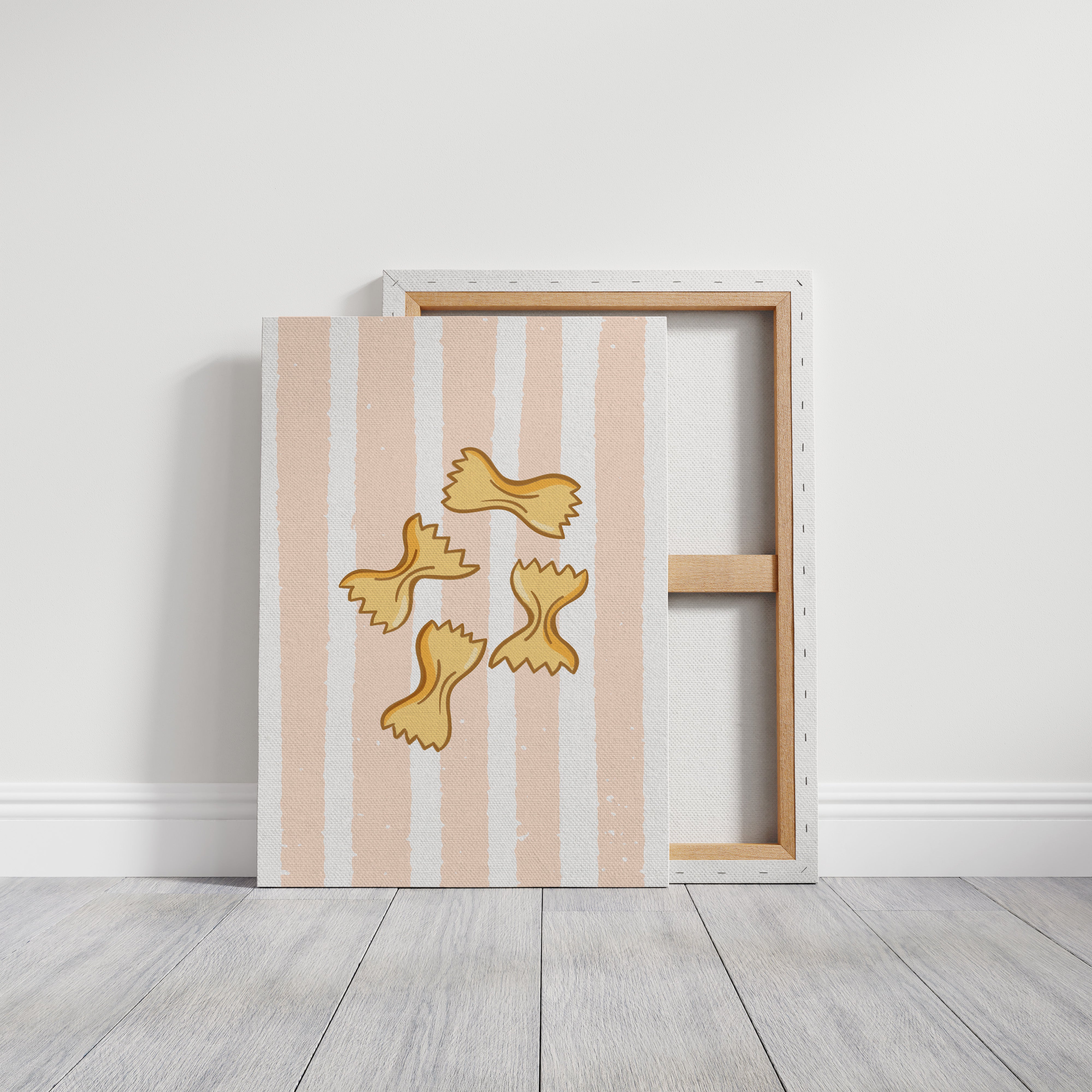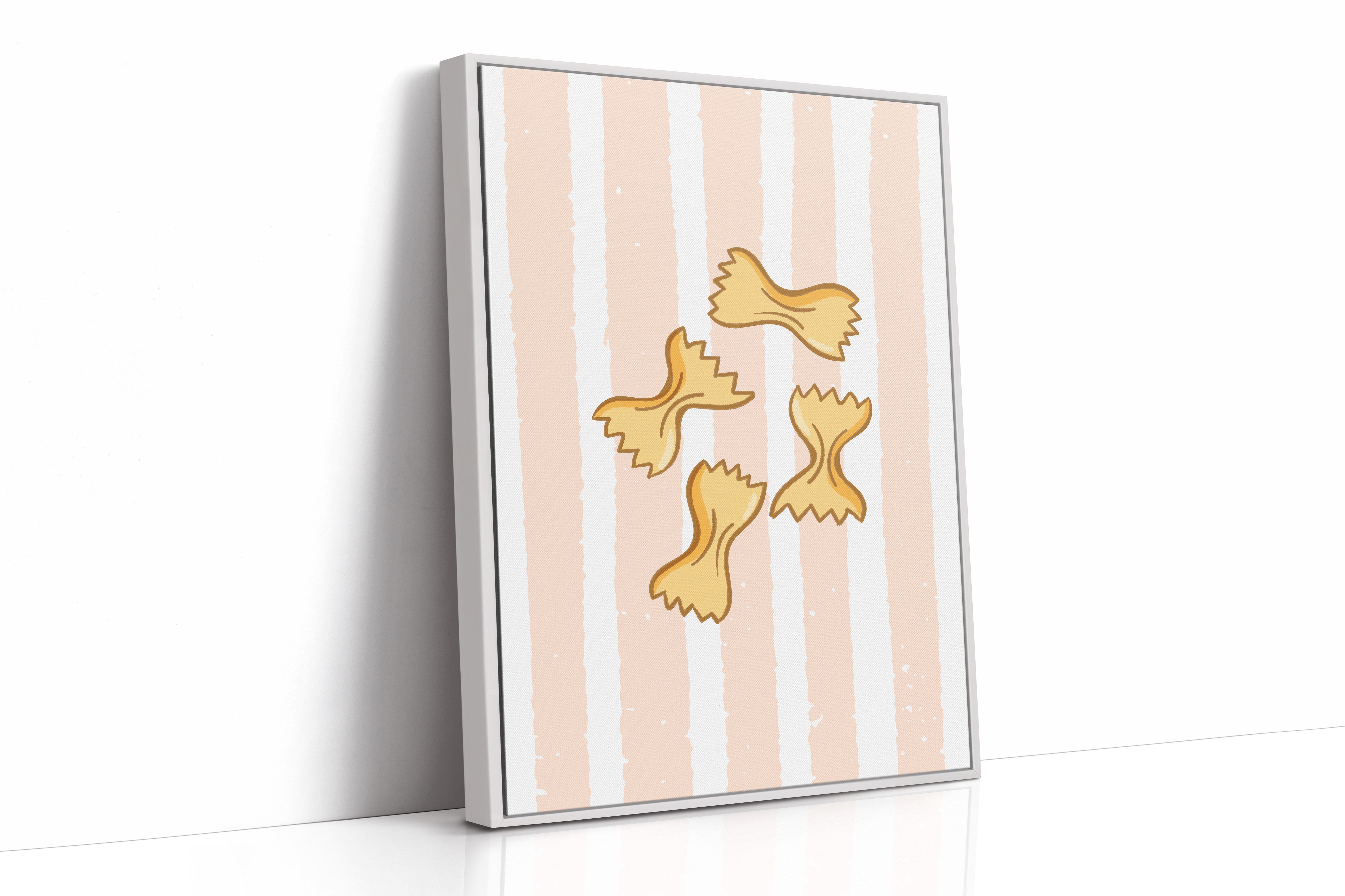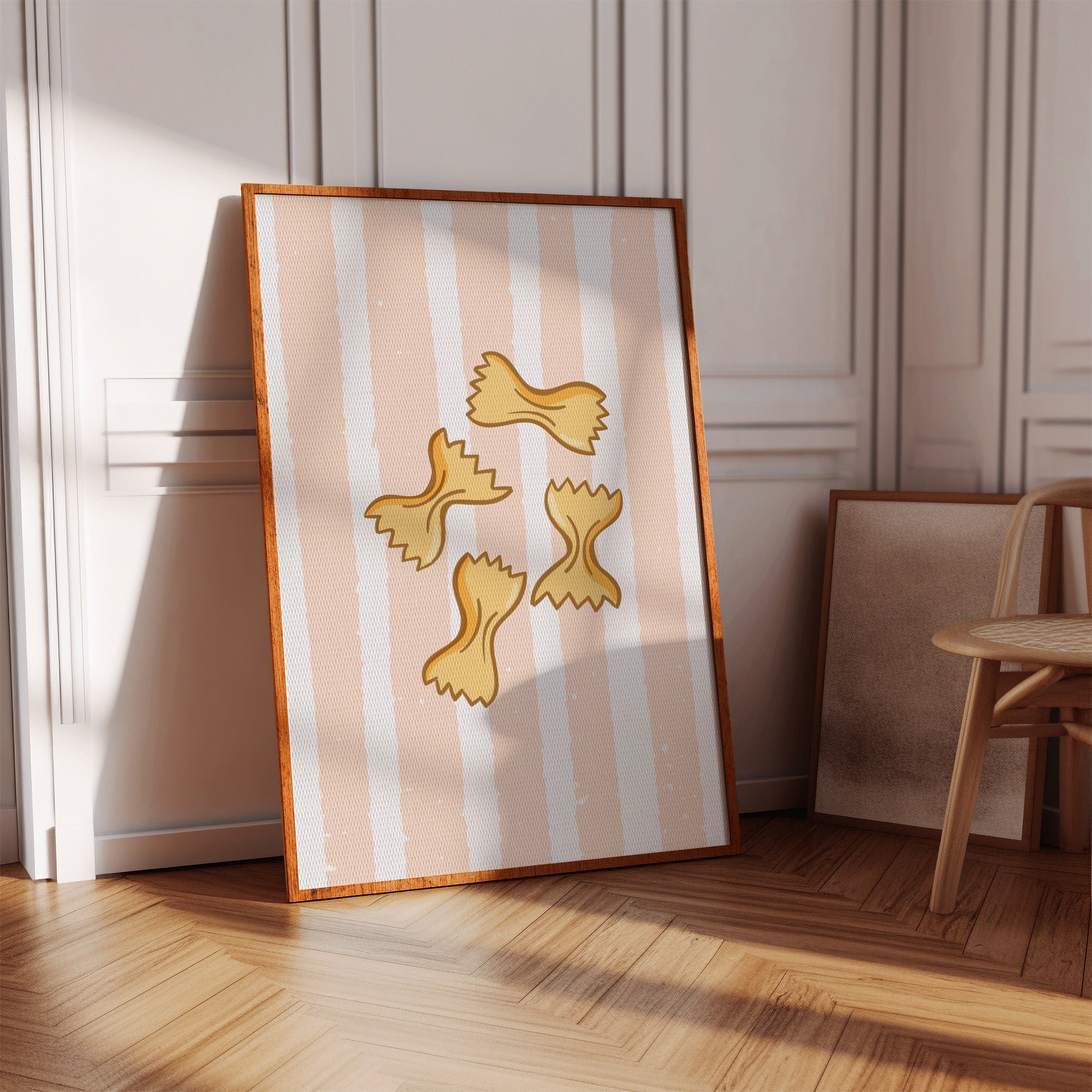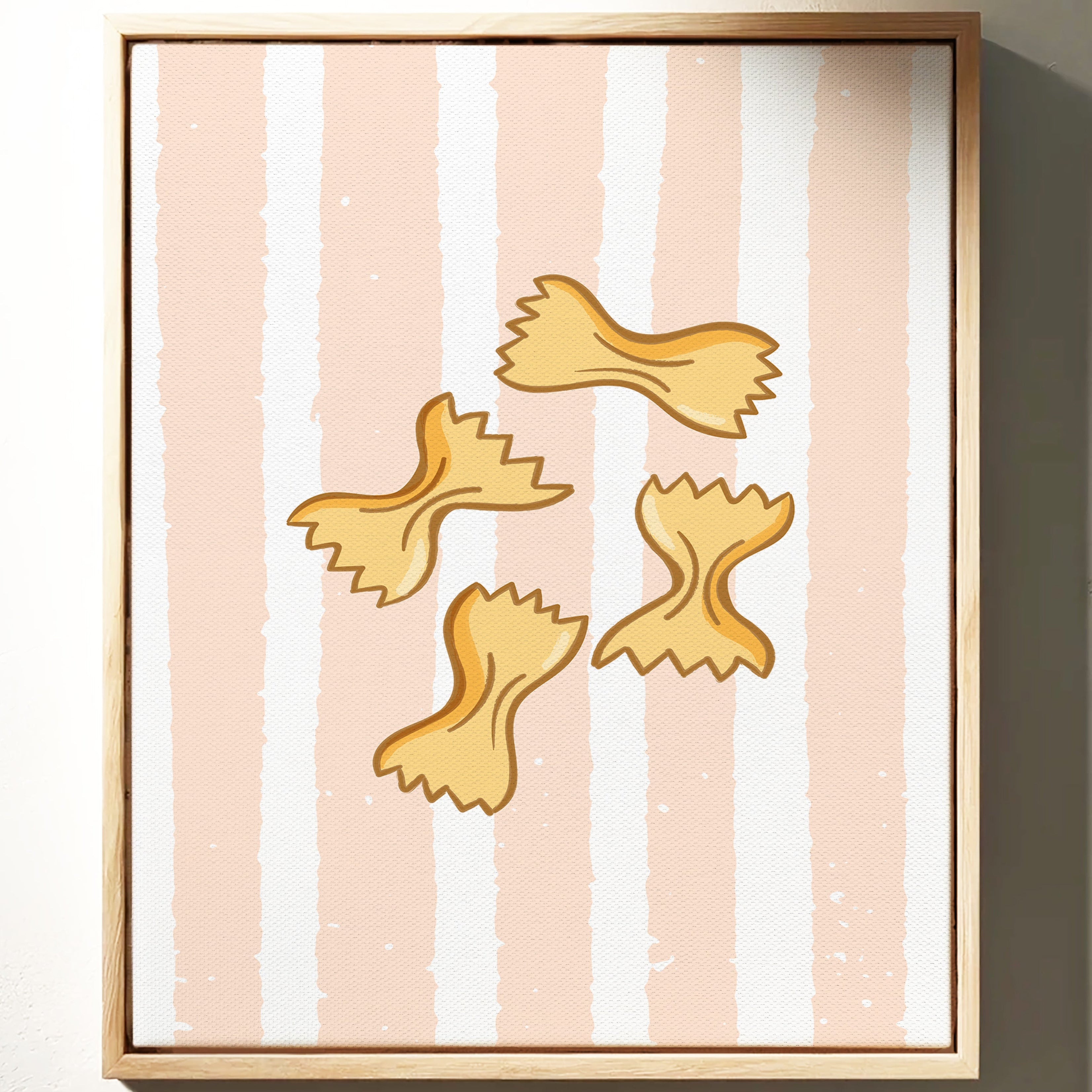 Delicate farfalle butterflies float against soft peach stripes, capturing the whimsy of a sun-drenched Italian kitchen. This playful contemporary piece celebrates the simple joy of culinary traditions. Golden pasta shapes create a rhythmic dance across the canvas, their gentle curves and jagged edges telling stories of family gatherings and cherished recipes passed down through generations. The warm palette and minimalist design evoke memories of Mediterranean charm and homemade comfort. Perfect for adding a touch of culinary sophistication to a modern kitchen or dining space, this piece brings both warmth and style to your home. The subtle texture and clean lines make it an ideal companion for both casual and formal dining environments.