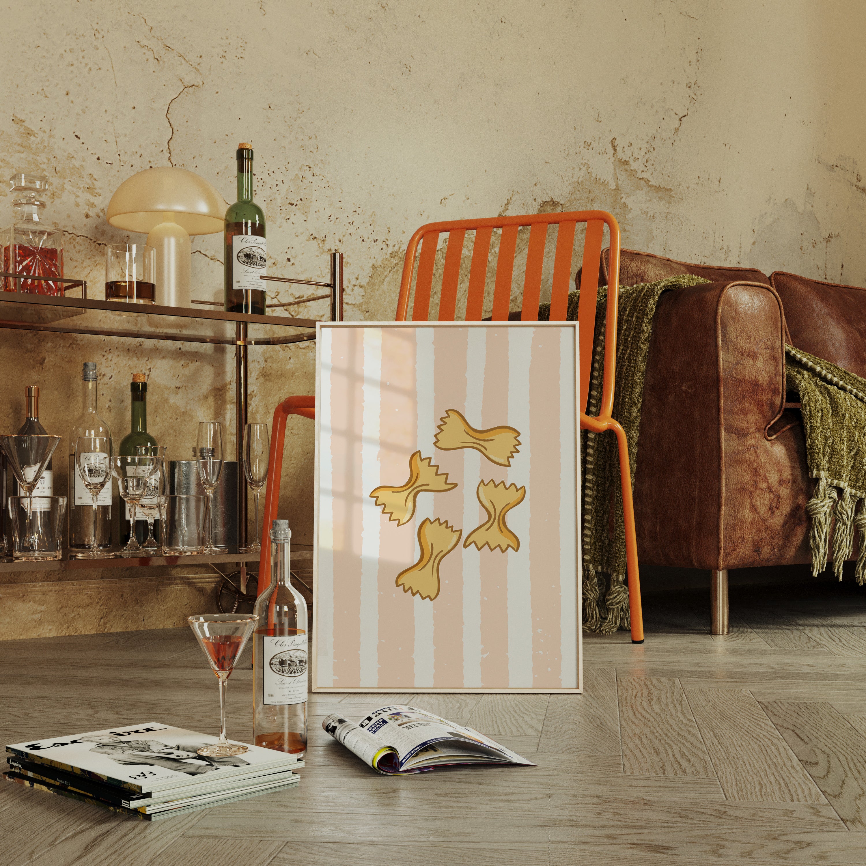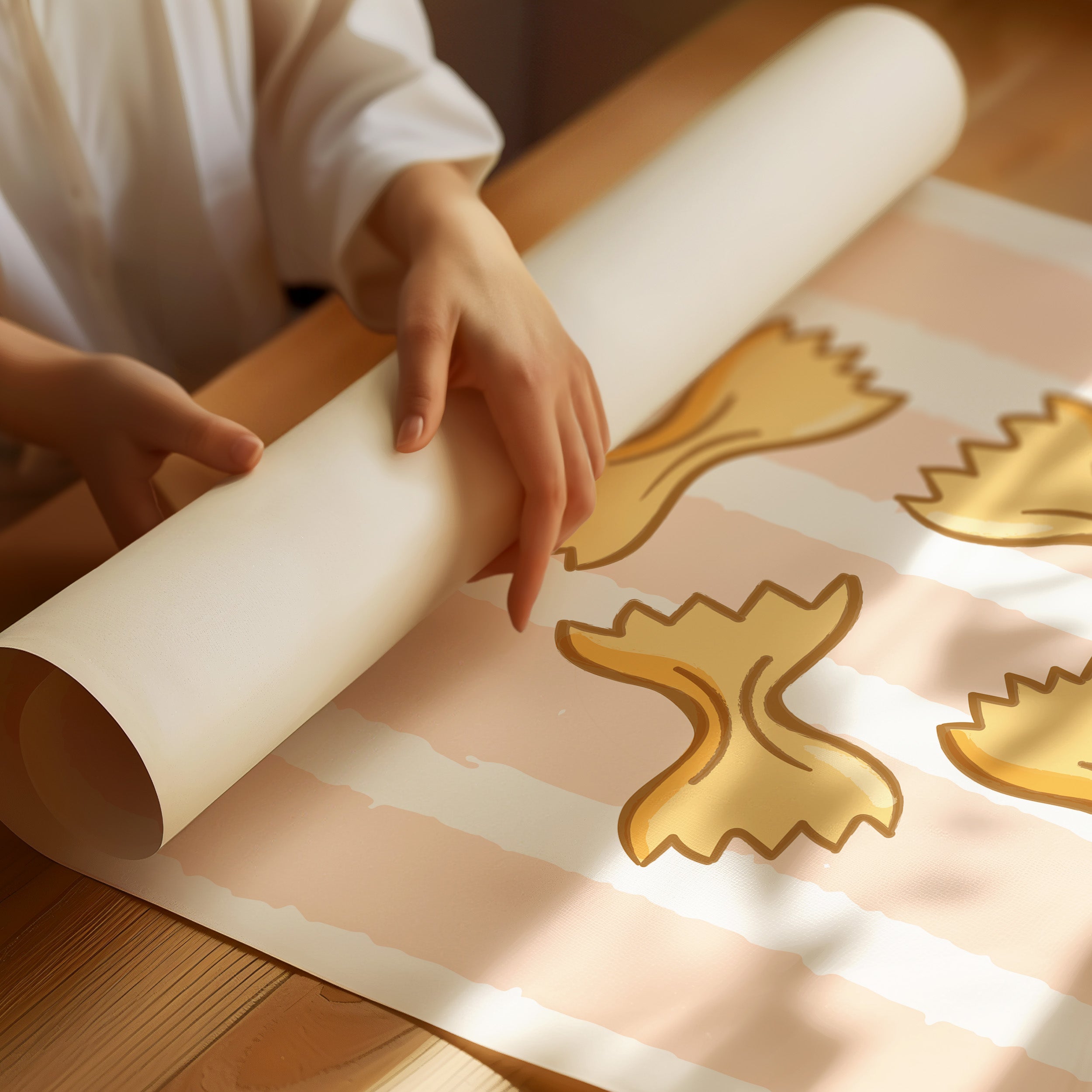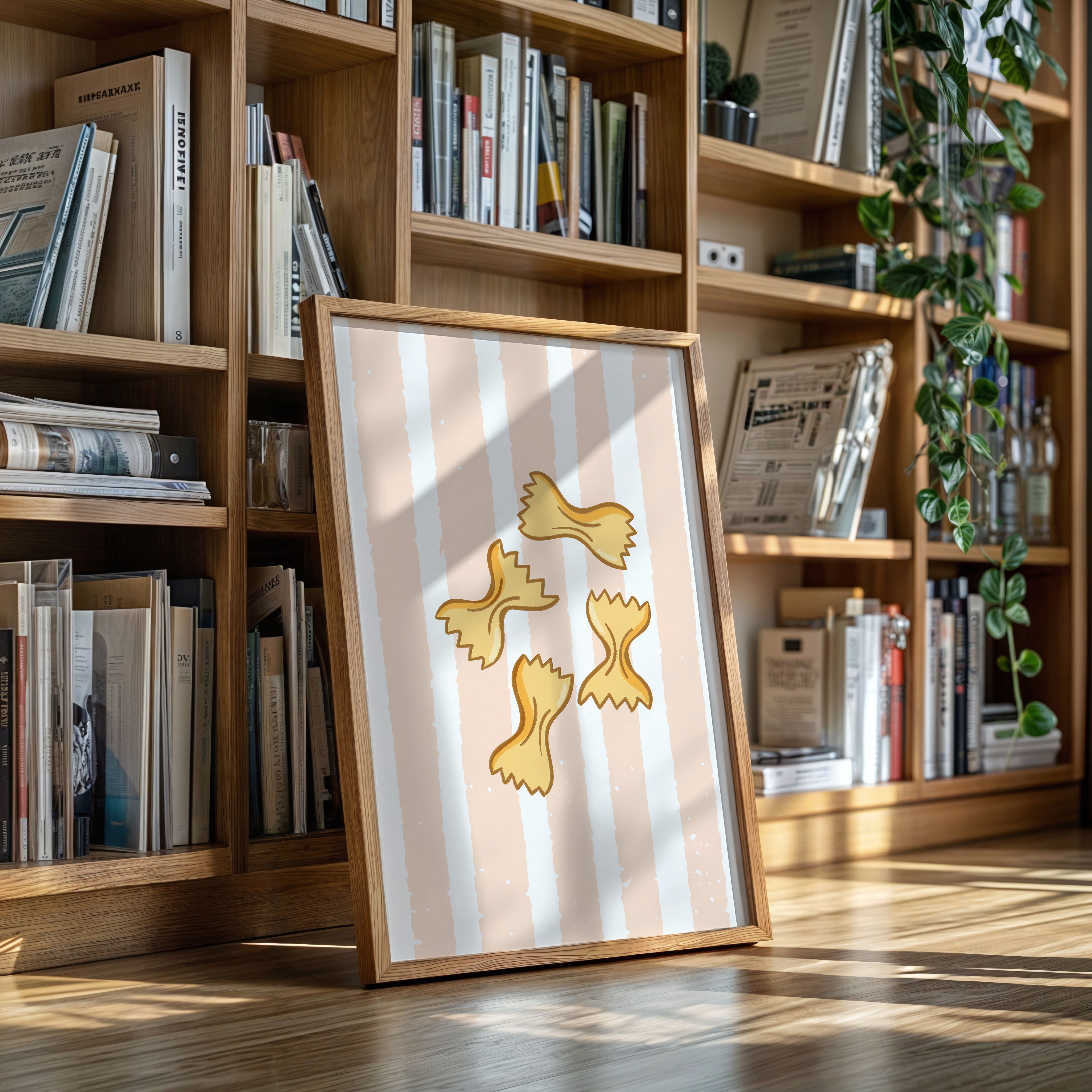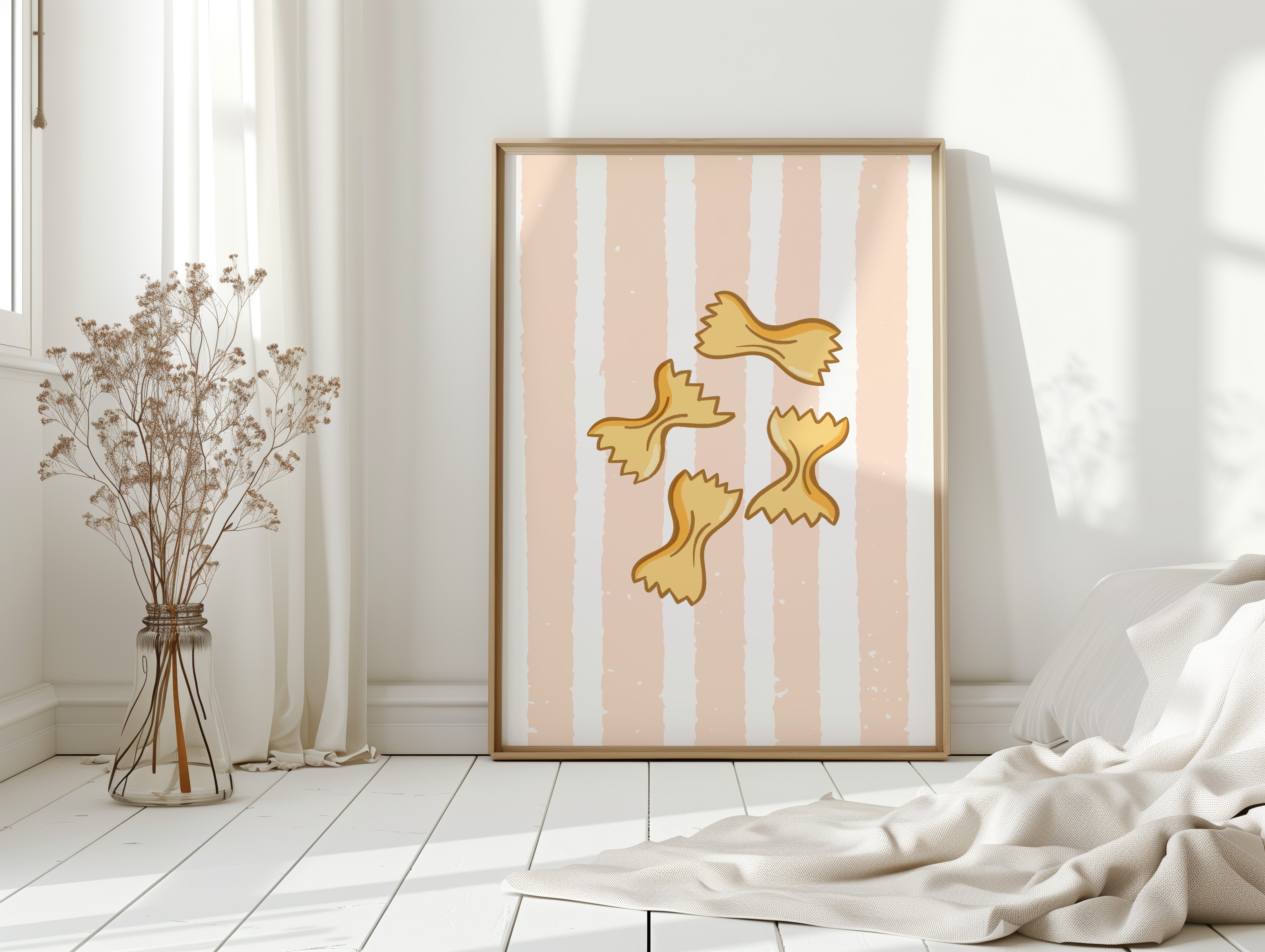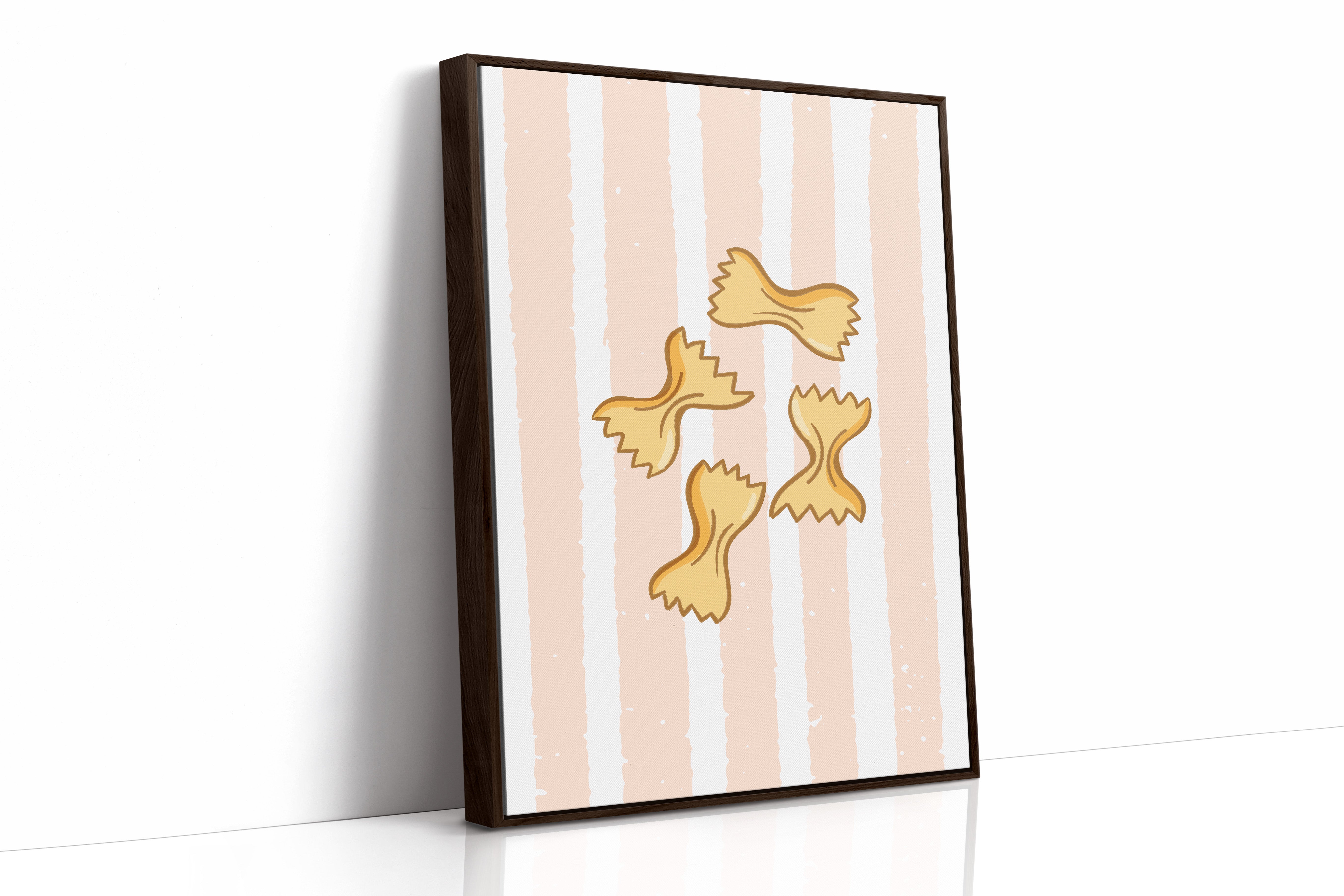 Delicate farfalle butterflies float against soft peach stripes, capturing the whimsy of a sun-drenched Italian kitchen. This playful contemporary piece celebrates the simple joy of culinary traditions. Golden pasta shapes create a rhythmic dance across the canvas, their gentle curves and jagged edges telling stories of family gatherings and cherished recipes passed down through generations. The warm palette and minimalist design evoke memories of Mediterranean charm and homemade comfort. Perfect for adding a touch of culinary sophistication to a modern kitchen or dining space, this piece brings both warmth and style to your home. The subtle texture and clean lines make it an ideal companion for both casual and formal dining environments.