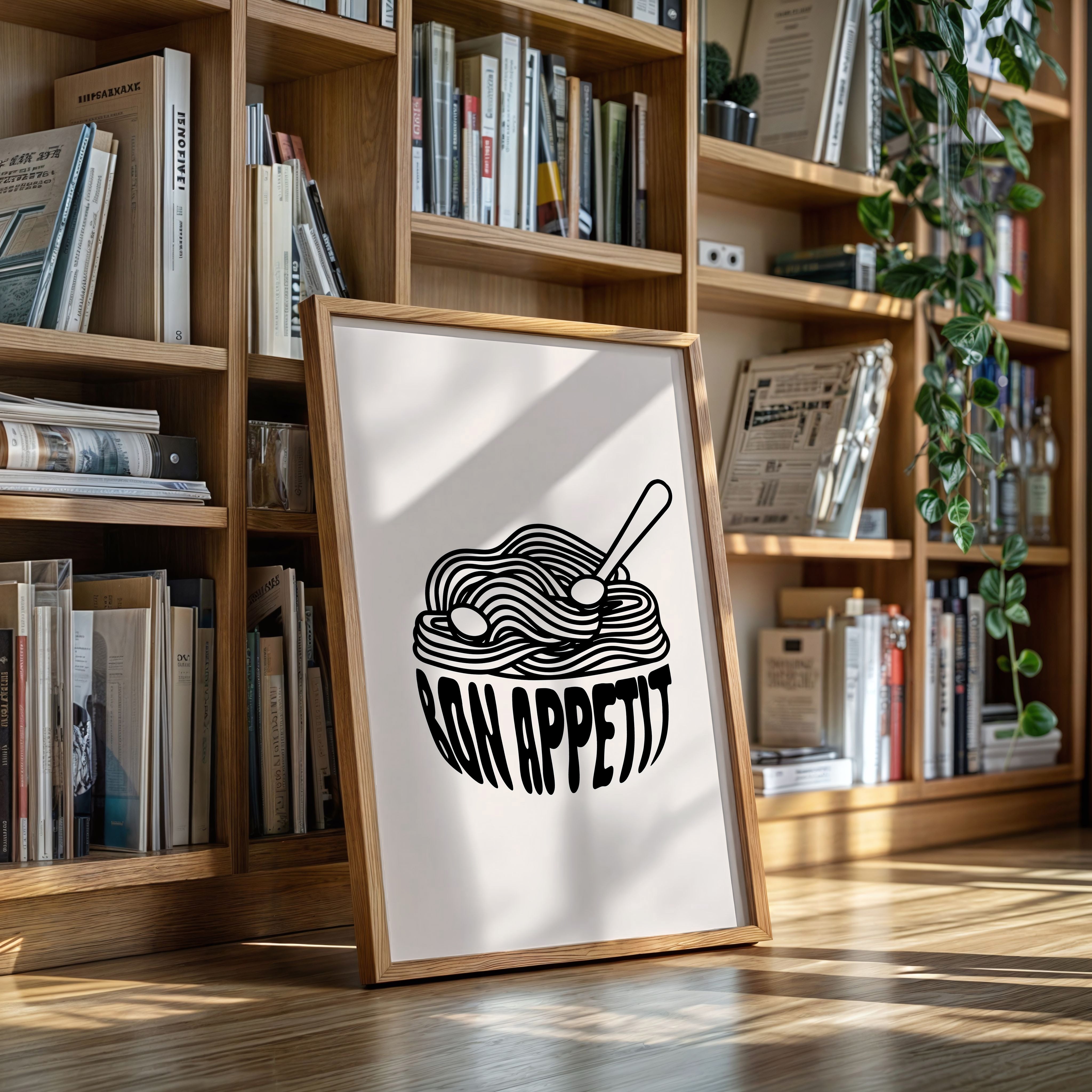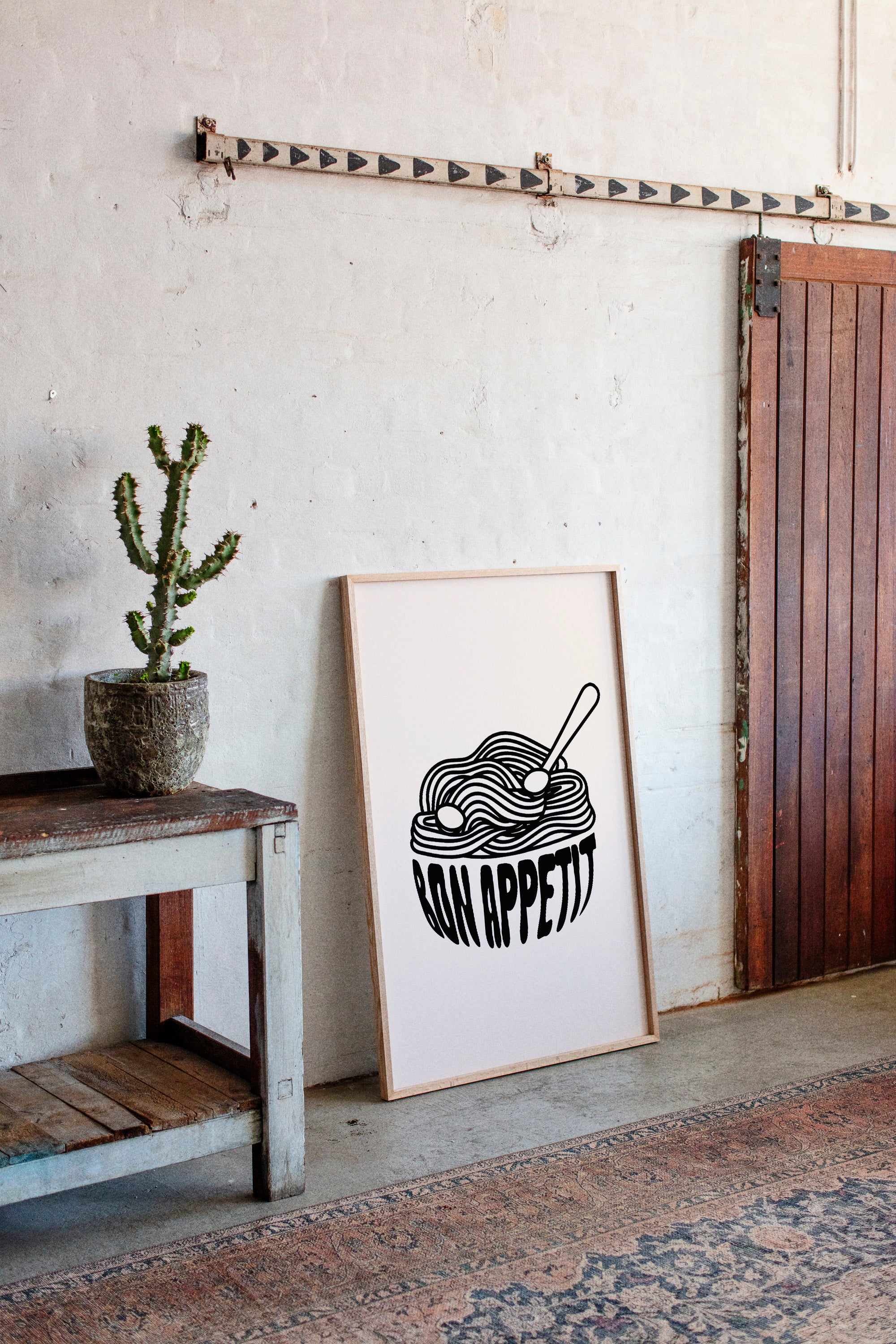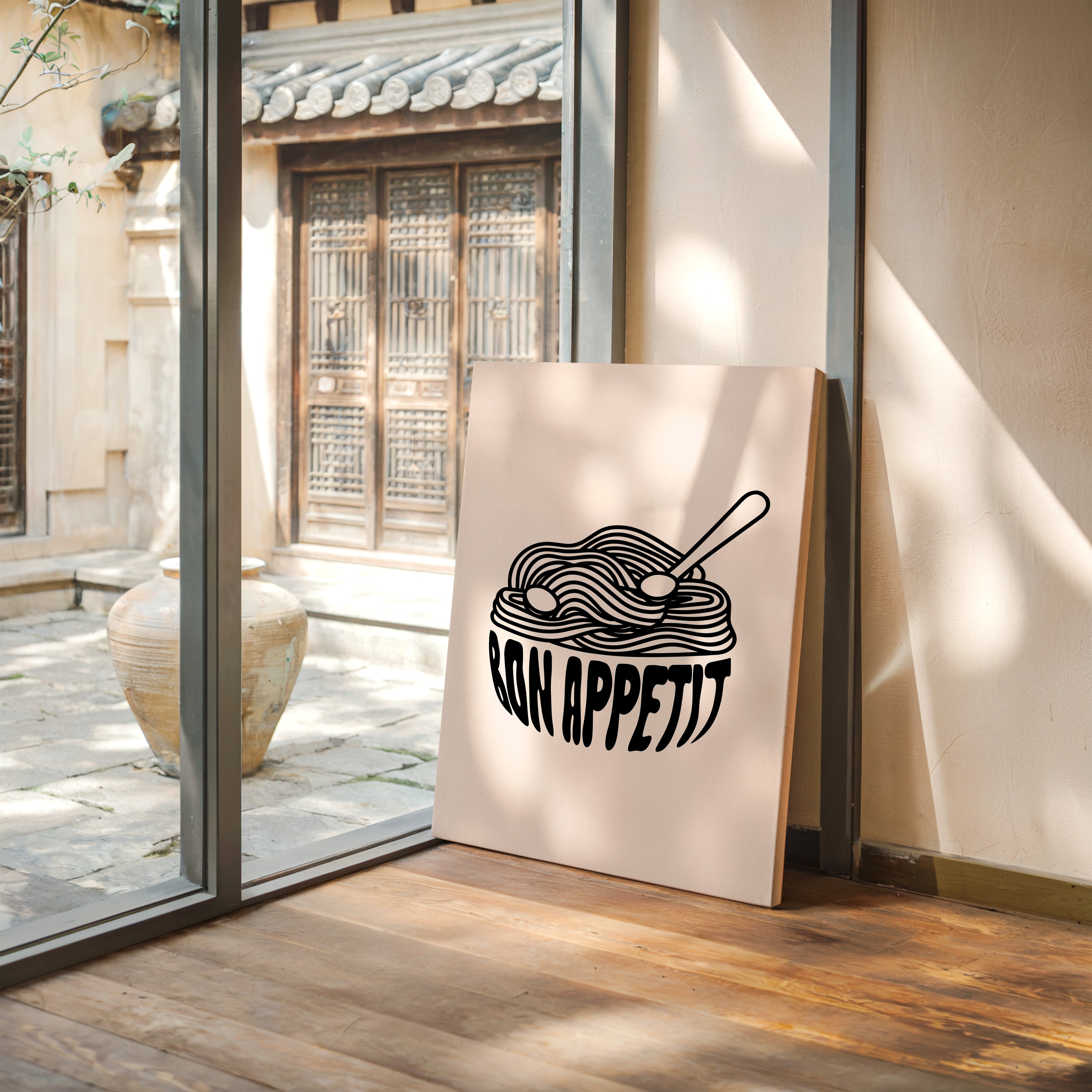 Steam rises from a bowl of perfectly coiled noodles, a simple spoon resting in anticipation of the first bite. This bold contemporary piece captures the essence of modern culinary art through clean lines and striking contrast. The playful typography merges with the flowing pasta strands, creating a harmonious dance between text and texture that celebrates the joy of dining. Each curve and swirl invites the viewer into a moment of pure gastronomic pleasure, while the minimalist black and white palette speaks to timeless sophistication. This statement piece brings personality and warmth to dining rooms and kitchen spaces, creating an inviting atmosphere that celebrates the art of eating well.