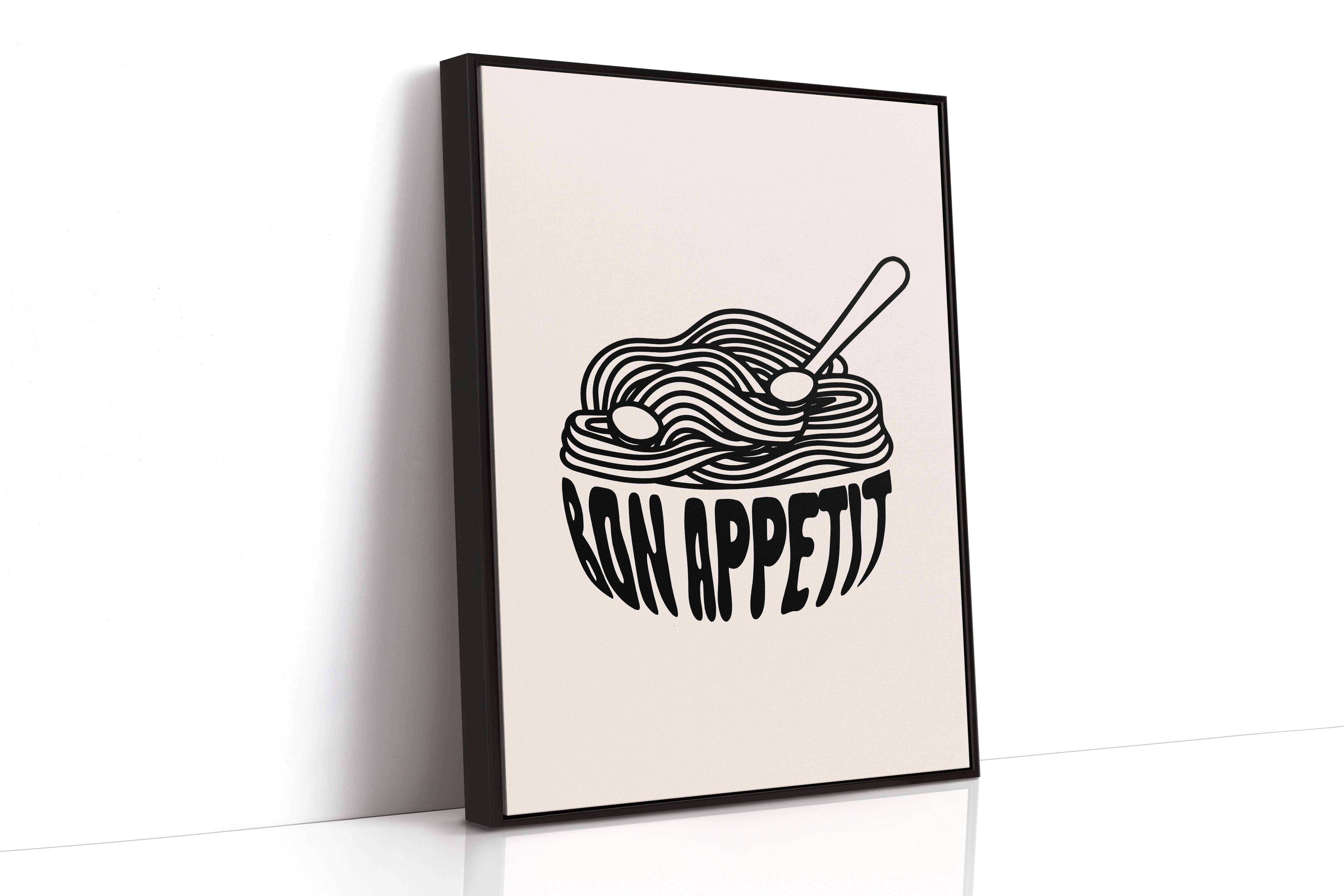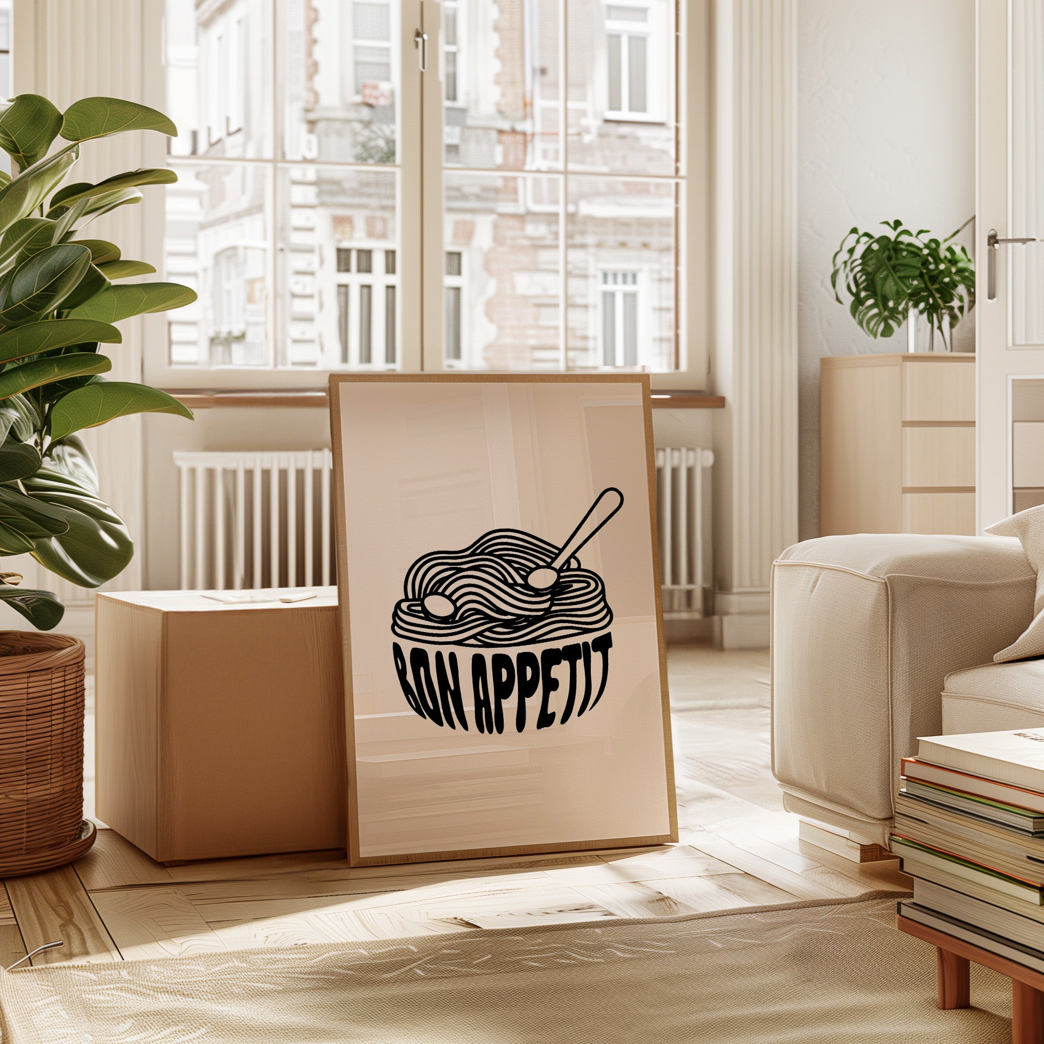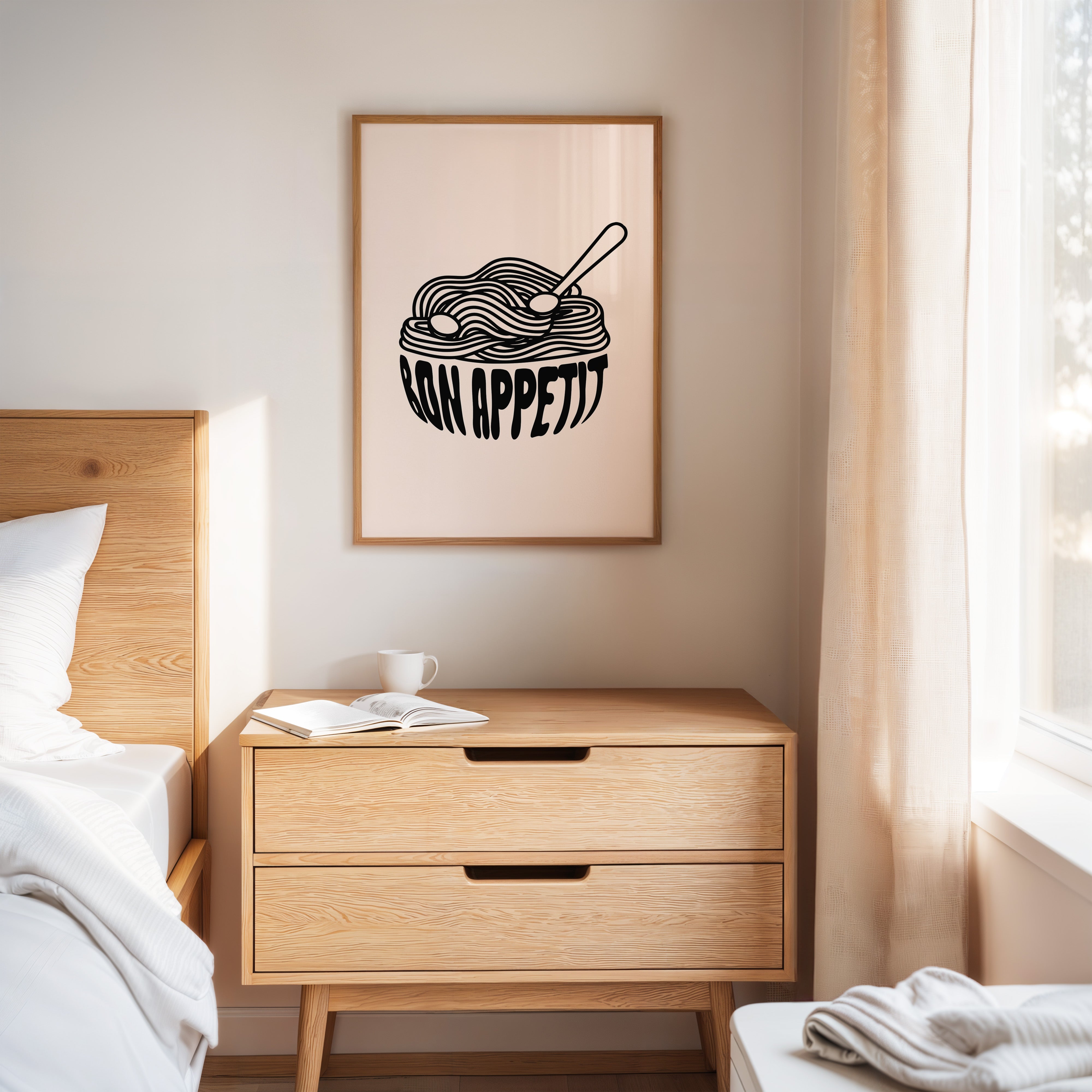 Steam rises from a bowl of perfectly coiled noodles, a simple spoon resting in anticipation of the first bite. This bold contemporary piece captures the essence of modern culinary art through clean lines and striking contrast. The playful typography merges with the flowing pasta strands, creating a harmonious dance between text and texture that celebrates the joy of dining. Each curve and swirl invites the viewer into a moment of pure gastronomic pleasure, while the minimalist black and white palette speaks to timeless sophistication. This statement piece brings personality and warmth to dining rooms and kitchen spaces, creating an inviting atmosphere that celebrates the art of eating well.