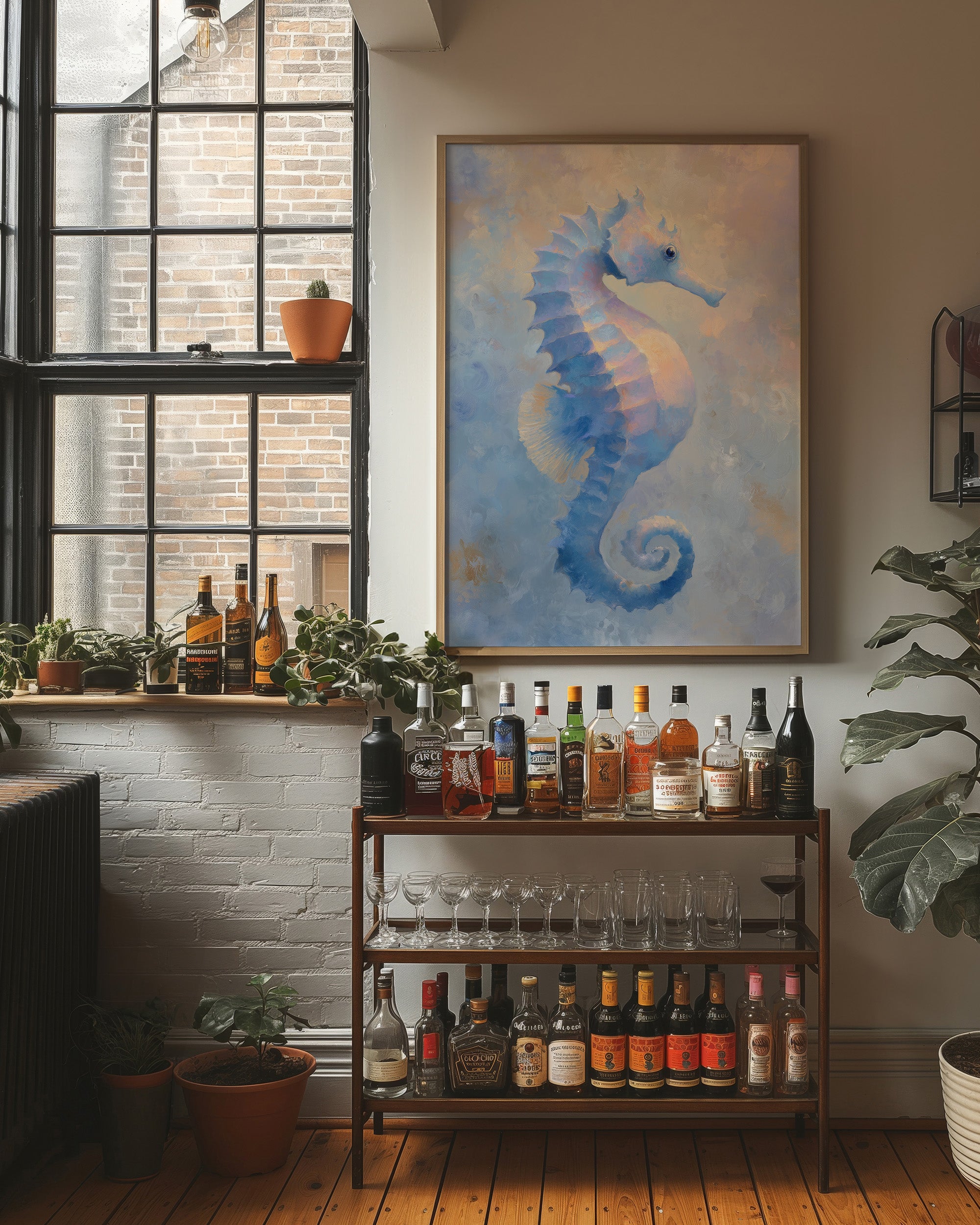 A delicate seahorse painting against its wooden blue, and peach. The seahorse appears to float gracefully against a dreamy watercolor background that evokes the gentle movement of underwater currents. The canvas reveals the textured surface characteristic of acrylic or oil painting, with subtle brushstrokes creating depth and dimension.