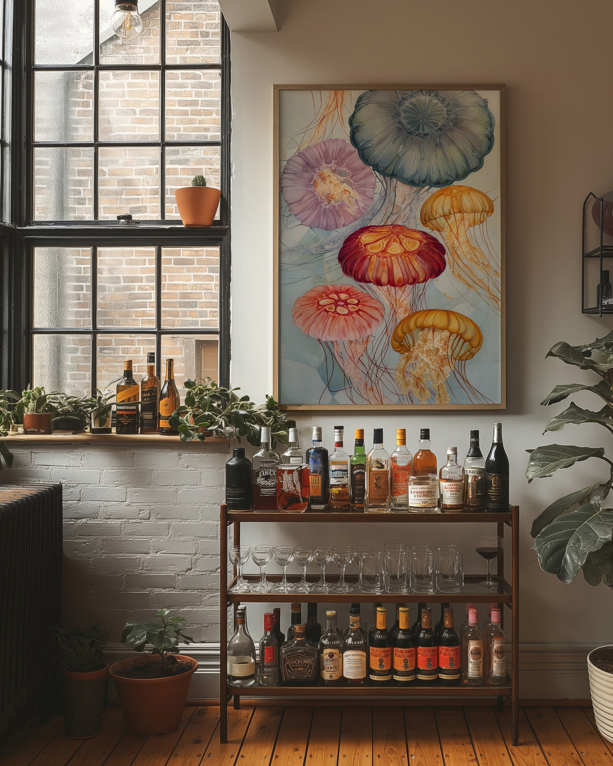 Soft-hued jellyfish float in an ethereal ballet, their delicate forms suspended in a dreamlike aquatic scene. Each bloomin shades of lavender, coral, amber, and tealunfurls with botanical elegance, tendrils trailing like memories through the pale waters. The gentle illustration captures nature's artistry at its most graceful, blending scientific precision with watercolor whimsy. This sophisticated marine study brings serene coastal energy to a modern living room or home office space.