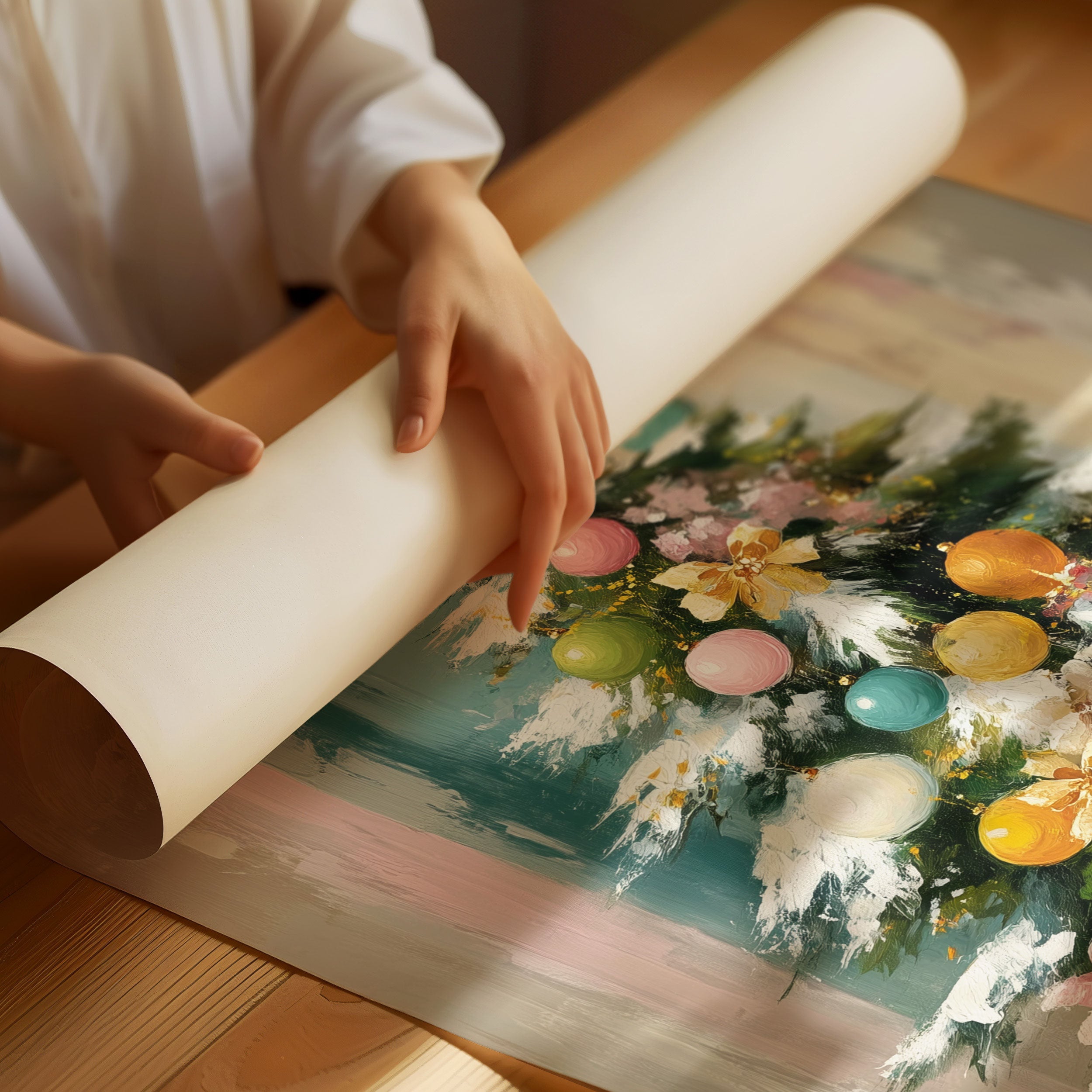 Soft brushstrokes capture the enchanting spirit of Christmas, where a festively adorned evergreen emerges from gentle washes of mint and blush. The painting dances with colorful ornaments in sweet pastels and warm golds, creating a modern twist on traditional holiday charm. Snow-dusted branches reach upward toward a golden star, while delicate flowers and ribbons add unexpected touches of whimsy throughout the composition. This contemporary interpretation brings fresh energy to classic holiday décor, perfect for creating a sophisticated seasonal focal point in modern living rooms or bright dining spaces.