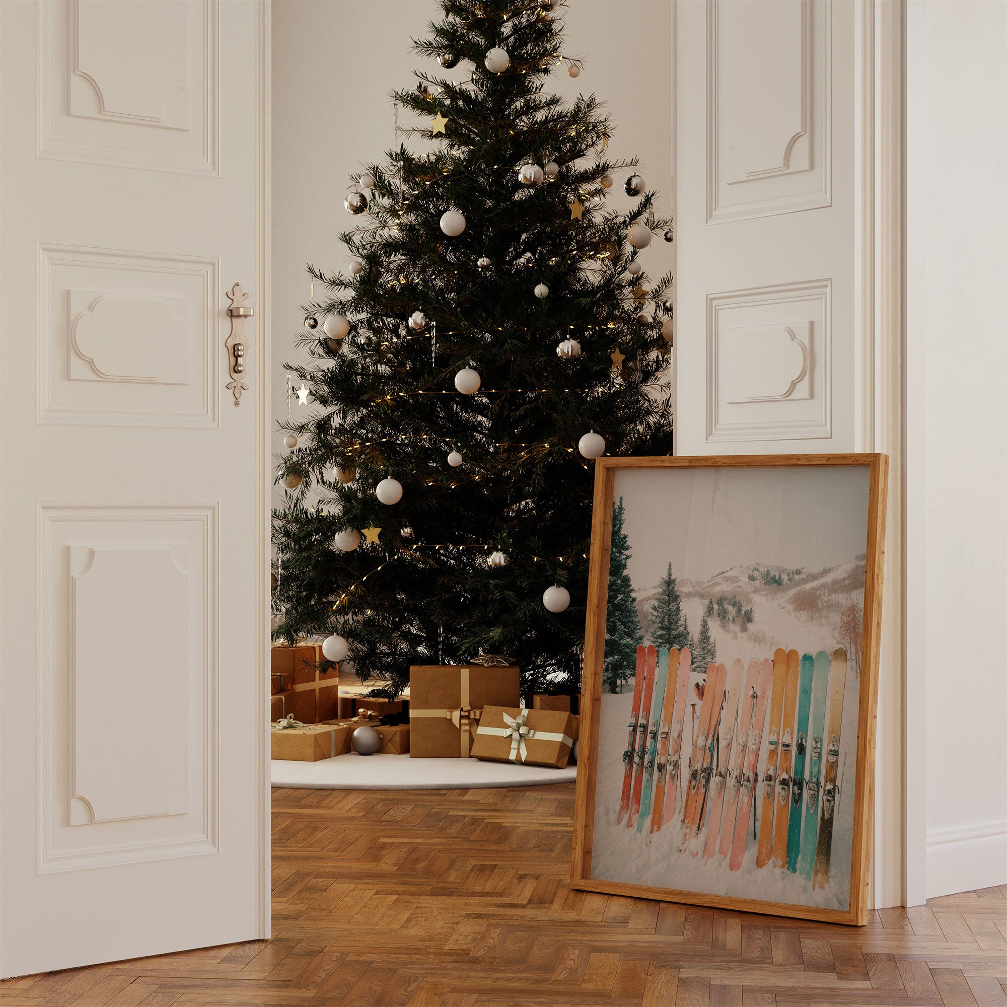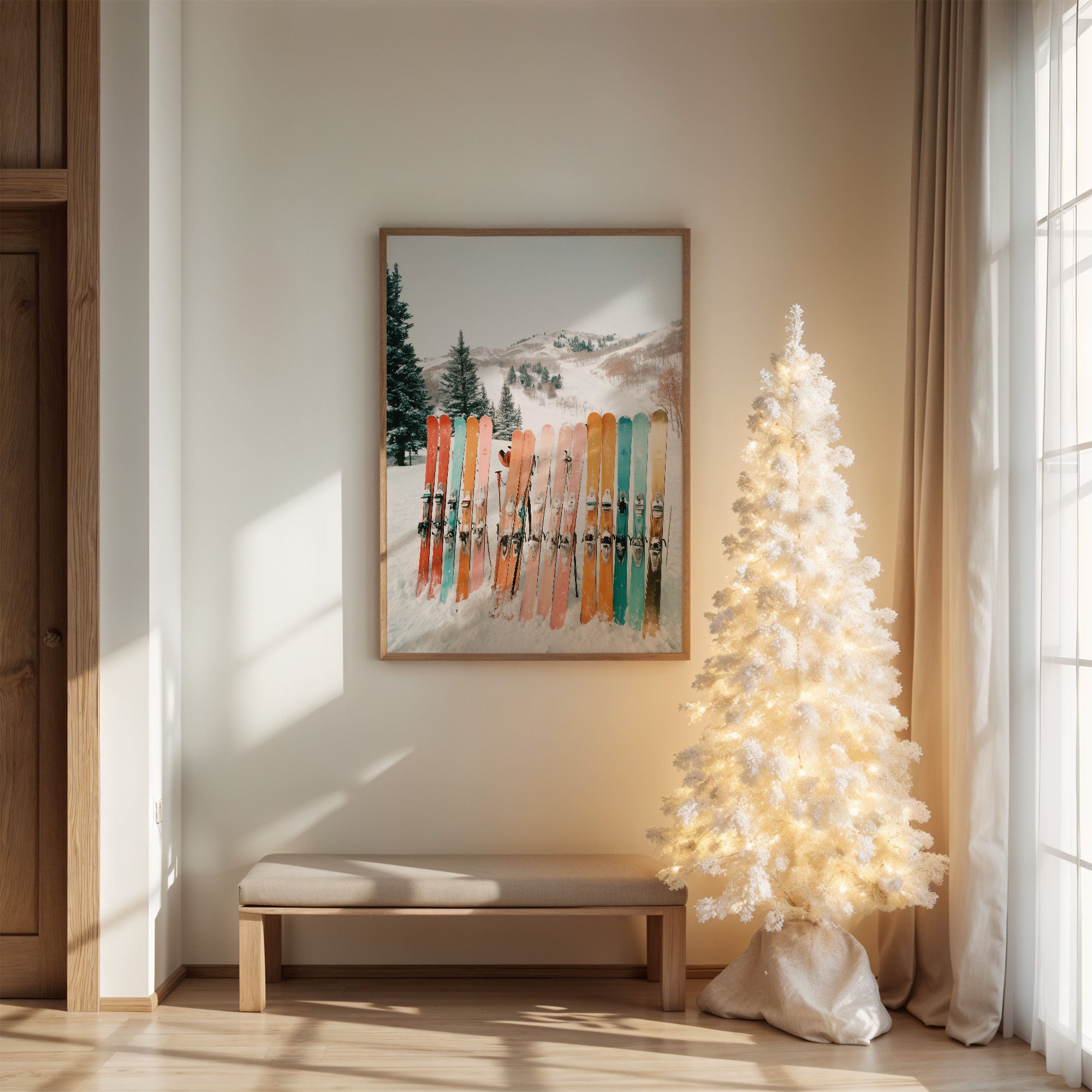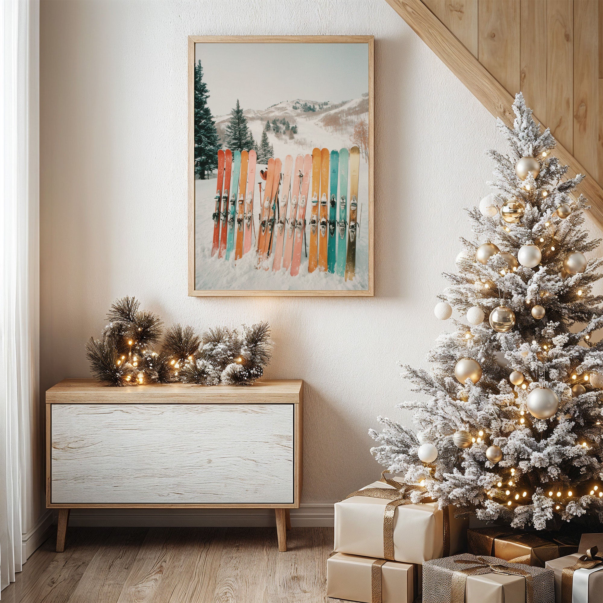 A row of vintage-inspired skis stands at attention against pristine snow, their colors dancing like a sunset spectrum from coral to mint. The composition captures the serene beauty of a mountain resort, where evergreen sentinels guard snow-covered slopes in the distance. The retro-modern aesthetic marries nostalgia with contemporary style through its carefully curated palette of soft pastels and muted tones. Perfect for bringing a touch of winter whimsy to modern mountain homes, ski chalets, or any space seeking to capture the joy of alpine adventures. The natural wood frame complements the organic elements while highlighting the piece's contemporary appeal.