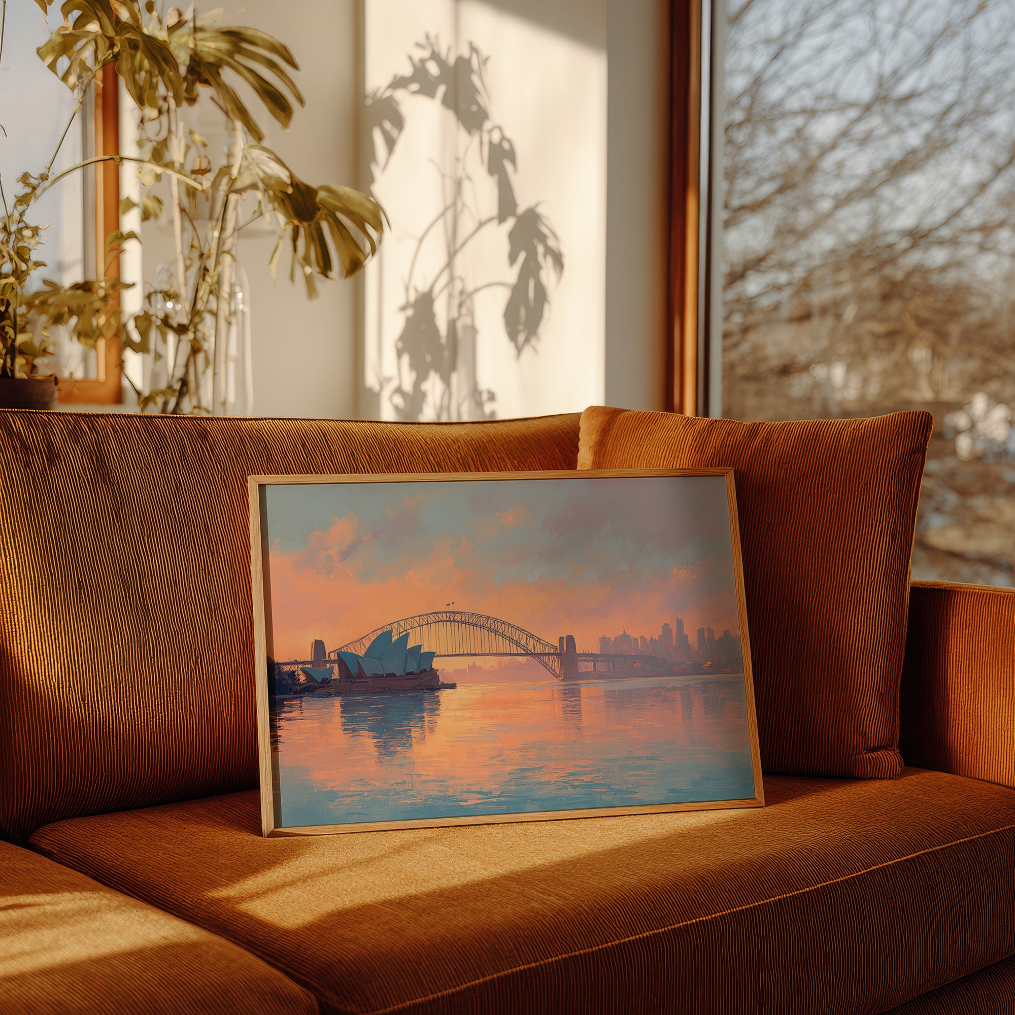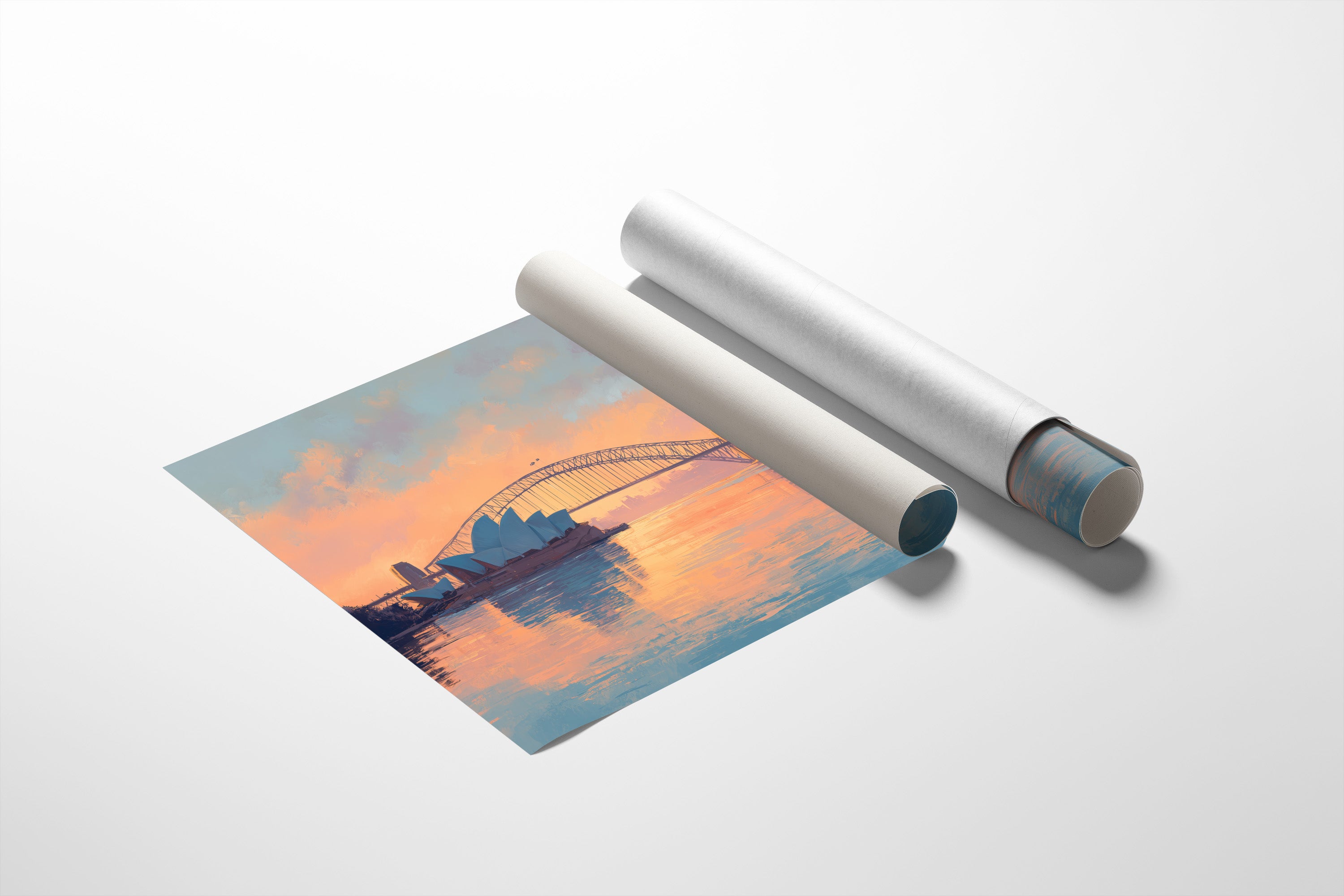 A breathtaking painting captures Sydney's iconic waterfront at the magic hour, where dawn or dusk bathes the scene in a dreamy palette of coral, peach, and lavender hues. The Opera House's distinctive sail-like structures stand proudly on the left, their geometric white forms contrasting with the elegant arch of the Harbor Bridge spanning across the water. The city skyline rises in the background, its silhouette softened by the atmospheric light. The tranquil harbor waters mirror the pastel sky, creating a perfect reflection that doubles the visual poetry. This contemporary artwork captures the serene majesty of one of the world's most recognizable urban landscapes in a moment of perfect stillness and sublime color harmony.