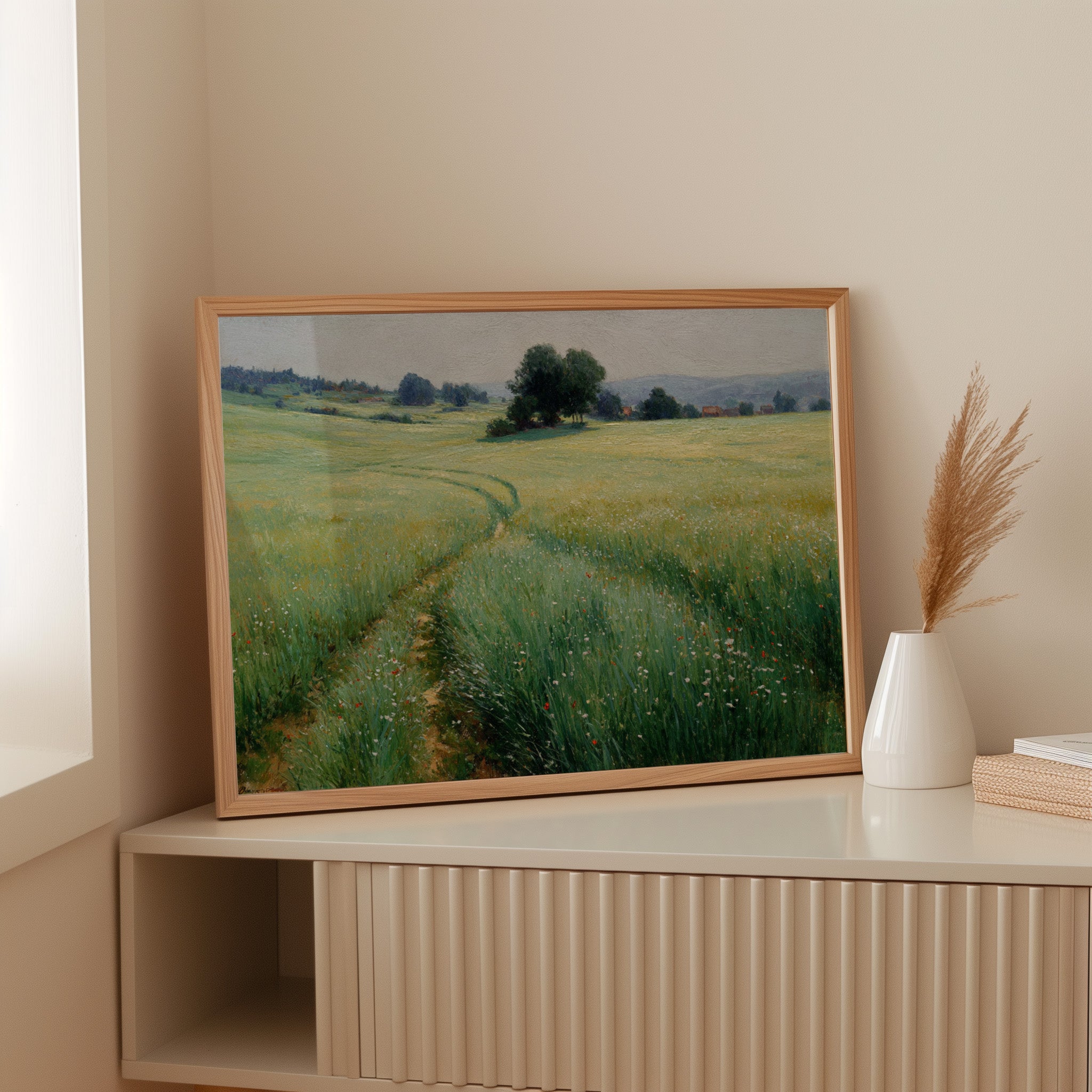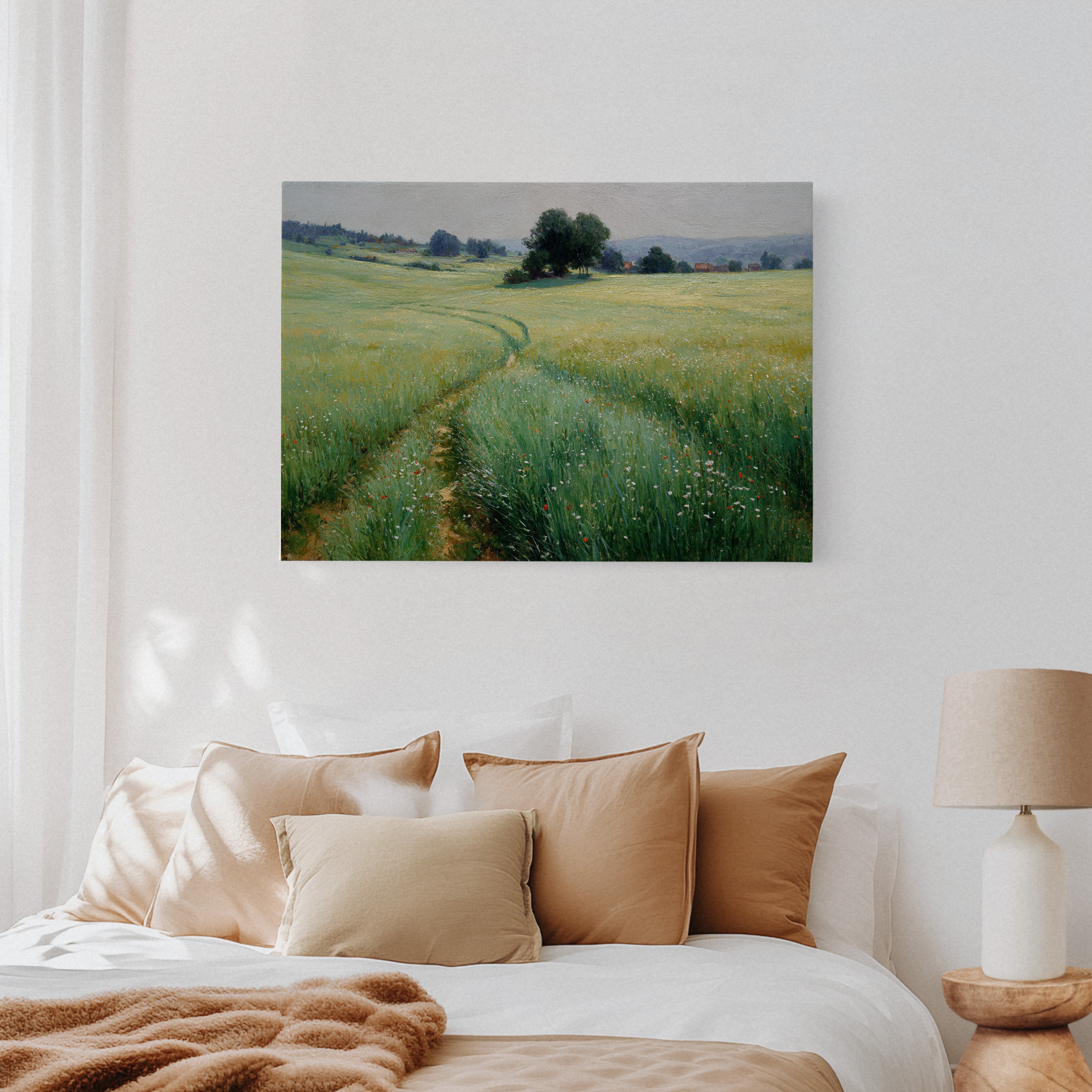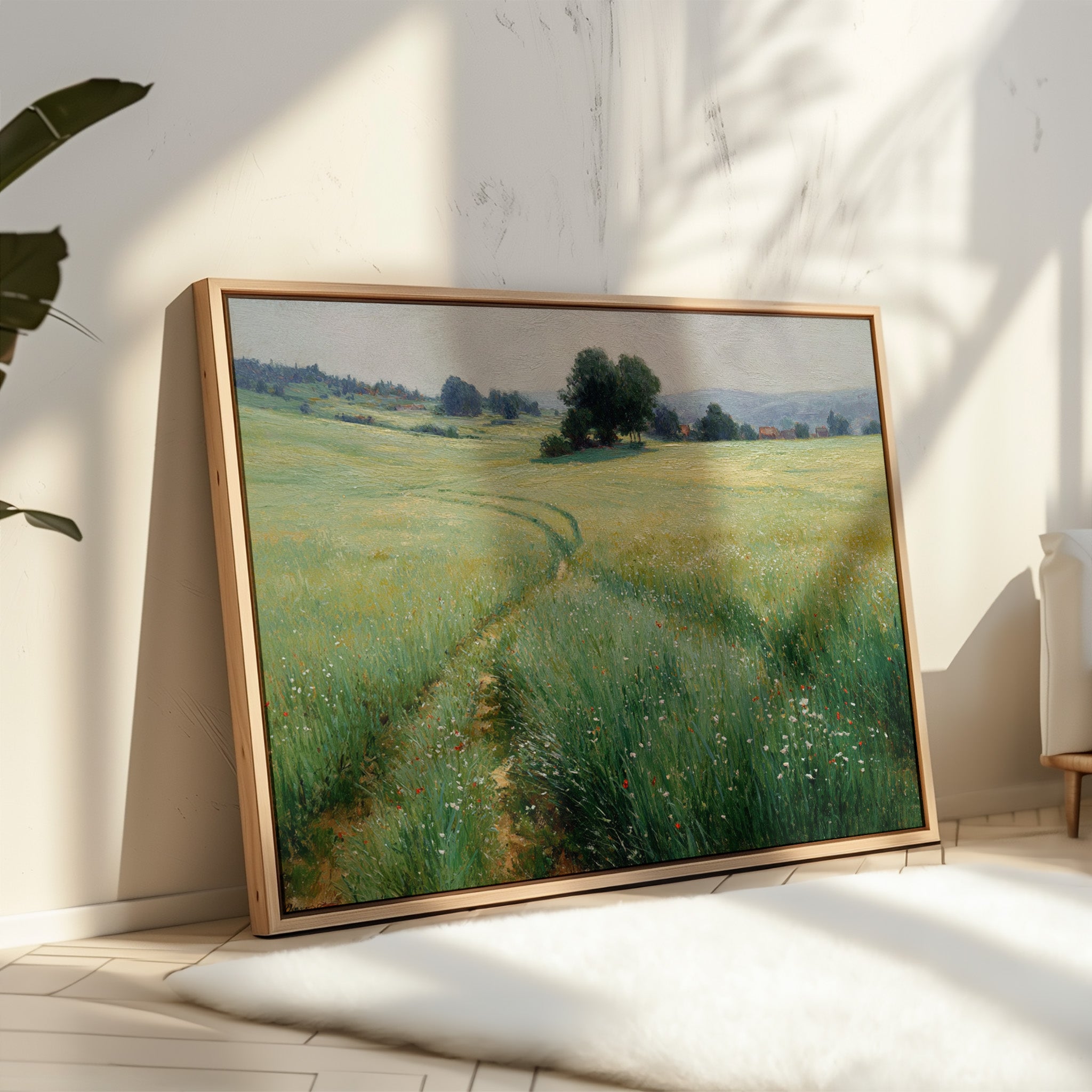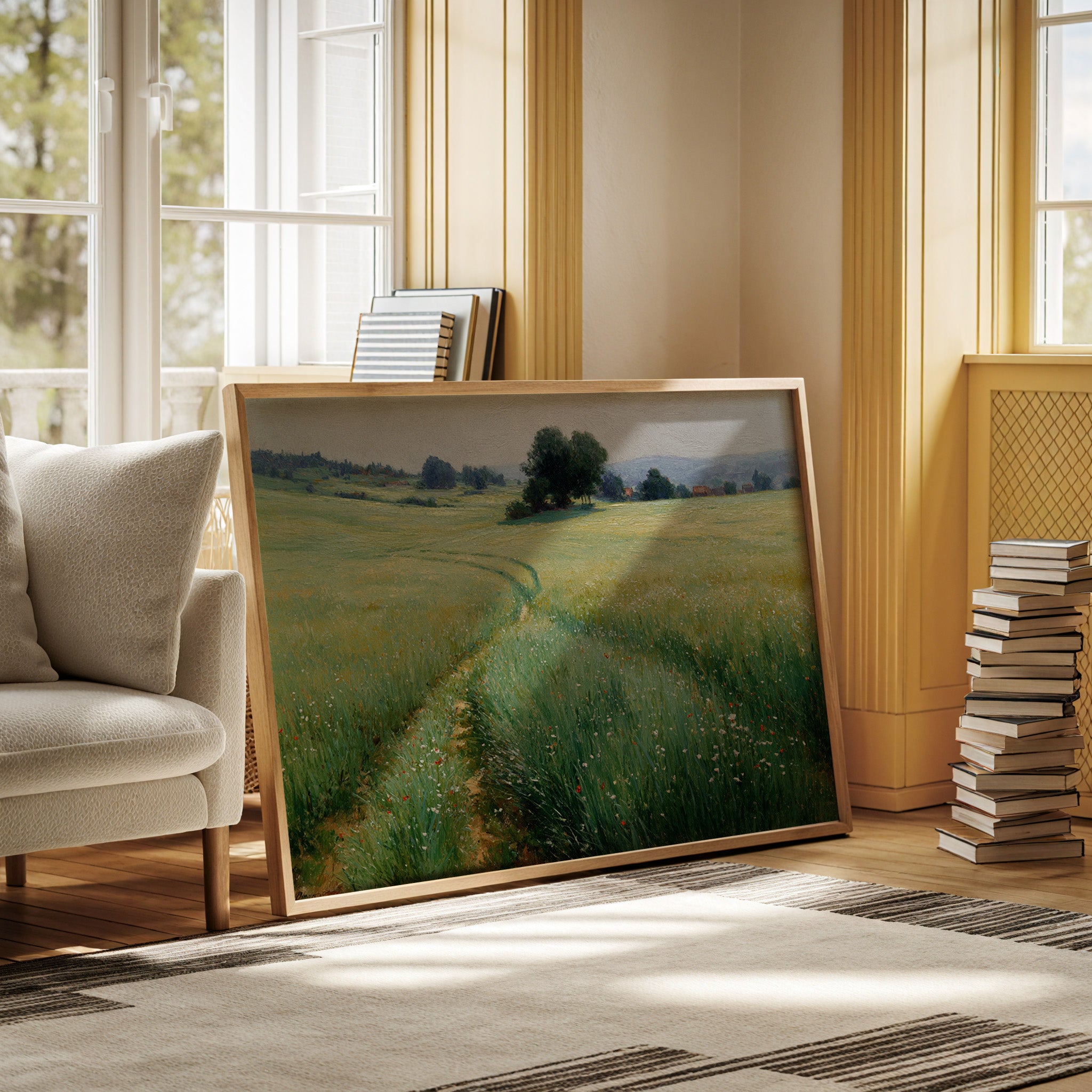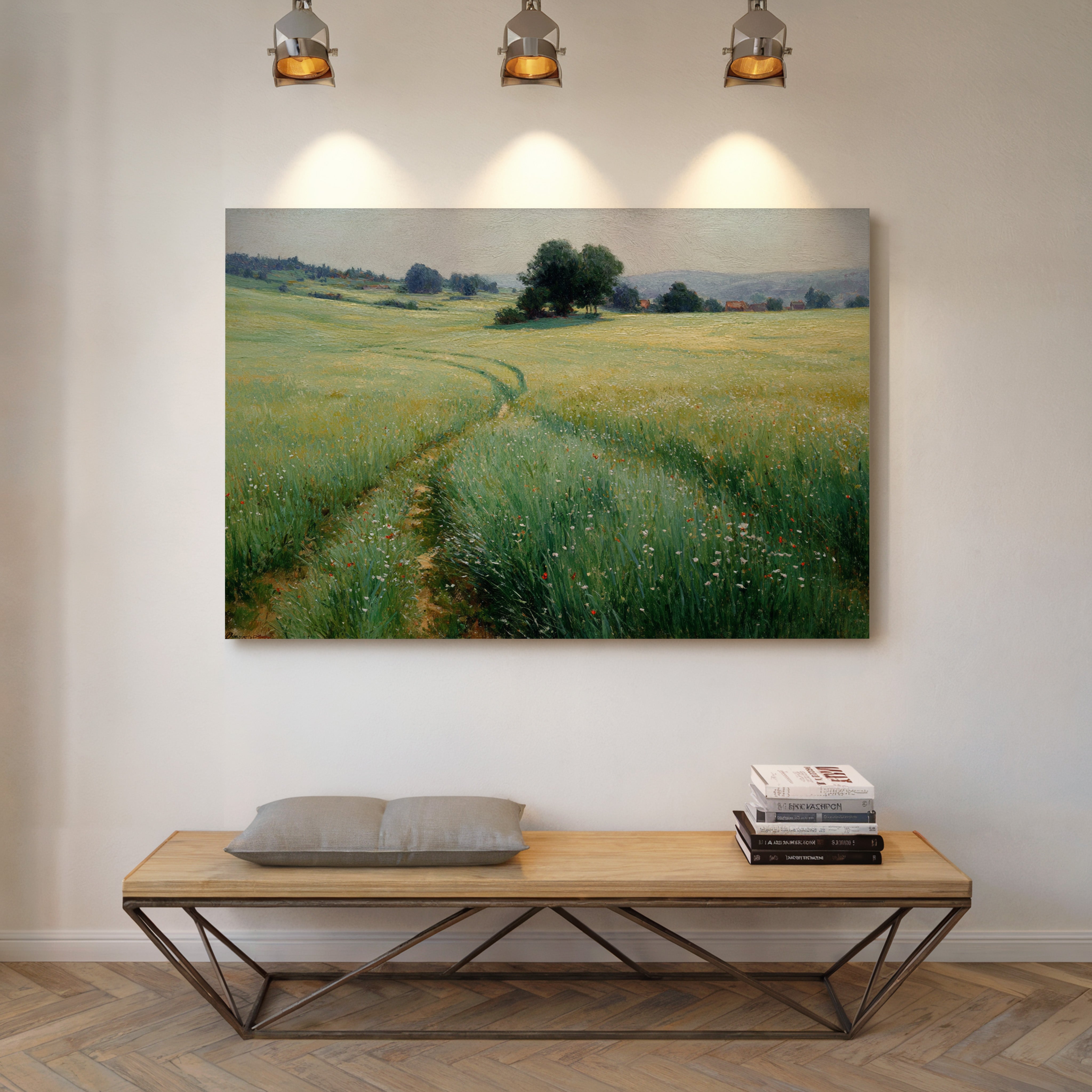 In the gentle embrace of a sunlit meadow, a winding path beckons wanderers to explore its verdant heart. This piece captures the essence of pastoral beauty, celebrating the simplicity of nature's artistry. Lush greens mingle with delicate wildflowers, while the distant hills cradle a serene village, inviting the viewer to imagine quiet strolls and moments of reflection amidst nature's canvas. Ideal for a cozy living room or a tranquil study, this artwork inspires a connection to the outdoors.
