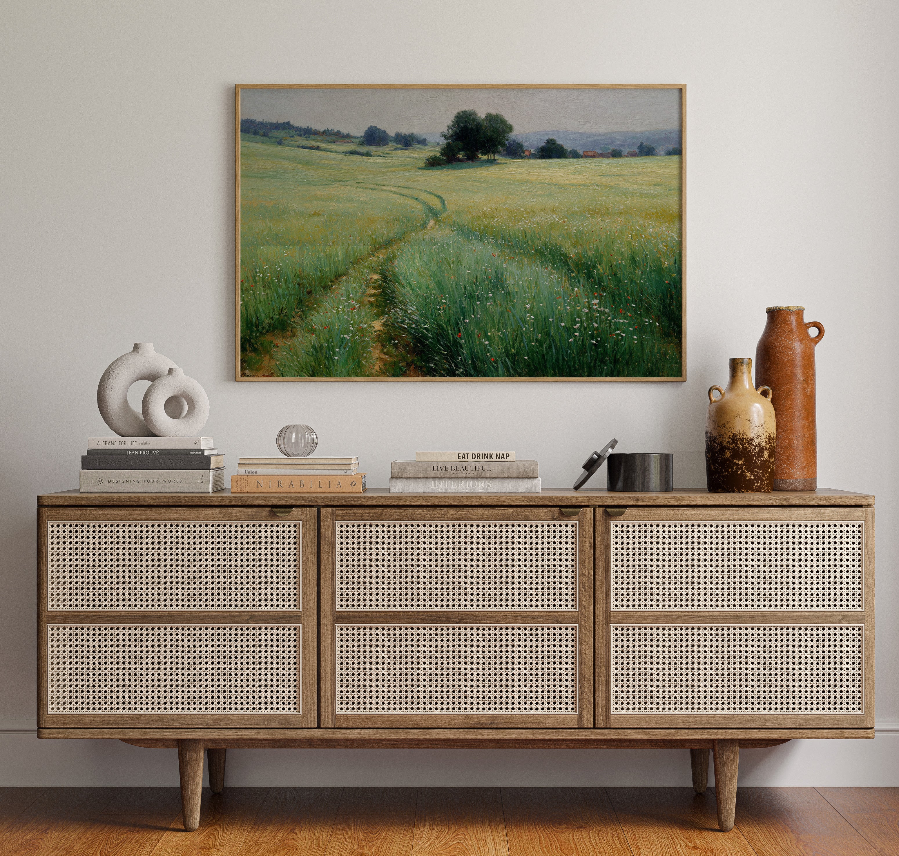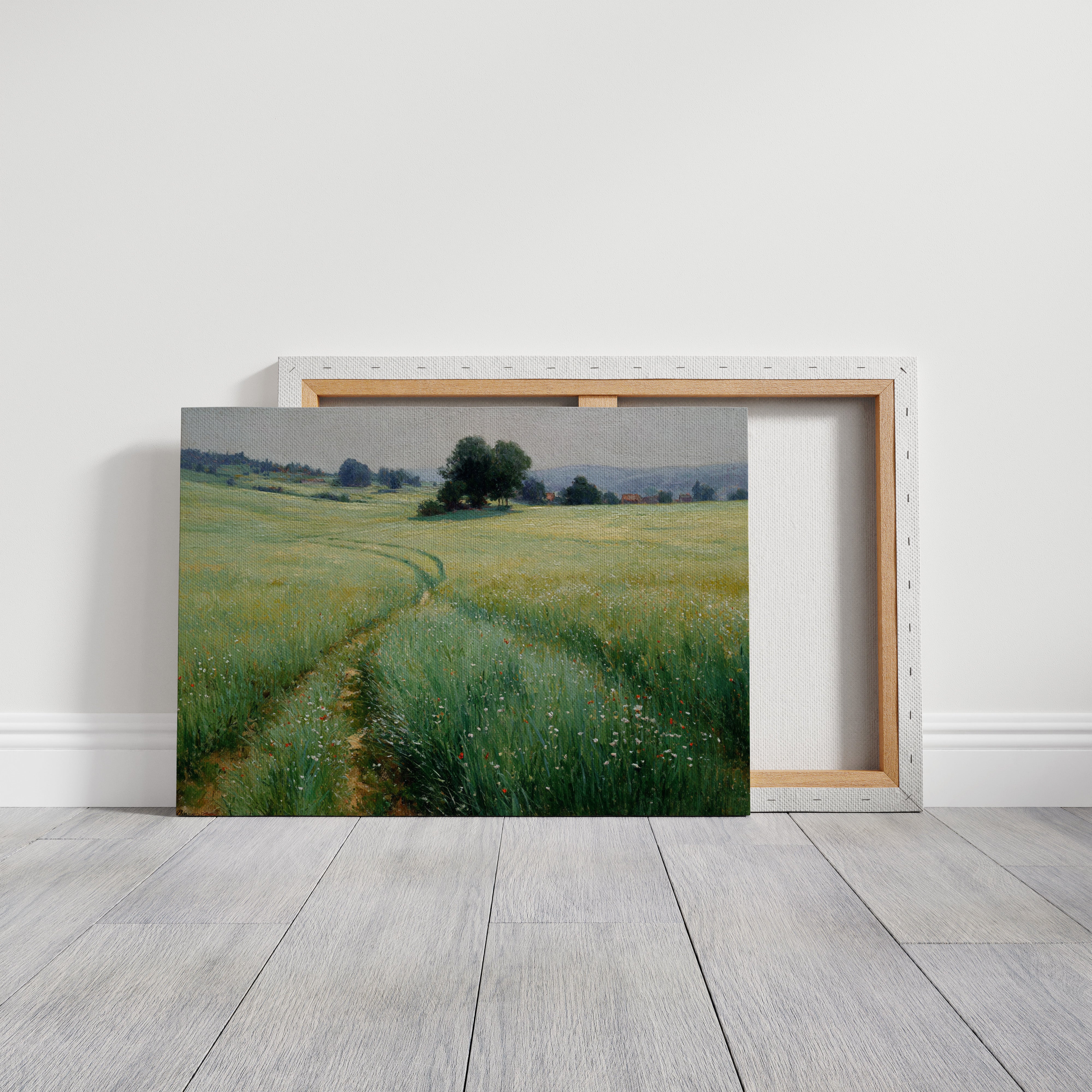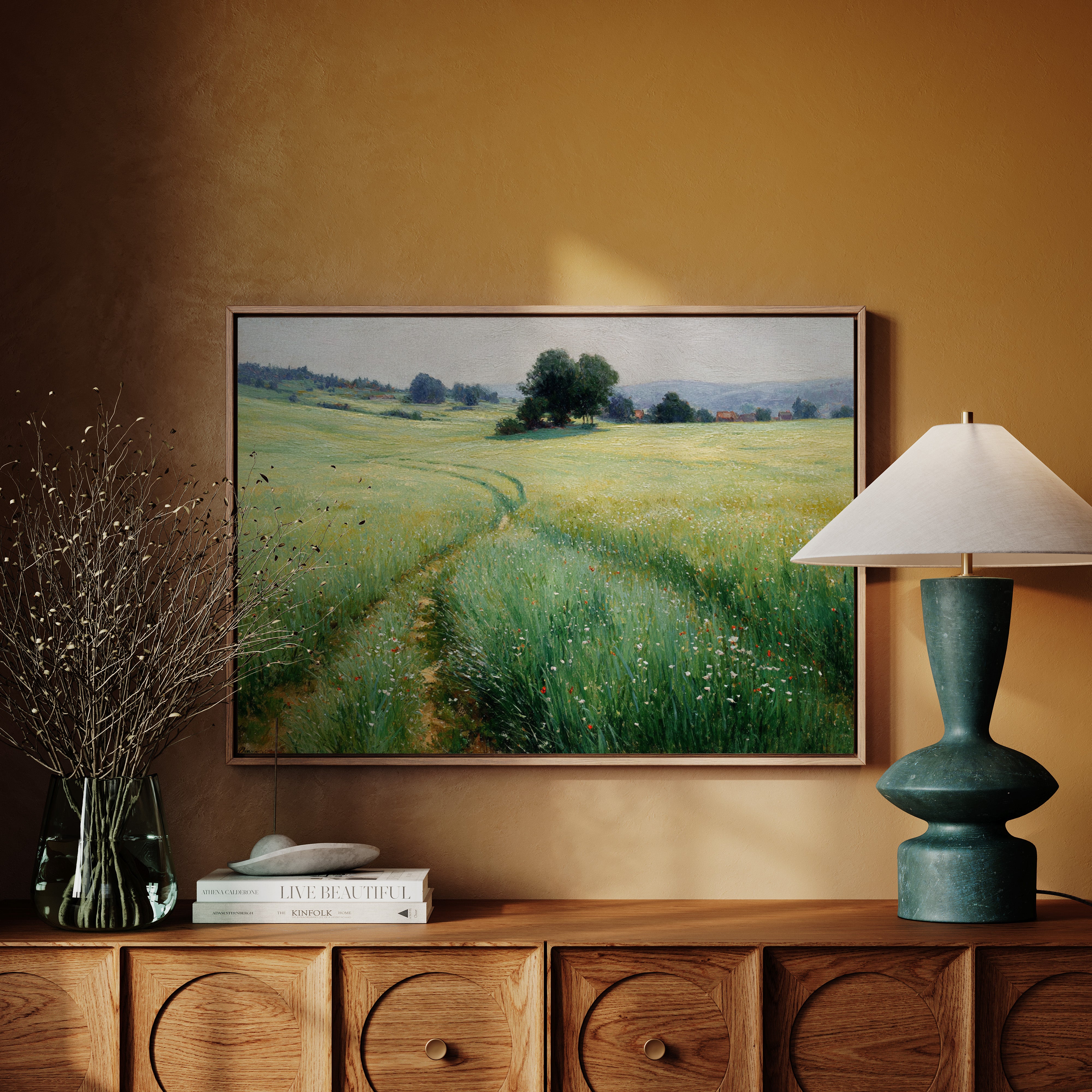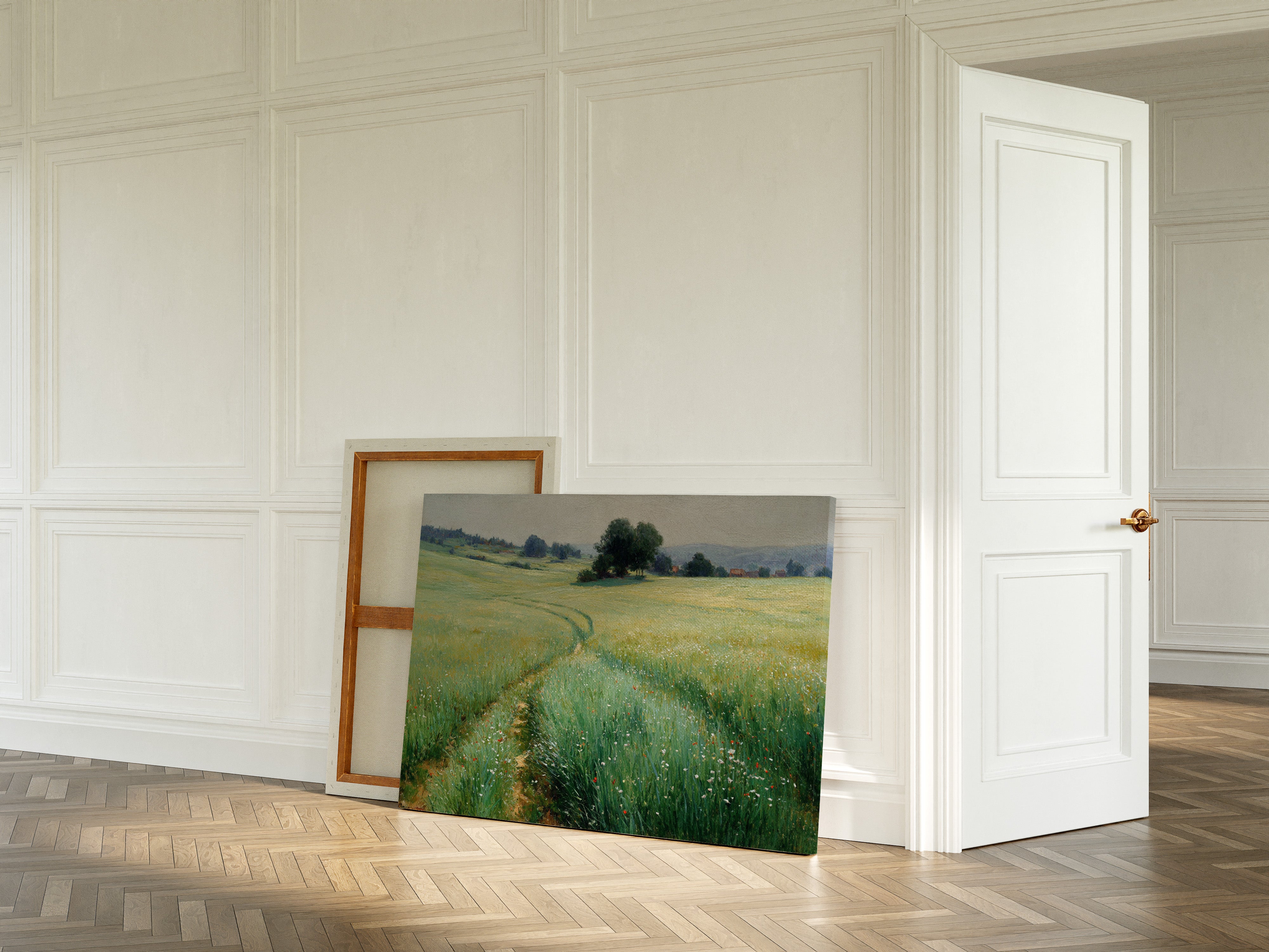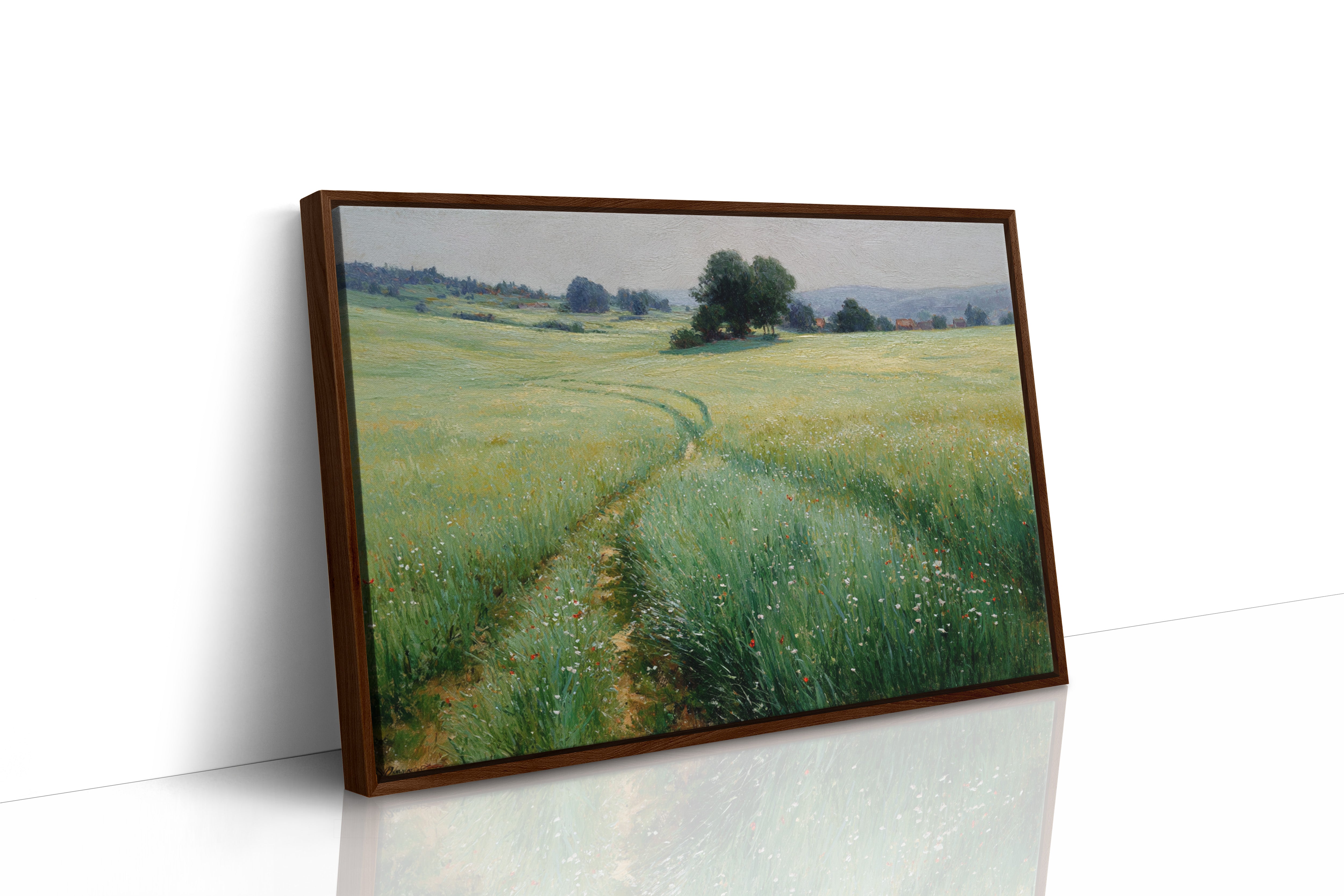 In the gentle embrace of a sunlit meadow, a winding path beckons wanderers to explore its verdant heart. This piece captures the essence of pastoral beauty, celebrating the simplicity of nature's artistry. Lush greens mingle with delicate wildflowers, while the distant hills cradle a serene village, inviting the viewer to imagine quiet strolls and moments of reflection amidst nature's canvas. Ideal for a cozy living room or a tranquil study, this artwork inspires a connection to the outdoors.