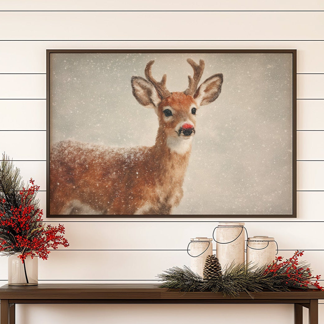 Soft snowflakes dance around a young deer's curious gaze, its bright red nose glowing with festive charm against the winter grey. The deer's russet coat creates a warm contrast with the ethereal snowfall, while its gentle eyes seem to hold stories of woodland adventures. This whimsical portrait captures the enchanting fusion of natural wildlife and holiday magic, creating an atmosphere of wonder and nostalgia. Perfect for adding a touch of seasonal charm to living rooms, children's spaces, or any area where you want to inspire joy and imagination during the winter months.