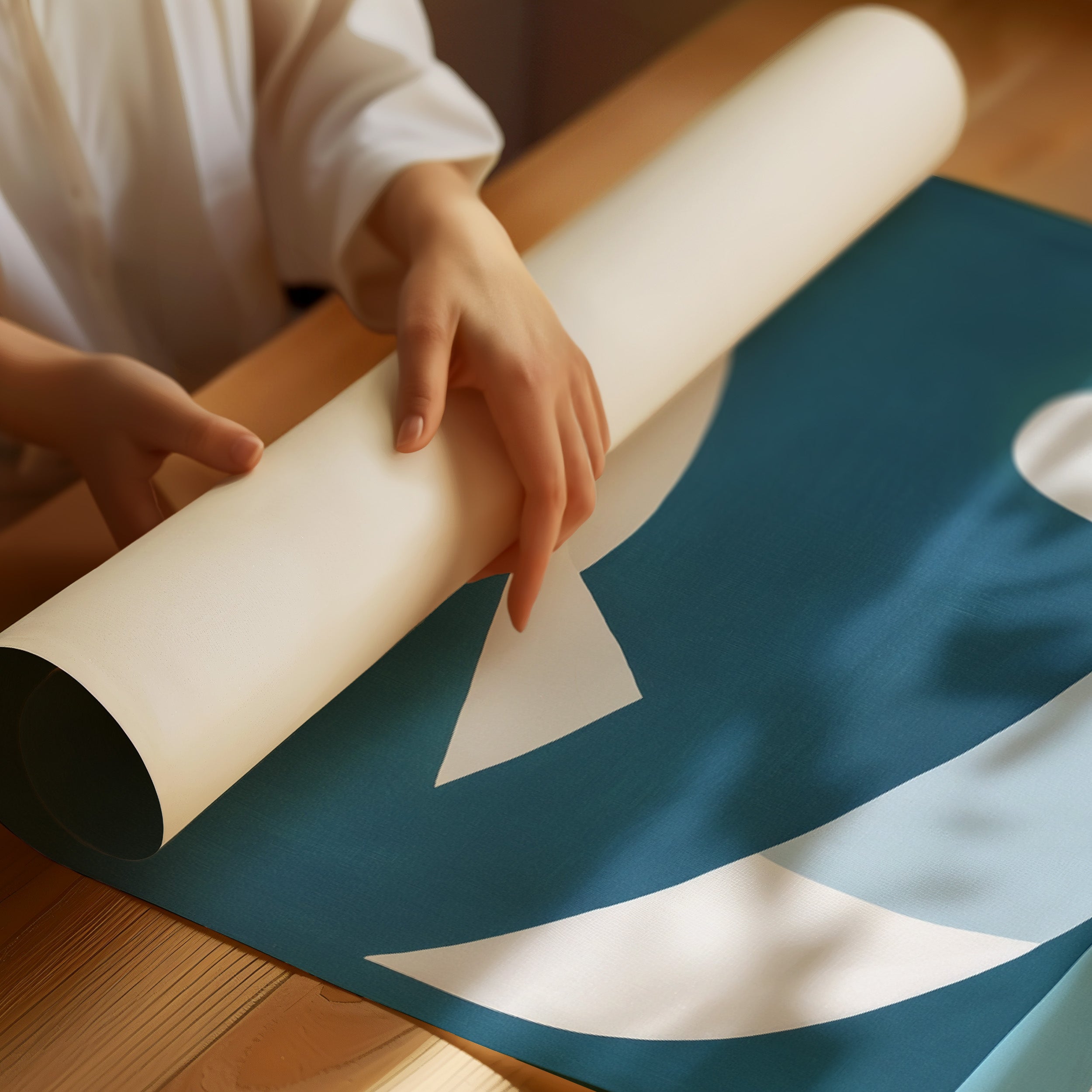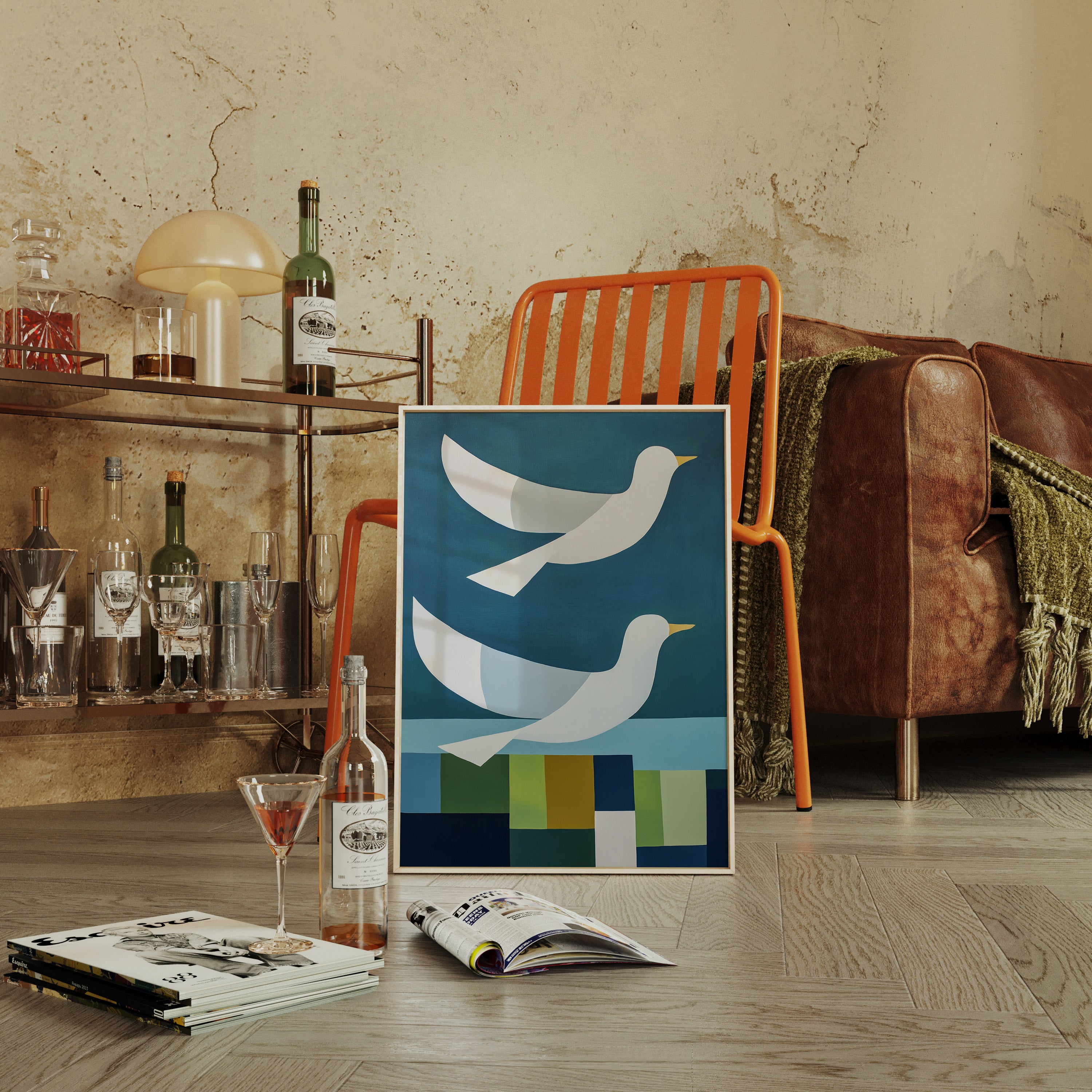 White doves float with graceful simplicity against a deep teal sky, their forms rendered in clean, modernist lines. The composition balances geometric abstraction with natural grace, as the birds hover over a patchwork landscape of blues, greens, and golden squares. The minimalist design speaks to tranquility and harmony, with the doves' gentle curves contrasting beautifully against the angular fields below. This contemporary piece would bring a sense of serenity and sophisticated design to a modern office space or minimalist living room.