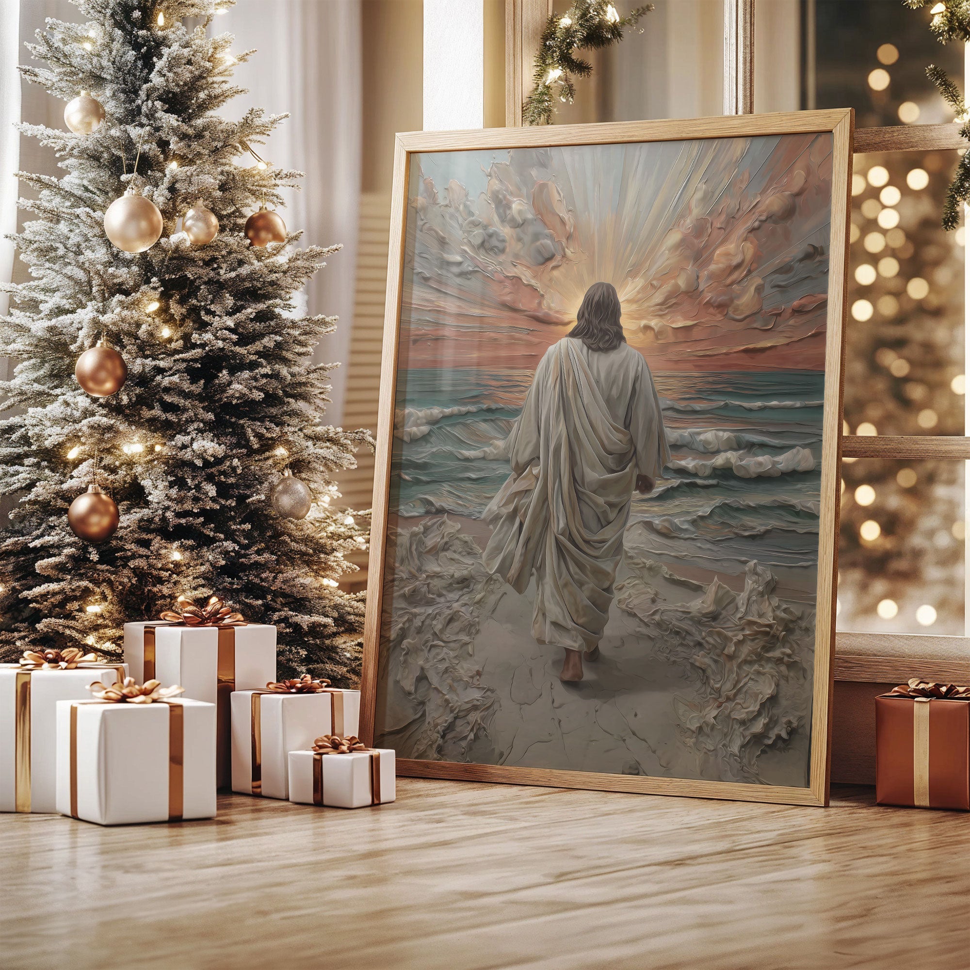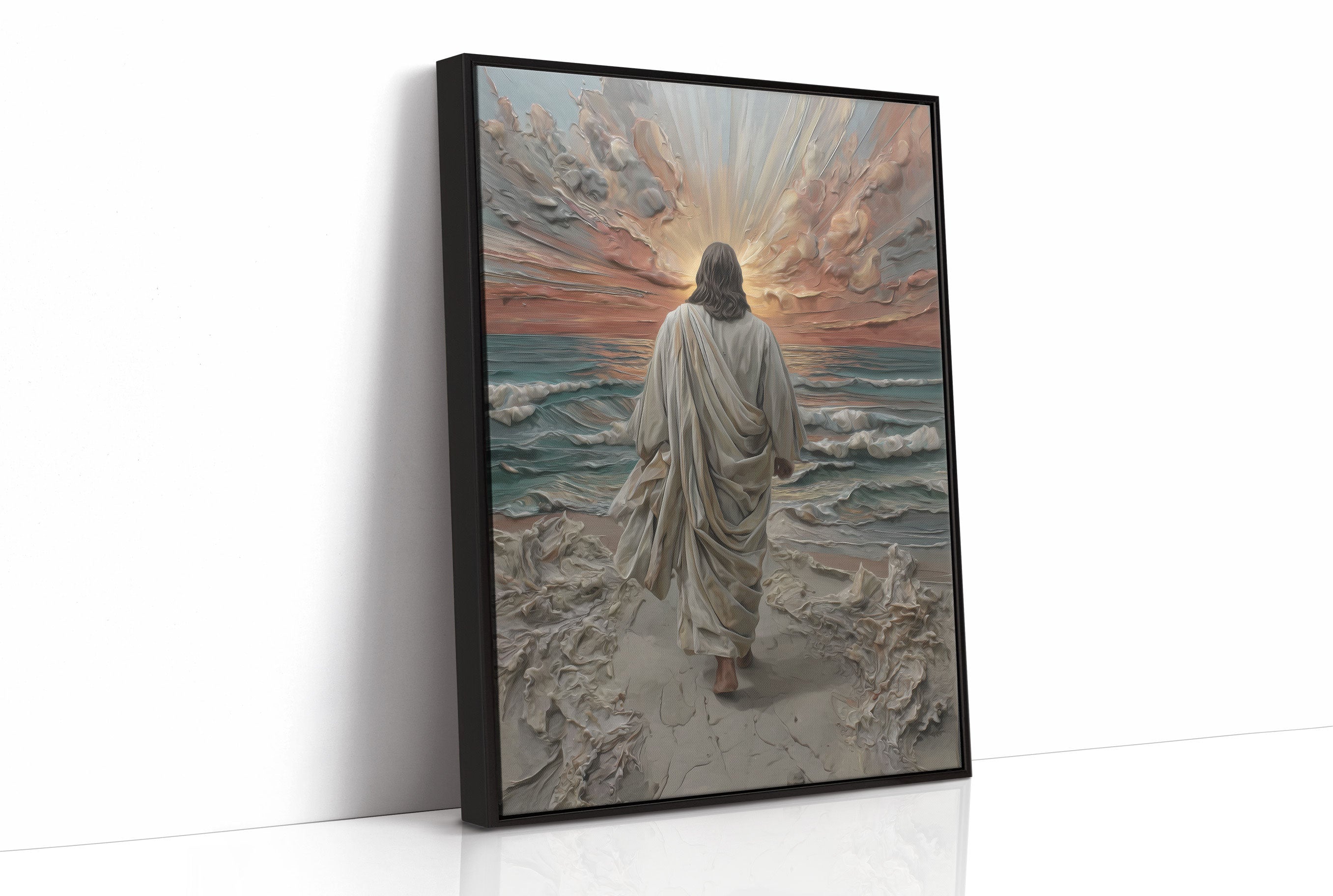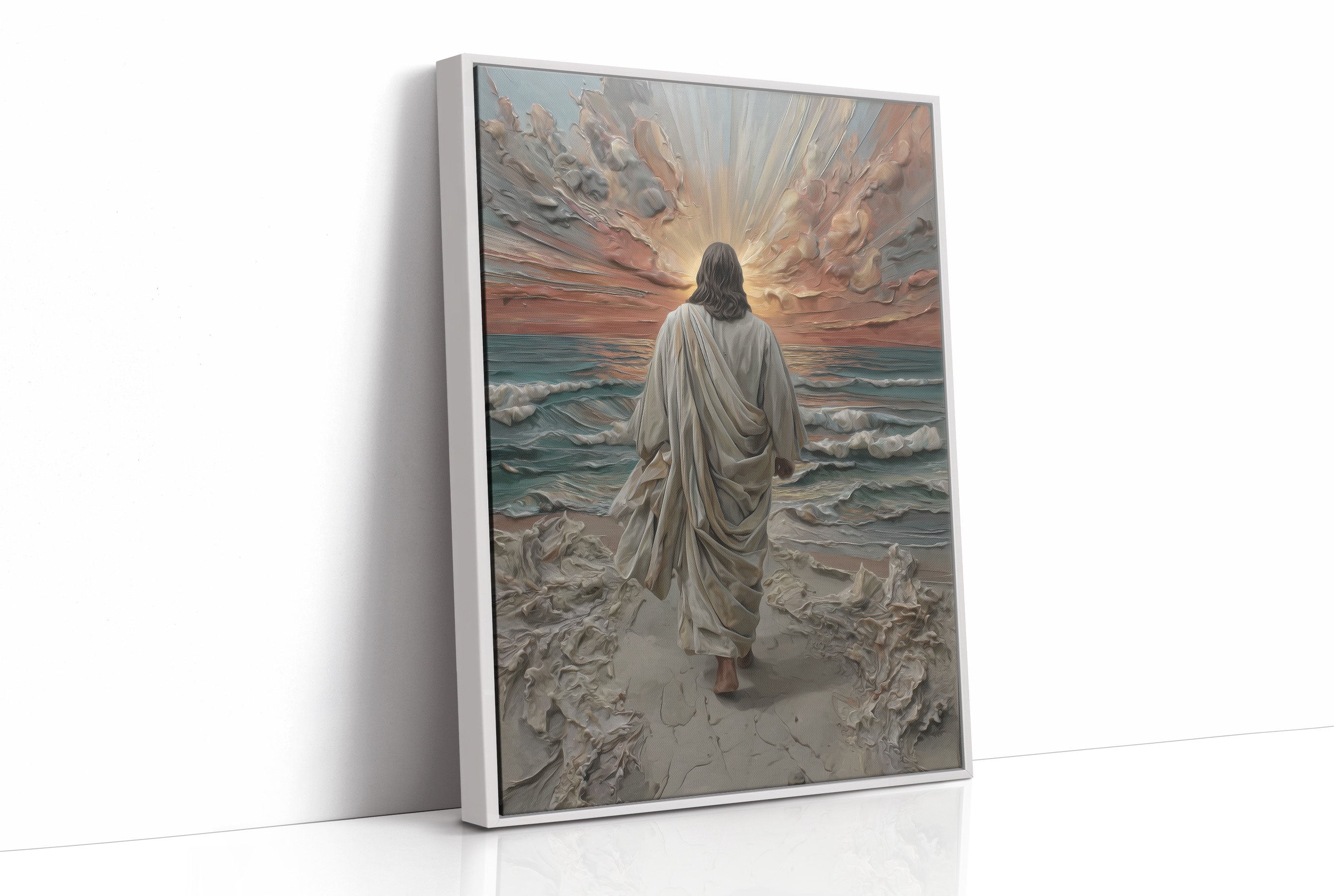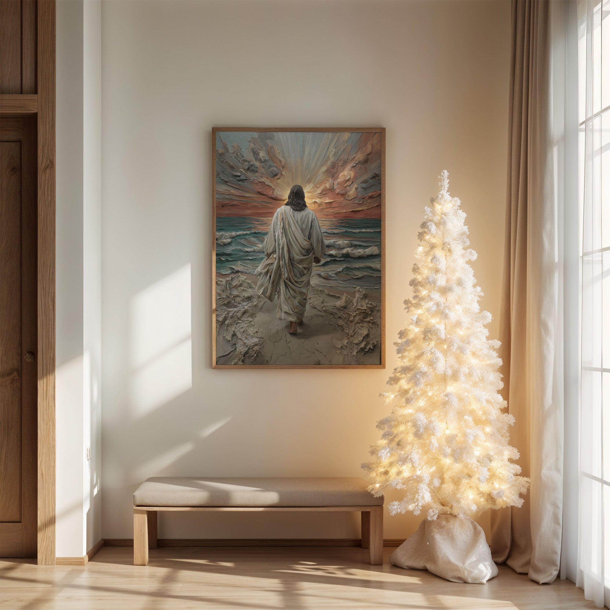 A figure stands in solitary contemplation before a turbulent sea, robed in flowing fabric that seems to dance with the wind. The dramatic sunset paints the sky in sweeping brushstrokes of coral and azure, creating an ethereal atmosphere of divine connection. The textured waves crash against the shore while billowing clouds part to reveal rays of golden light, suggesting a moment of spiritual awakening. This piece would bring a sense of profound serenity to a meditation room, prayer space, or any quiet corner meant for reflection and inner peace.