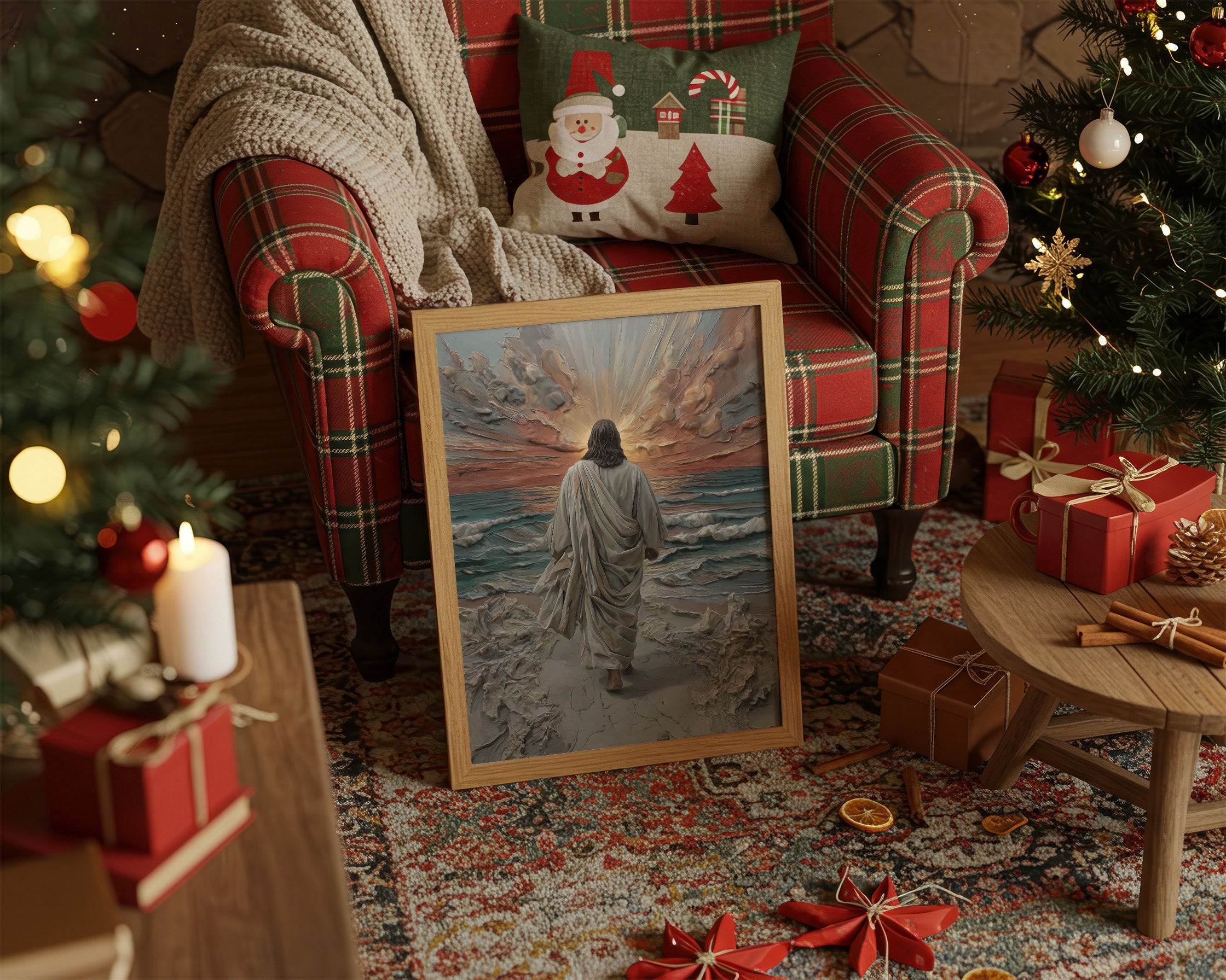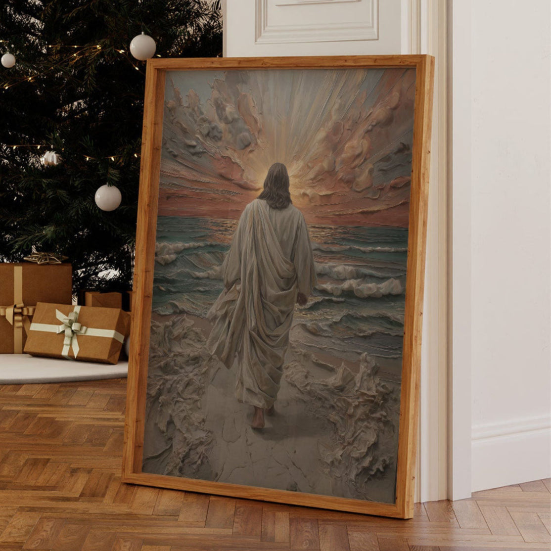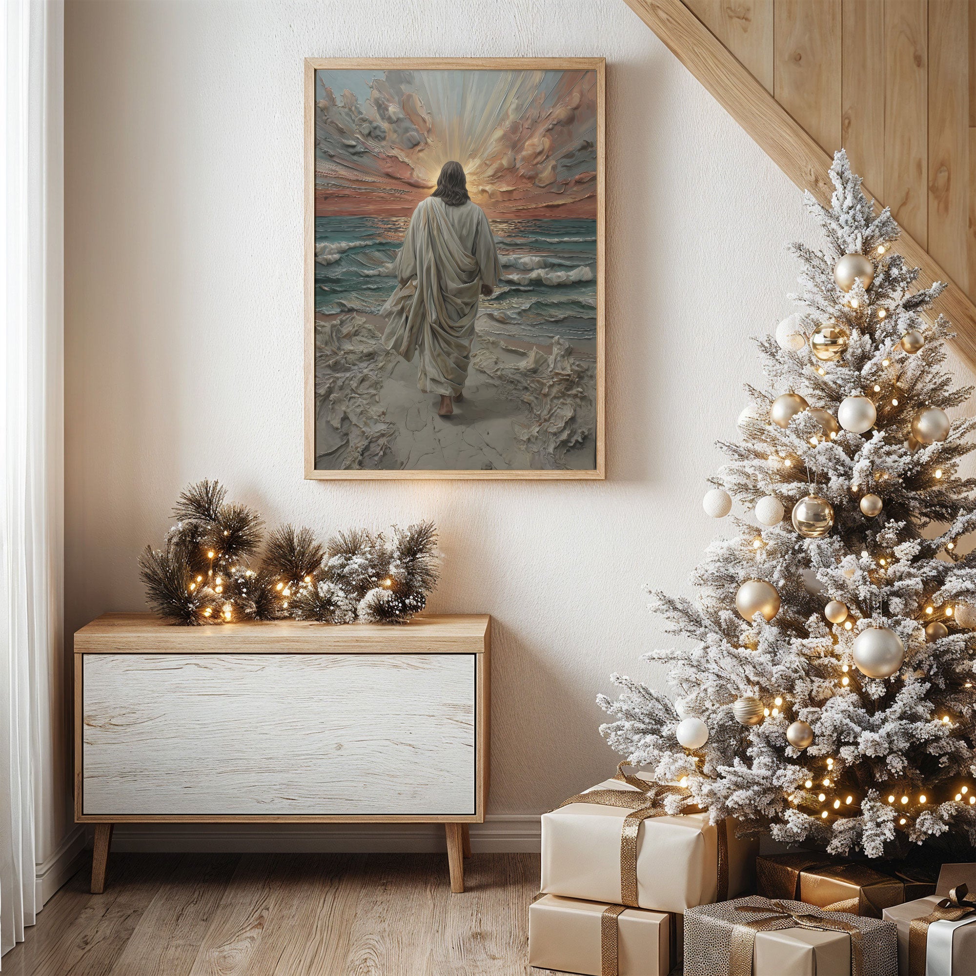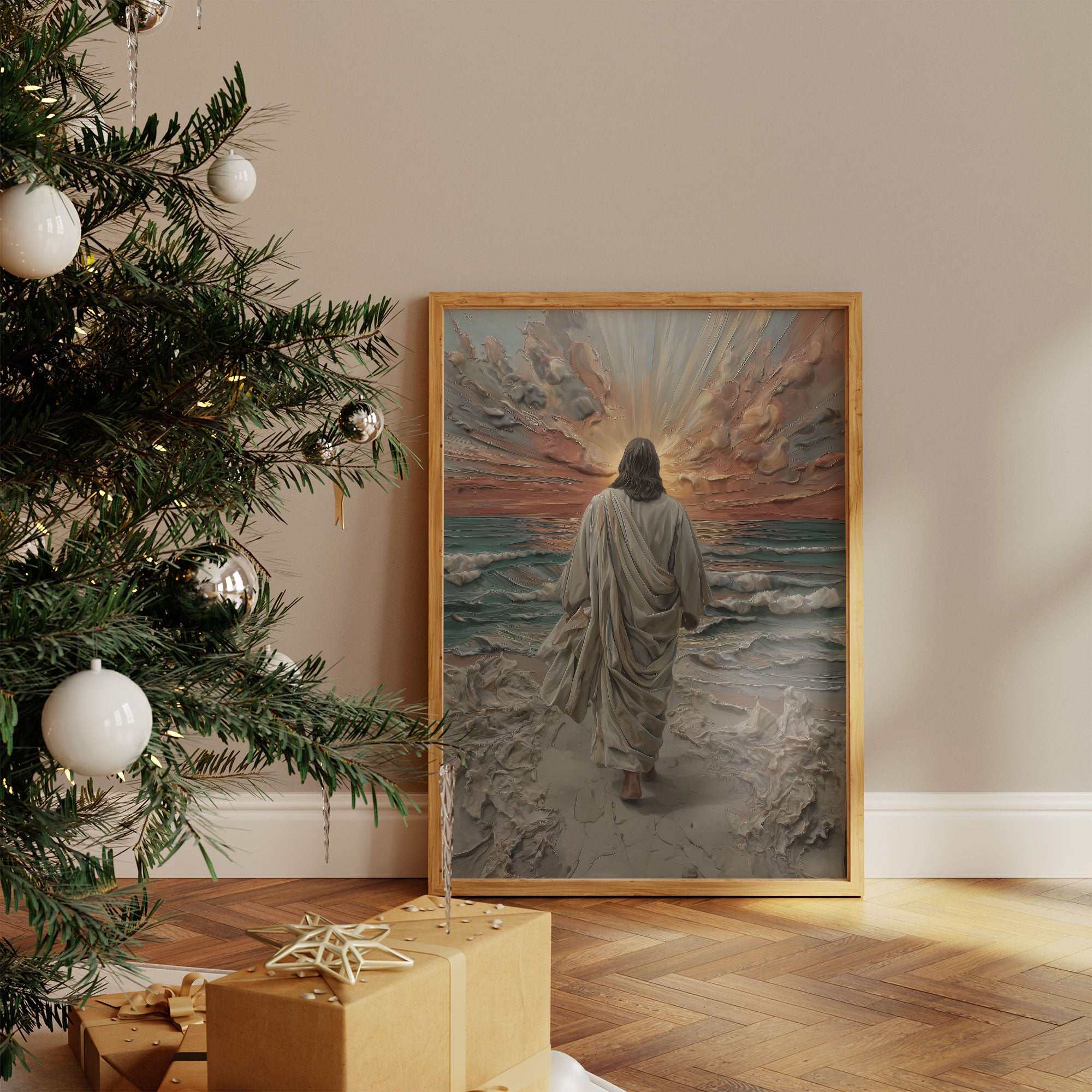 A figure stands in solitary contemplation before a turbulent sea, robed in flowing fabric that seems to dance with the wind. The dramatic sunset paints the sky in sweeping brushstrokes of coral and azure, creating an ethereal atmosphere of divine connection. The textured waves crash against the shore while billowing clouds part to reveal rays of golden light, suggesting a moment of spiritual awakening. This piece would bring a sense of profound serenity to a meditation room, prayer space, or any quiet corner meant for reflection and inner peace.