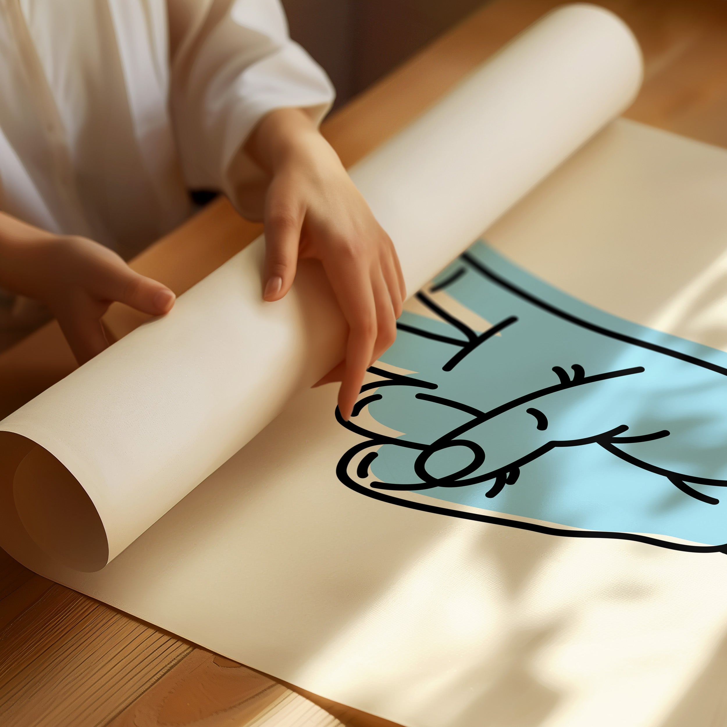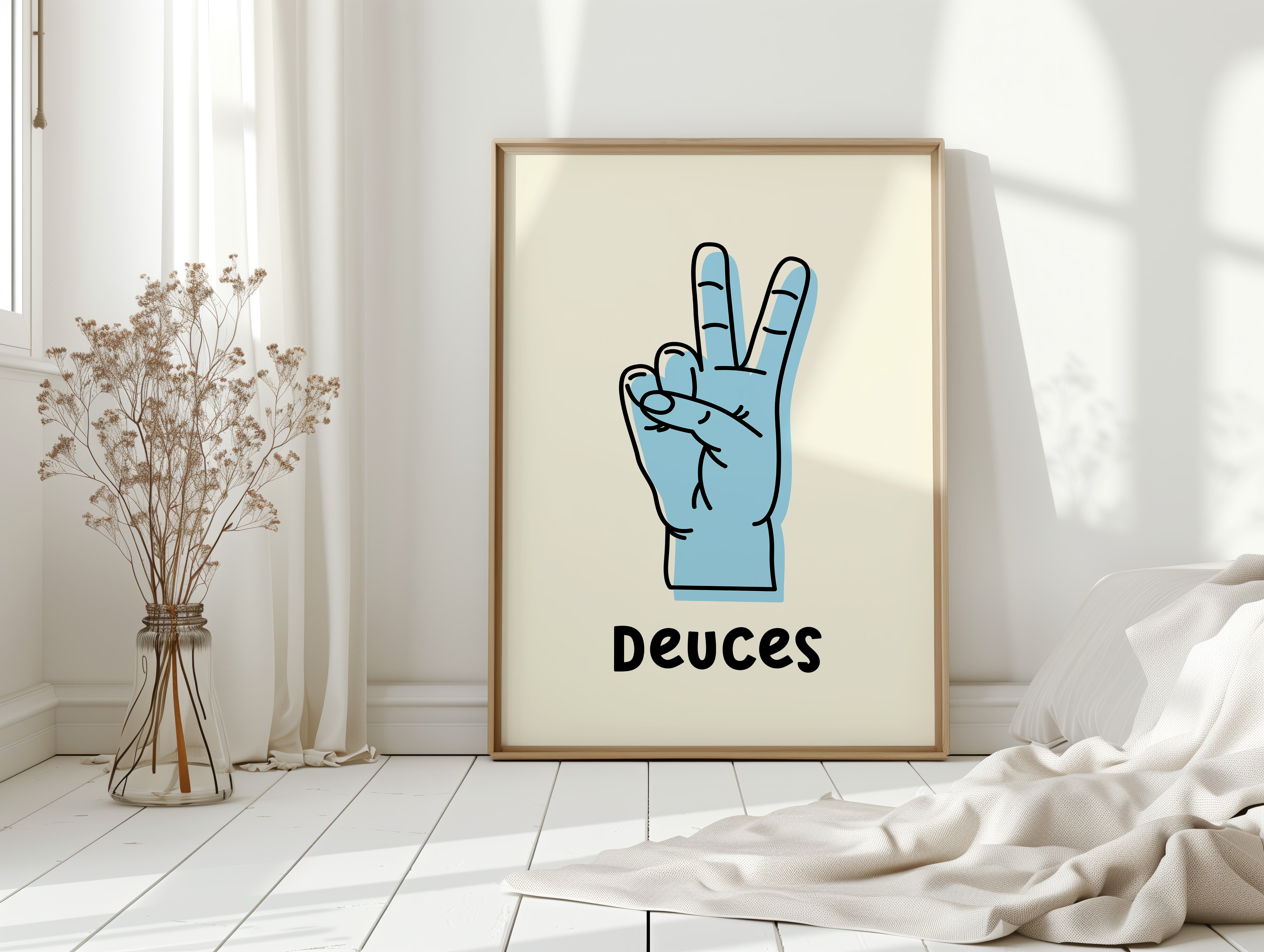 A gentle blue hand rises against cream, offering the universal symbol of victory and hope. Part of our Contemporary collection, this minimalist design speaks volumes through clean lines and purposeful simplicity. The soft azure tone creates a sense of calm optimism, while the bold black outline adds a playful yet decisive character to the composition. The hand gesture becomes both a personal statement and a shared language of positivity. Perfect for a home office, creative studio, or any space where you want to infuse a touch of optimistic energy and modern style. Its understated charm brings a smile while maintaining sophisticated appeal.