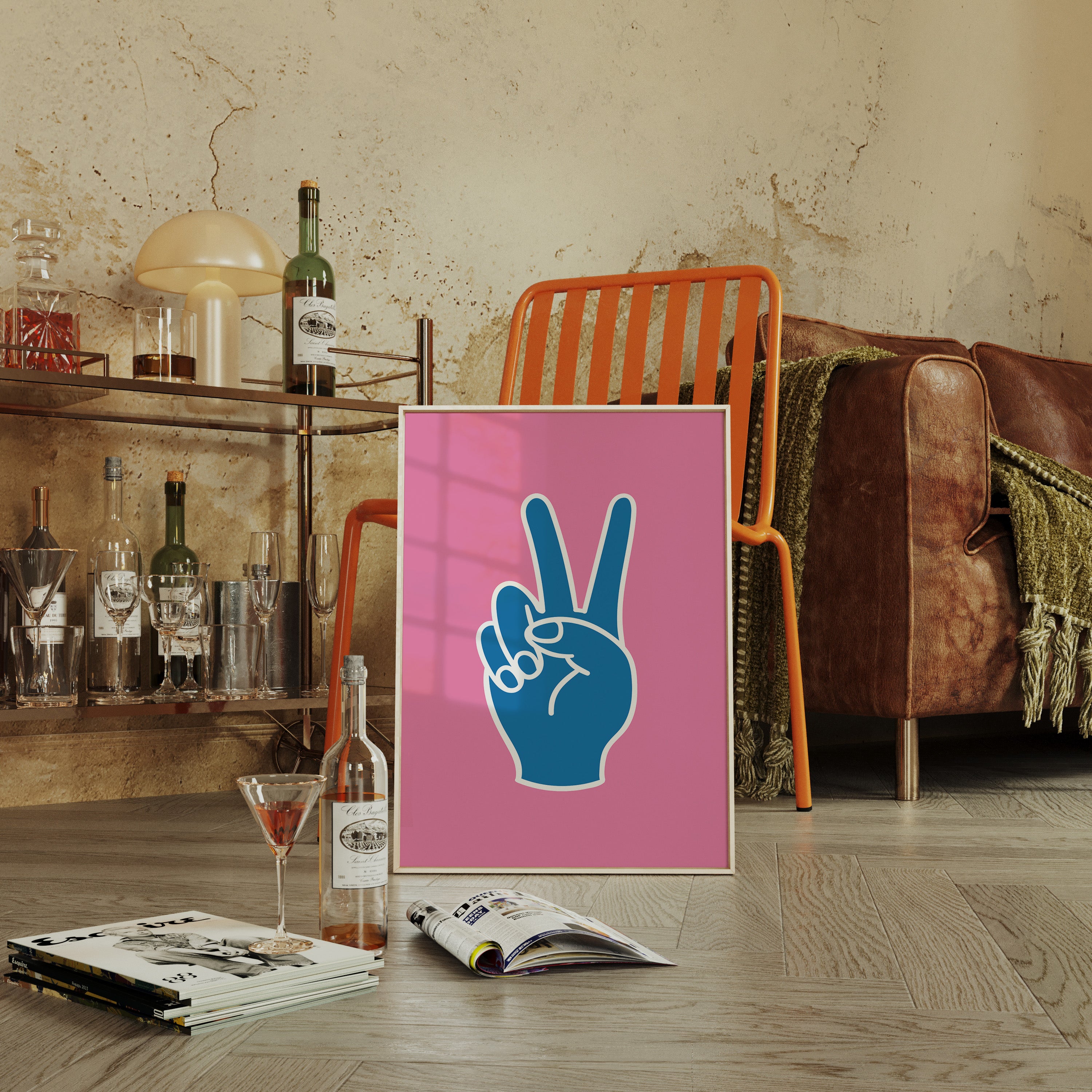 A bold blue hand reaches skyward against candy pink, radiating optimism and youthful energy. This piece from our Contemporary collection celebrates the timeless symbol of peace with modern pop art flair. The crisp white outline creates striking contrast against the vibrant background, while the simplified geometric form speaks to both retro nostalgia and forward-thinking design. Perfect for adding a splash of positivity to a teen's room or creative workspace. Let this piece be a daily reminder that hope and harmony never go out of style.