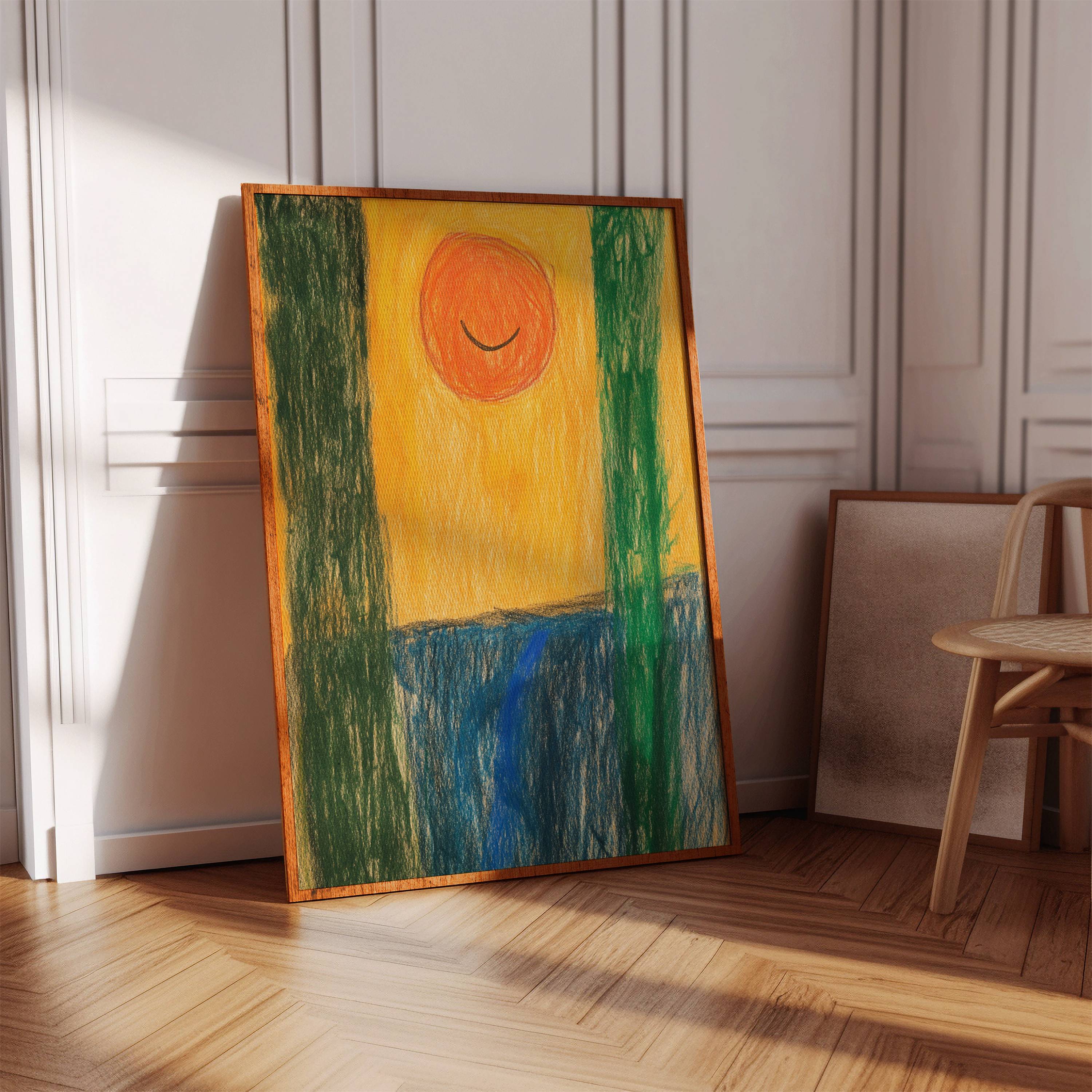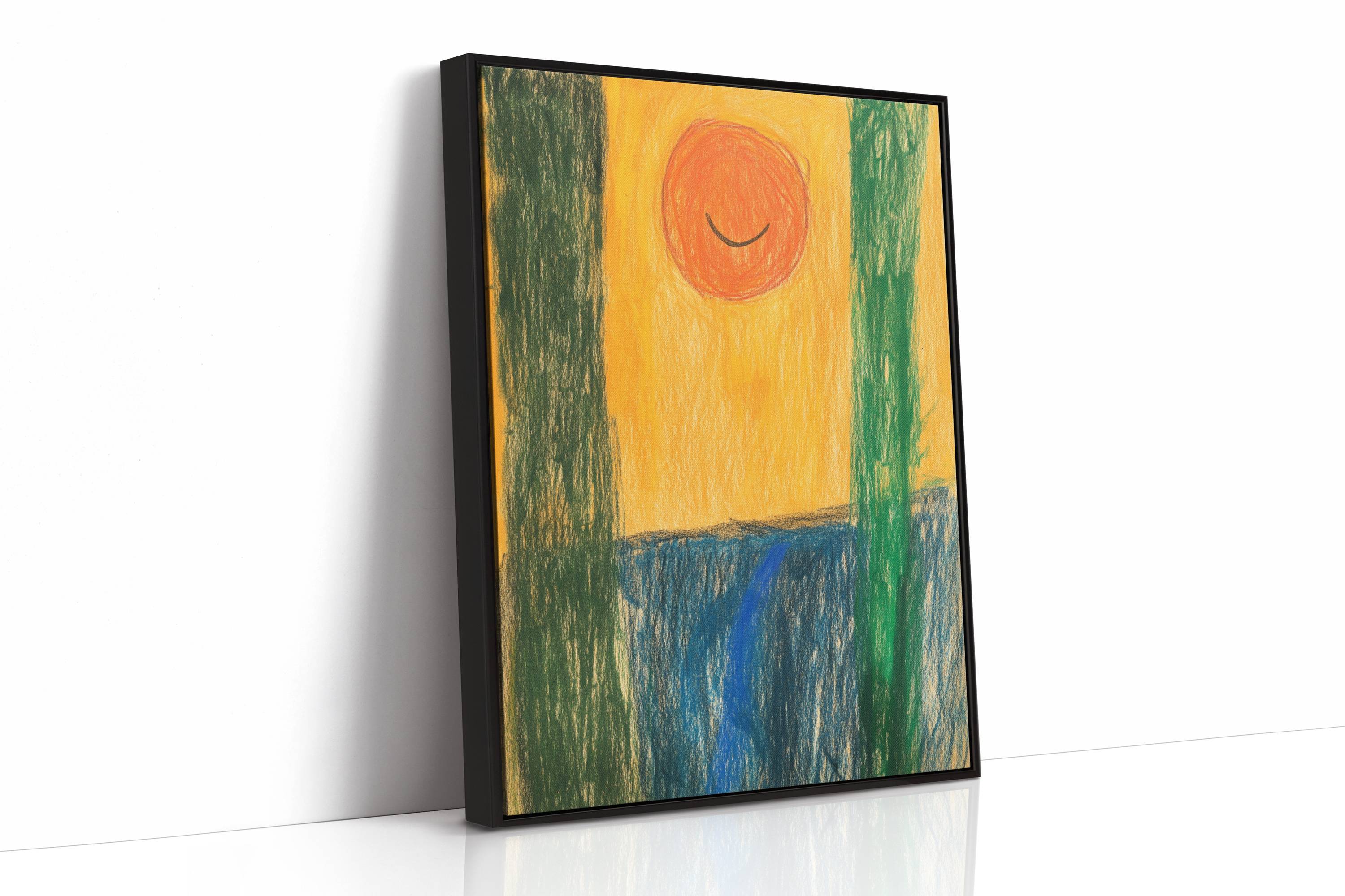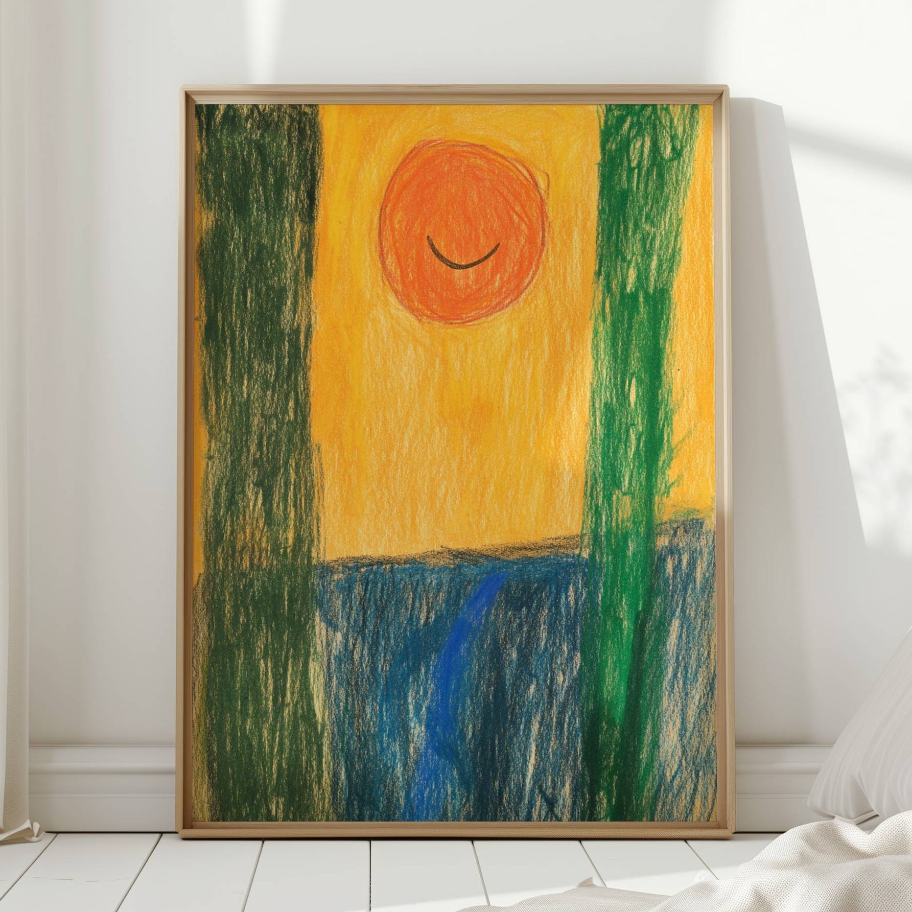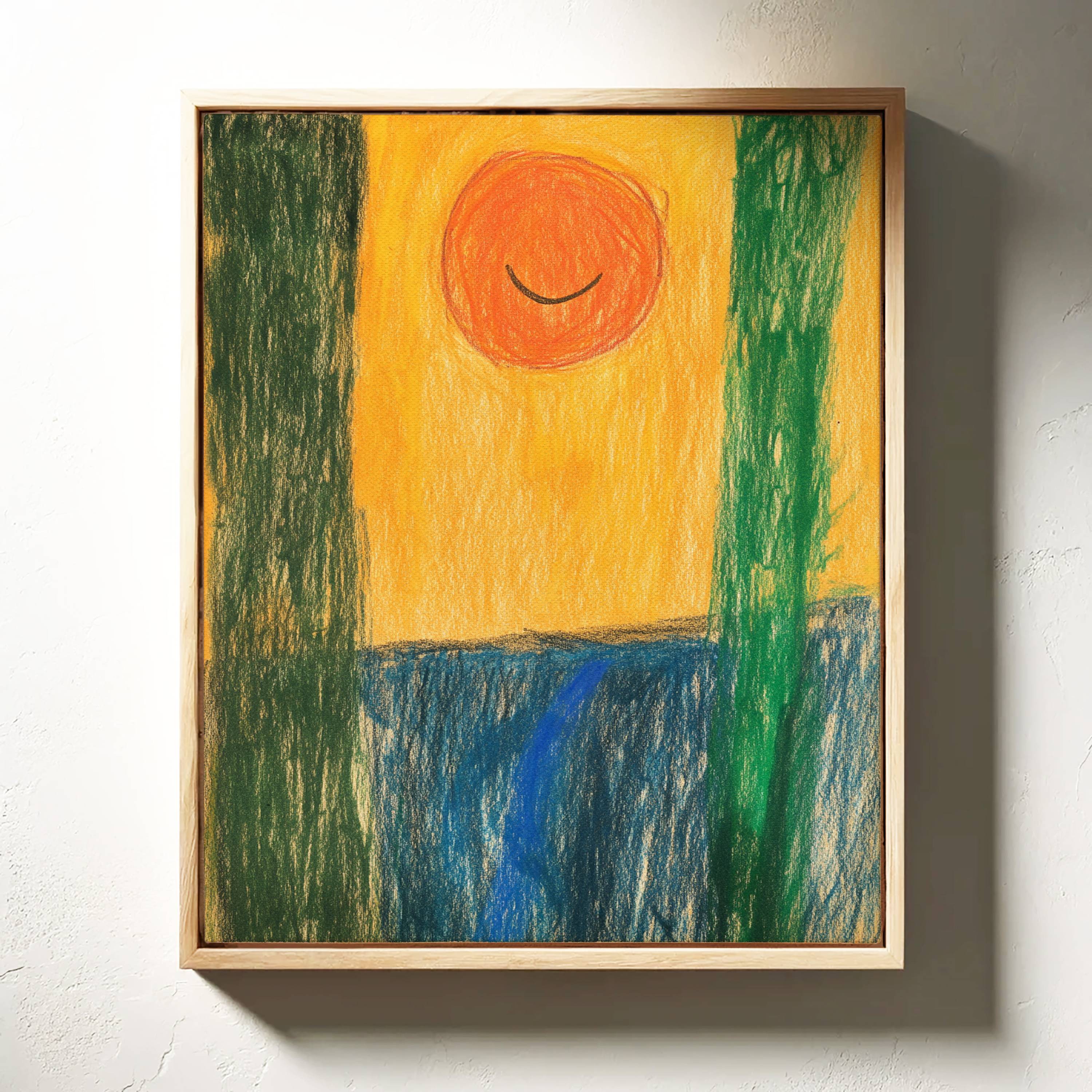 A gentle orange sun smiles down from a golden sky, radiating warmth and serenity through vibrant brushstrokes. Forest-green columns frame the scene like ancient sentinels, standing watch over a deep blue waterfall that cascades through the lower portion of the composition. The childlike simplicity of the drawing captures an innocent joy, with raw textures created by crayon or pastel strokes that add emotional depth to this peaceful landscape.