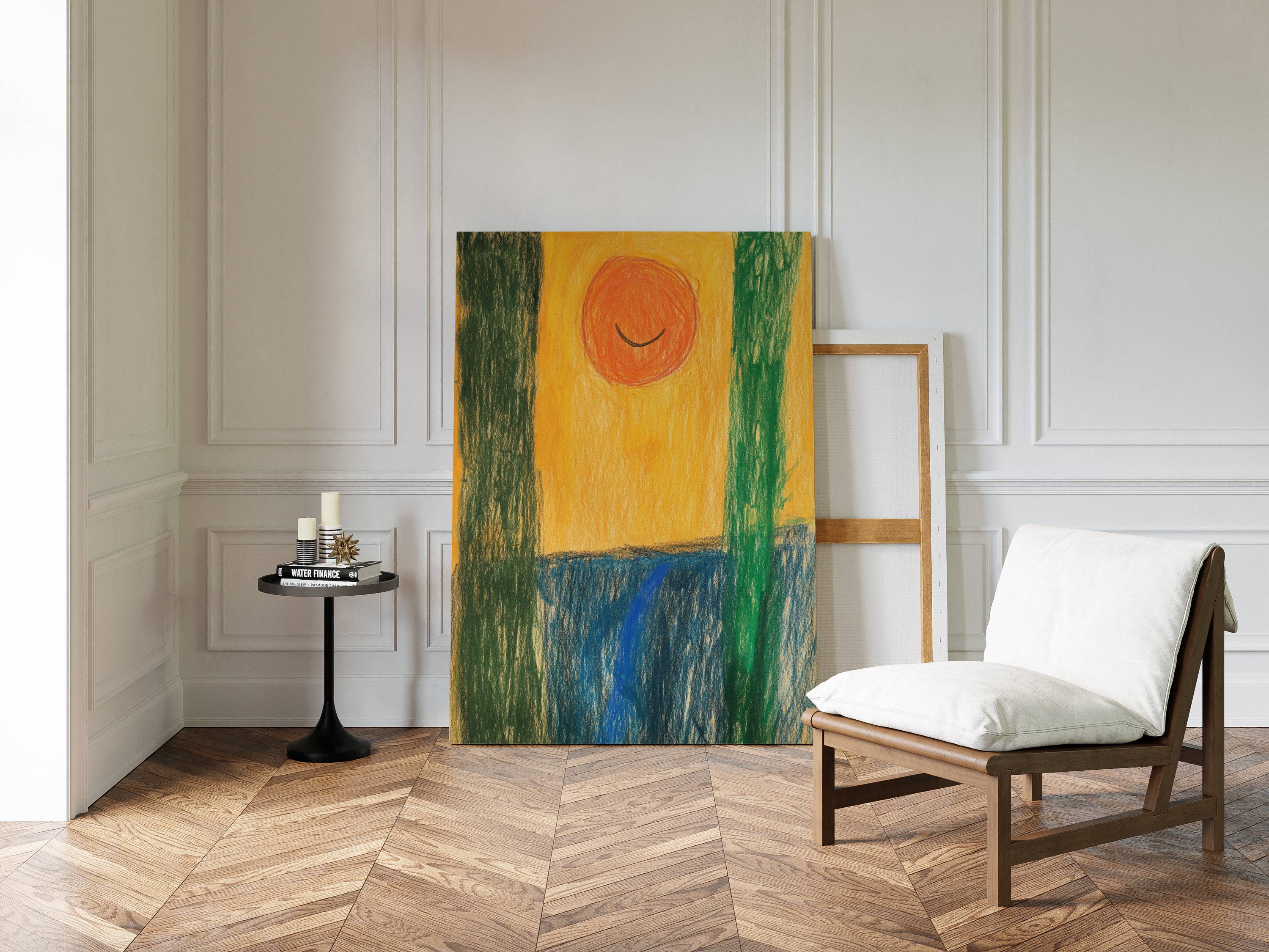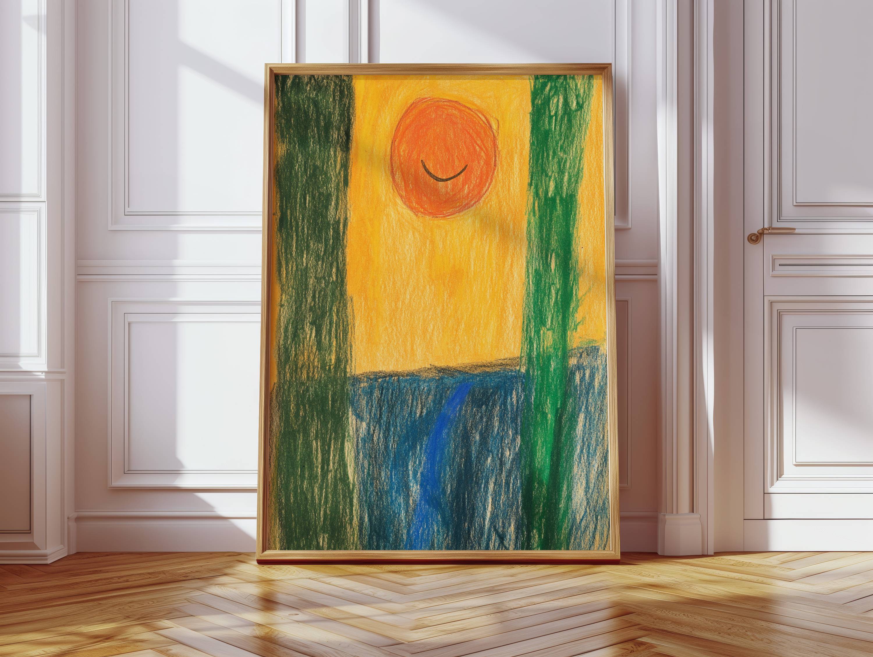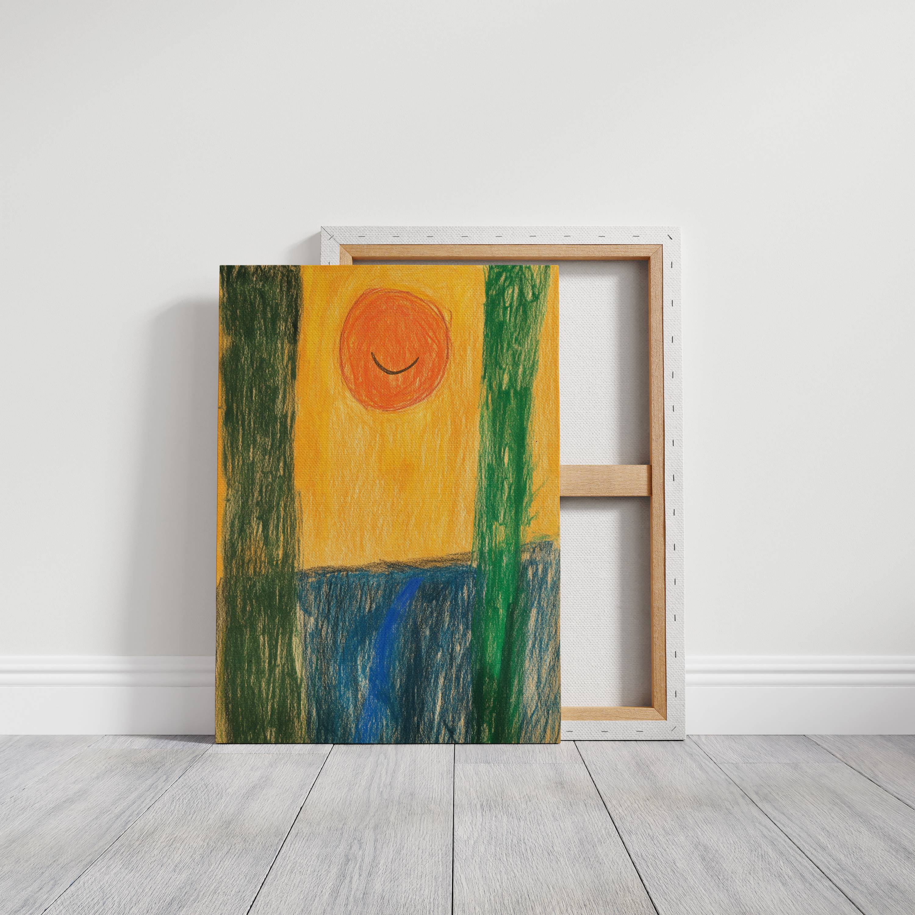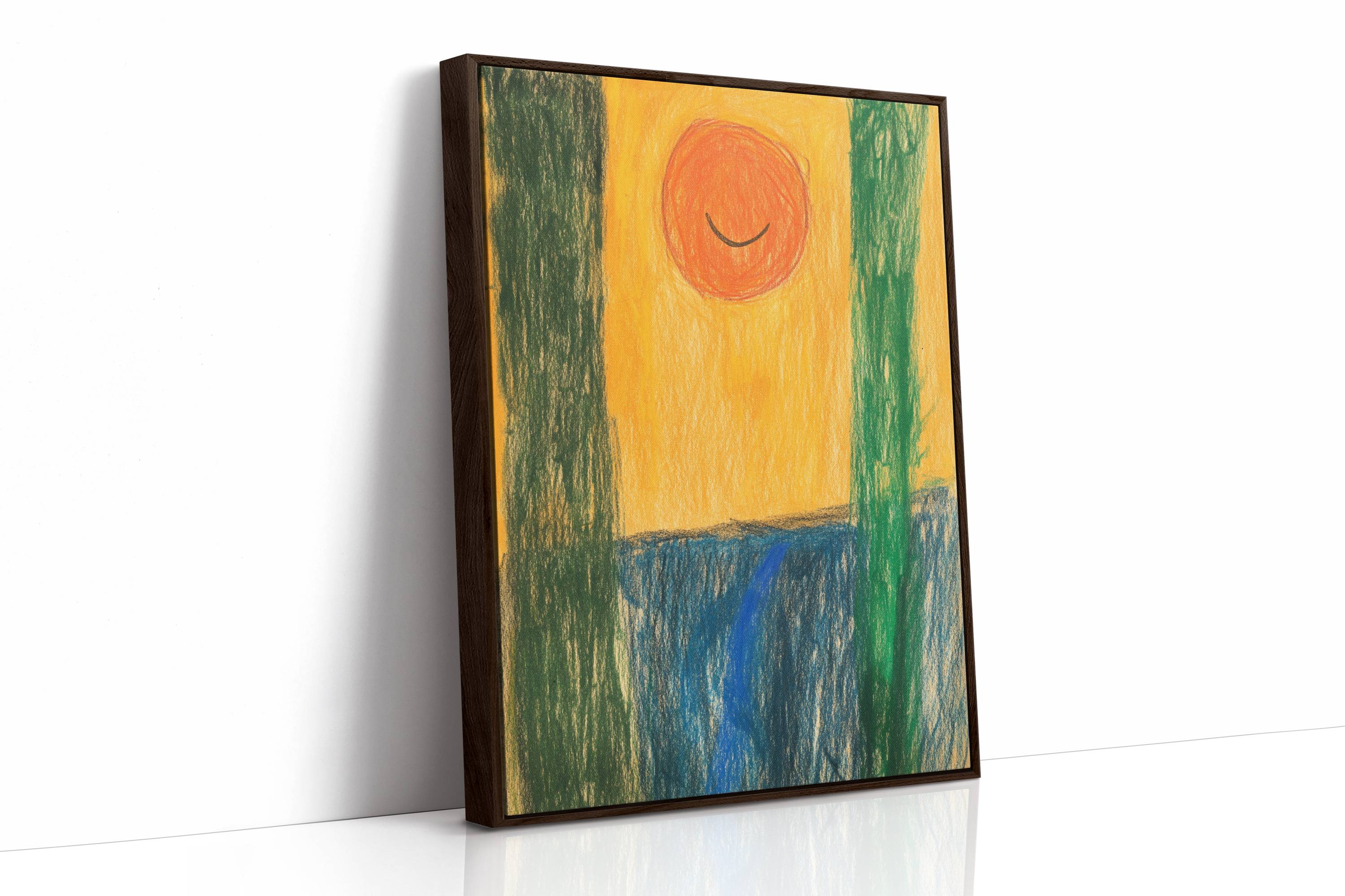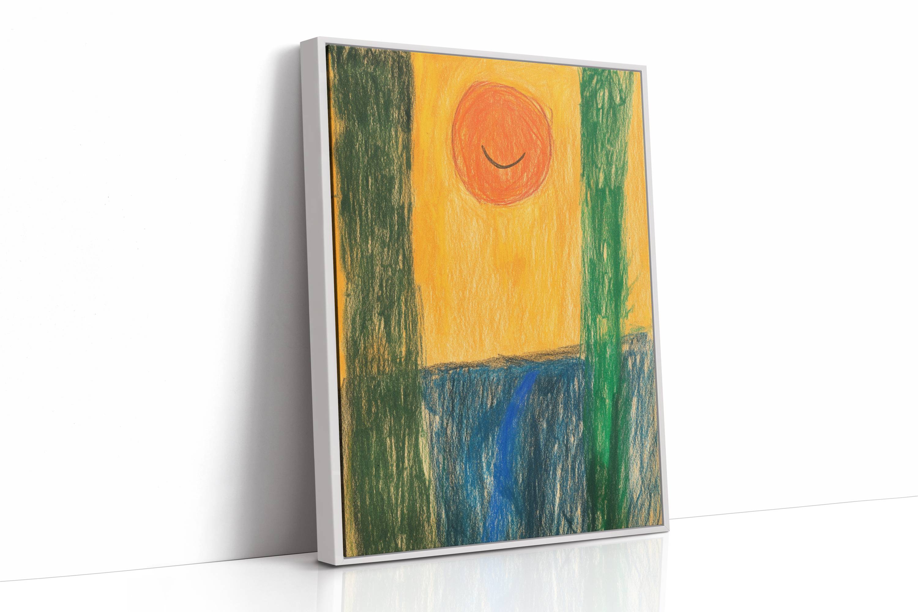 A gentle orange sun smiles down from a golden sky, radiating warmth and serenity through vibrant brushstrokes. Forest-green columns frame the scene like ancient sentinels, standing watch over a deep blue waterfall that cascades through the lower portion of the composition. The childlike simplicity of the drawing captures an innocent joy, with raw textures created by crayon or pastel strokes that add emotional depth to this peaceful landscape.