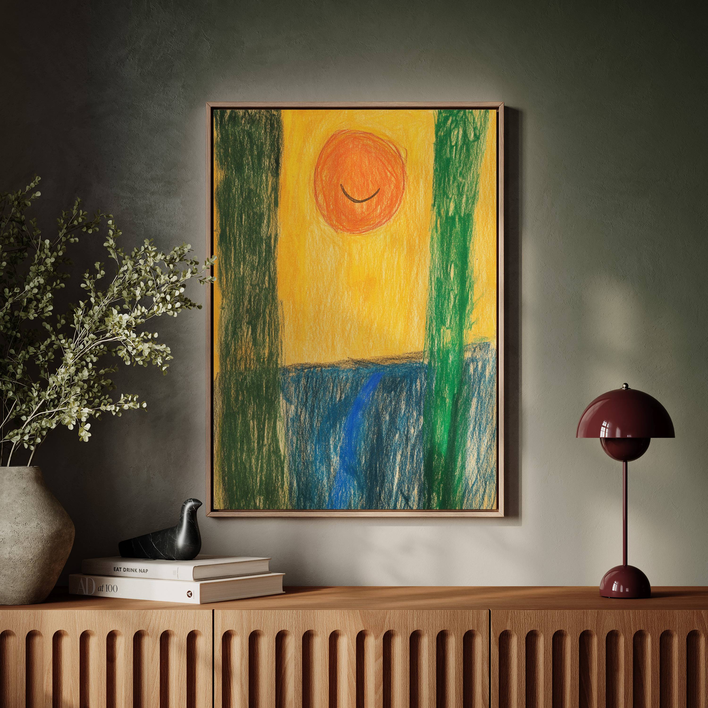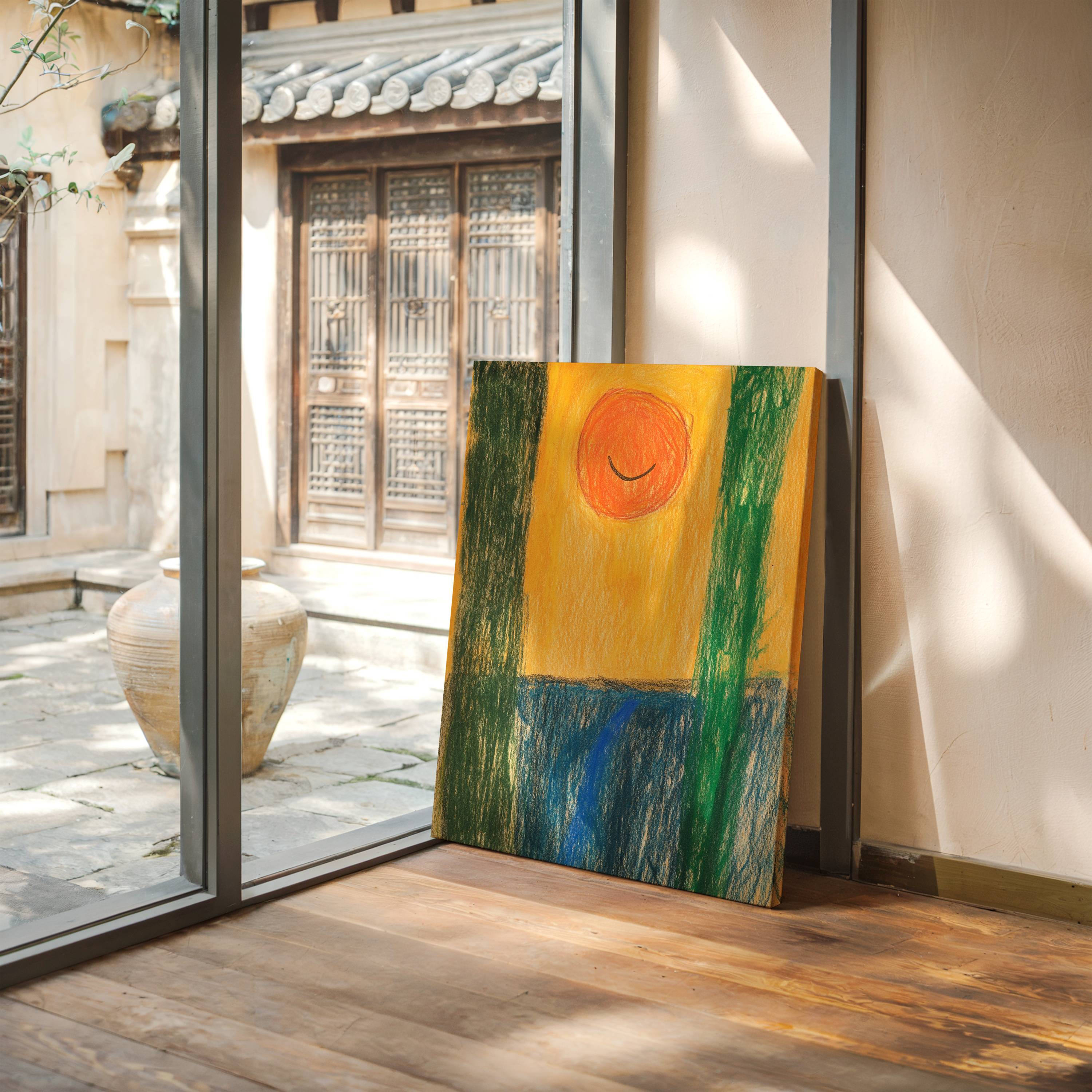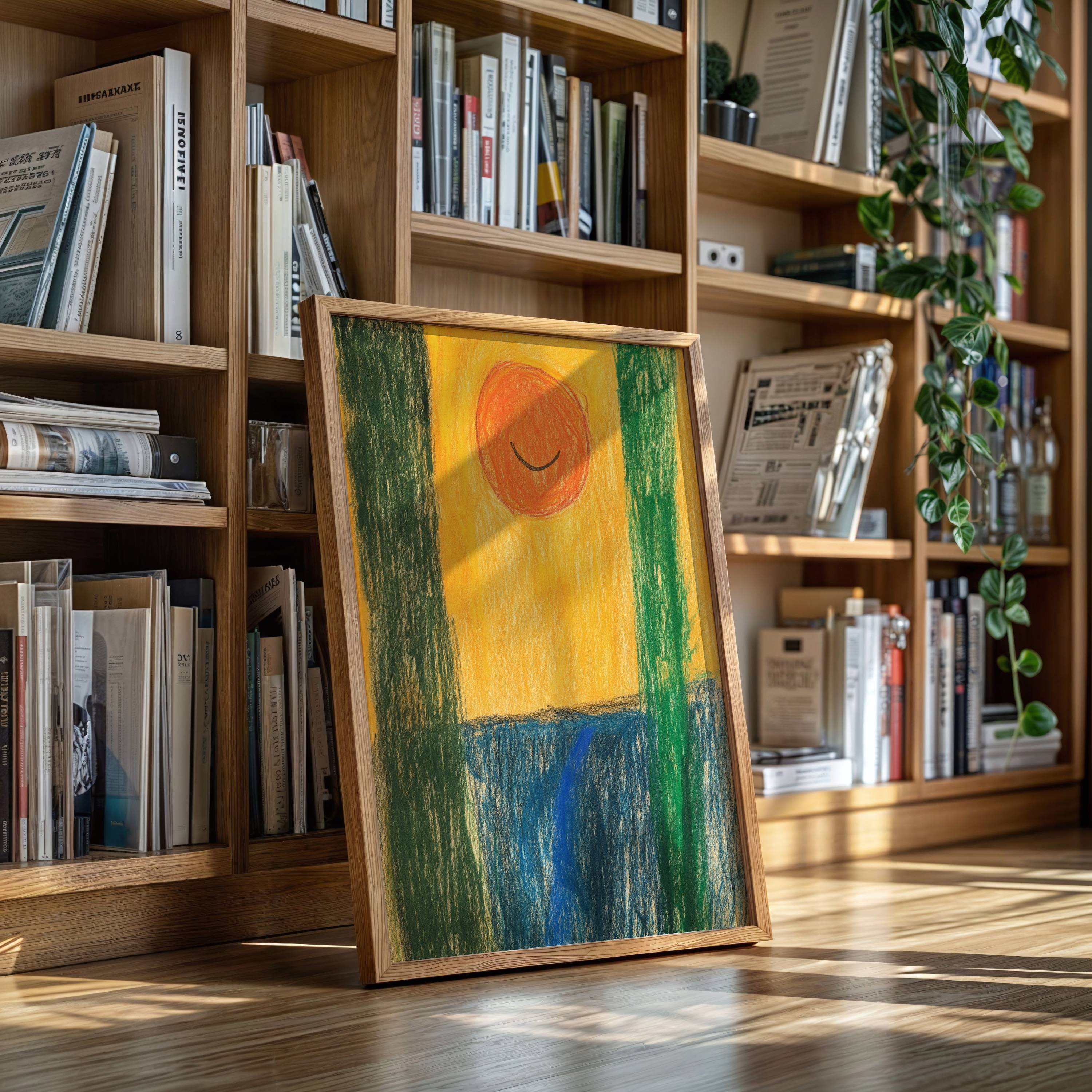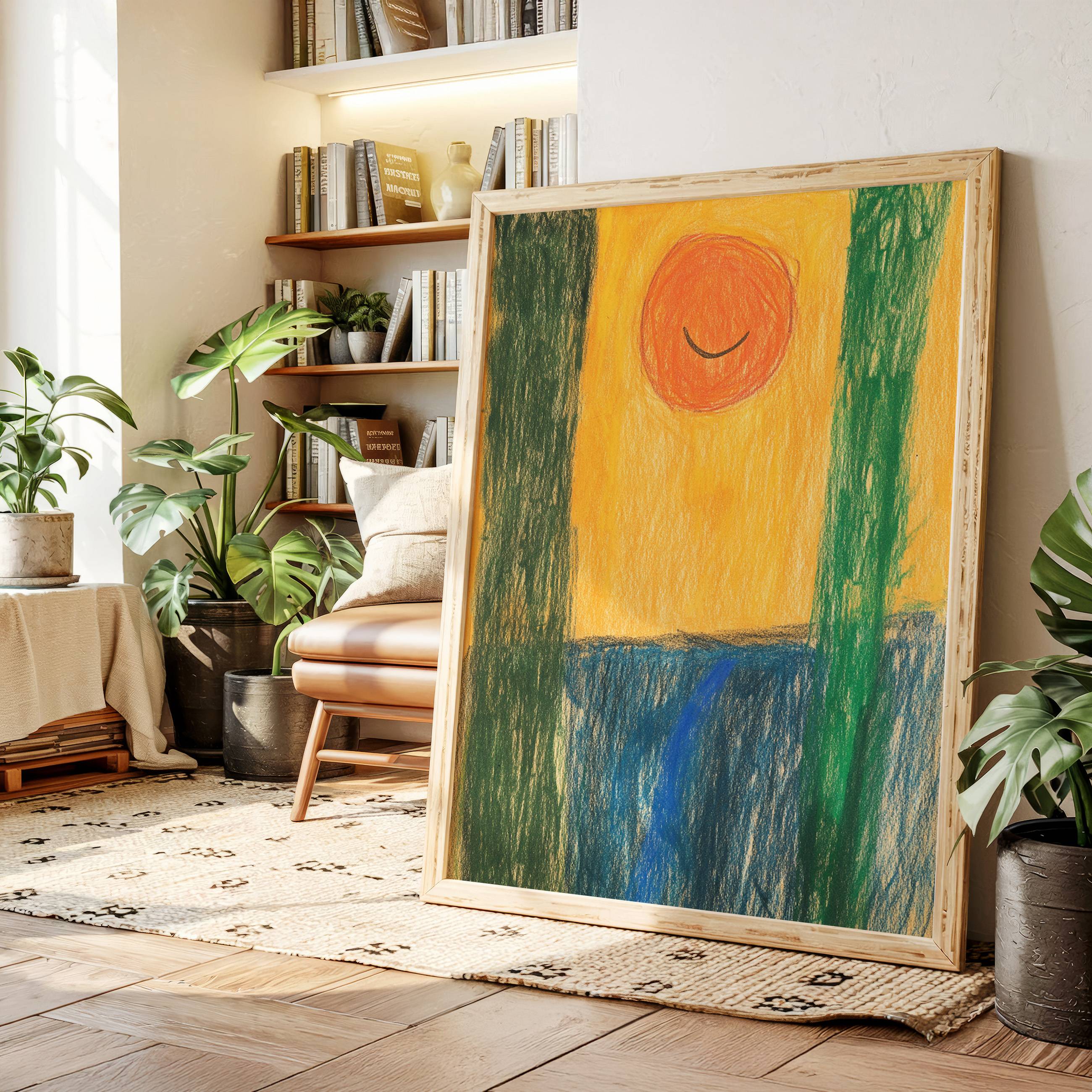 A gentle orange sun smiles down from a golden sky, radiating warmth and serenity through vibrant brushstrokes. Forest-green columns frame the scene like ancient sentinels, standing watch over a deep blue waterfall that cascades through the lower portion of the composition. The childlike simplicity of the drawing captures an innocent joy, with raw textures created by crayon or pastel strokes that add emotional depth to this peaceful landscape.