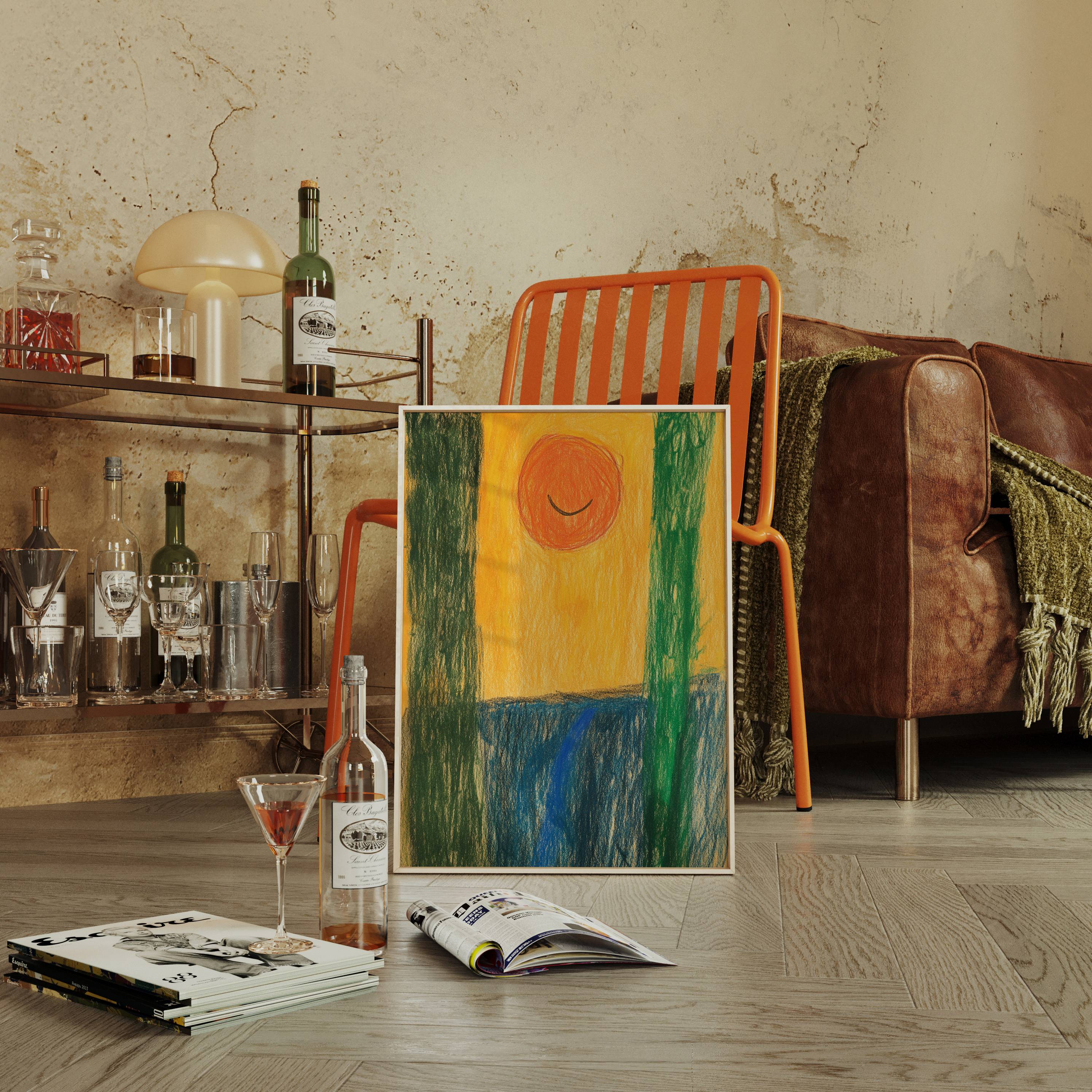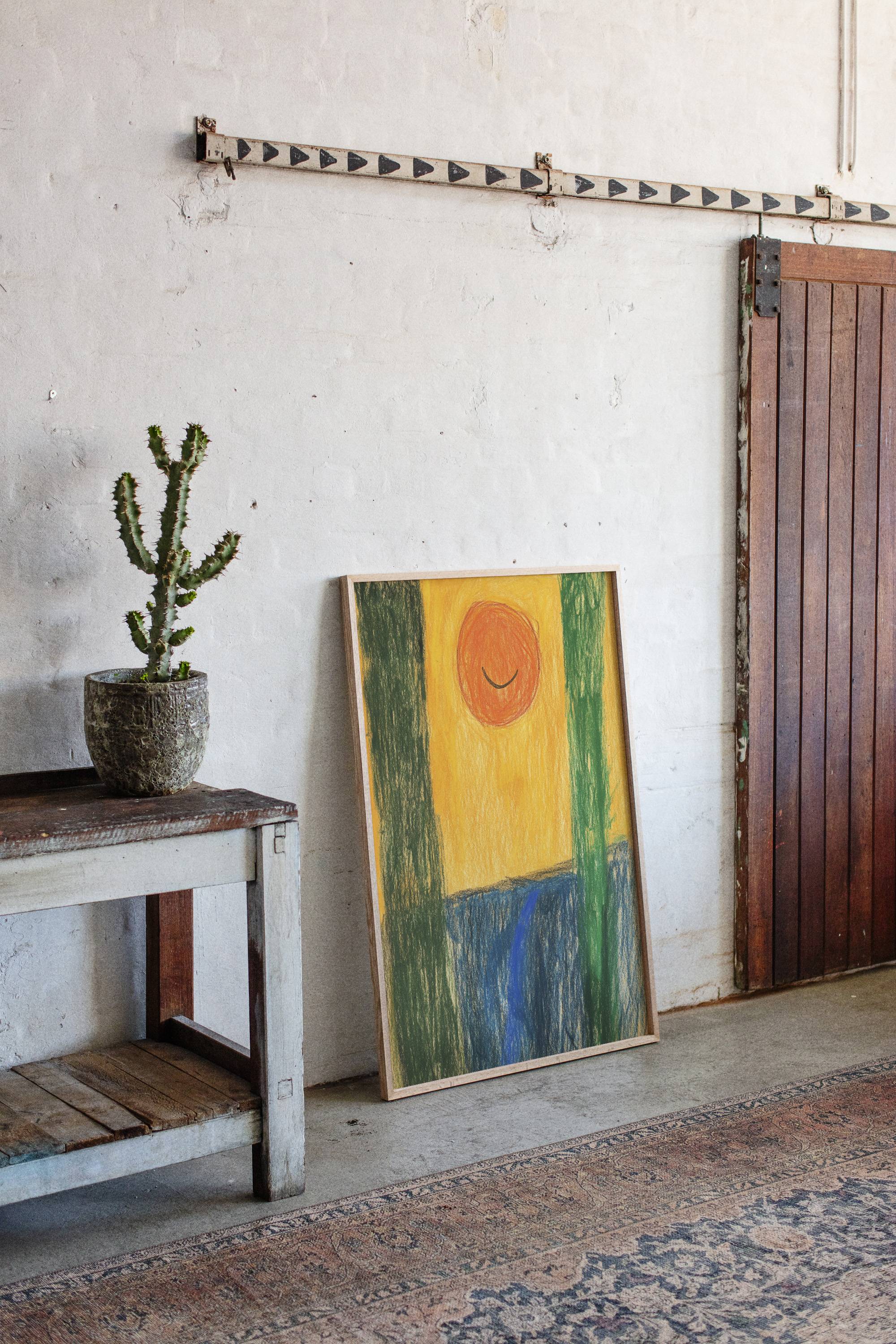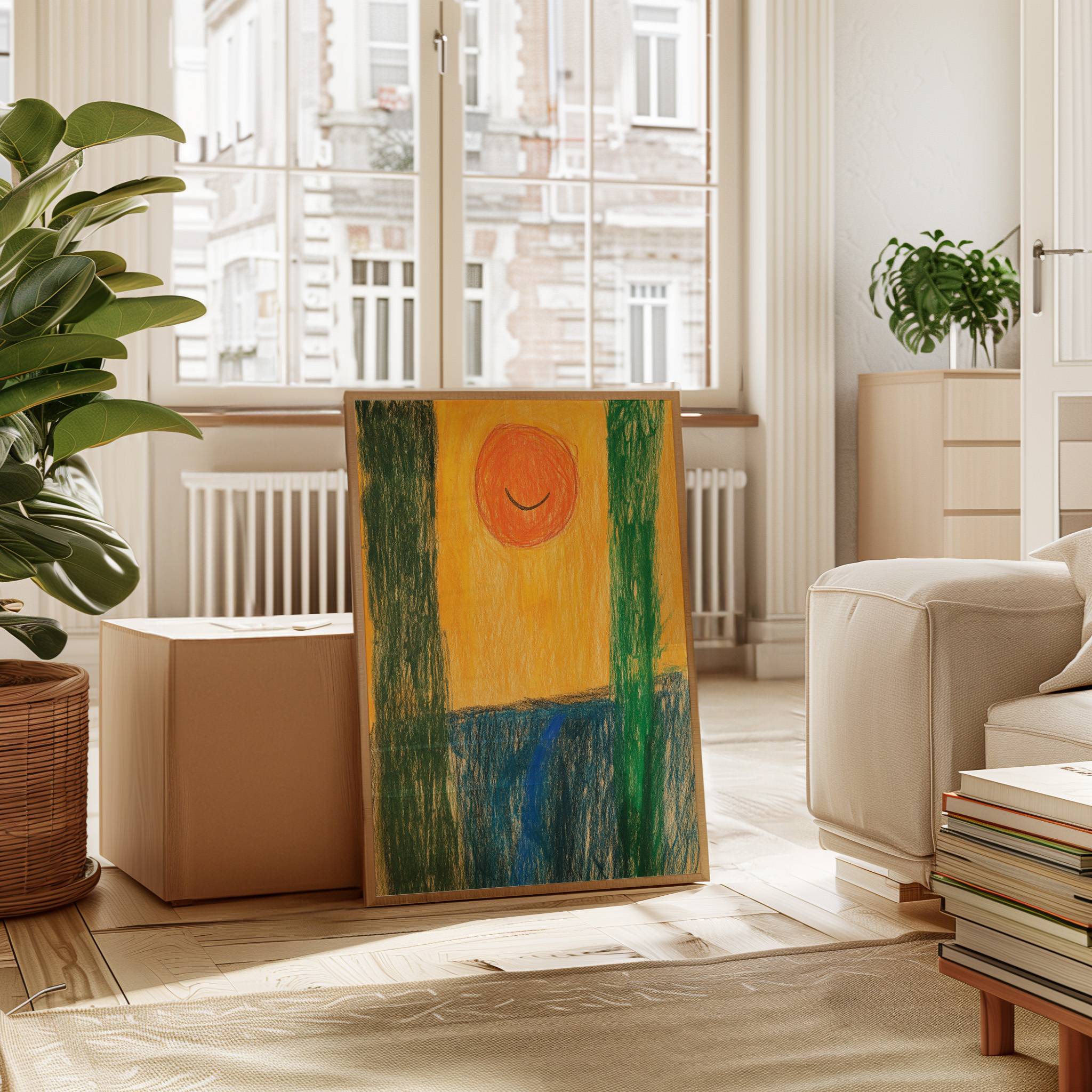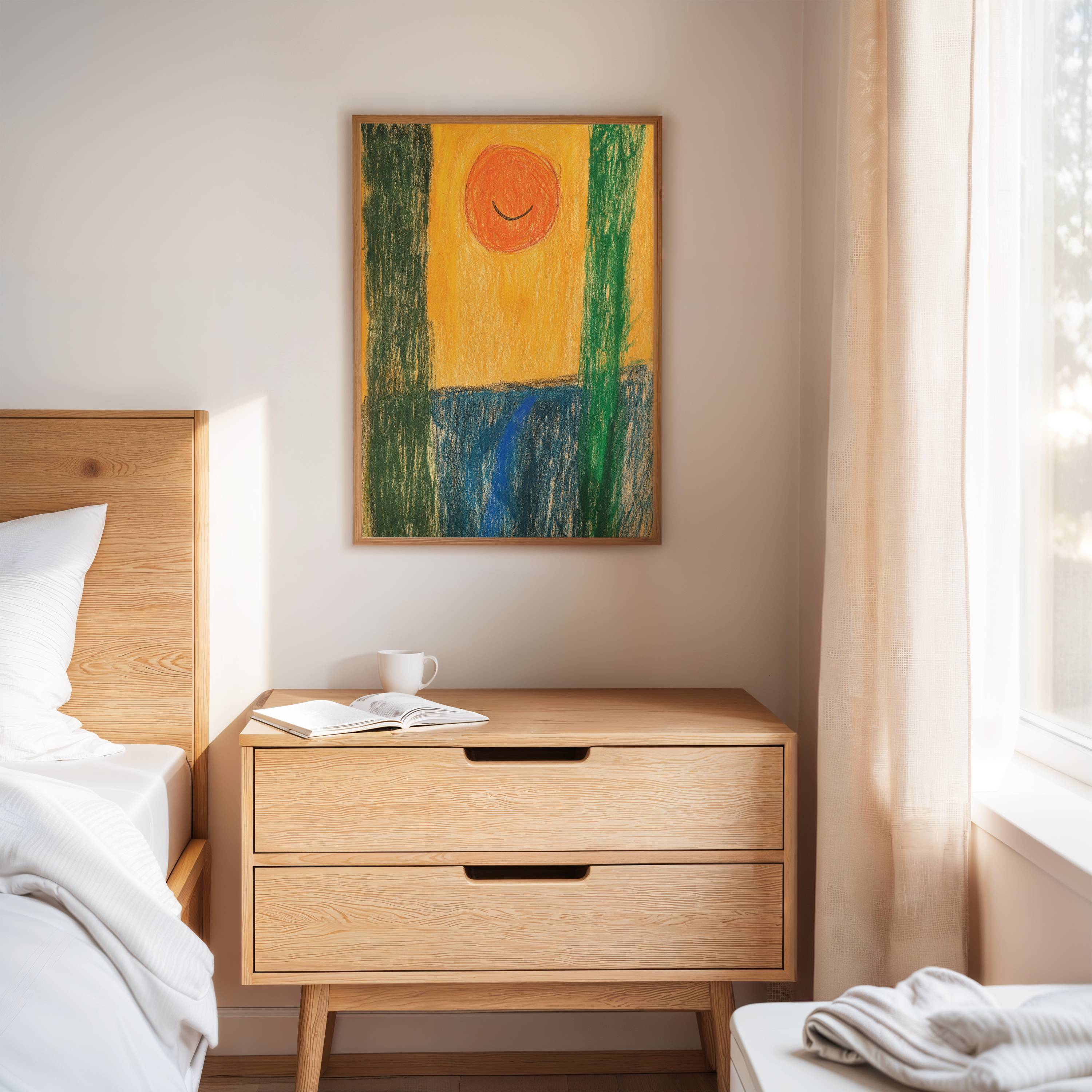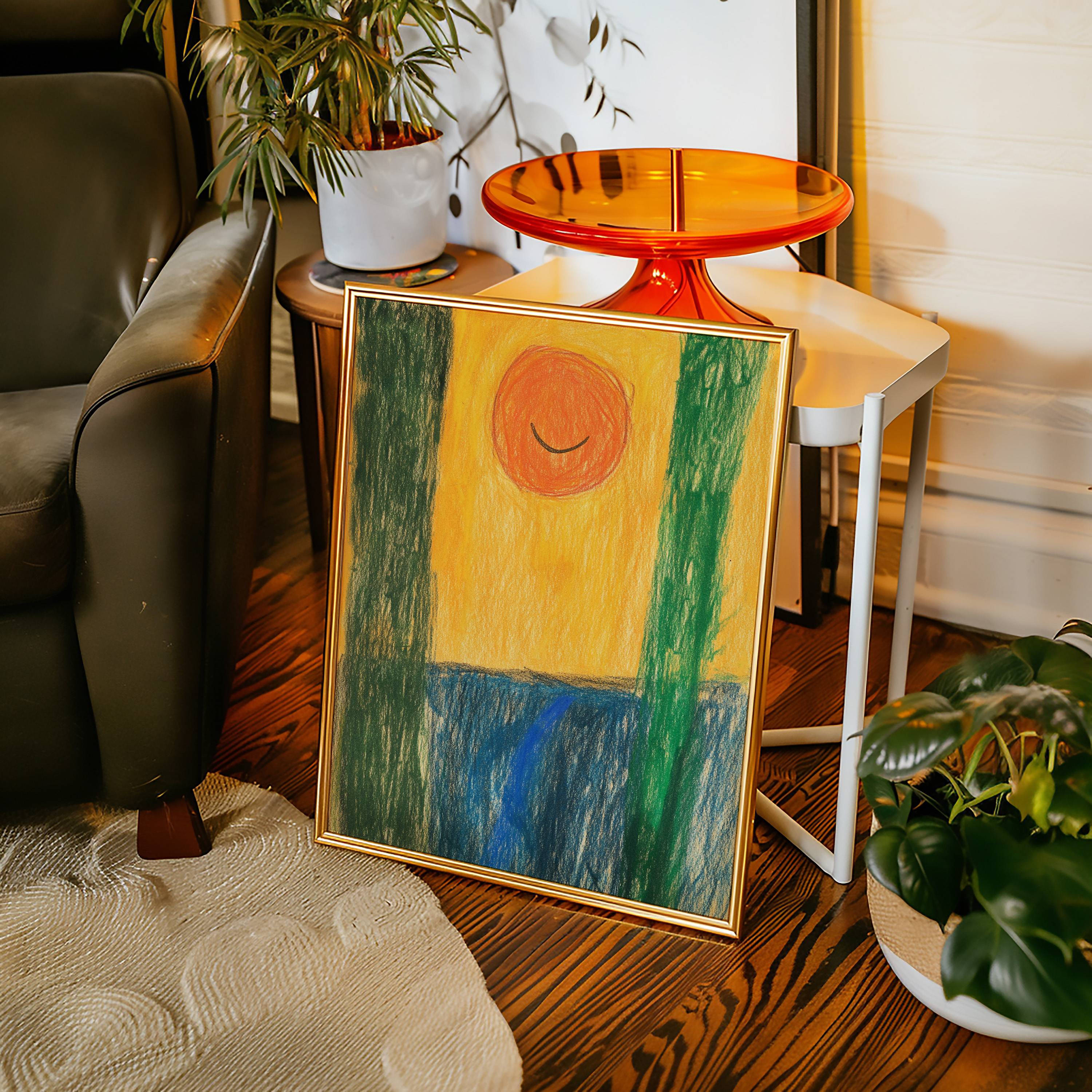 A gentle orange sun smiles down from a golden sky, radiating warmth and serenity through vibrant brushstrokes. Forest-green columns frame the scene like ancient sentinels, standing watch over a deep blue waterfall that cascades through the lower portion of the composition. The childlike simplicity of the drawing captures an innocent joy, with raw textures created by crayon or pastel strokes that add emotional depth to this peaceful landscape.