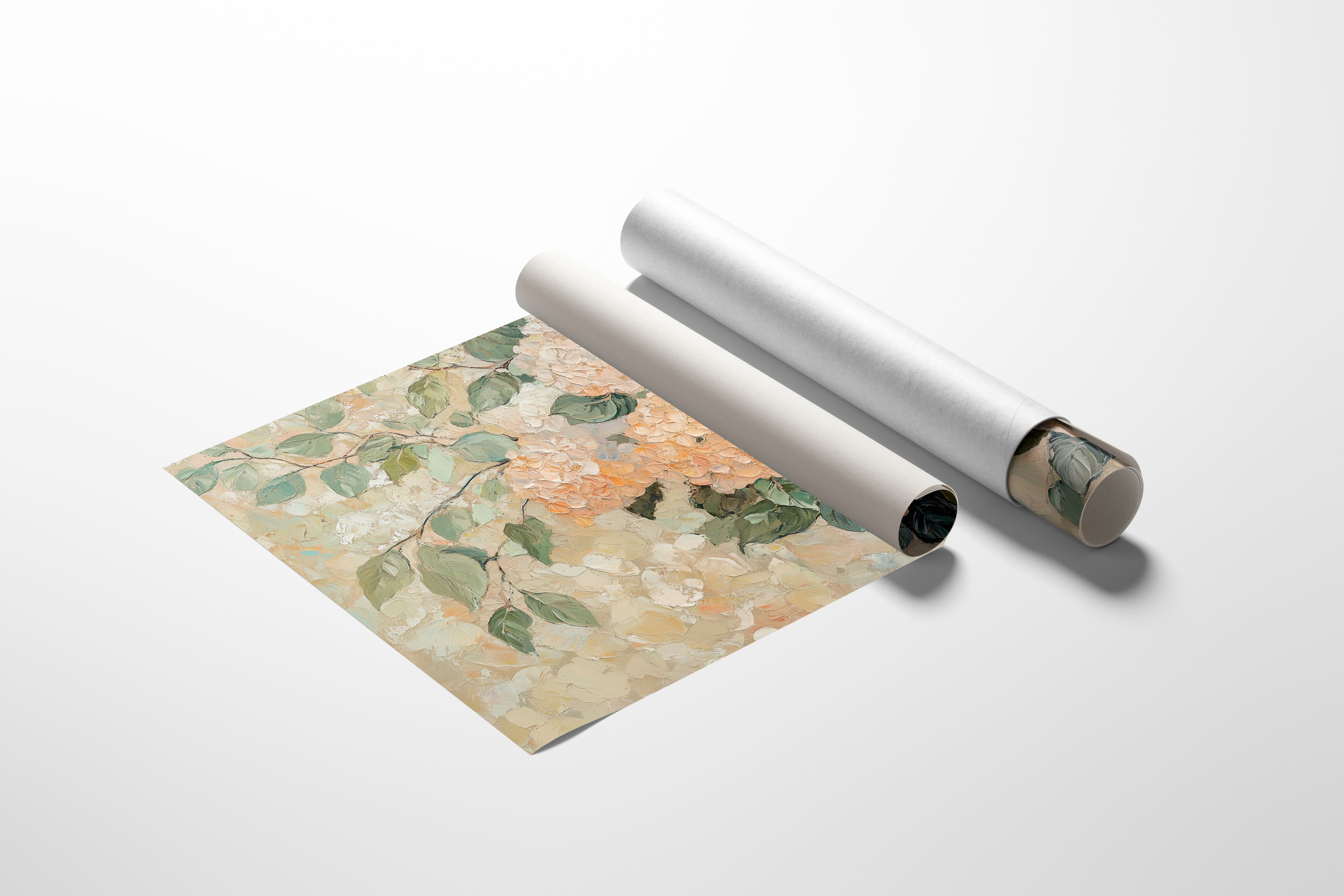 Delicate peach hydrangeas bloom with textured elegance, their petals capturing the warm glow of late summer light. Each brushstroke creates a dimensional tapestry, with sage-green leaves providing a natural framework for the billowing blooms. The impasto technique brings these flowers to life, their layered petals seeming to unfold before our eyes against a softly illuminated backdrop. This piece brings the grace of a summer garden indoors, perfect for creating a focal point in spaces that celebrate natural beauty and artistic sophistication.