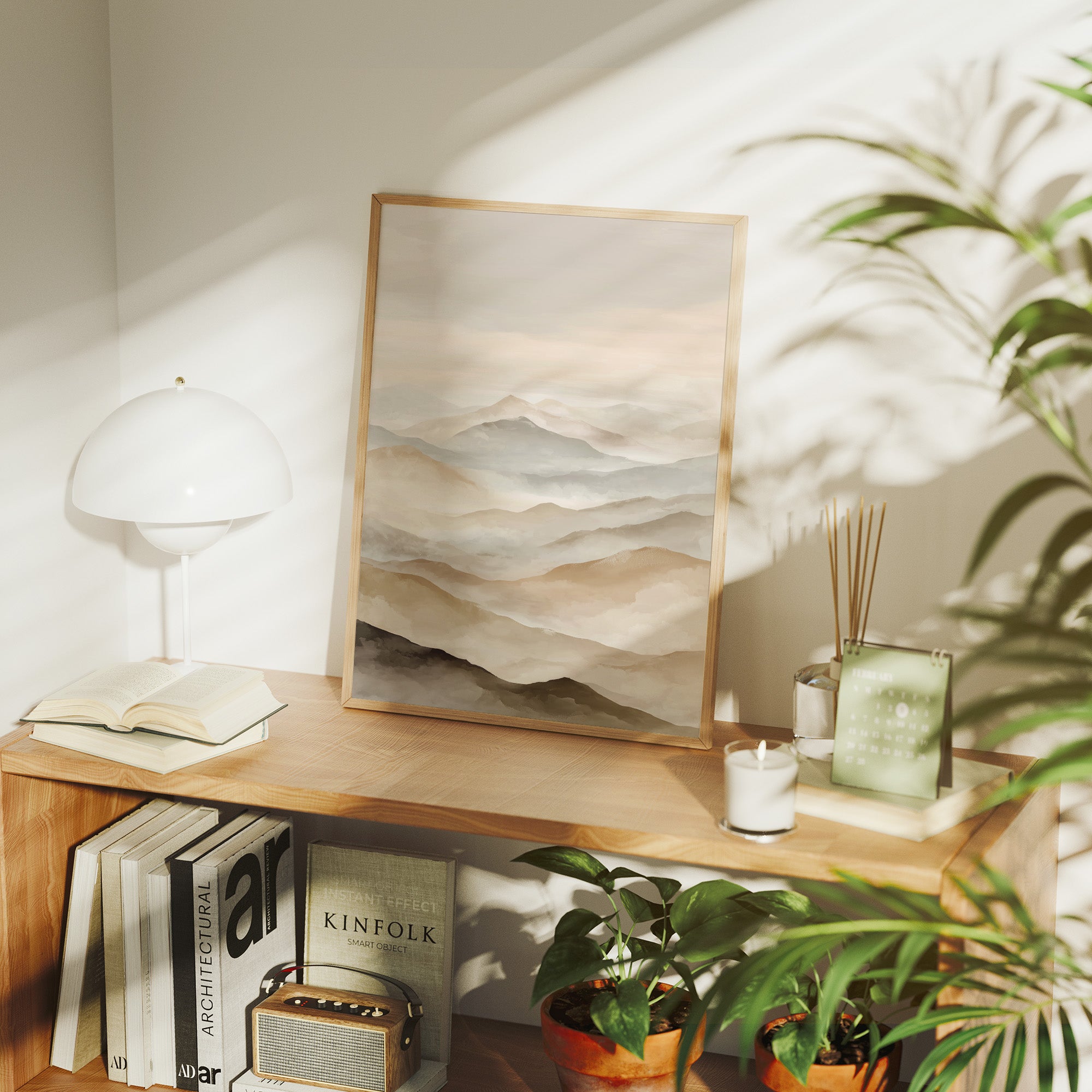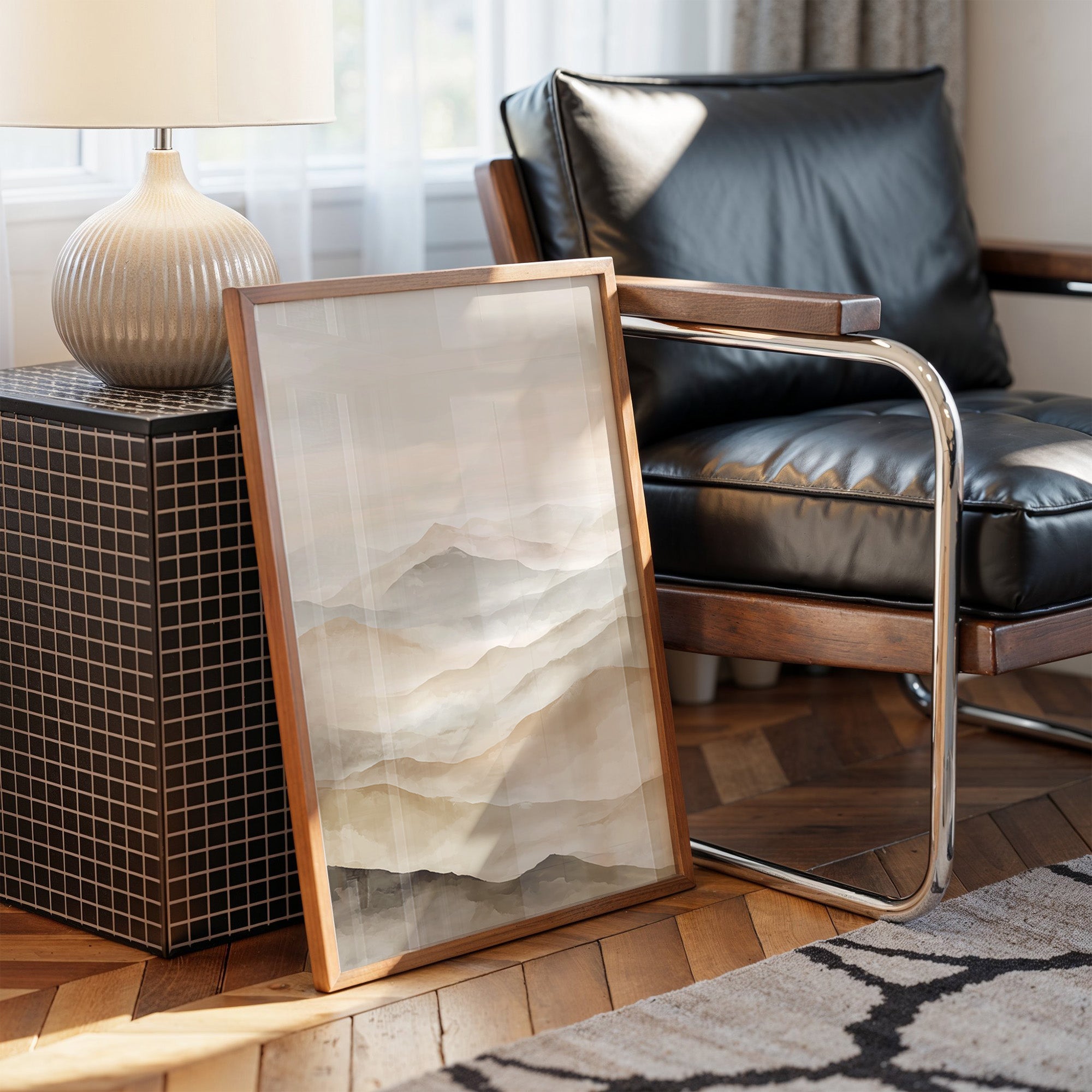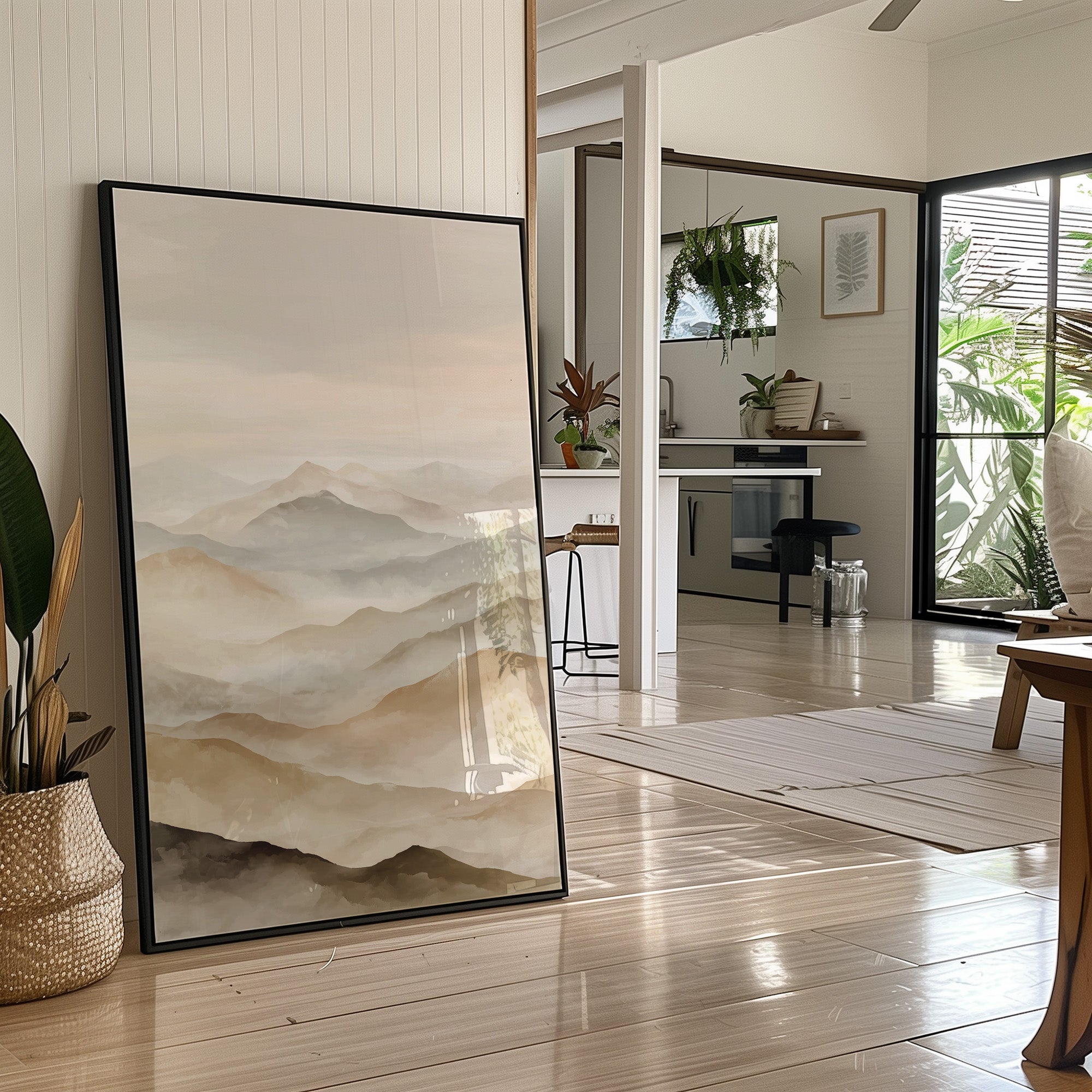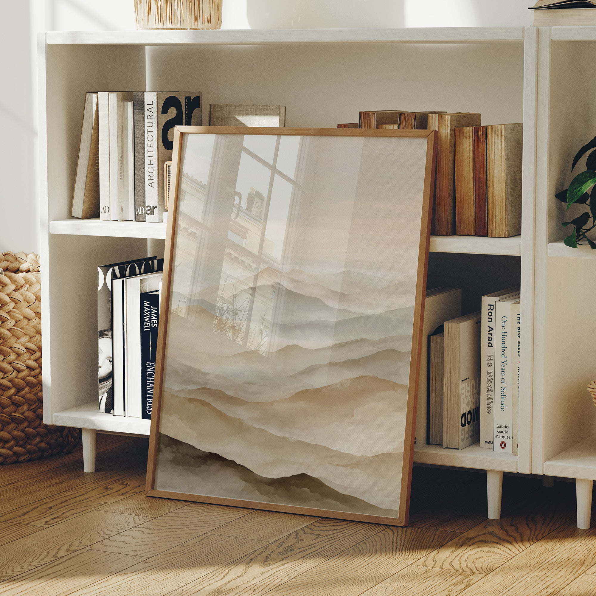 Layers of morning light filter through valleys, creating an ethereal dance of earth tones and silvery haze. The mountainous landscape unfolds like gentle waves, each ridge softening into the distance through veils of fog and dawn light. Warm browns and cool greys merge in a delicate balance, suggesting the timeless dialogue between earth and sky. This serene composition brings sophisticated tranquility to modern living spaces, perfect for creating a contemplative atmosphere in a minimalist bedroom or meditation room.