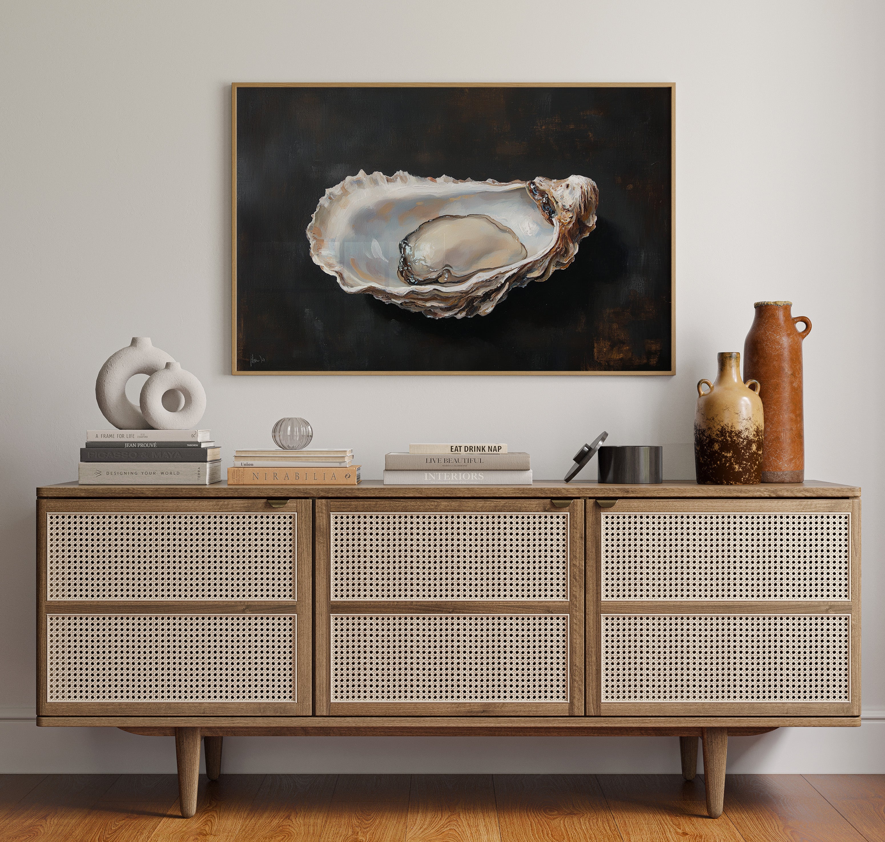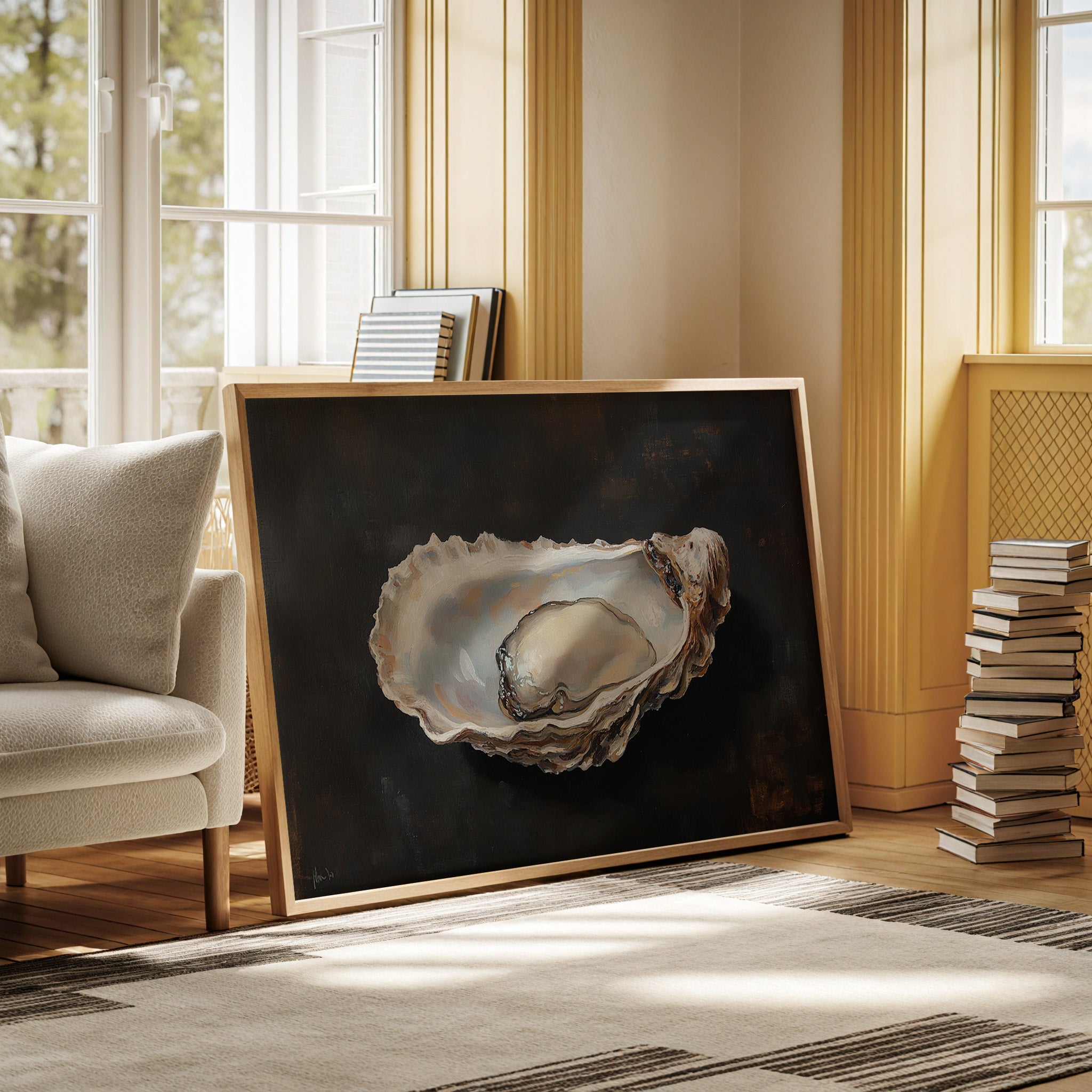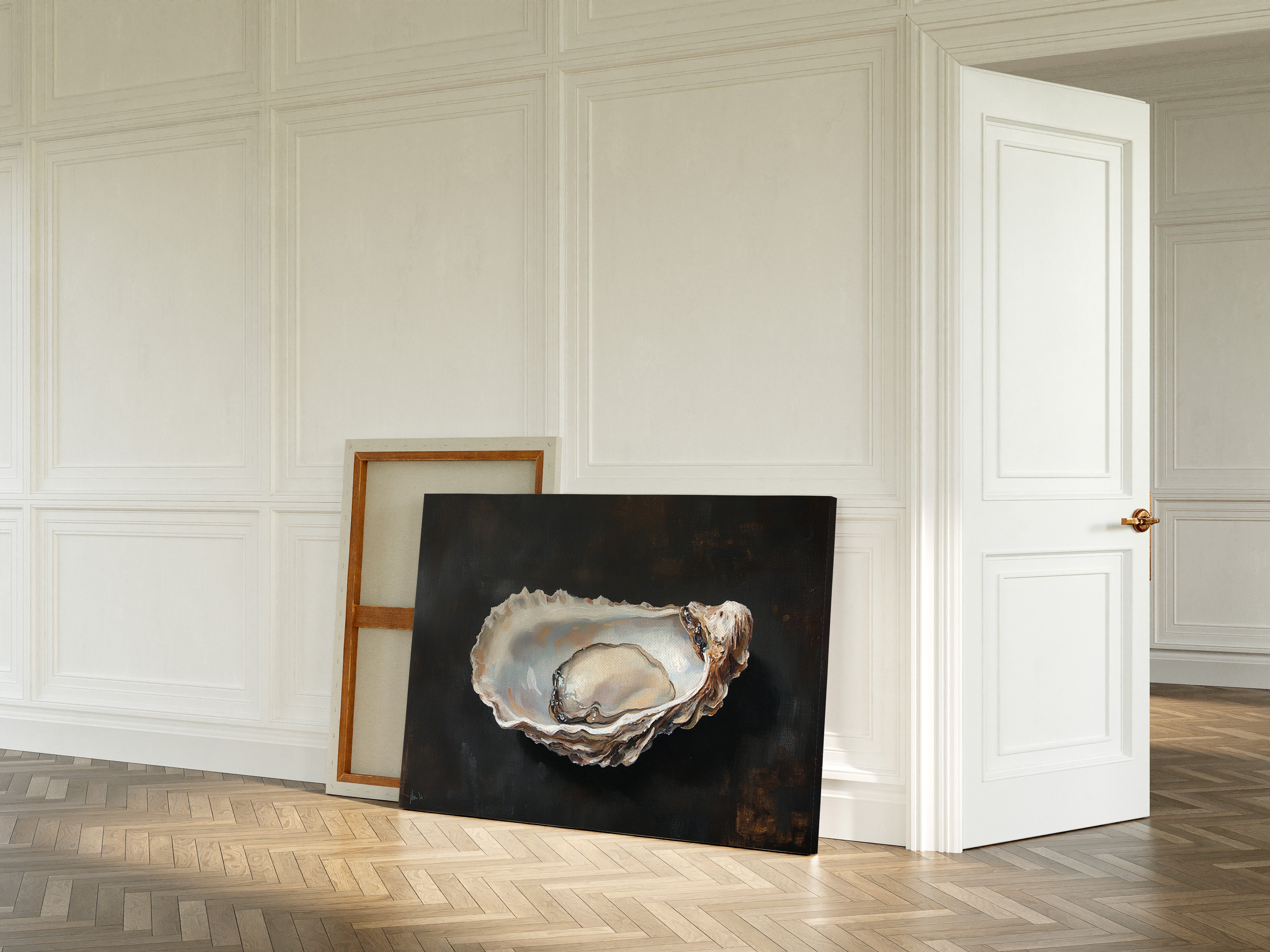 A single oyster emerges from darkness, its pearlescent shell gleaming with an almost ethereal luminescence. The intricate brushstrokes capture every ridge and fold of the weathered shell, while the pristine interior cradles its tender flesh like a secret from the depths. The contrast between the rough exterior and smooth inner chamber tells a story of transformation, enhanced by the rich dark background that makes the shell's milky whites and subtle pinks appear to float in space. This piece would bring sophisticated coastal elegance to a dining room or kitchen, perfect for spaces that celebrate culinary artistry and natural beauty.