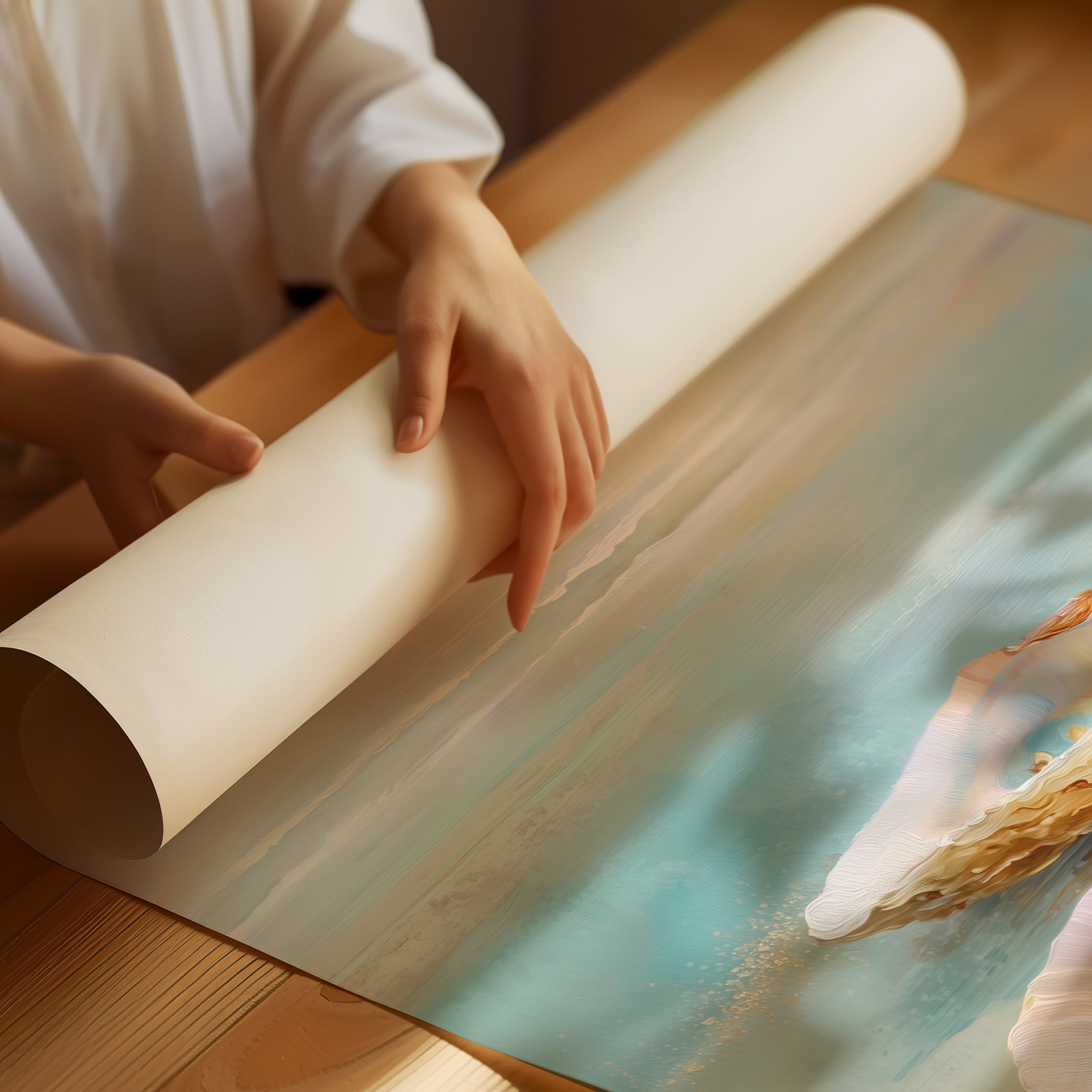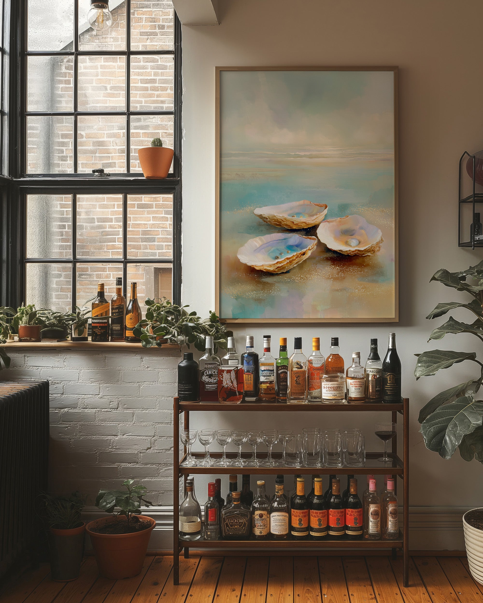 Sunlight dances across iridescent shells, their mother-of-pearl interiors catching the warm glow of afternoon light. The delicate oyster shells rest against a backdrop of soft aqua and sandy hues, evoking memories of tranquil shorelines where ocean meets land. Their natural textures and luminous quality create a moment of quiet beauty amid the sophisticated modern space surrounding them. This serene coastal piece adds a touch of natural elegance to a contemporary living room or home office, bringing oceanic calm to everyday moments.