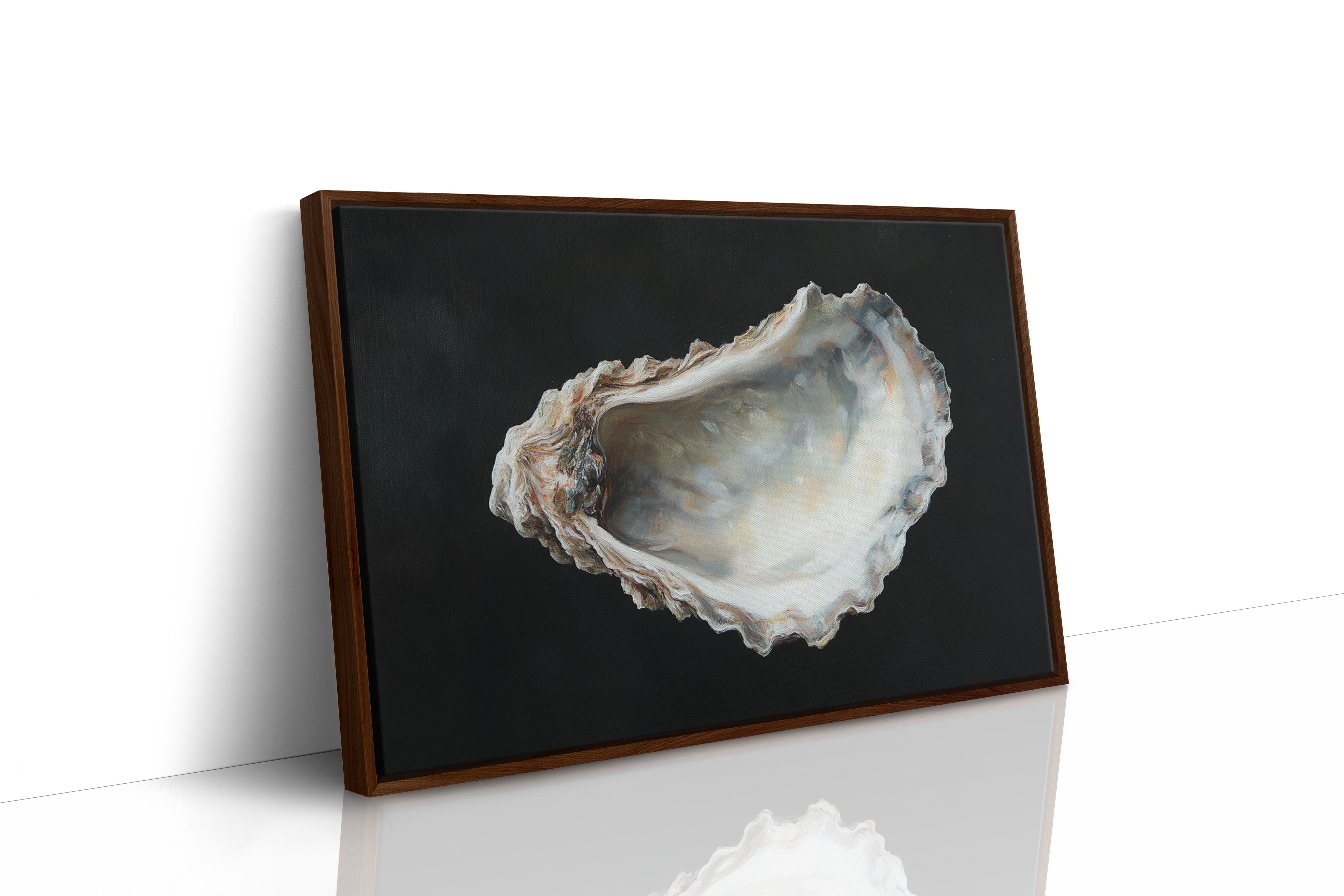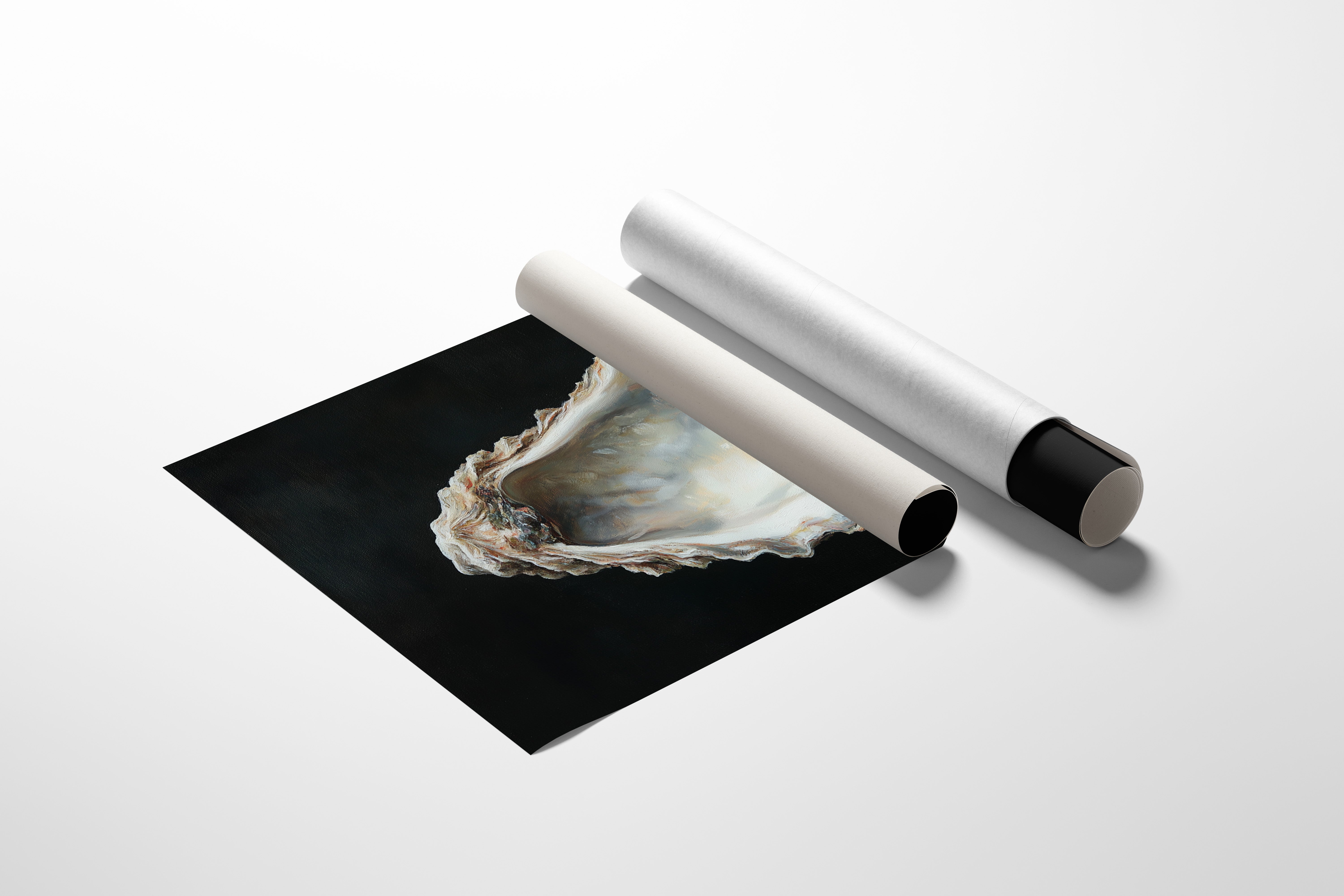 A single oyster shell gleams with ethereal luminescence against deep darkness, its pearlescent interior catching subtle hints of light. The intricate ridges and natural imperfections of the shell tell stories of tidal rhythms and ocean depths, while delicate cream and grey tones blend with hints of warm copper along its weathered edges. This striking study in organic texture and form captures the raw beauty of coastal treasures, transforming a humble shell into an object of contemplation. Perfect for adding a touch of refined coastal elegance to modern dining rooms or bringing natural sophistication to minimalist spaces.
