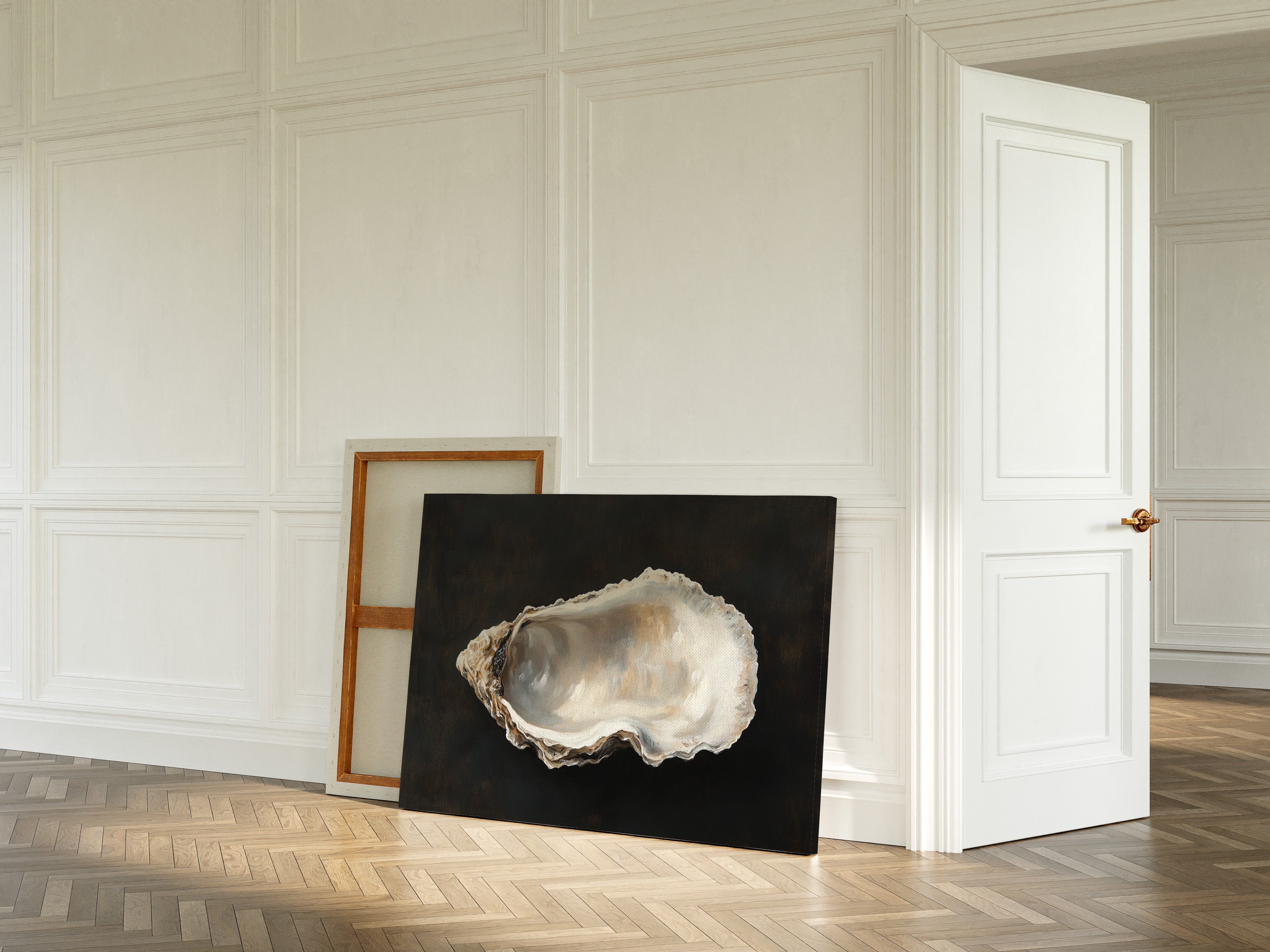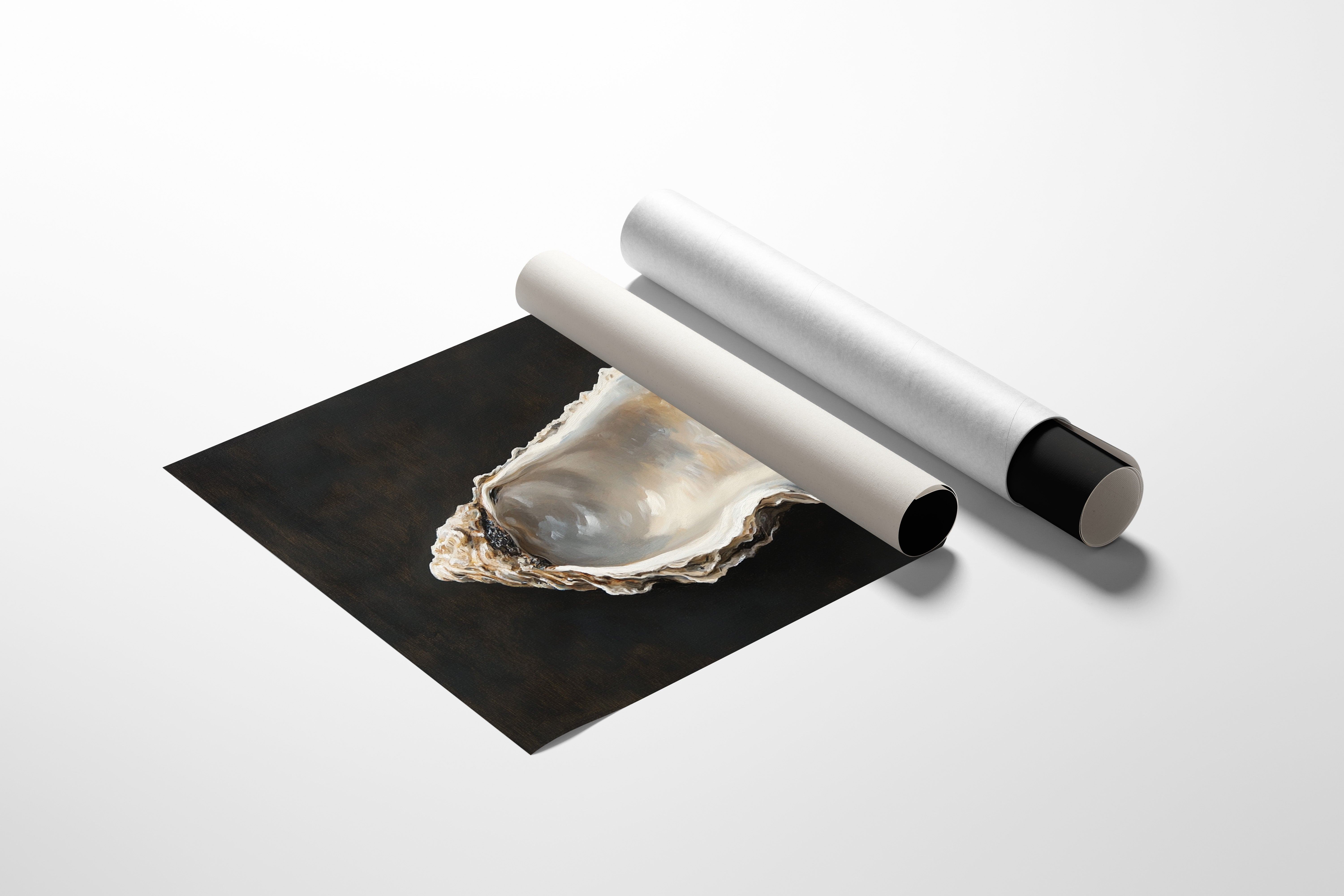 A single oyster shell gleams against deep darkness, its pearlescent interior catching subtle light like moonlight on still water. The intricate ridges and organic textures tell stories of tides and time, with delicate cream and golden hues swirling across its nacre surface. The shell's rugged exterior contrasts beautifully with its smooth, luminous inner chamber, creating a study in natural elegance. This piece brings coastal sophistication to any space, perfect for modern coastal homes or minimal contemporary interiors seeking a touch of organic luxury.