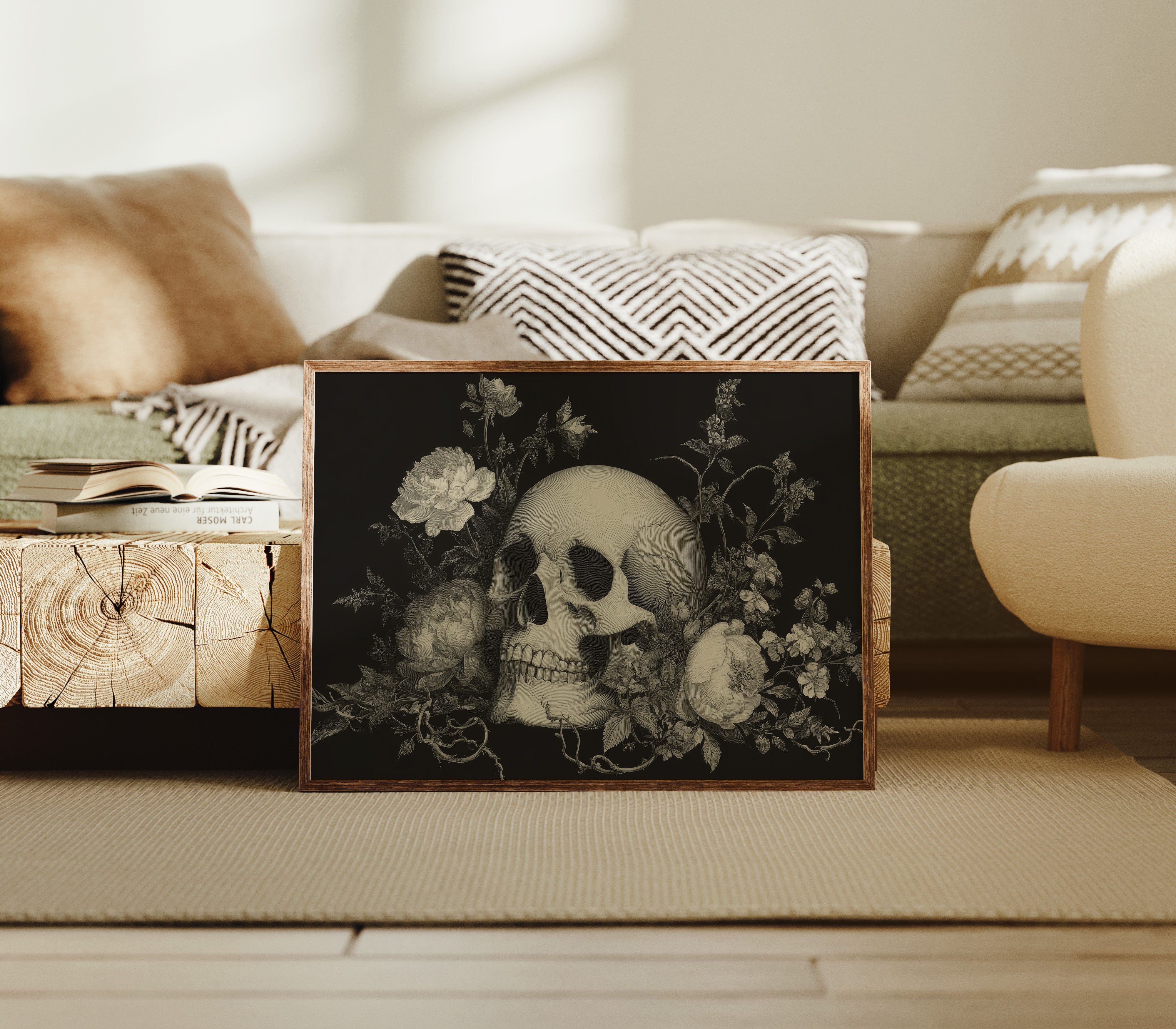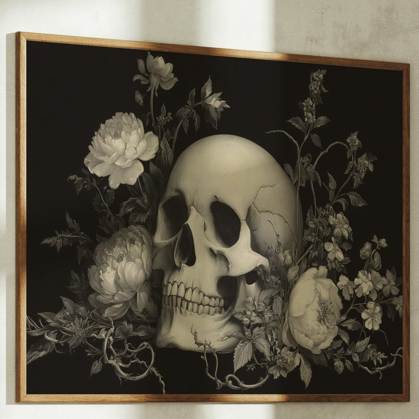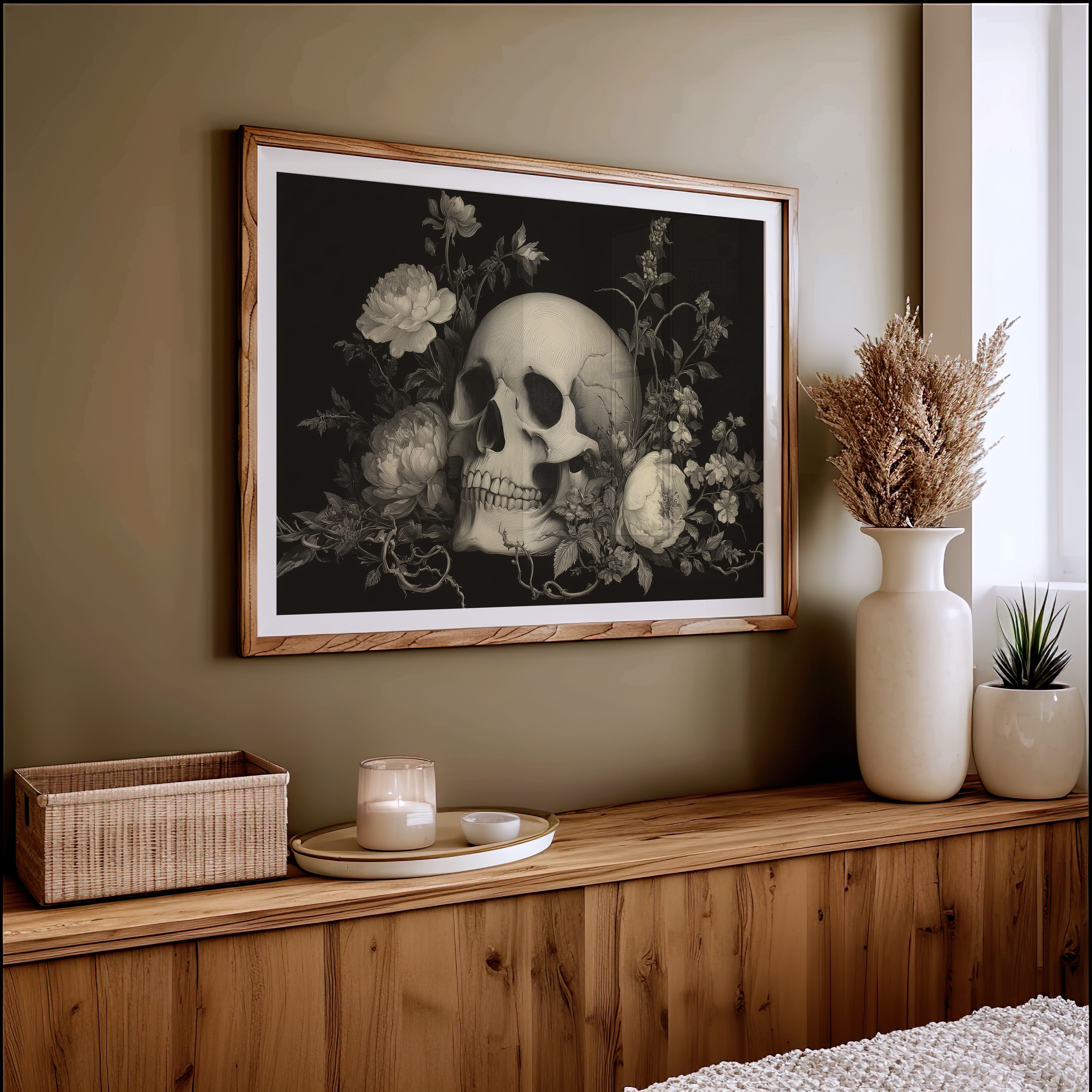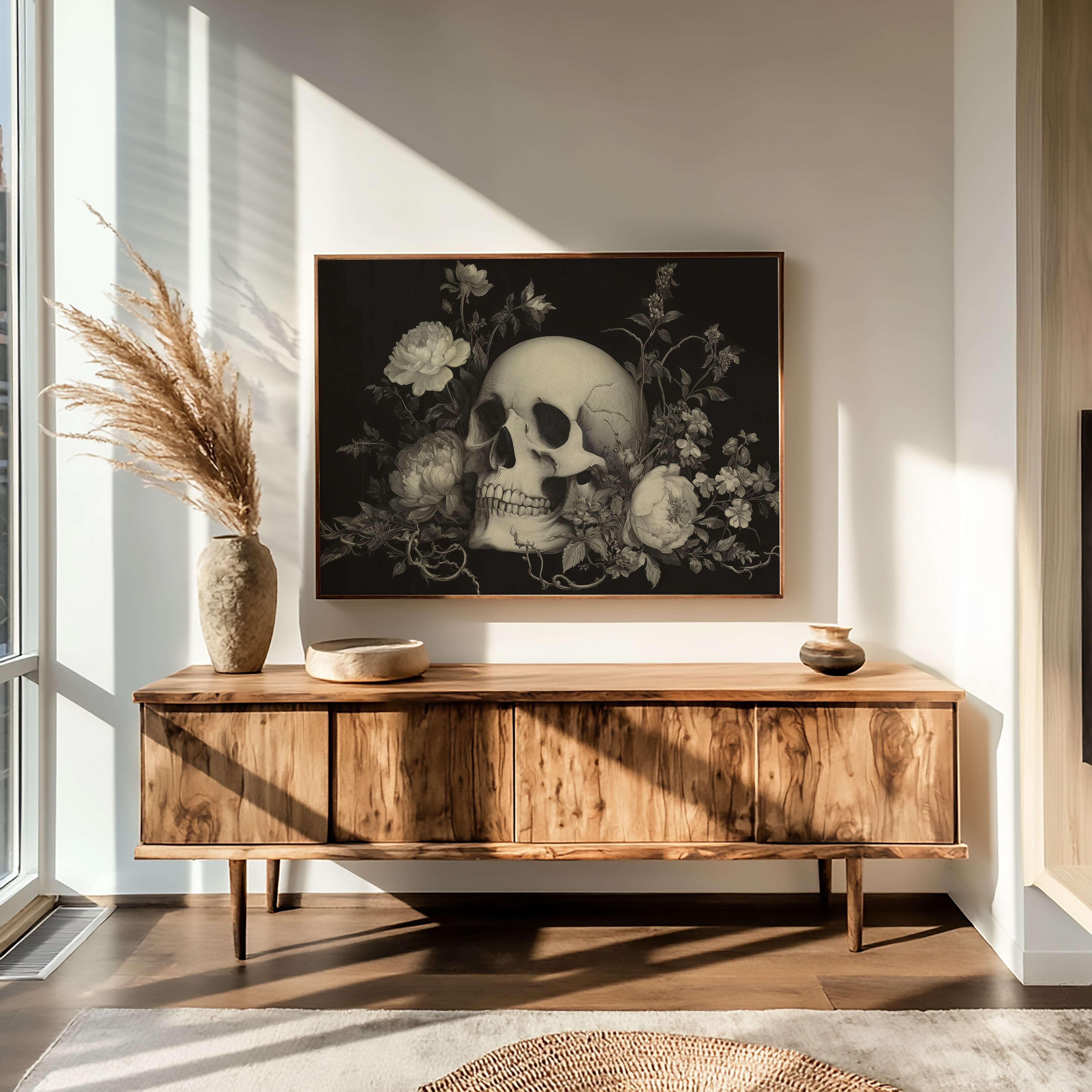 Delicate white petals unfold against velvet darkness, their gentle beauty a stark contrast to mortality's stark presence. This piece exemplifies the modern revival of classical vanitas artistry. Intricate line work traces each petal and bone, creating a haunting dance between life and death as lush peonies and wildflowers embrace a beautifully rendered skull. The monochromatic palette heightens the dramatic interplay of light and shadow, while flowing botanical elements soften the composition's memento mori theme. Perfect for creating a sophisticated focal point in a study, dining room, or dramatic entryway. The piece invites contemplation while maintaining an elegant, contemporary edge.