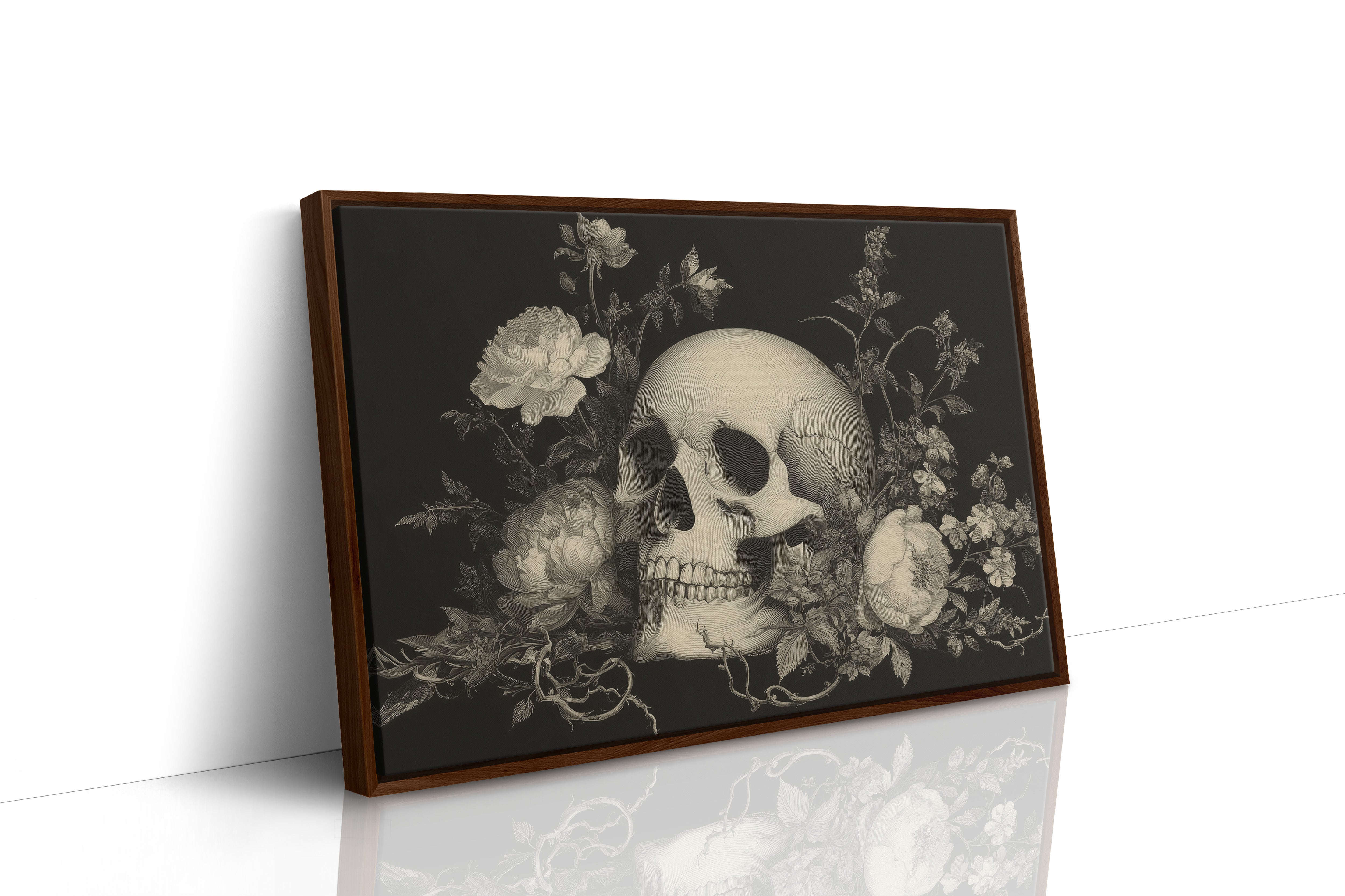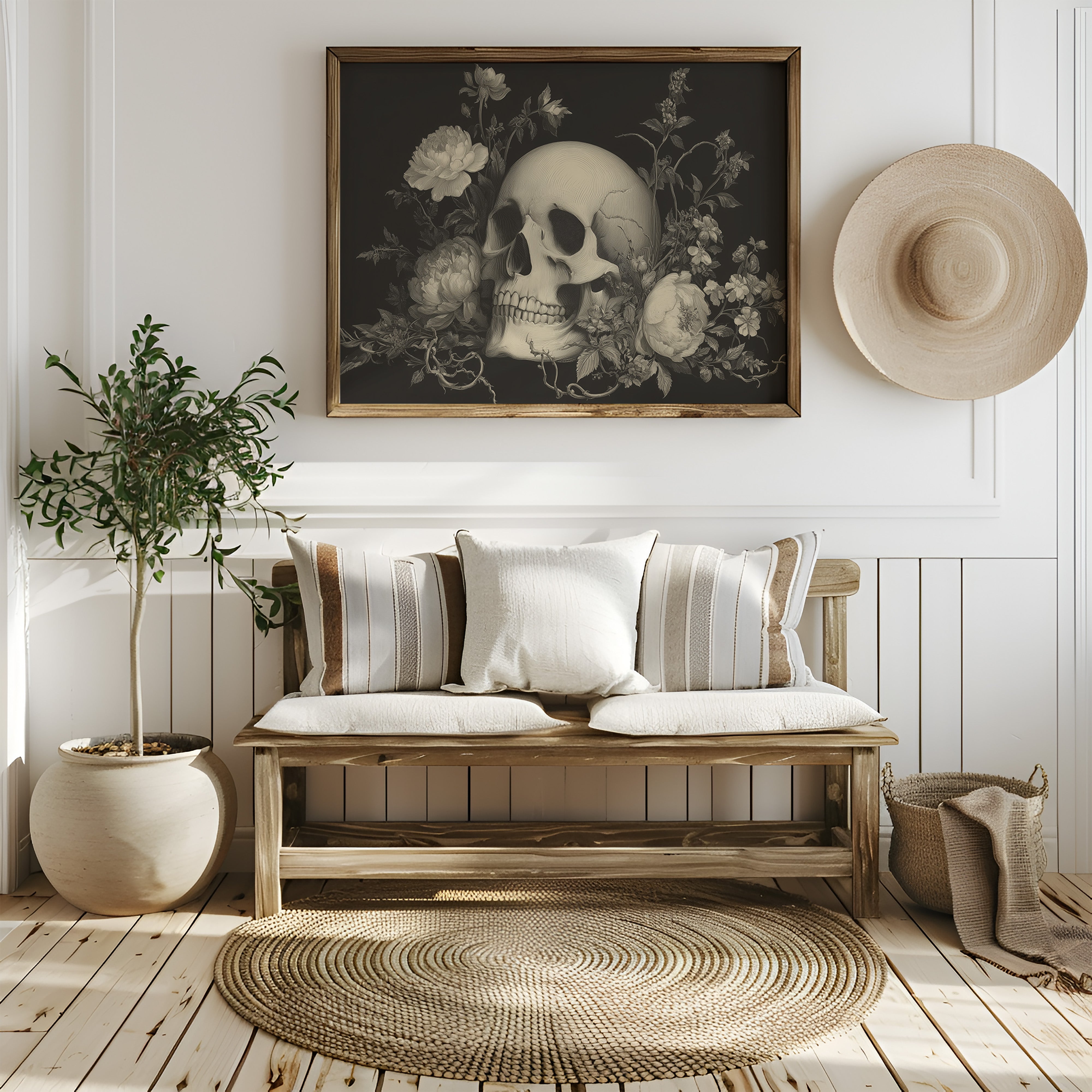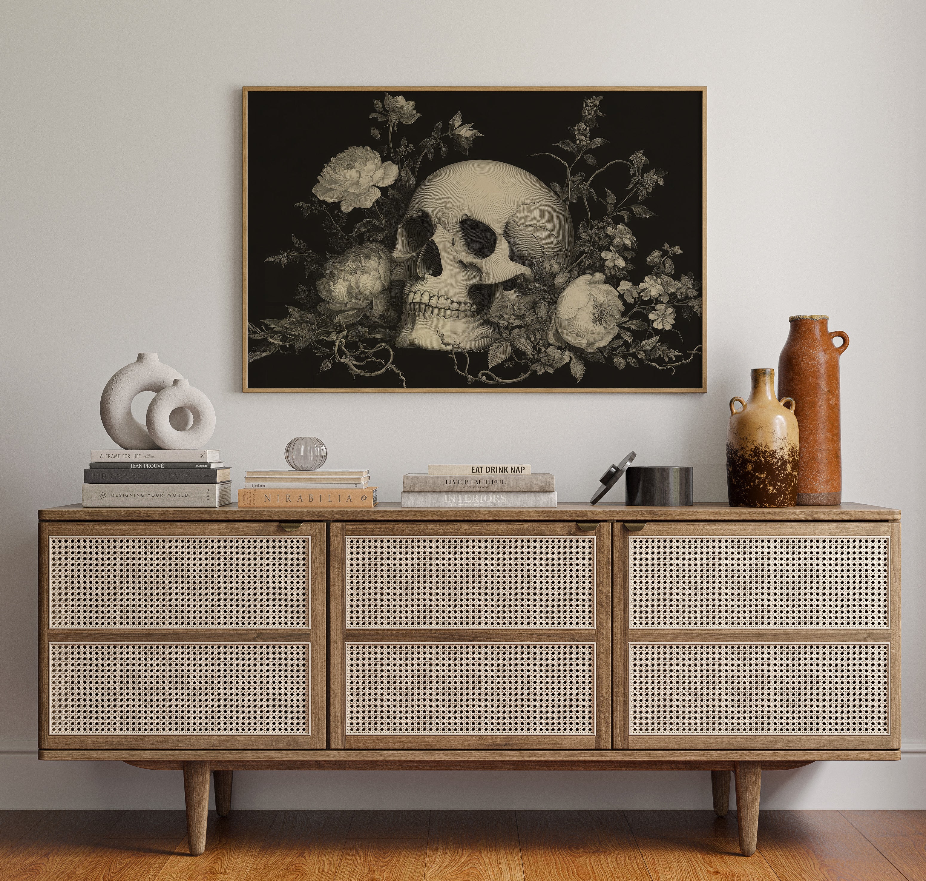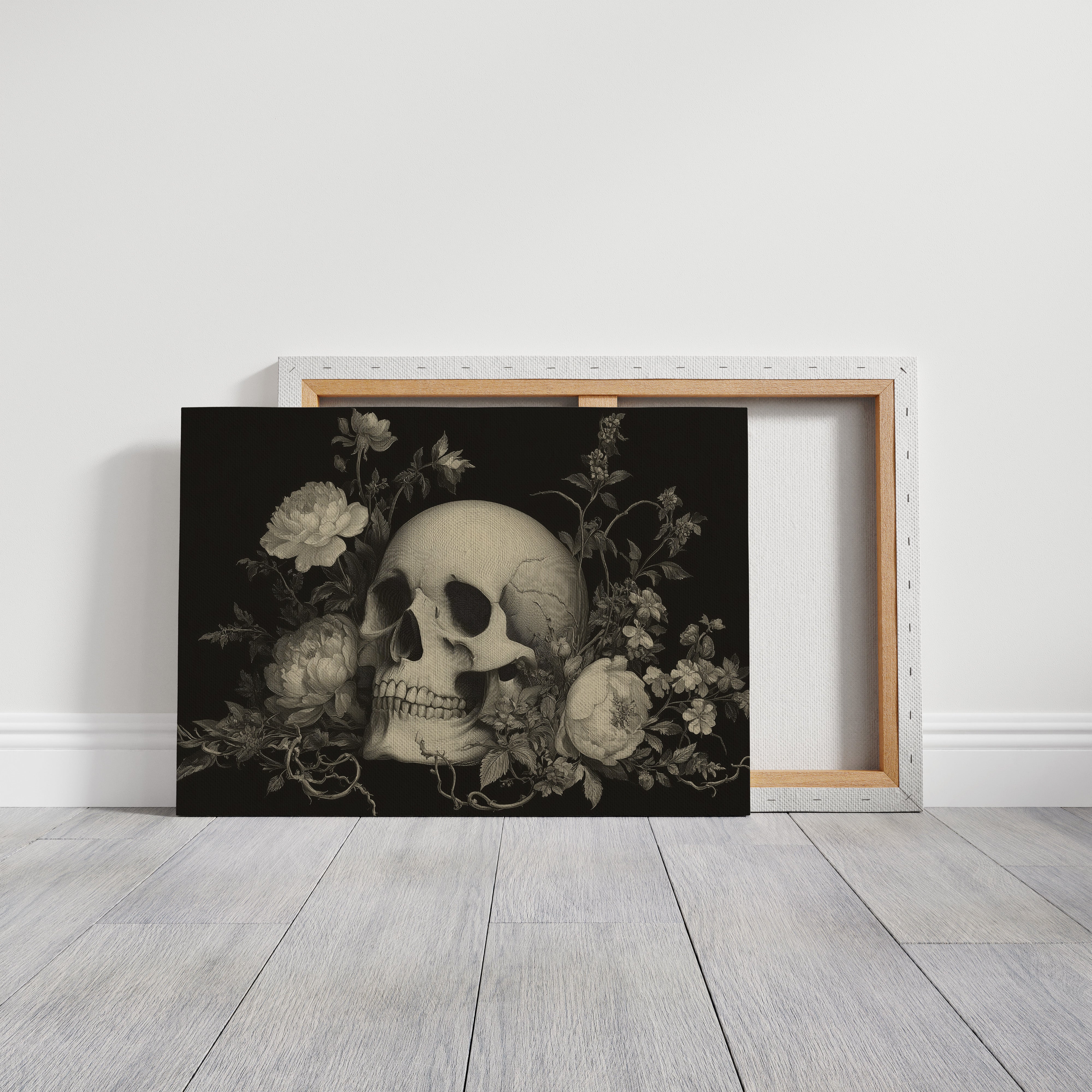 Delicate white petals unfold against velvet darkness, their gentle beauty a stark contrast to mortality's stark presence. This piece exemplifies the modern revival of classical vanitas artistry. Intricate line work traces each petal and bone, creating a haunting dance between life and death as lush peonies and wildflowers embrace a beautifully rendered skull. The monochromatic palette heightens the dramatic interplay of light and shadow, while flowing botanical elements soften the composition's memento mori theme. Perfect for creating a sophisticated focal point in a study, dining room, or dramatic entryway. The piece invites contemplation while maintaining an elegant, contemporary edge.