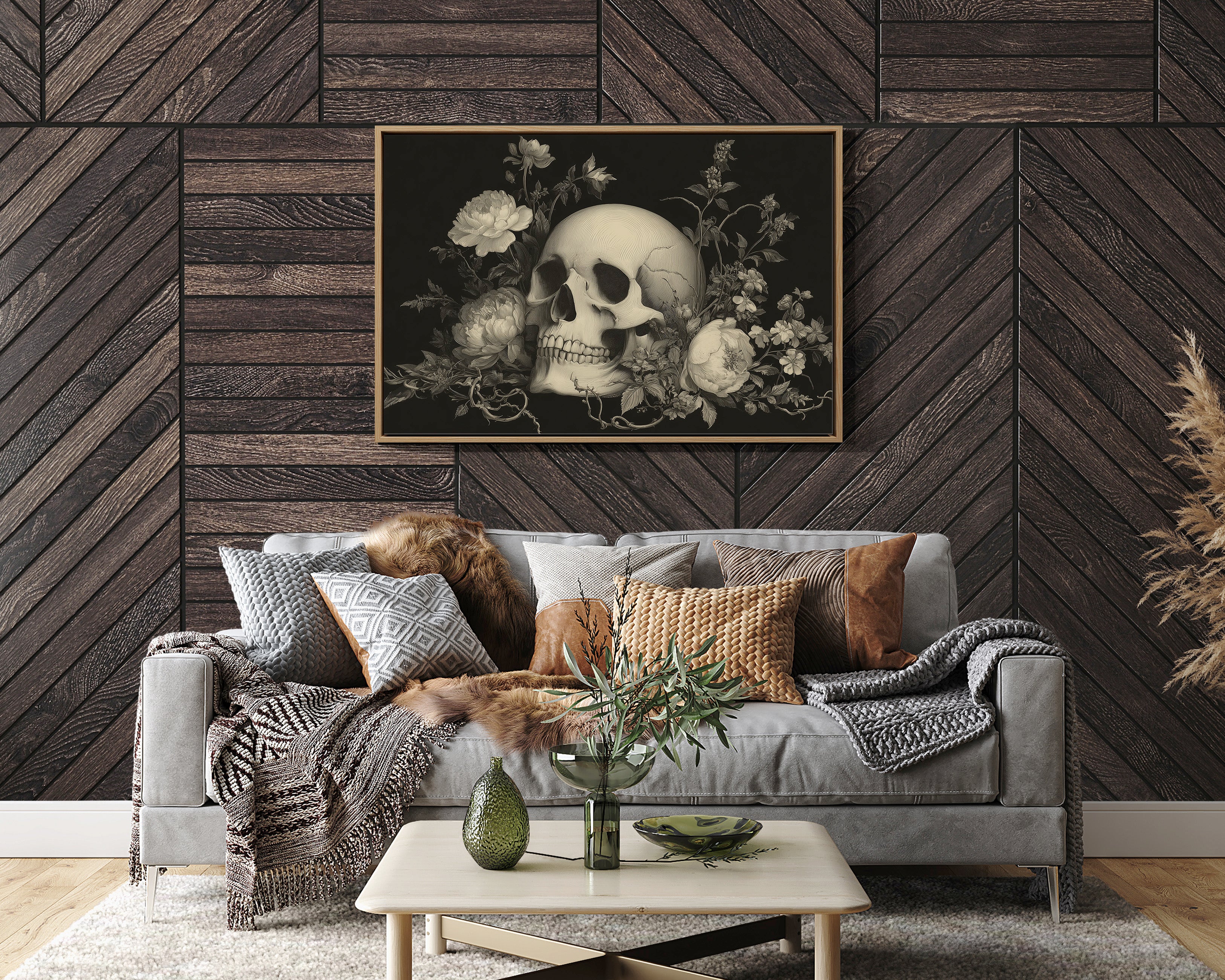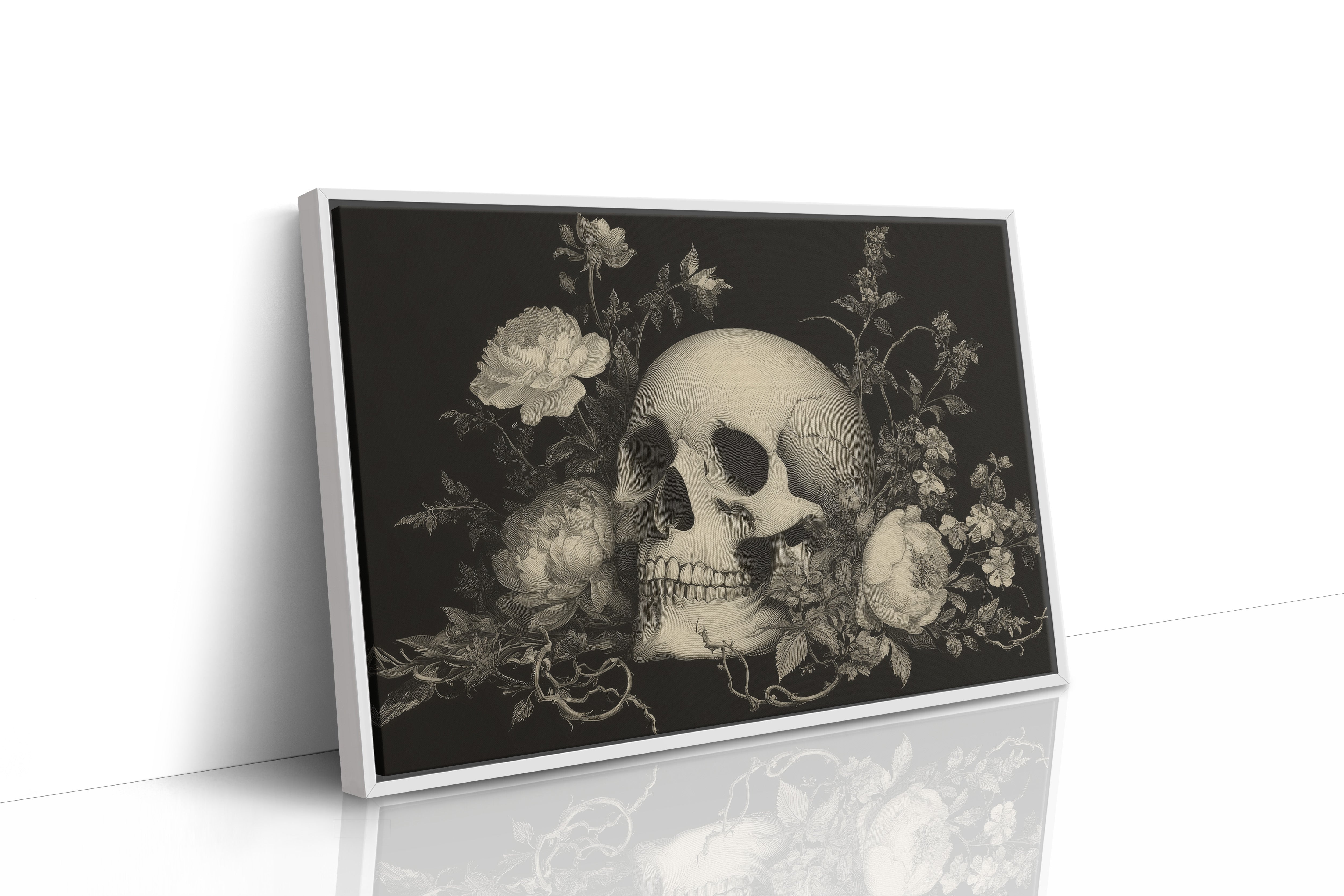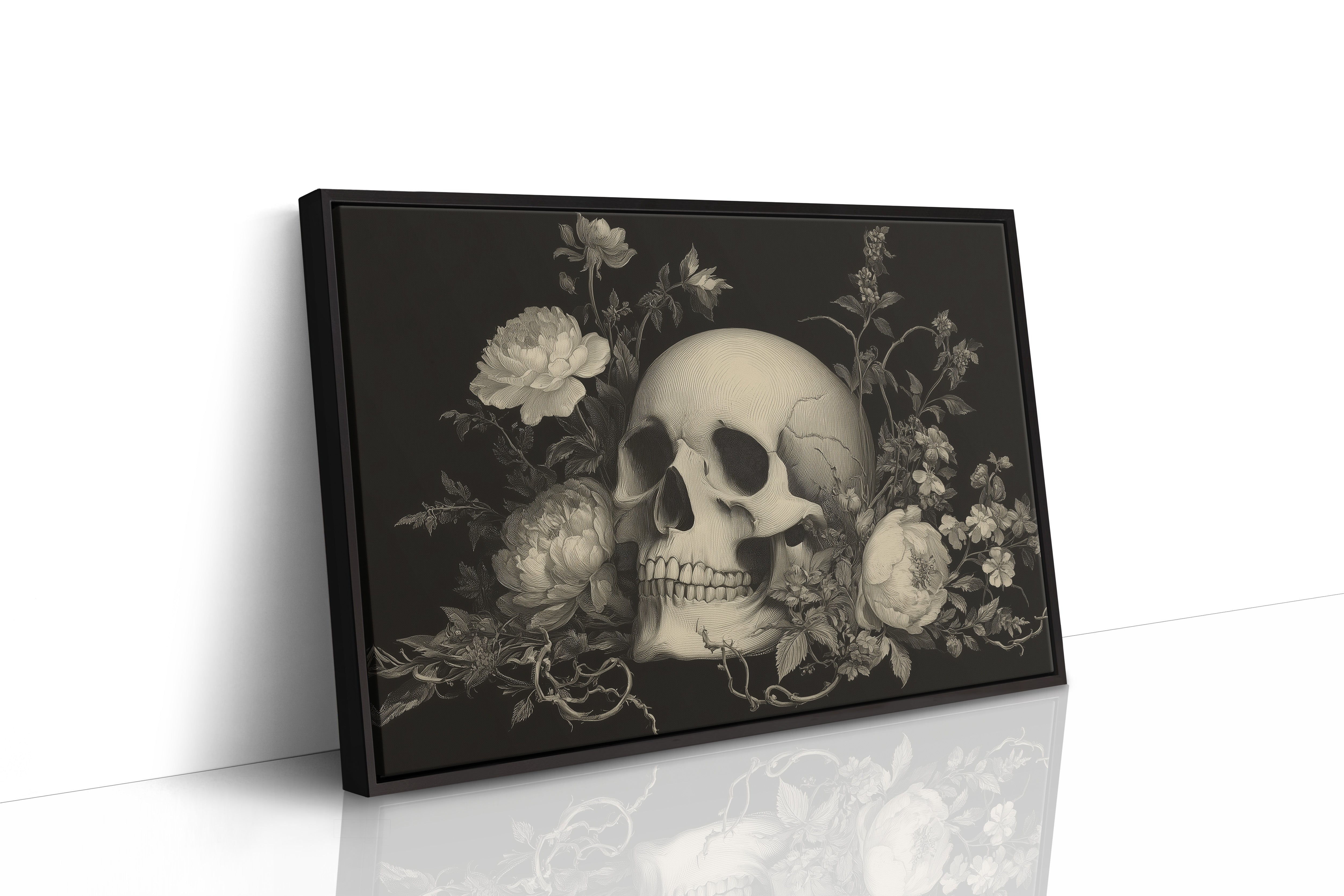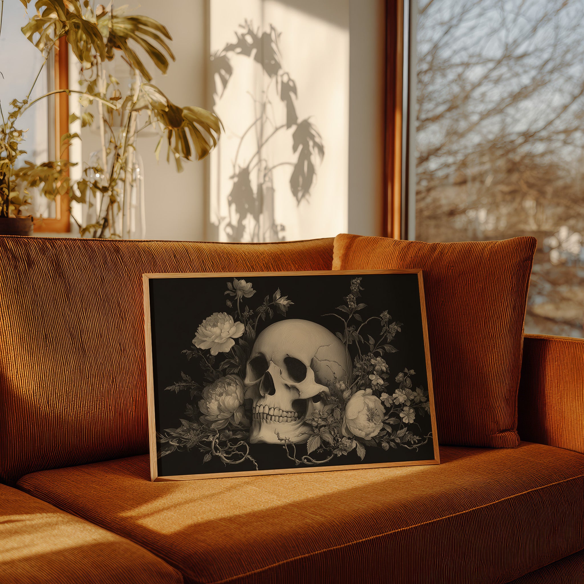Delicate white petals unfold against velvet darkness, their gentle beauty a stark contrast to mortality's stark presence. This piece exemplifies the modern revival of classical vanitas artistry. Intricate line work traces each petal and bone, creating a haunting dance between life and death as lush peonies and wildflowers embrace a beautifully rendered skull. The monochromatic palette heightens the dramatic interplay of light and shadow, while flowing botanical elements soften the composition's memento mori theme. Perfect for creating a sophisticated focal point in a study, dining room, or dramatic entryway. The piece invites contemplation while maintaining an elegant, contemporary edge.
