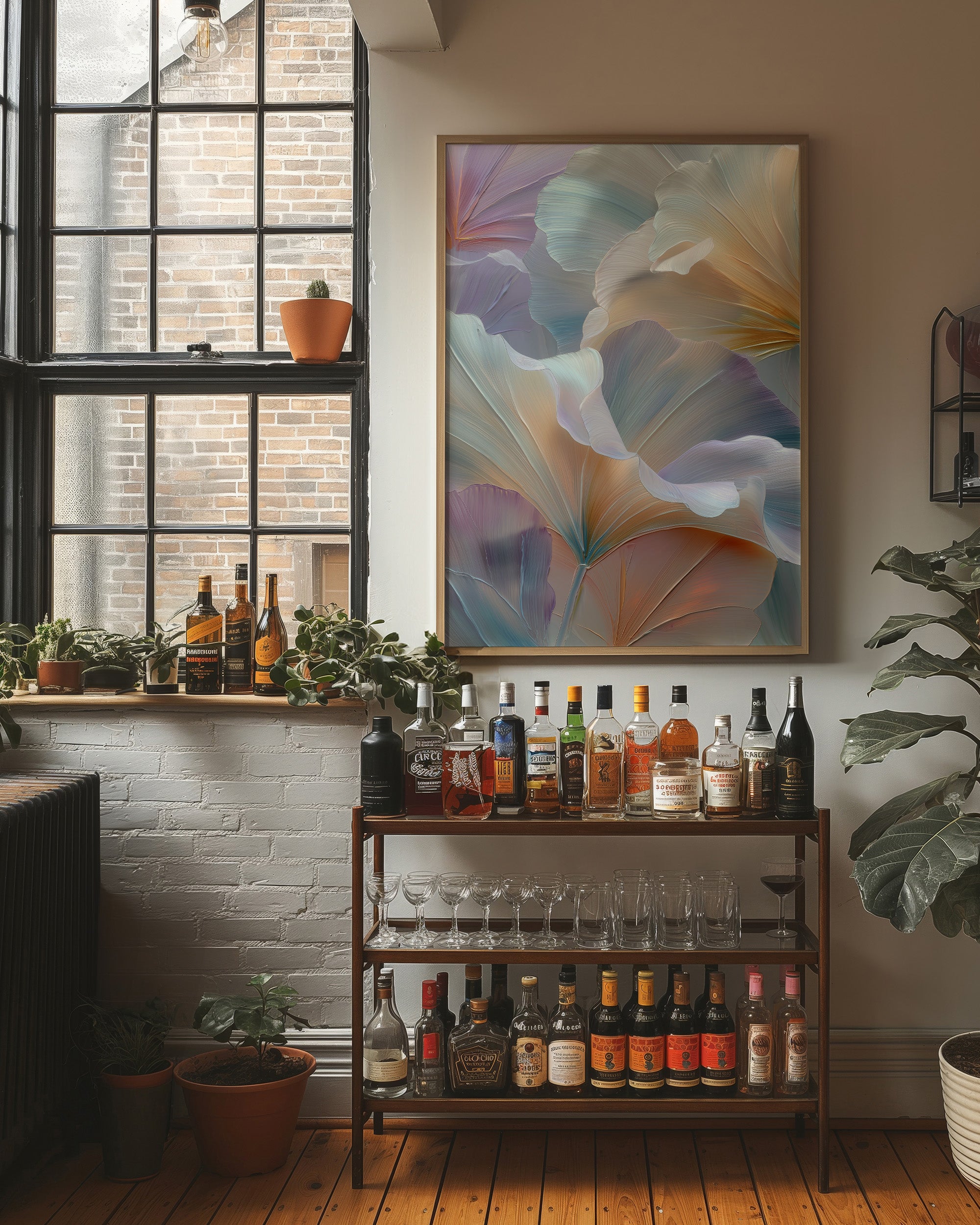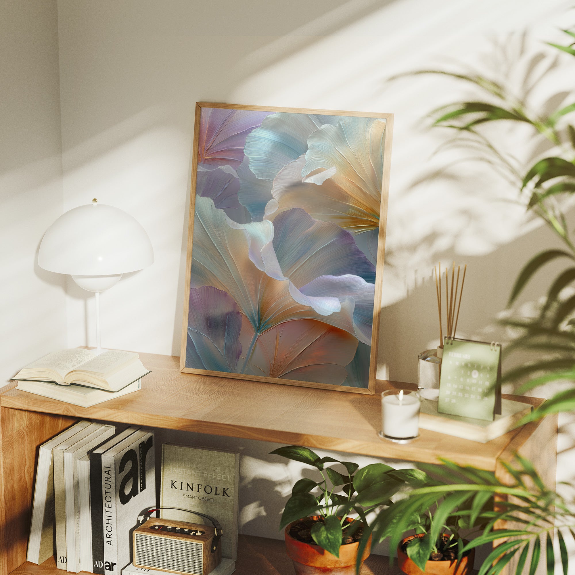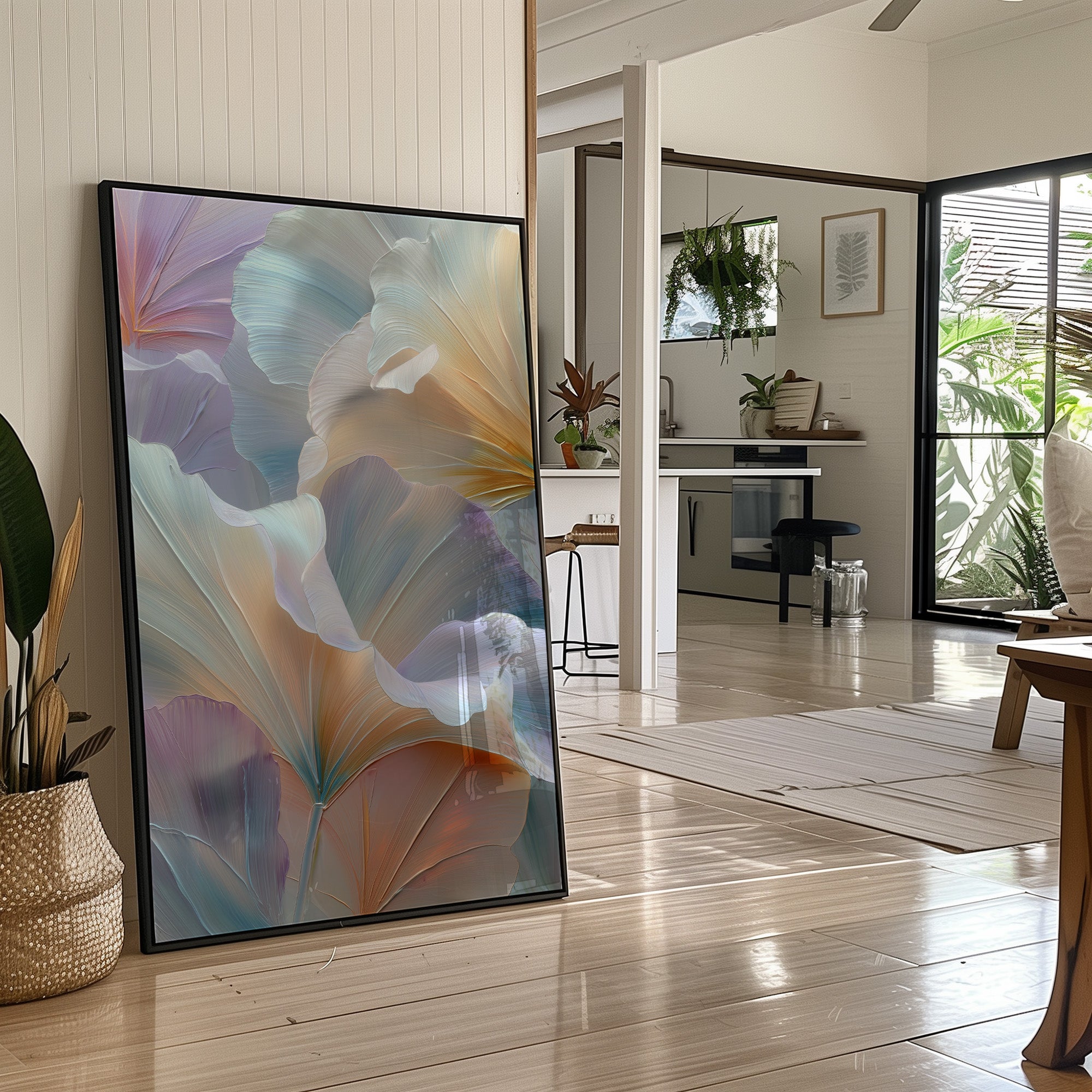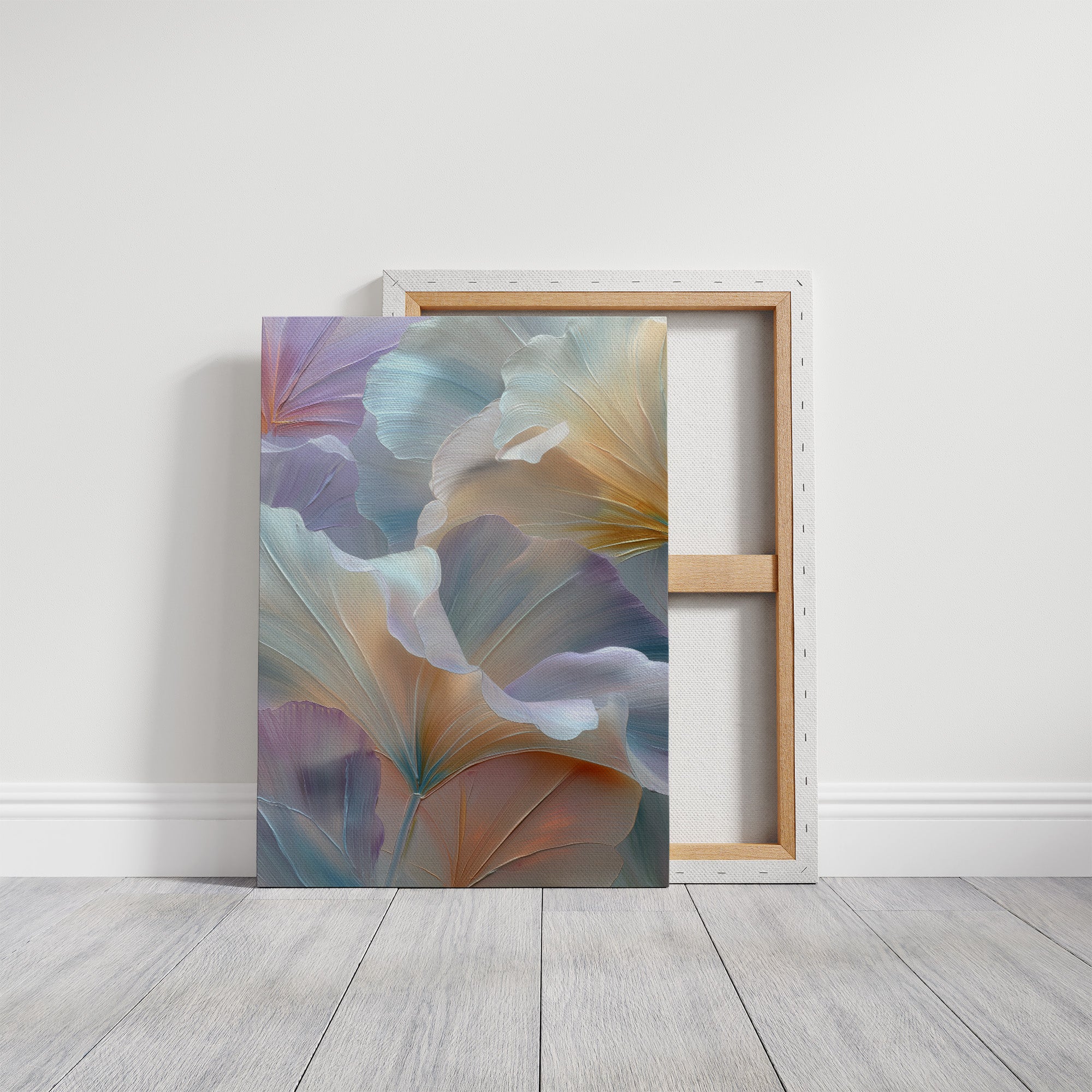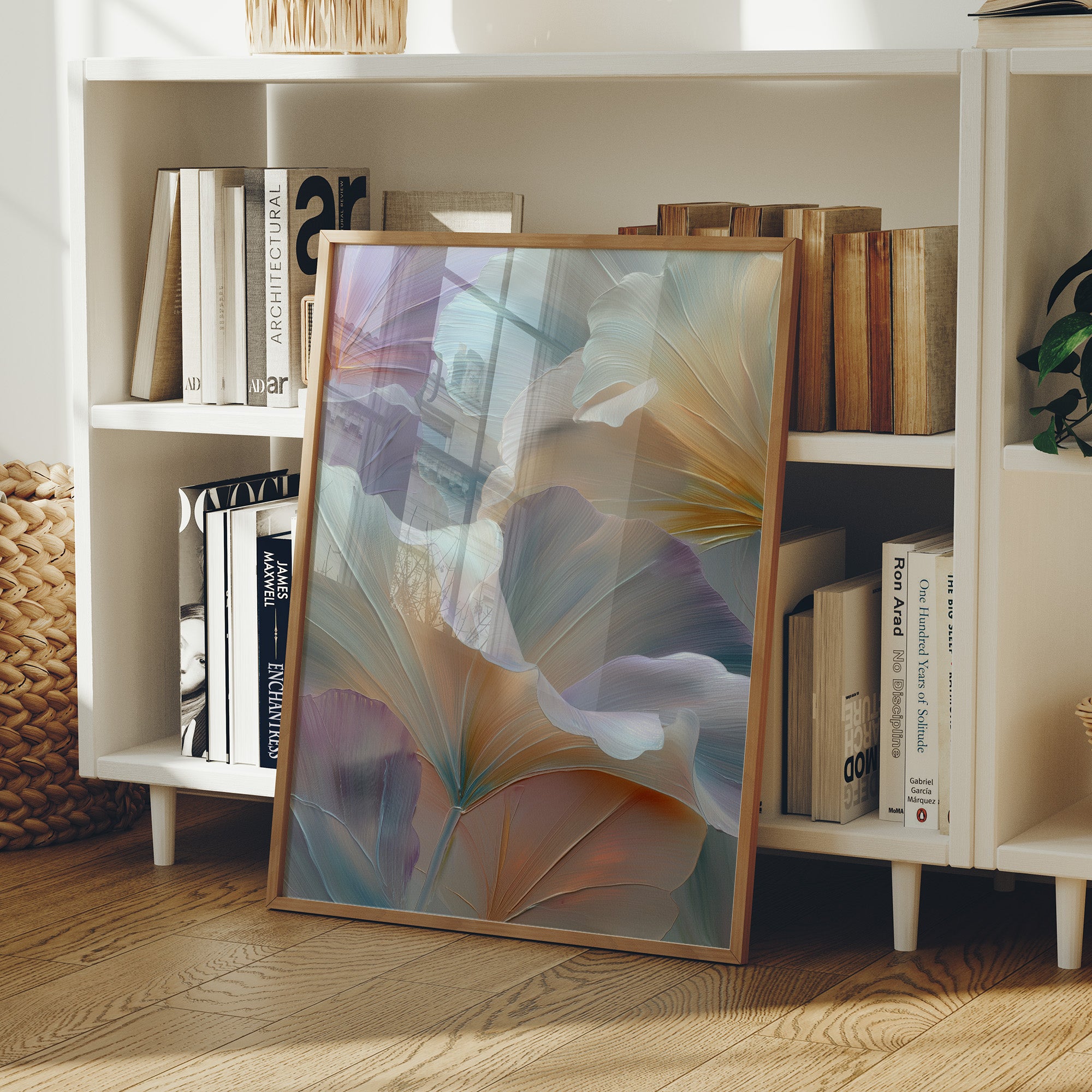 Delicate petals unfold like translucent silk caught in a gentle breeze, their edges kissed by dawn's first rays. Soft hues of turquoise, lavender, and golden amber blend together in an ethereal dance, creating a dreamlike cascade of botanical forms. The composition flows with graceful movement, each petal seemingly weightless and floating in space. This serene piece brings a sense of tranquility to any contemporary space, perfect for a meditation room or peaceful reading nook where natural light can enhance its ethereal quality.