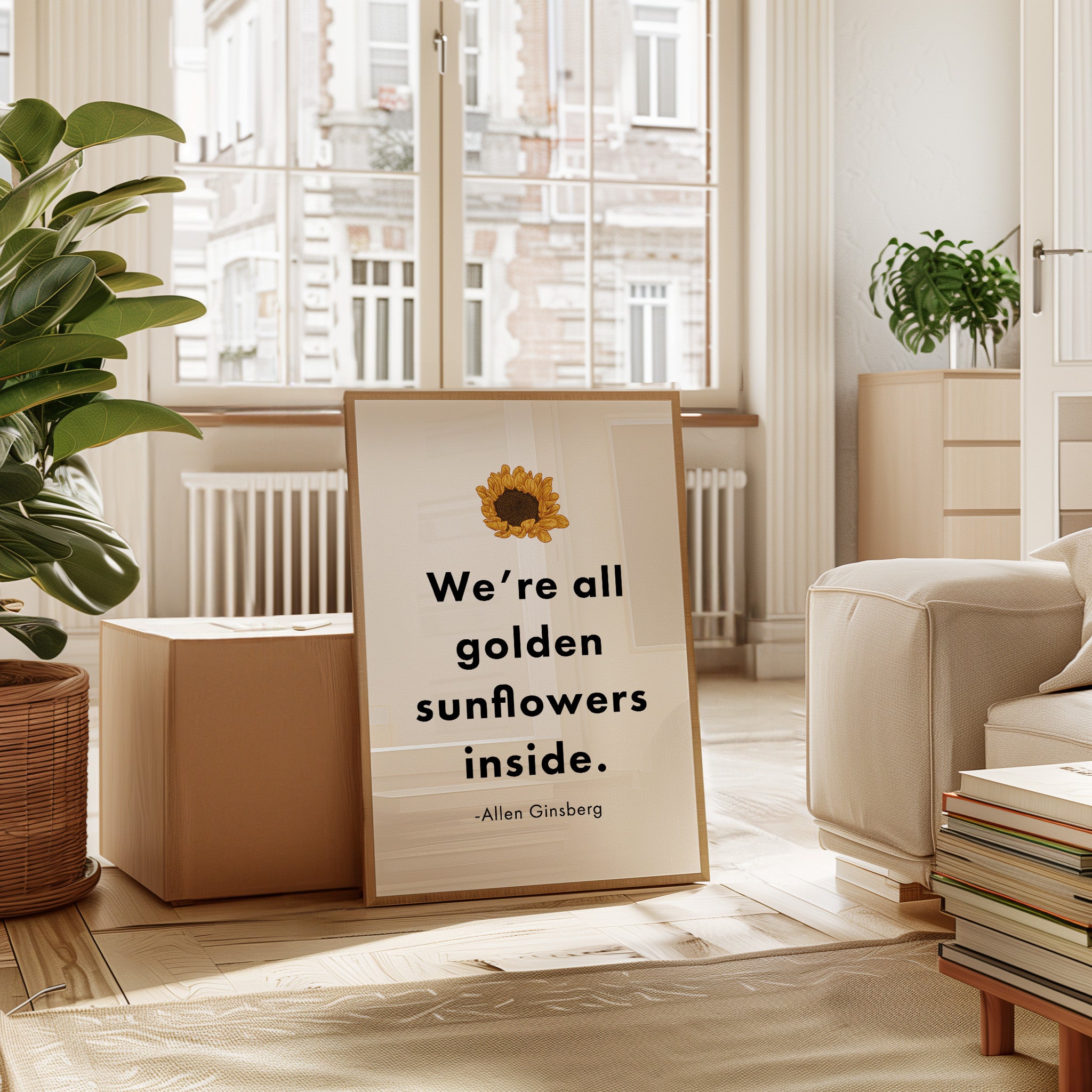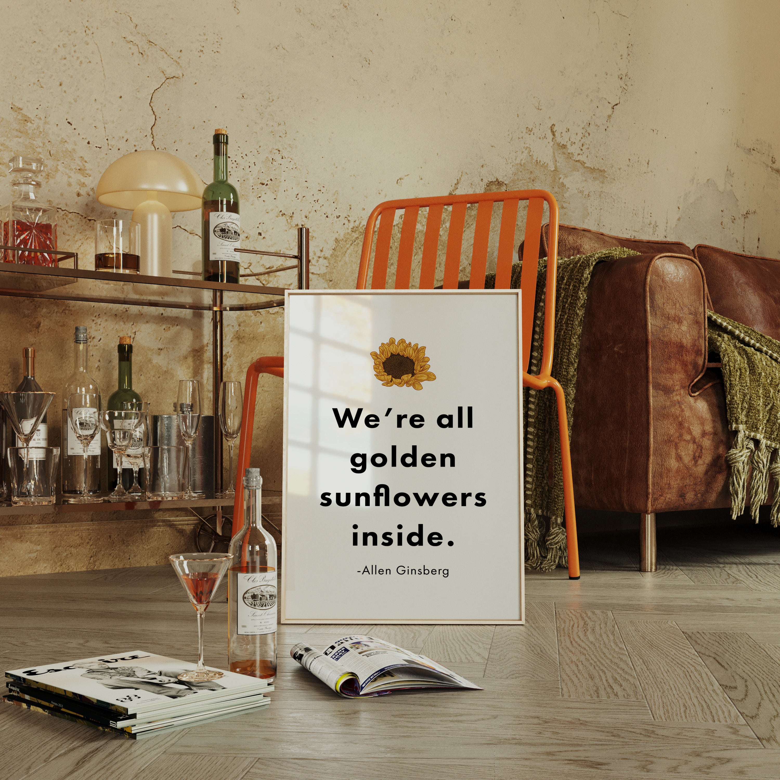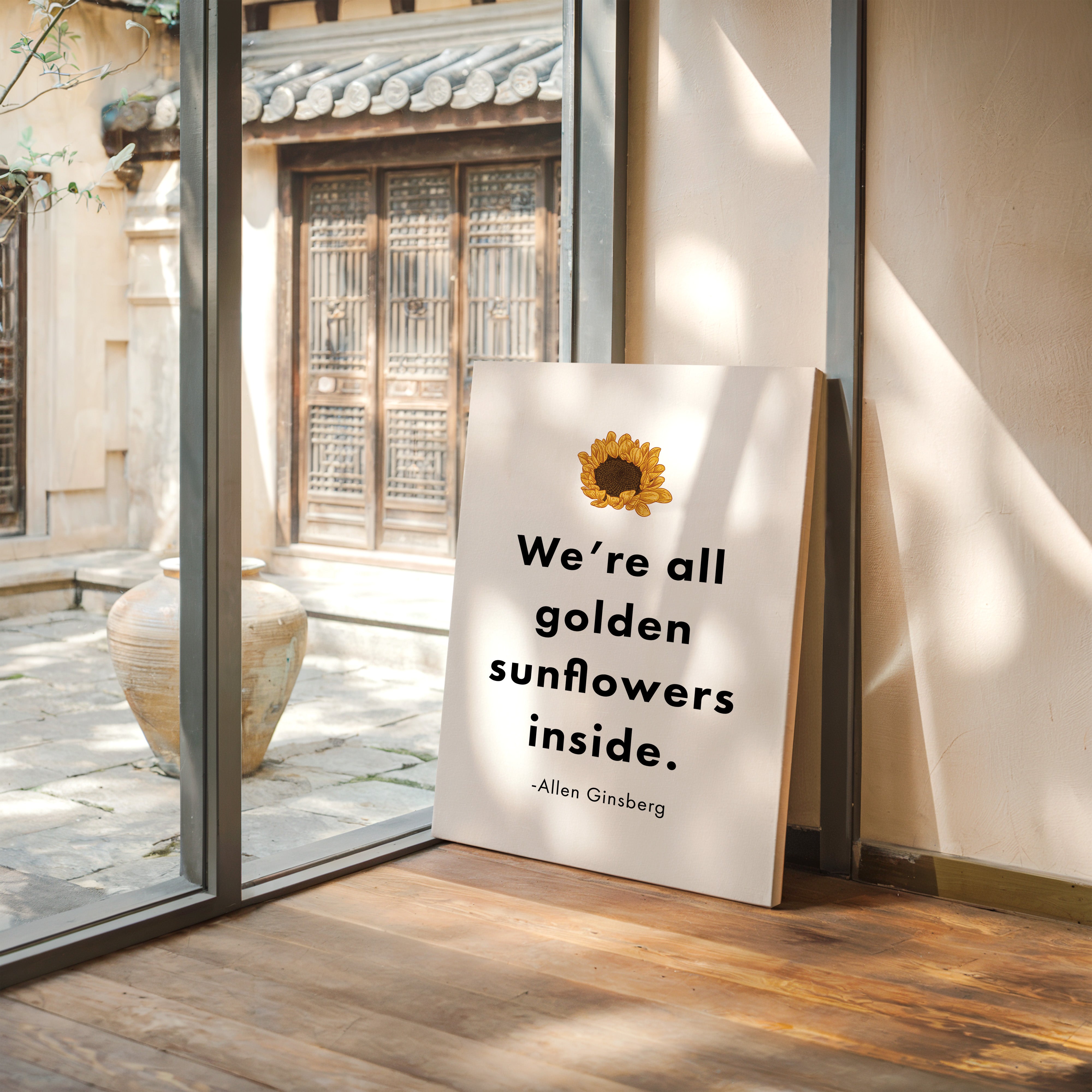 A single sunflower blooms against pristine white, its golden petals radiating warmth like rays of captured sunshine. From our Botanical Typography collection, this piece marries natural beauty with poetic wisdom. The delicate illustration of the sunflower crowns Ginsberg's words, creating a powerful dialogue between nature's simple grace and human introspection. The rich ochre tones of the flower contrast beautifully with the minimalist black text, each petal seemingly hand-drawn with careful attention to detail. Perfect for a reading nook, creative workspace, or anywhere you seek daily inspiration. This piece reminds us that beauty resides both in nature and within ourselves.