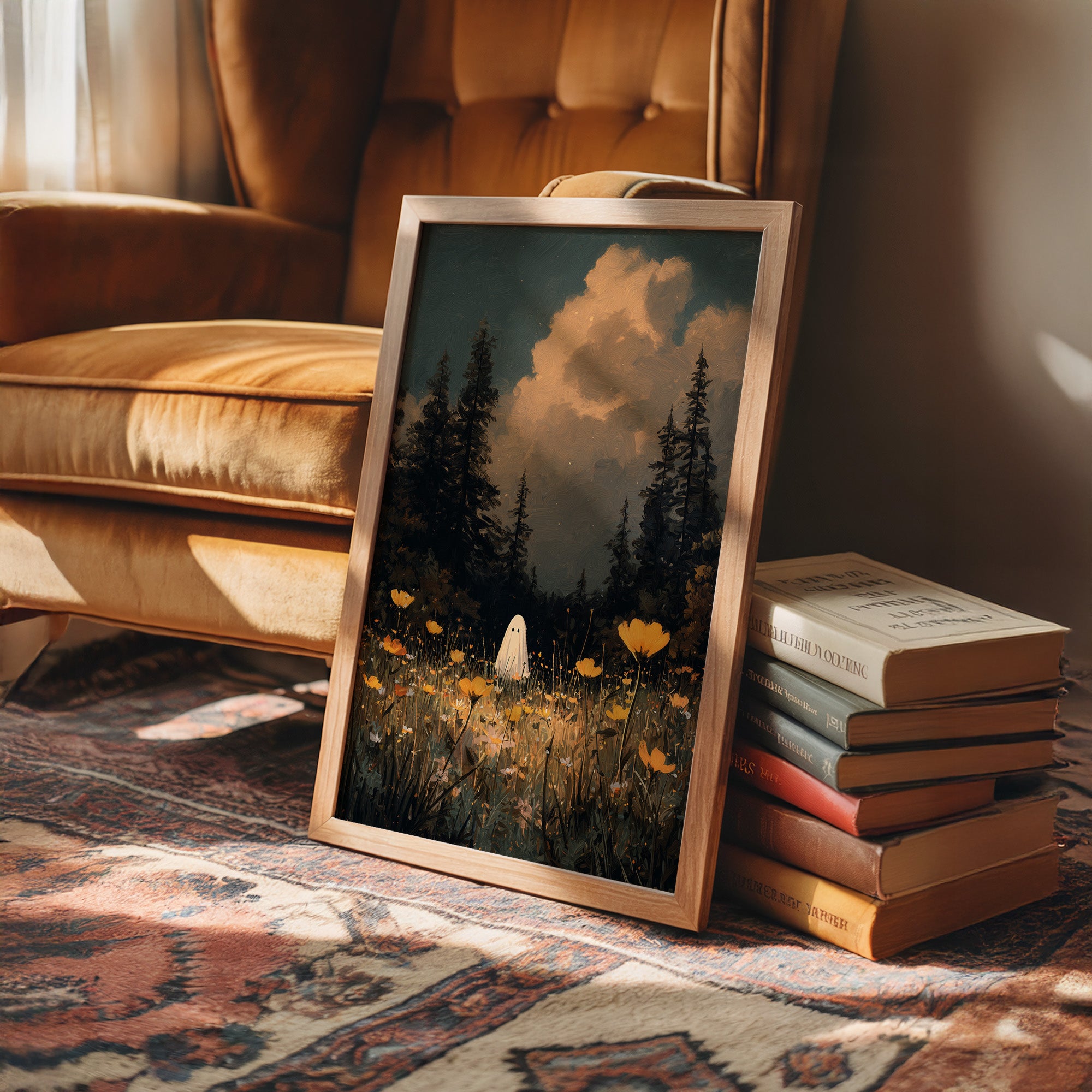 A solitary ghost figure stands tranquil in a field of golden wildflowers, caught between worlds yet perfectly at home. Towering evergreens frame the scene while dramatic clouds billow above, their warm hues suggesting either dawn's first light or dusk's final glow. The contrast between the ethereal white apparition and the vibrant poppy-like blooms creates a hauntingly beautiful narrative of belonging in unexpected places.