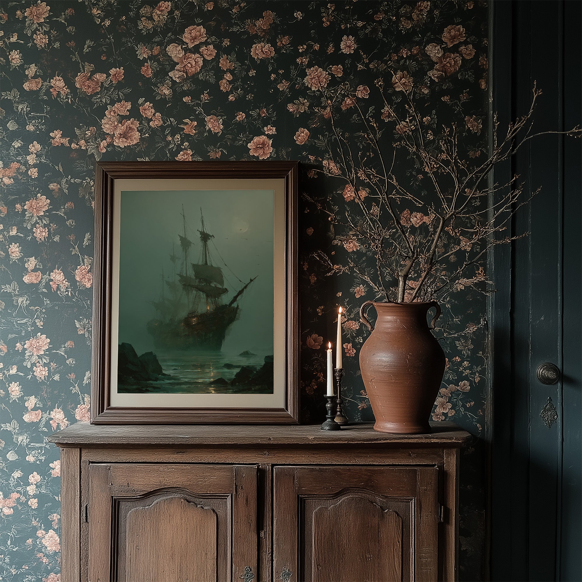 A ghostly sailing ship emerges from the fog, caught between reality and dream. The seafaring vessel hovers in an ethereal mist, its masts reaching toward a pale moon while faint lights glow from within its weathered hull. The moody teal-green palette creates a haunting seascape where time seems suspended, the rocky shoreline barely visible beneath swirling vapor and reflected moonlight. This atmospheric piece brings maritime mystery to sophisticated interiors, perfect for adding depth and narrative to a study, dining room, or any space that welcomes contemplative conversation.