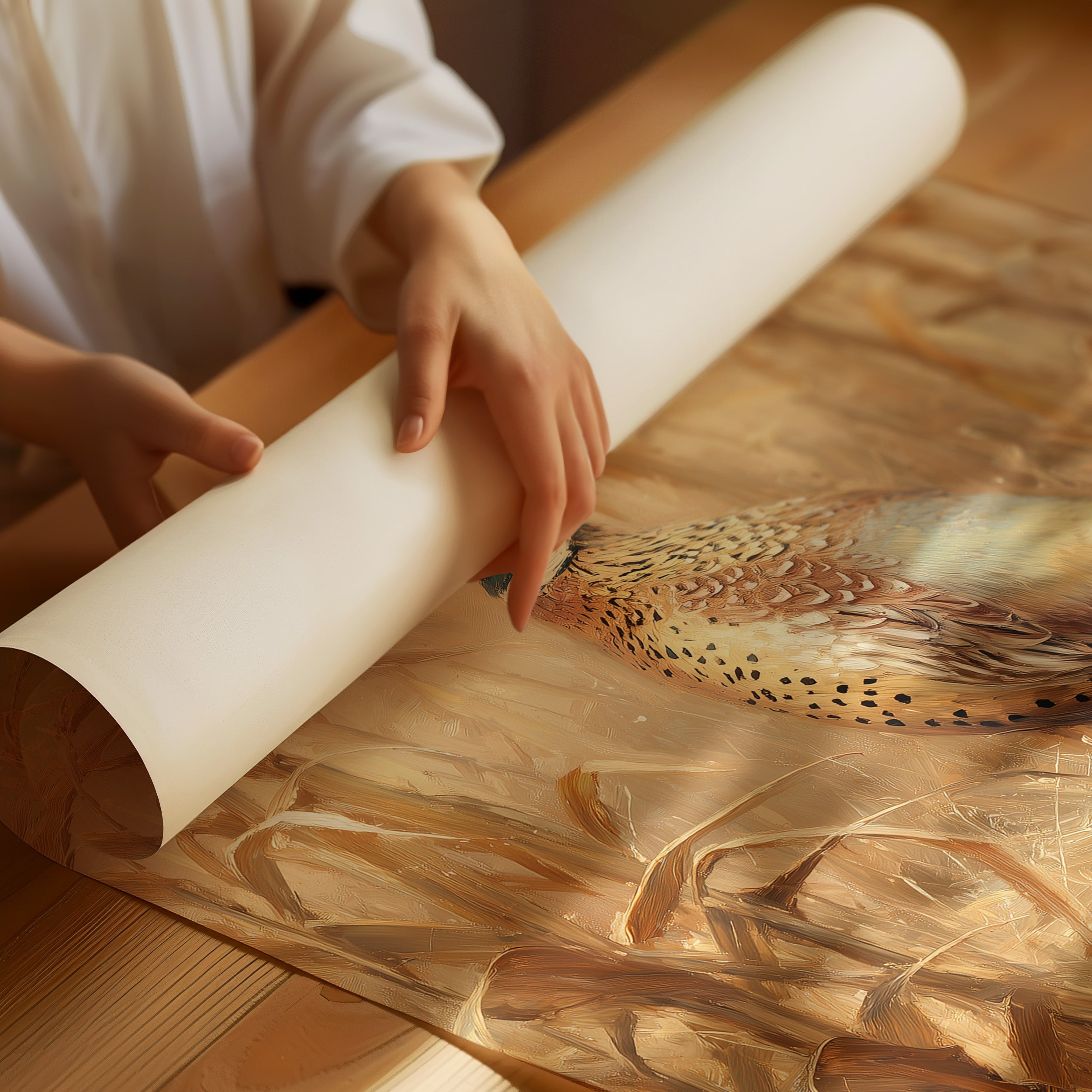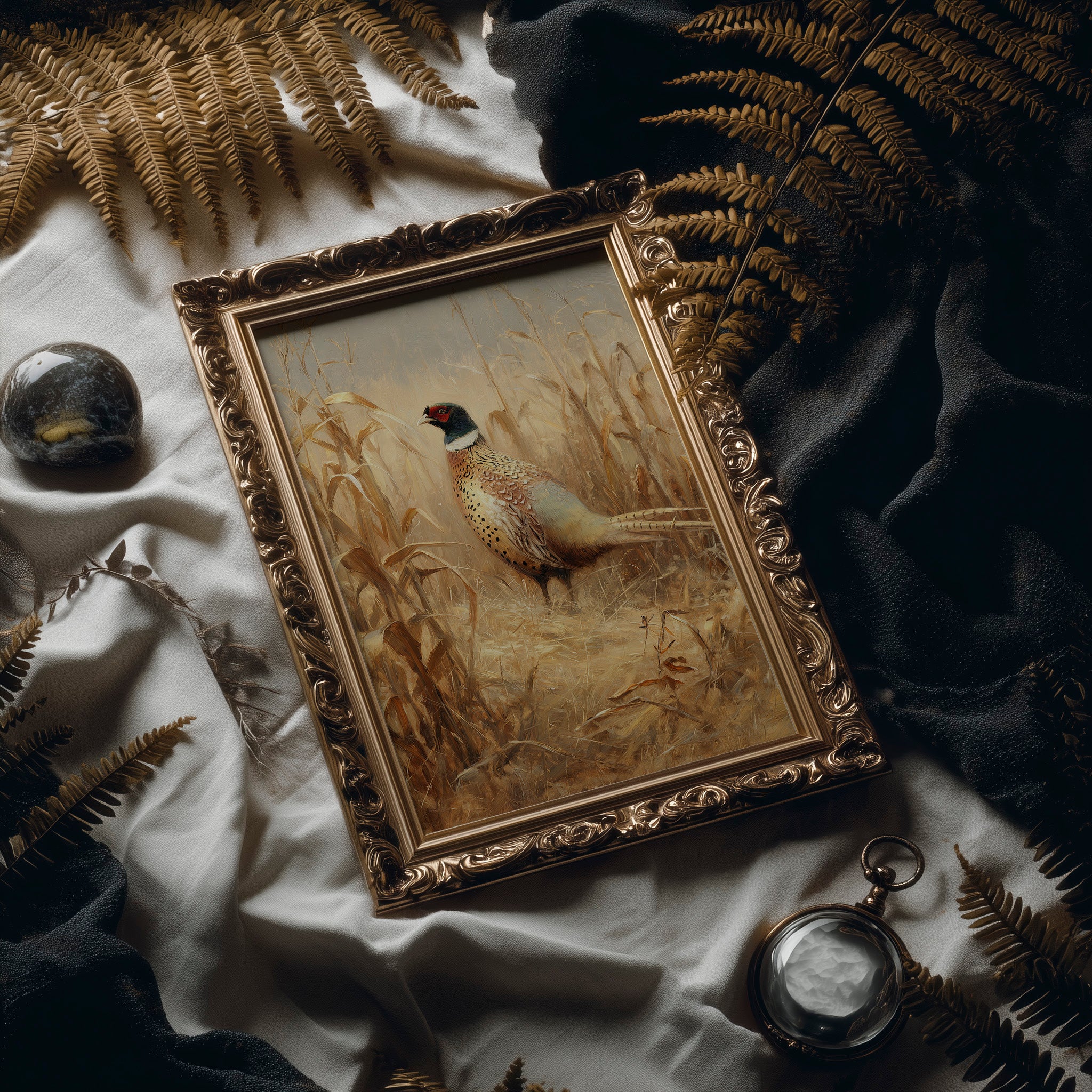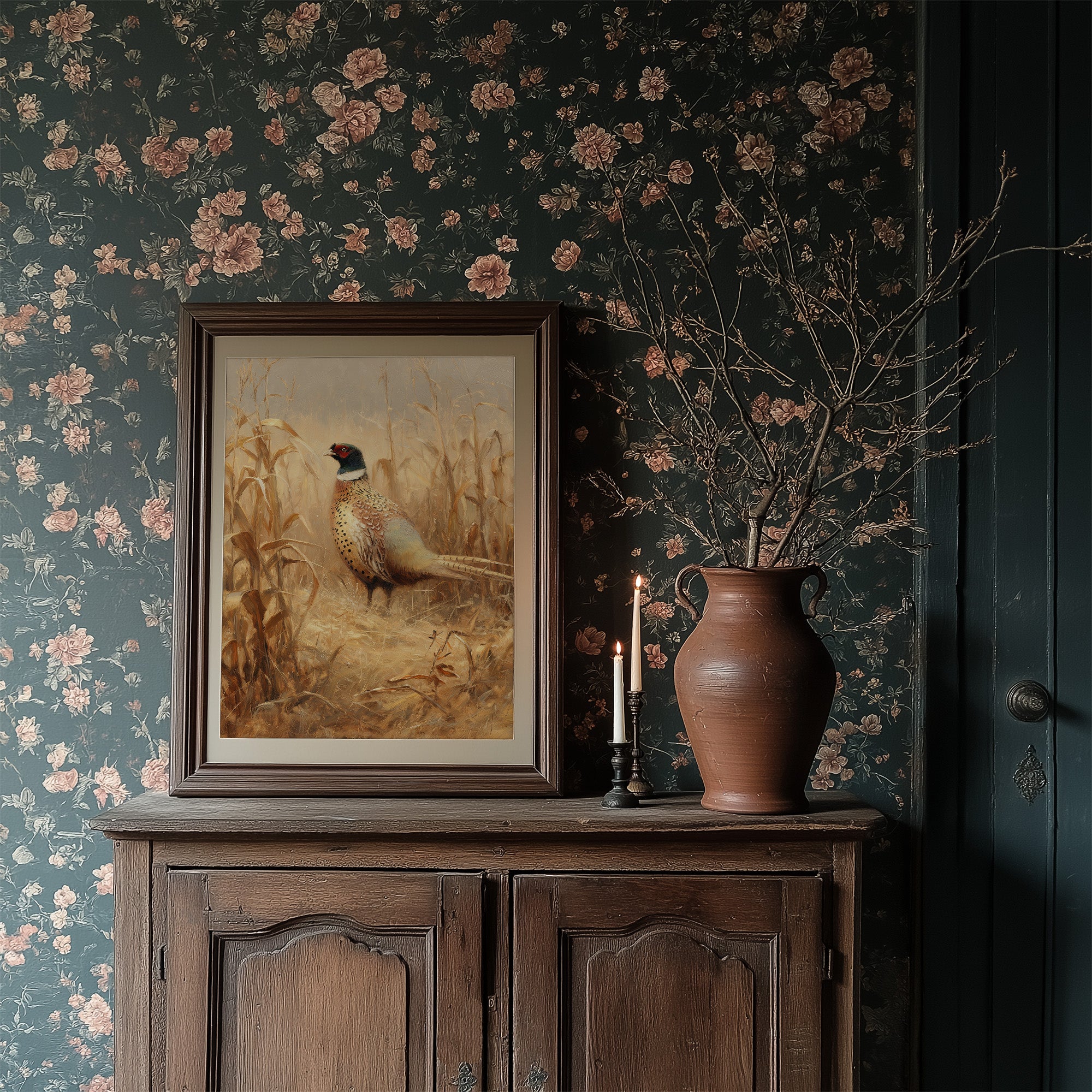 A moment of perfect stillness captured in amber light. The proud pheasant pauses among dried cornstalks, its speckled plumage catching the warm glow of autumn. Rich earth tones blend harmoniously as the bird's distinctive red face and white collar create a striking focal point against the sea of golden grasses. This elegant portrait brings the quiet dignity of rural wildlife into contemporary spaces.