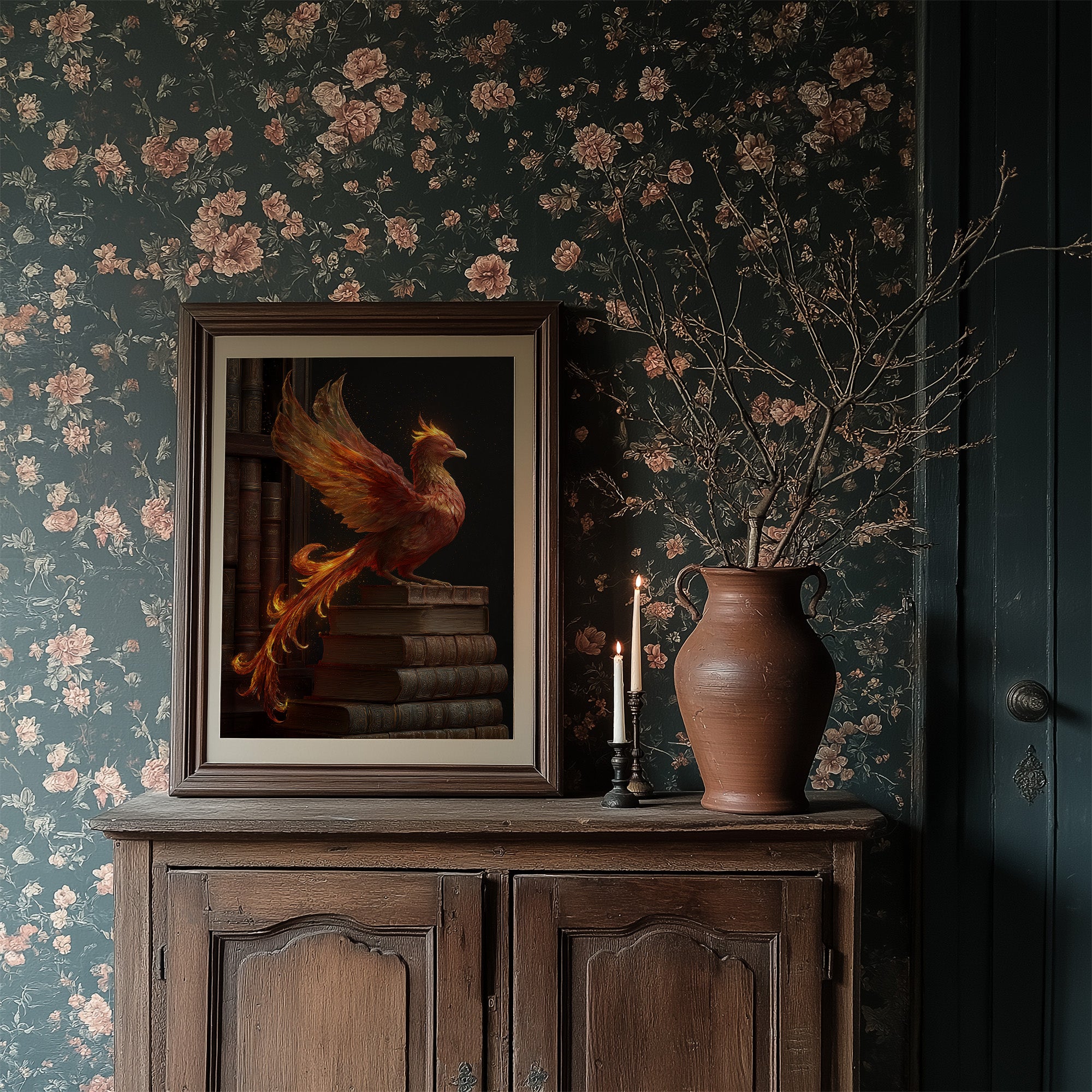 Flames dance across feathers as this mythical creature pauses between worlds, caught in a moment of quiet dignity. The phoenix's fiery plumage radiates against the darkness, its amber and crimson hues creating a living light source against the stack of leather-bound tomes. Each brushstroke captures both the bird's ethereal nature and its powerful presence, balanced perfectly between fantasy and the scholarly realm it inhabits.