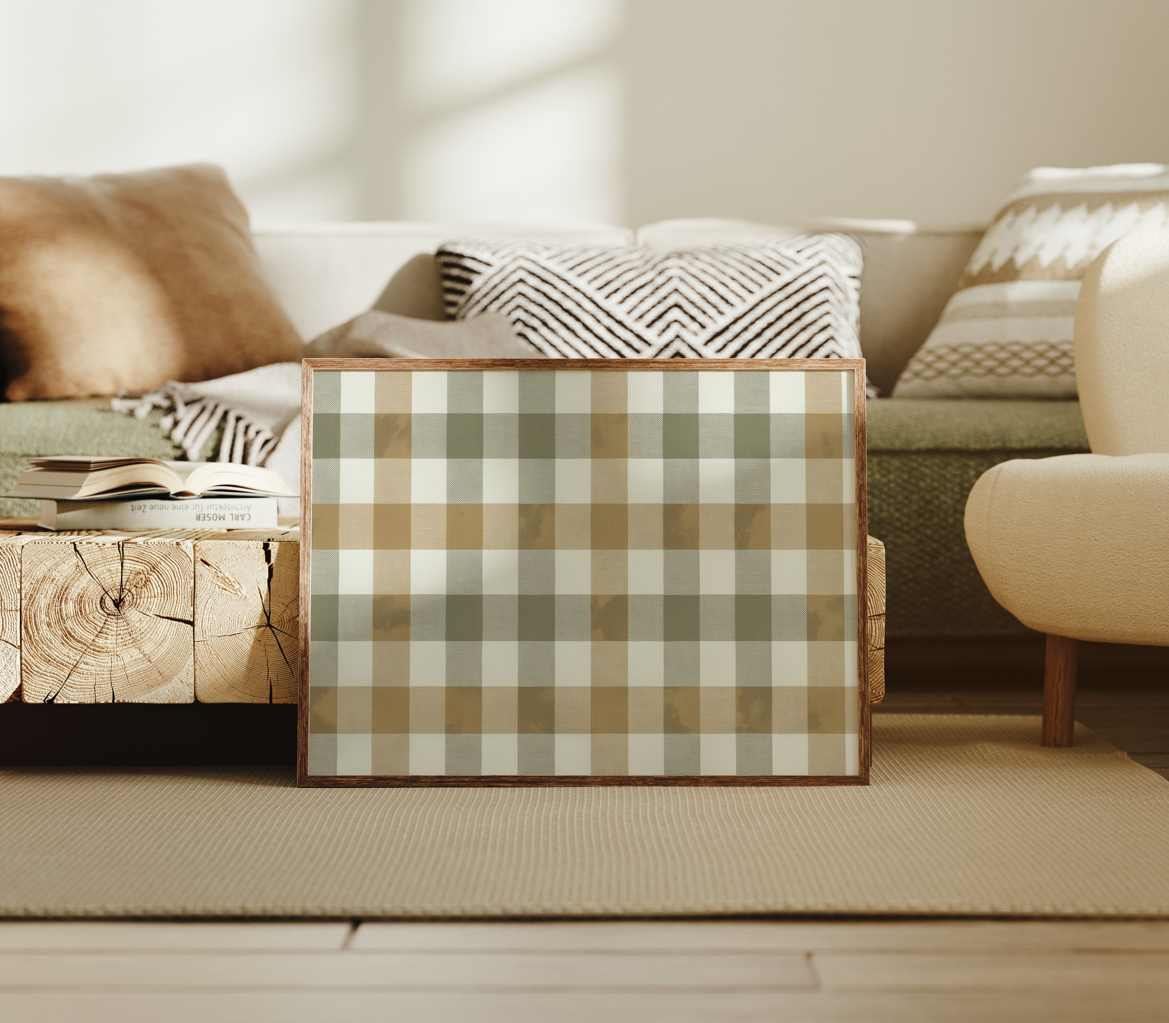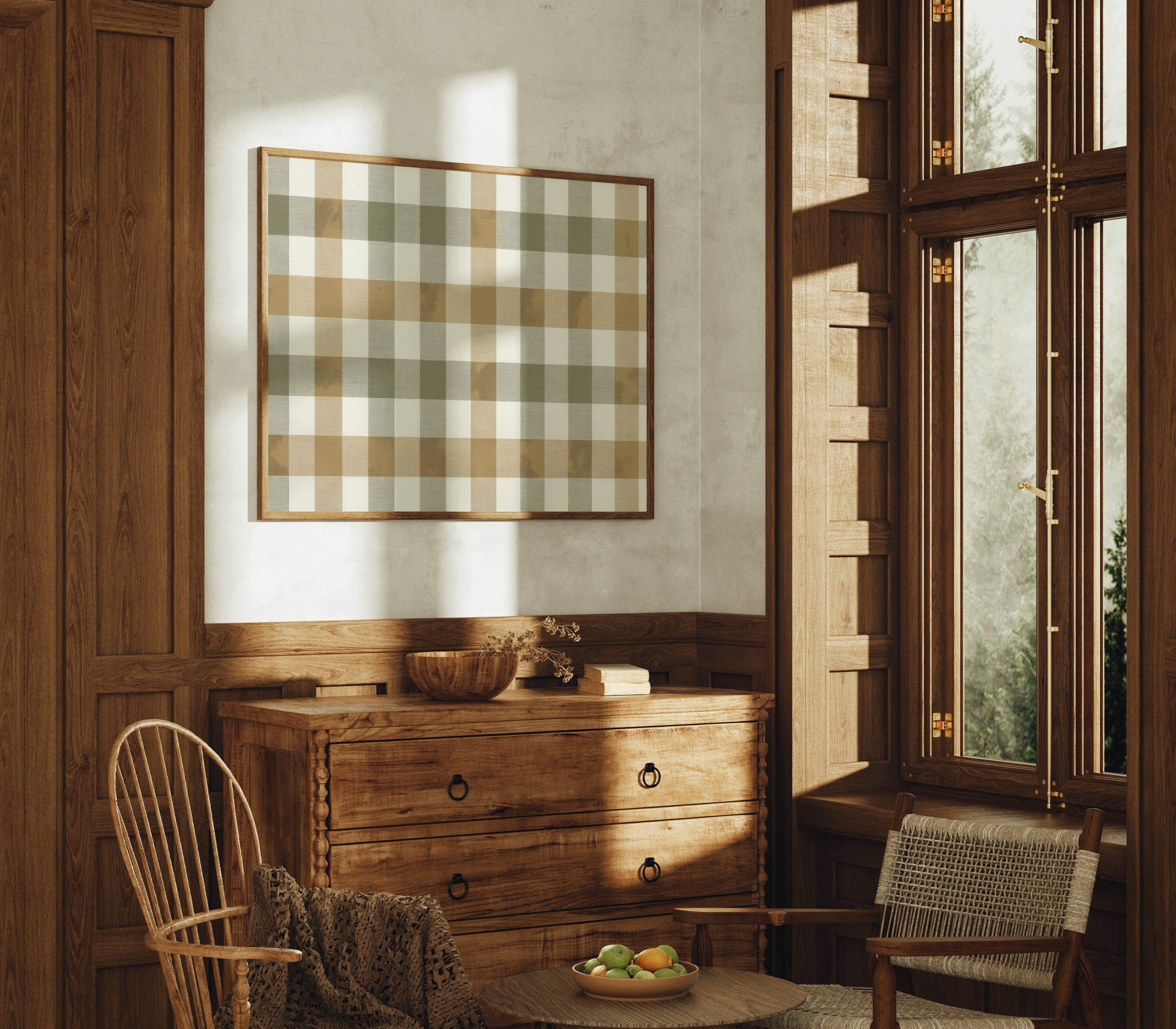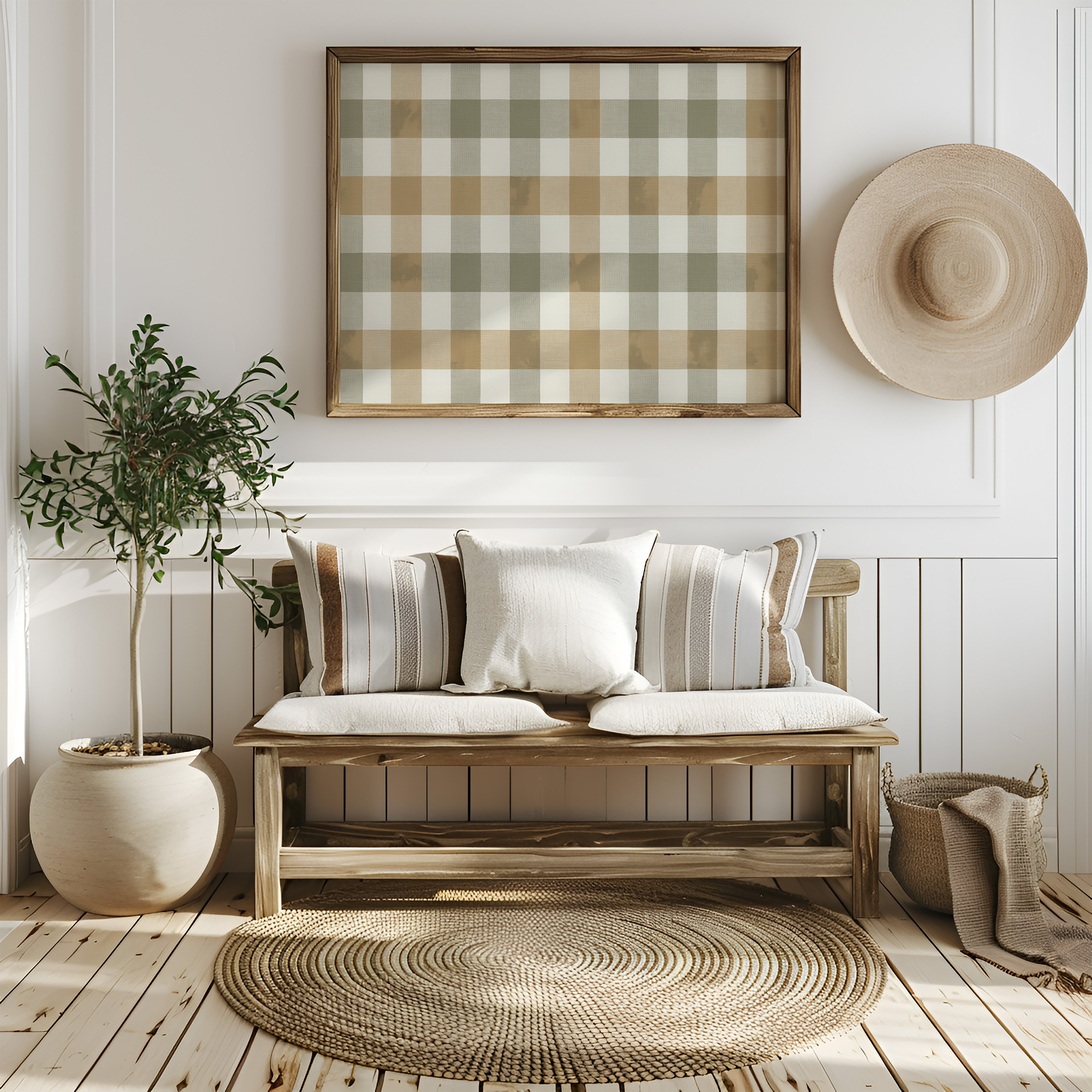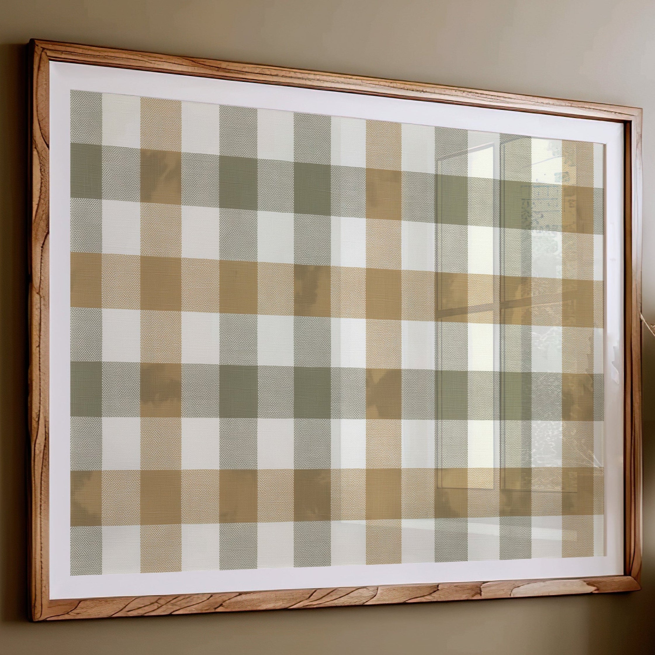 Sunlight dances across woven squares of earthy comfort, creating a gentle rhythm of sage green, warm tan, and crisp white. This contemporary take on classic gingham brings farmhouse charm into modern spaces. The pattern speaks of lazy afternoon picnics and countryside comfort, where each intersecting line tells a story of traditional design meeting fresh sophistication. The soft, muted palette creates a sense of timeless tranquility, perfect for spaces seeking both warmth and elegance. This piece brings pastoral poetry to dining rooms, breakfast nooks, or country-inspired living spaces, offering a touch of nostalgic comfort with contemporary appeal.