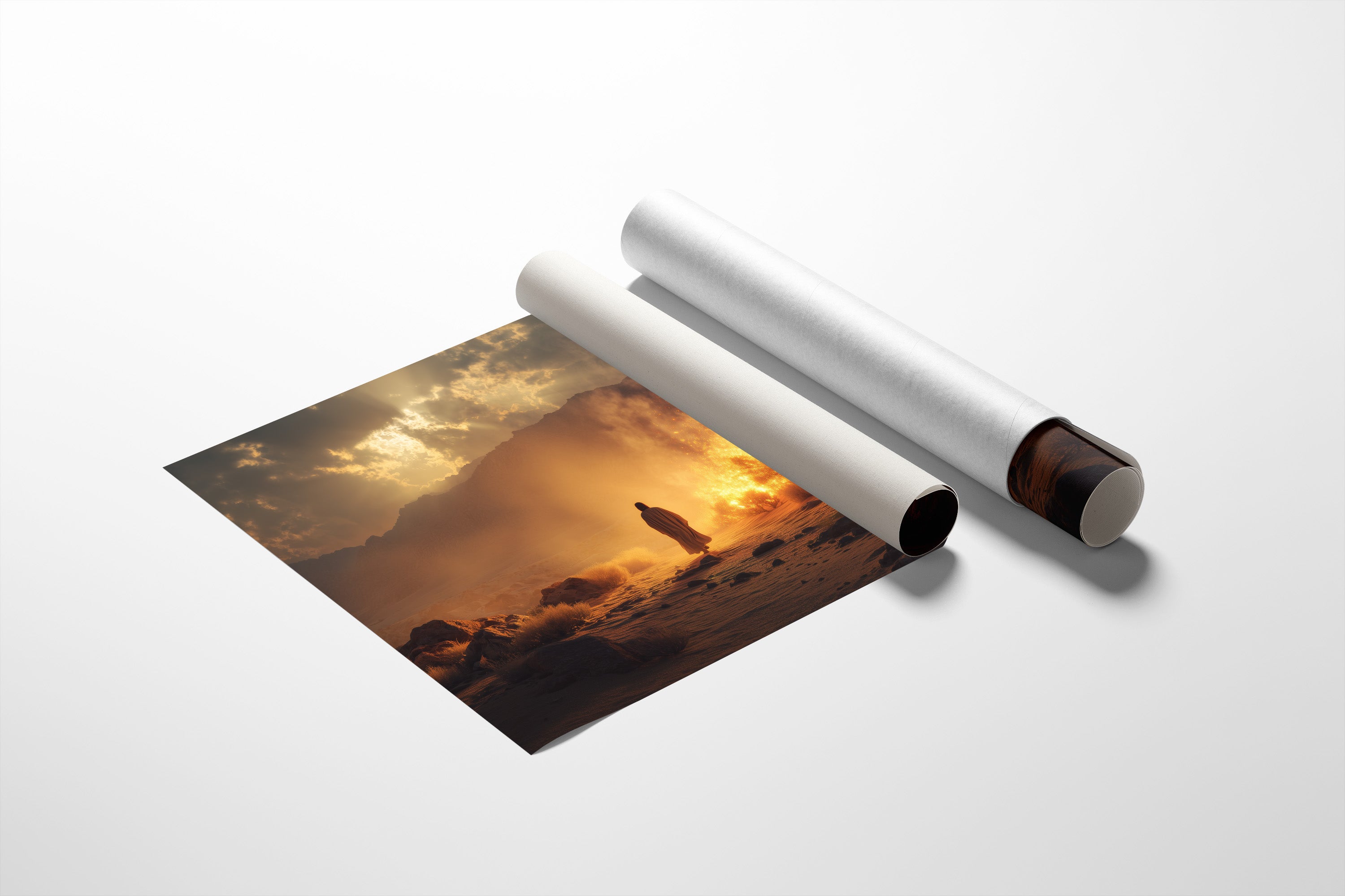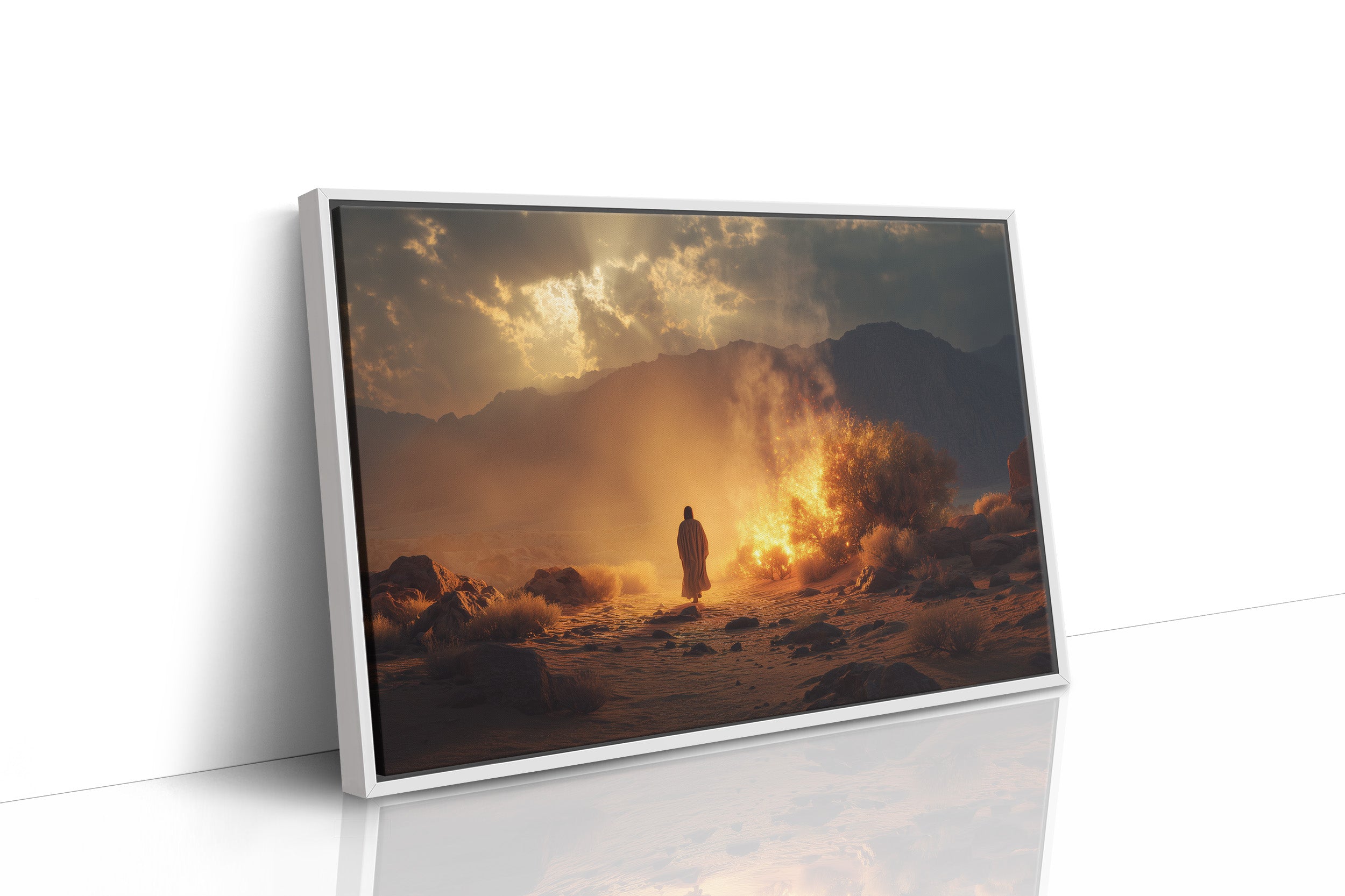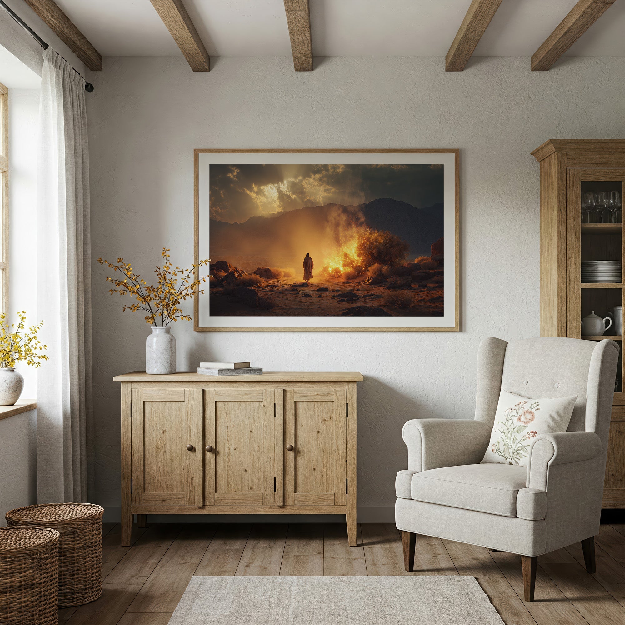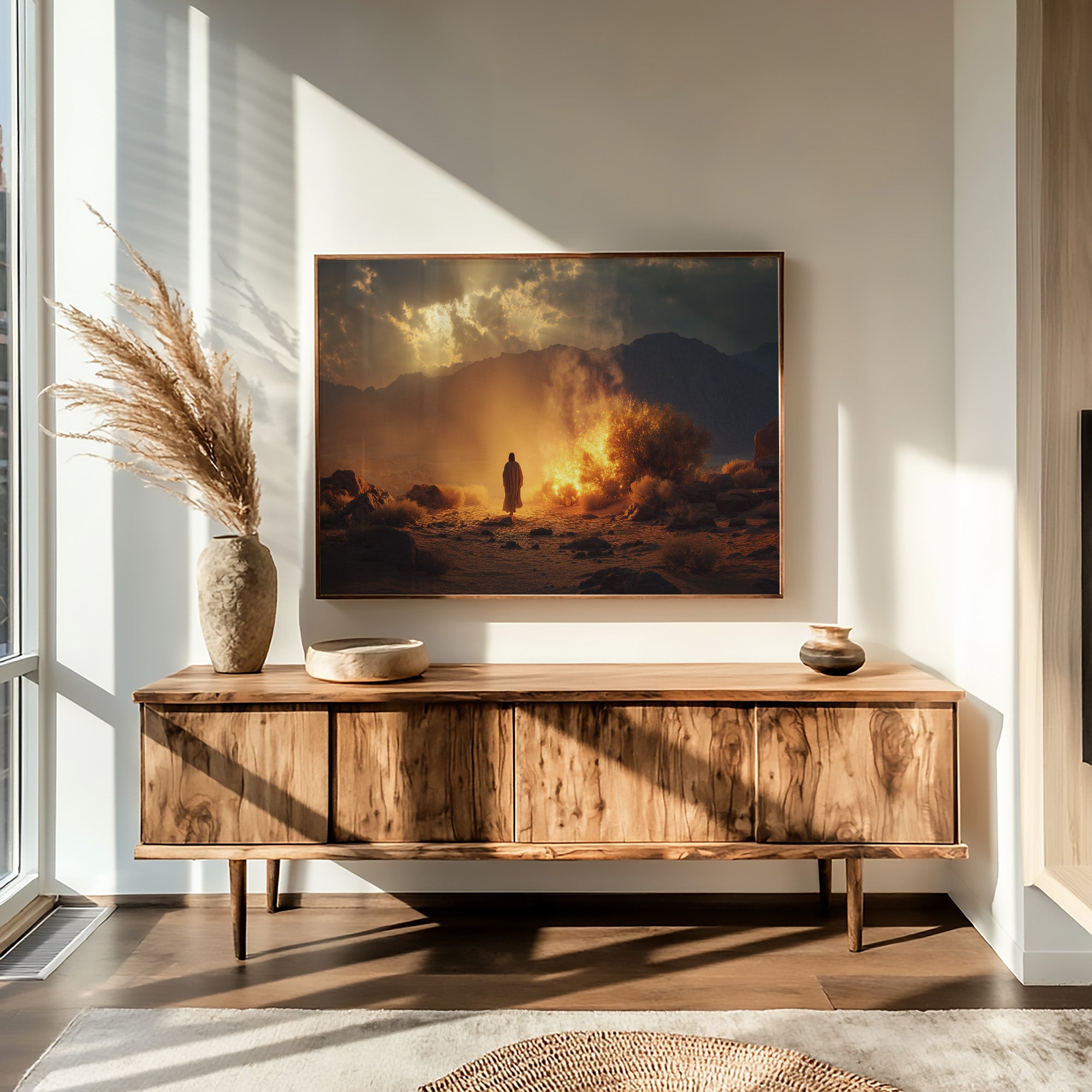 A solitary figure stands transfixed before a magnificent blaze that illuminates the desert landscape with golden light. The contrast between shadow and radiance creates a moment of profound reverence, as sunbeams pierce through dramatic clouds above rugged mountains. This contemplative scene captures the raw beauty of nature's elementsfire, earth, and sky merging in a spiritual dialogue that transcends ordinary experience. This piece would transform a reading nook or home office into a space of reflection and inspiration.