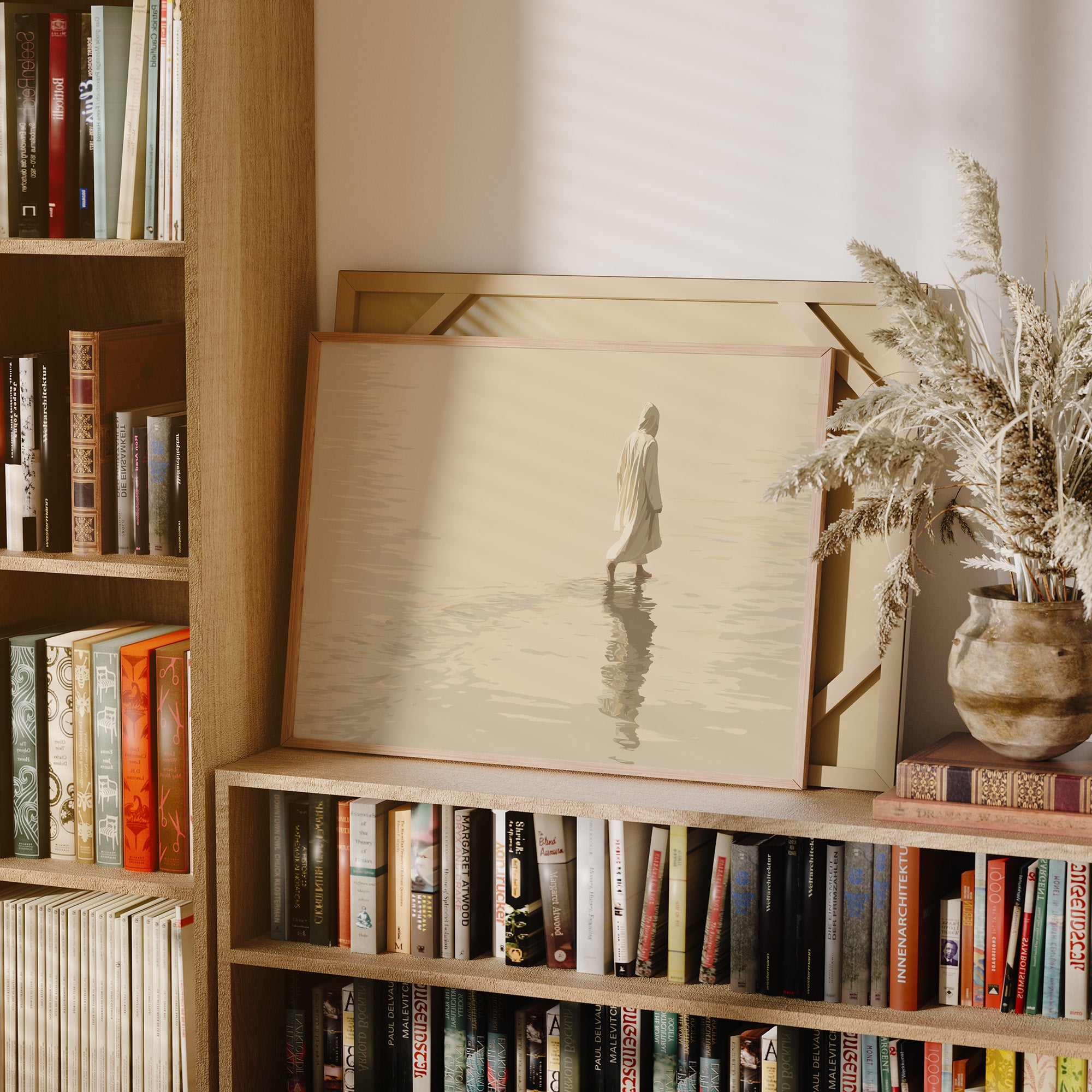 Stillness speaks in cream and beige as a solitary figure wades through tranquil waters. The gentle ripples mirror both form and purpose, creating a meditation on solitude against an ethereal backdrop. Soft light bathes the scene in warmth, blurring the boundary between water and sky, between the physical journey and the spiritual passage. This piece invites contemplation of our own quiet pilgrimages through life's uncertain depths. Perfect for minimal meditation spaces or serene bedrooms where thoughtful reflection feels most natural.