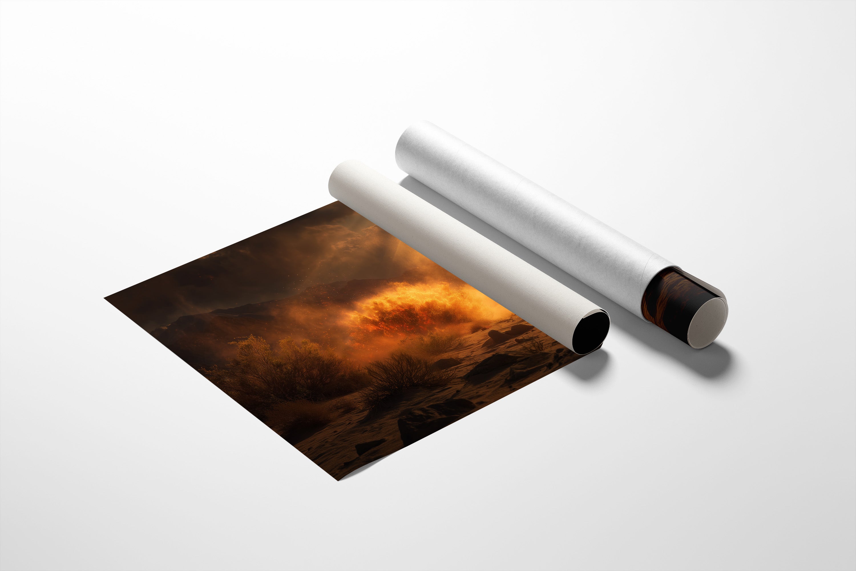 Sunlight breaks through storm clouds like molten gold, illuminating a solitary figure standing at the threshold of something magnificent and terrifying. The dramatic interplay of amber light and shadowed terrain creates a scene of spiritual awakening, where fiery beams cut through darkness to reveal a path forward. This contemplative piece invites viewers to consider their own journey through life's wilderness moments, finding beauty in the contrast between human smallness and nature's overwhelming grandeur. Perfect for a reading nook or home office where one seeks daily inspiration and a reminder of life's epic journey.