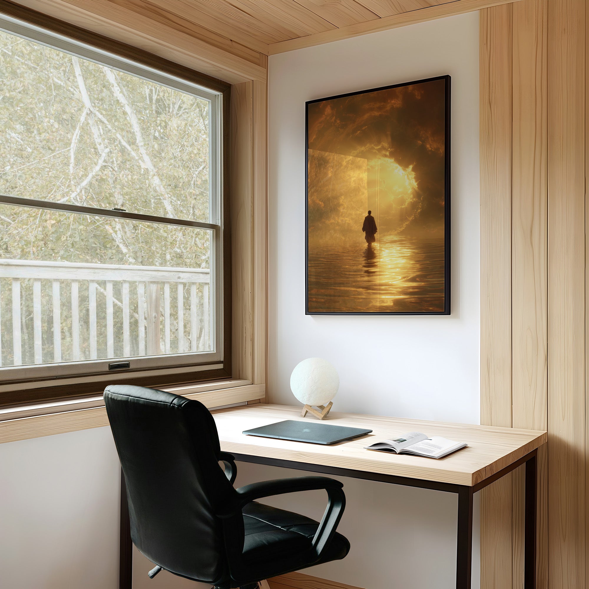 A solitary figure treads across still waters, drawn to a radiant portal of light breaking through amber clouds. The golden hour illuminates each ripple with metallic brilliance, creating a path that seems both impossible and inevitable. This contemplative scene captures the threshold between worlds, where reality meets transcendence in a warm palette of honey, bronze, and deep sienna tones.