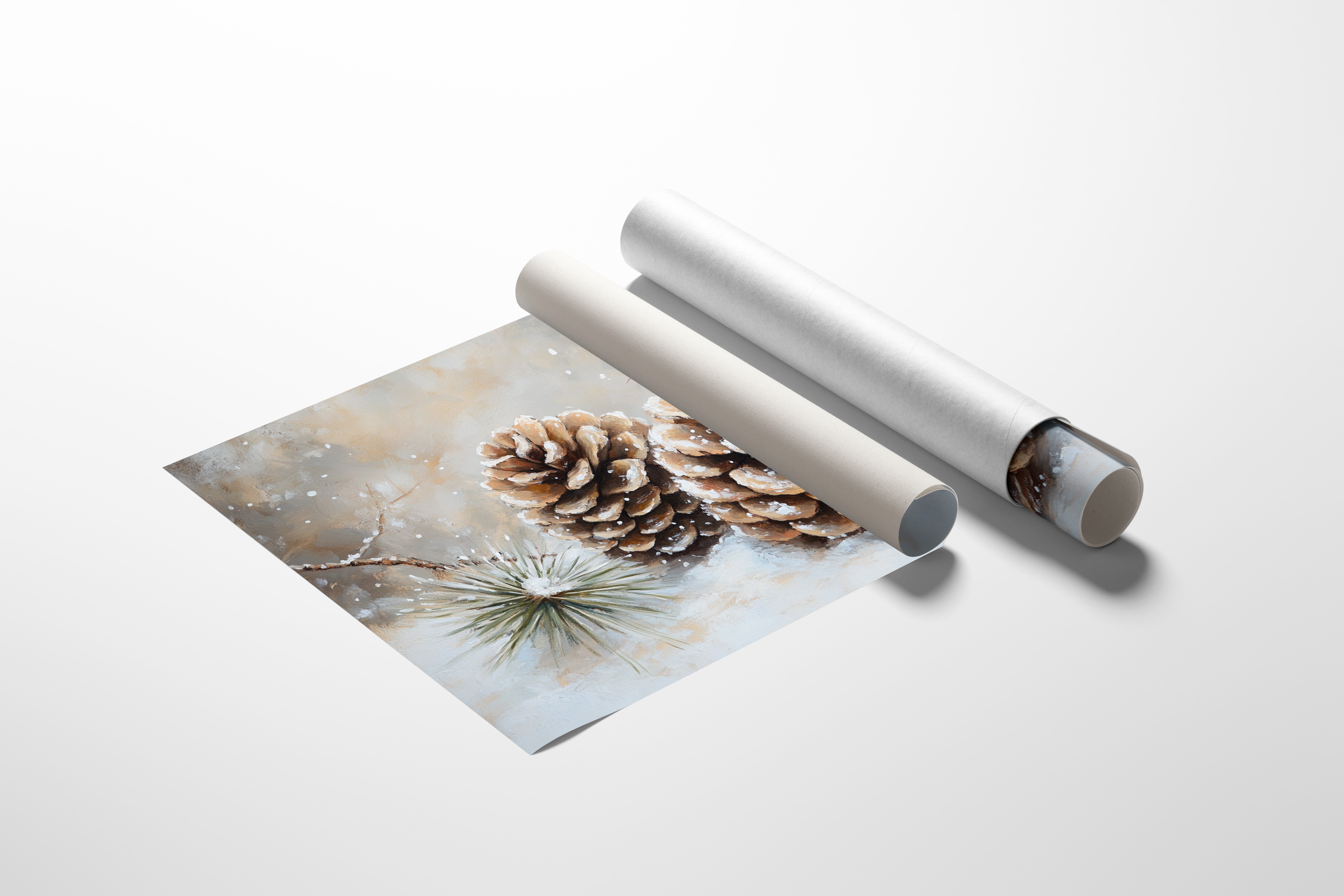 Delicate snowflakes settle on weathered pine cones, transforming them into nature's winter jewelry. The soft browns and creamy whites create a peaceful dialogue between earth and sky, while a single evergreen sprig adds a whisper of enduring life. The artist's brushstrokes capture the quiet magic of winter's arrival, with each scaled surface lovingly detailed in warm sepia tones against a misty gray backdrop. This serene winter scene would bring seasonal charm to a mountain cabin's reading nook or add natural elegance to a contemporary living space.