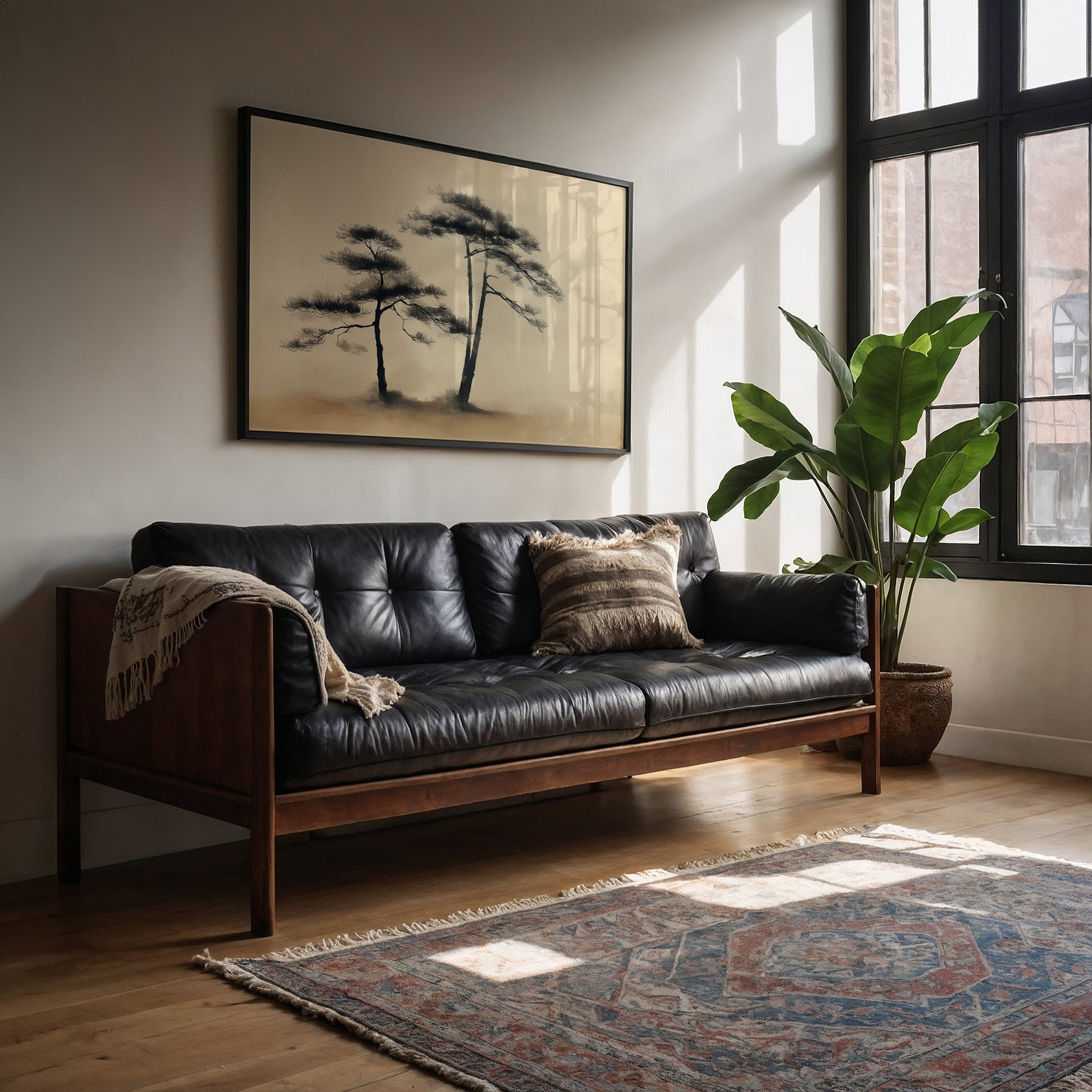 Warm sunlight streams through windows, casting delicate shadows that play across cream walls while illuminating a serene ink painting. The minimalist artwork captures the essence of two pine trees standing in peaceful solidarity, their branches reaching outward in an elegant dance. The scene is elevated by the rich copper-colored corduroy sofa and the interplay of natural light that bathes everything in honey-toned warmth. This tranquil composition would bring zen-like serenity to a reading nook, meditation space, or any room where peaceful contemplation is desired.